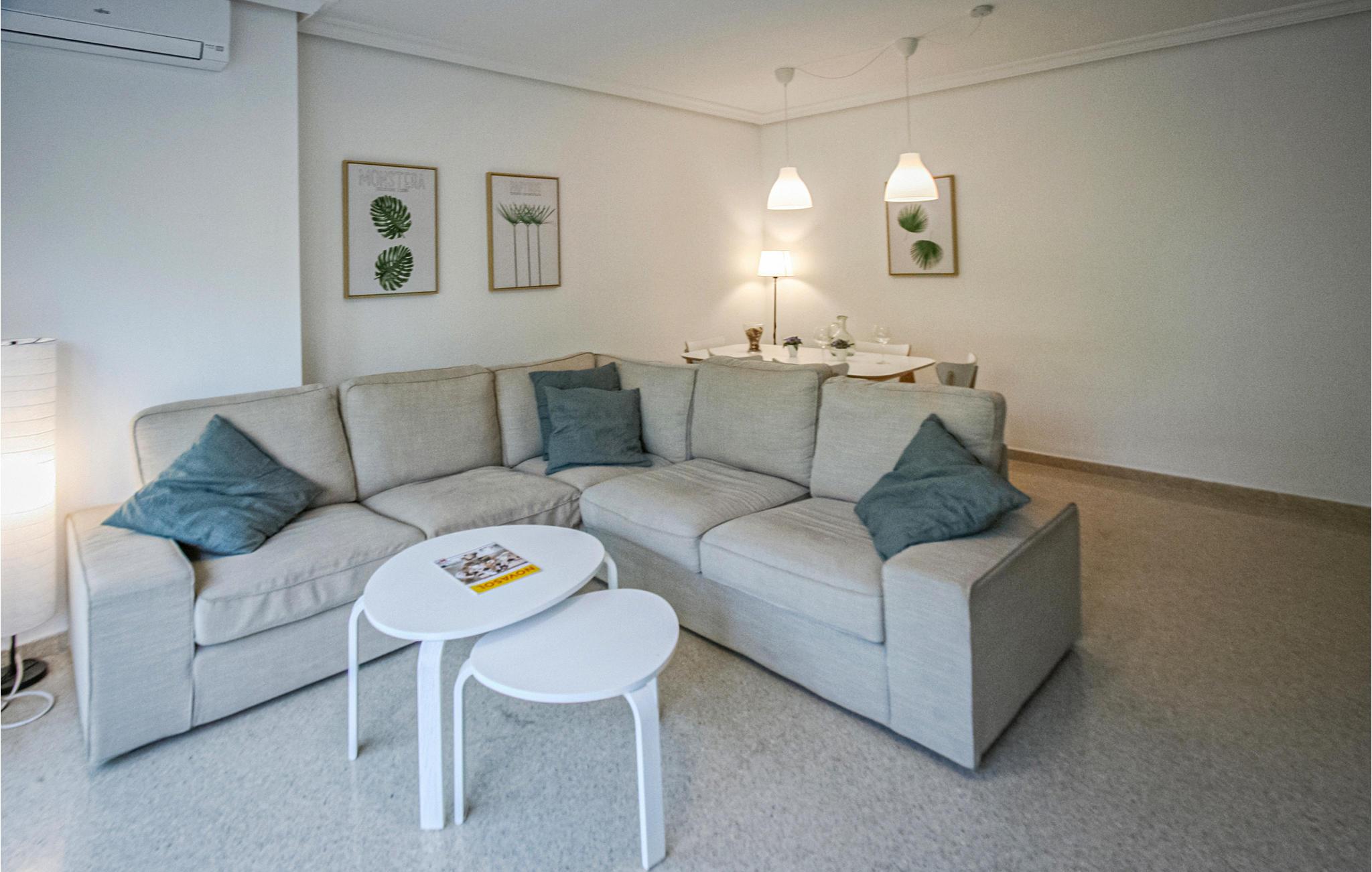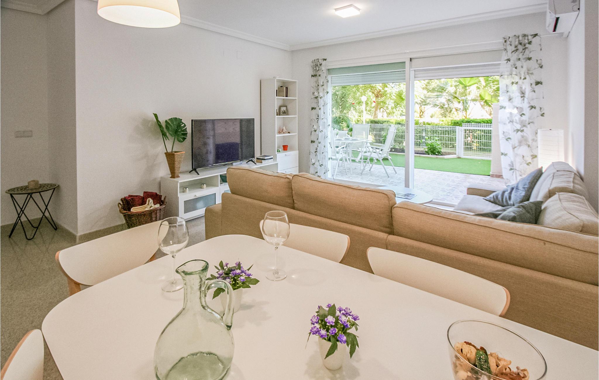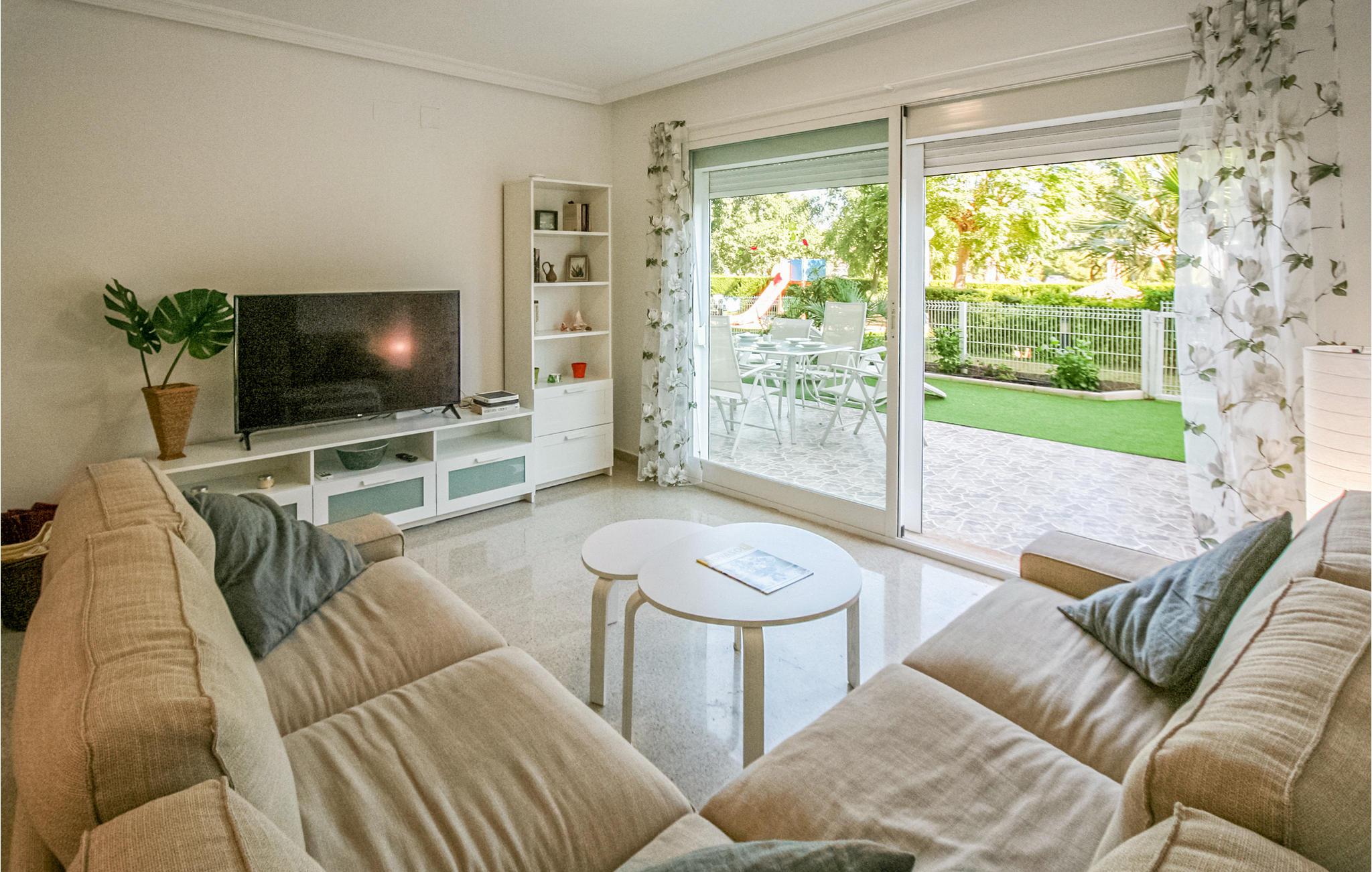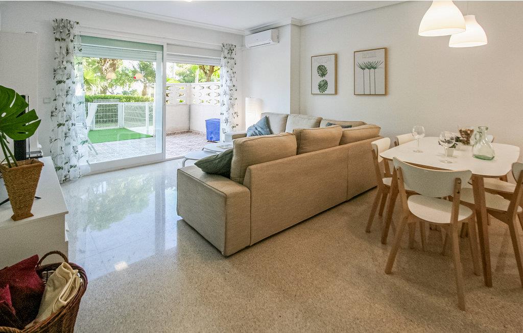 Lejligheden har 3 soveværelser, 2 badeværelser, et fuldt udstyret køkken, en stor stue og en stor terrasse med en lille haveområde, der er tilgængelig fra stuen. Her kan I spise sammen med jeres kære og slappe af i de behagelige temperaturer, der kendetegner dette område.
