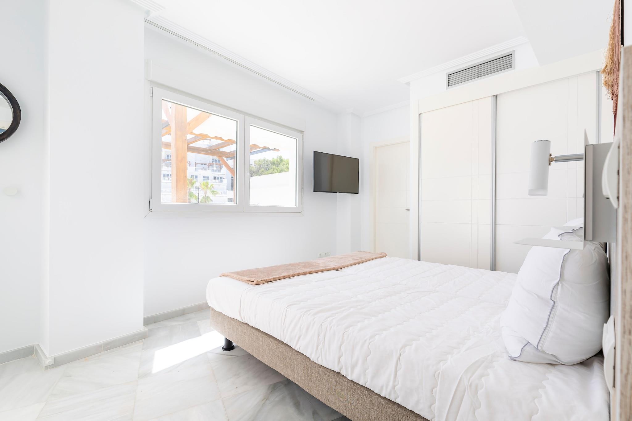 Træd ind i kystluksus i denne stilfulde lejlighed i El Campello, hvor marmorgulve, luftigt interiør og smagfuld indretning skaber det perfekte middelhavs-tilflugtssted. Designet til komfort, lejligheden rummer op til fire voksne og to børn, og byder på to soveværelser - hver med sit eget badeværelse - og et lyst opholdsrum, der flyder problemfrit ud til en panoramaterrasse. Herfra kan du nyde en fascinerende udsigt over det turkise Middelhav, mens du slapper af under den skyggefulde pergola. Perfekt placeret langs Costa Blancas kystlinje, er du kun få skridt fra gyldne strande, naturskønne promenader og El Campellos livlige charme. Tag en morgensvømning i den opvarmede pool, slentre til stranden til solbadning eller vandsport, eller udforsk nærliggende kyststier. Kæledyrsejere vil elske den lette adgang til hundevenlige strande og åbne områder, hvor din lodne ledsager kan løbe, lege og nyde havbrisen. Fra frisk fisk og skaldyr paella til tapasbarer med lokale vine, El Campello byder på en læskende kulinarisk scene lige uden for døren. Gå en tur til charmerende cafeer ved havet for en solnedgangscocktail, eller besøg det travle lokale marked for friske råvarer til at lave mad i dit fuldt udstyrede køkken. Uanset om det er udendørs spisning på din terrasse eller opdagelse af autentiske spanske smage, bliver hvert måltid en del af din Costa Blanca-oplevelse.
