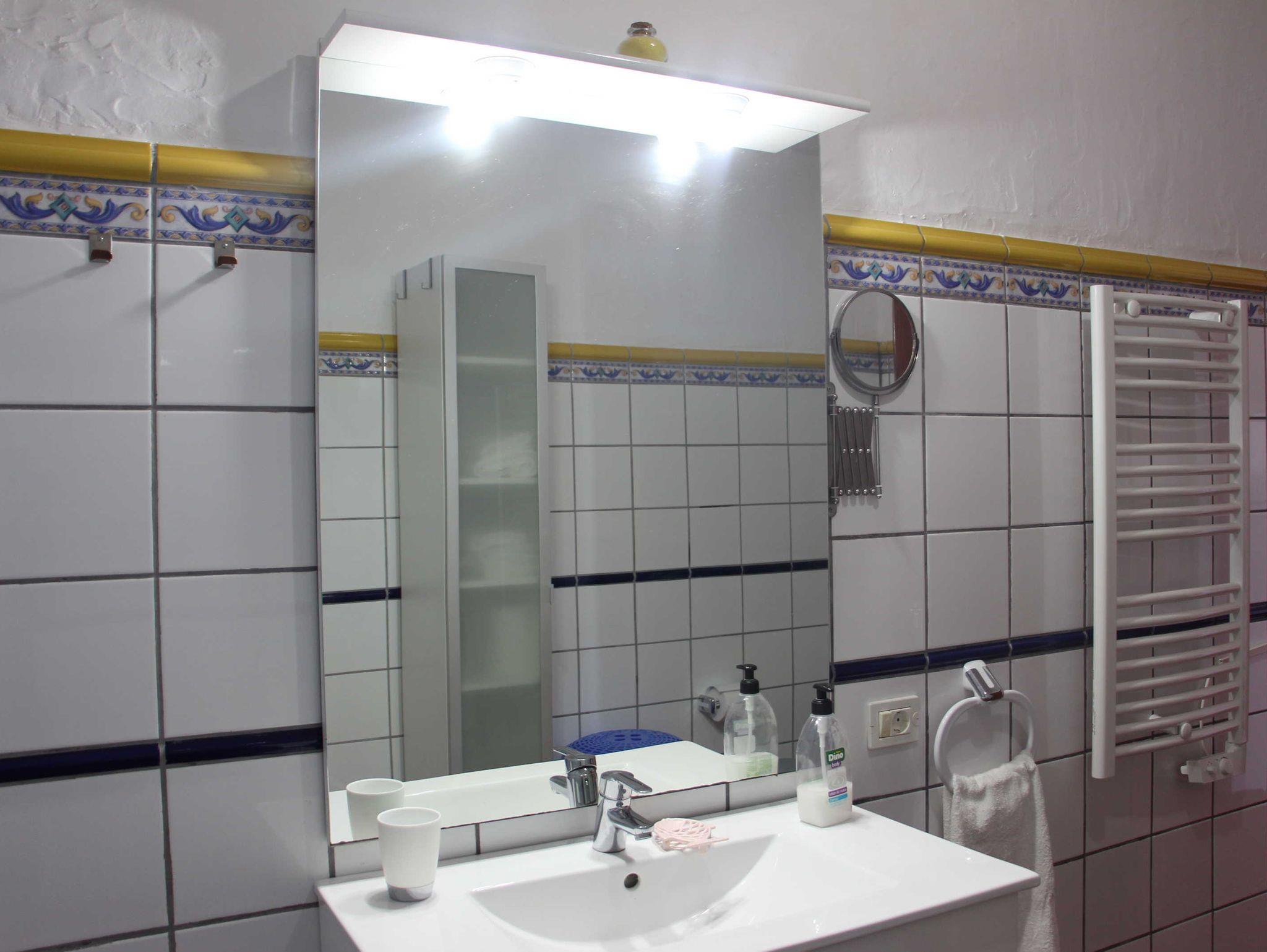 Von diesem Hauptraum gehen das Schlafzimmer mit zwei Einzelbetten sowie das Bad mit Duschwanne, WC und WB ab. Vom Schlafzimmer aus haben Sie Blick auf den Pool und das Meer. Die Waschmaschine ist in einem separaten, von außen zugänglichen Raum untergebracht.