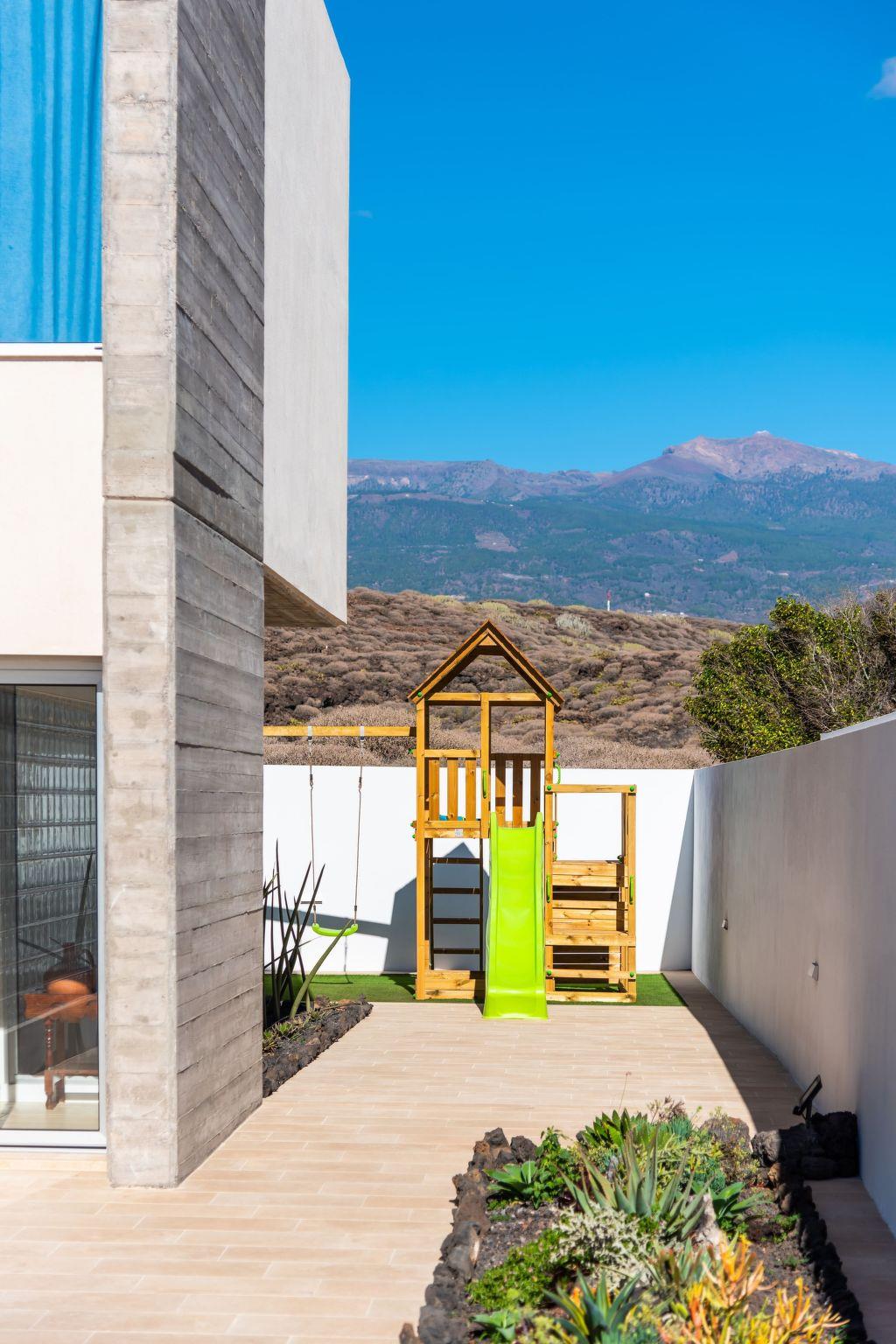 500 m² of private land. Stunning views of the Atlantic Ocean and Teide. Luxury 7 x 3 m swimming pool (heated to 24 °C in winter). Tropical wood chill out palapa, terrace and roof terrace. Outdoor pool furniture. Wooden deckchairs with cushions. Ecological wooden dining table for 8 people. Barbecue. Children's play area. Snorkelling equipment (mask and snorkel). Baby life jacket. Private garage for 2 vehicles and sports equipment. Security and alarm system.