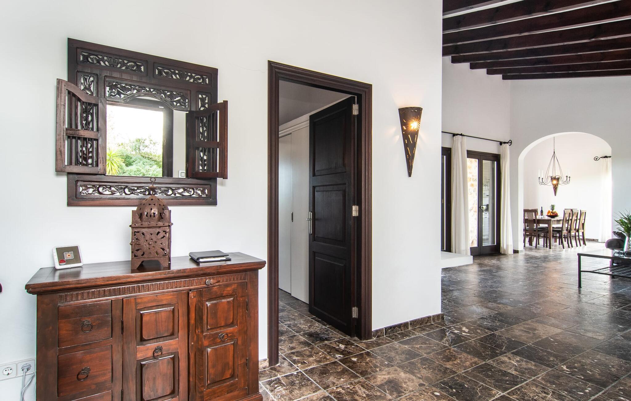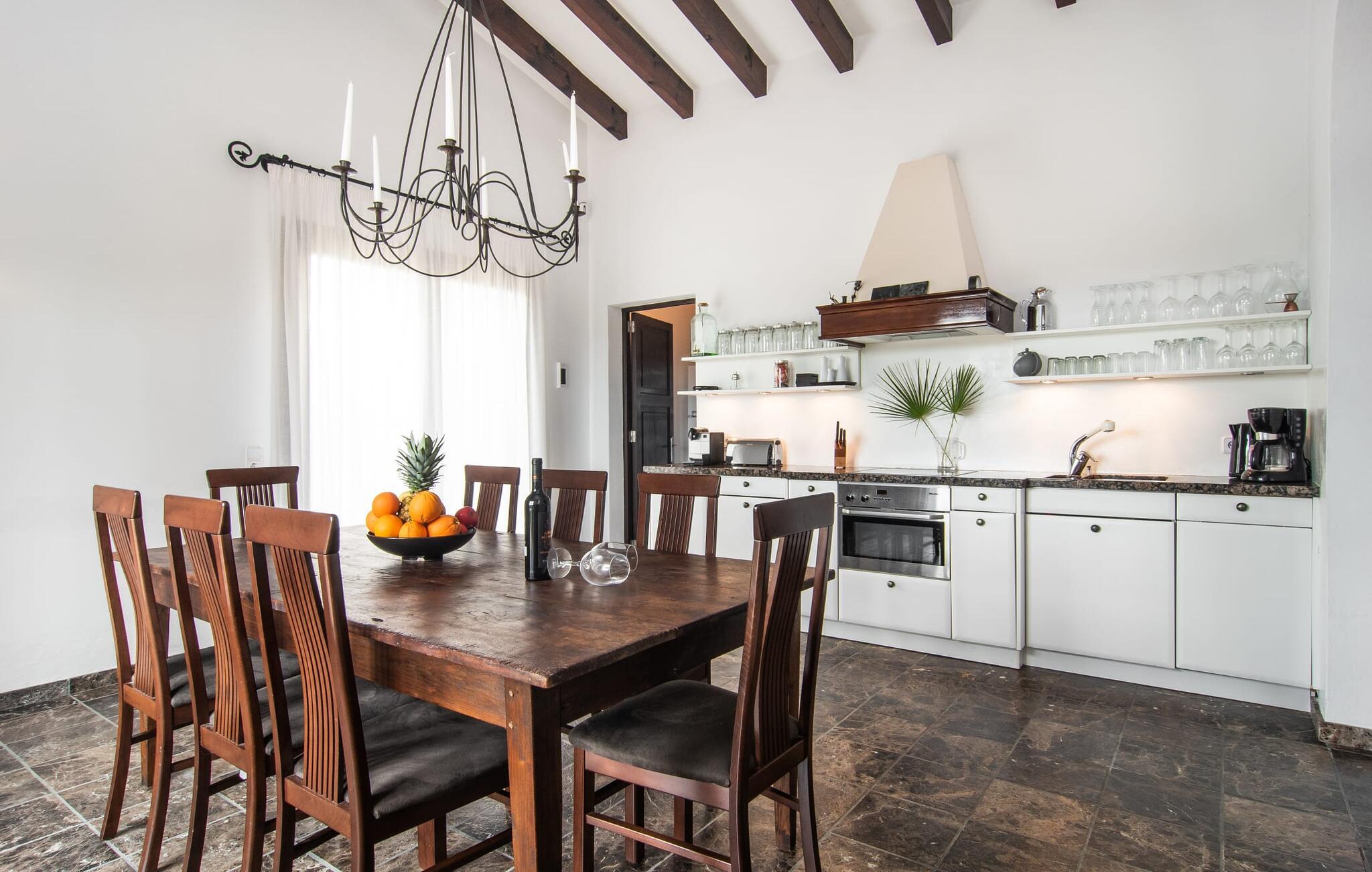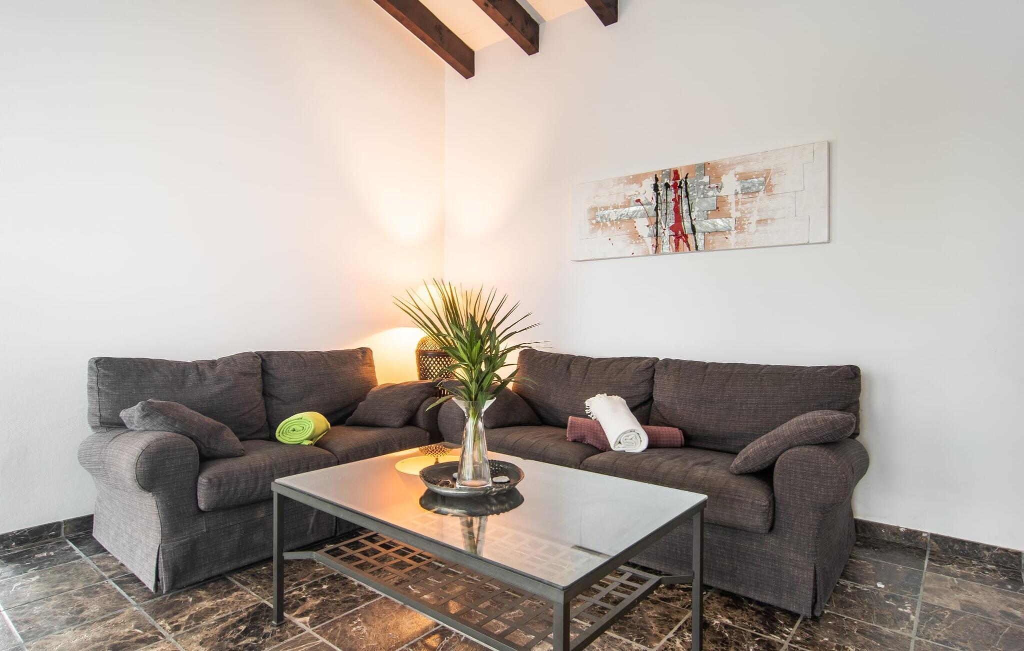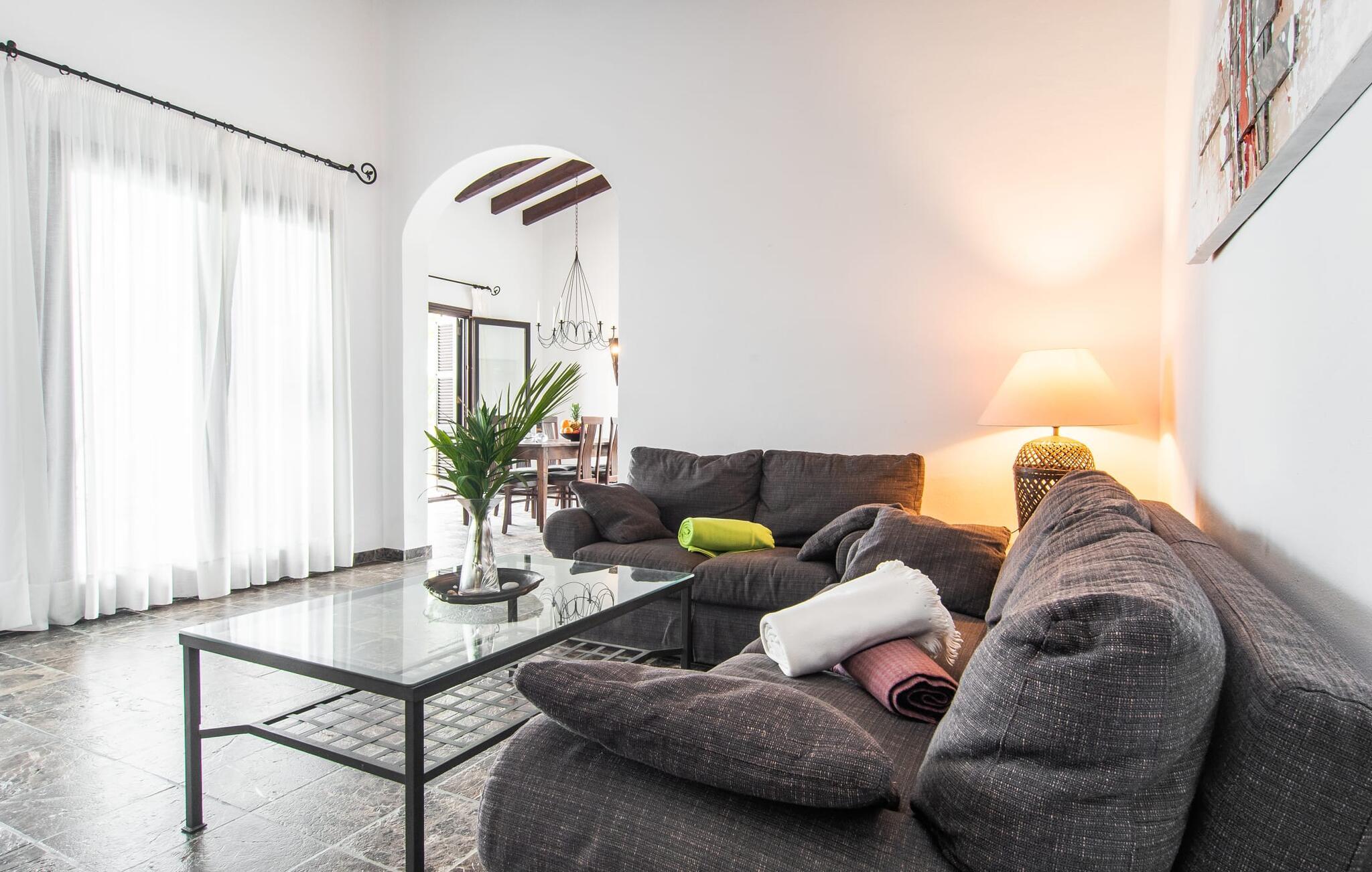 Denne komfortable finca i stueetagen er ideel for børnefamilier eller flere par, der rejser sammen og byder jer velkommen midt i den magiske middelhavsnatur. Lad jer inspirere af den vellykkede blanding af rustik elegance og moderne bekvemmeligheder, som det lyse og smagfulde interiør forkæler jer med. Glæd jer til at lave mad sammen i det rummelige, åbne køkken og hyggelige filmaftener i den indbydende sofa.