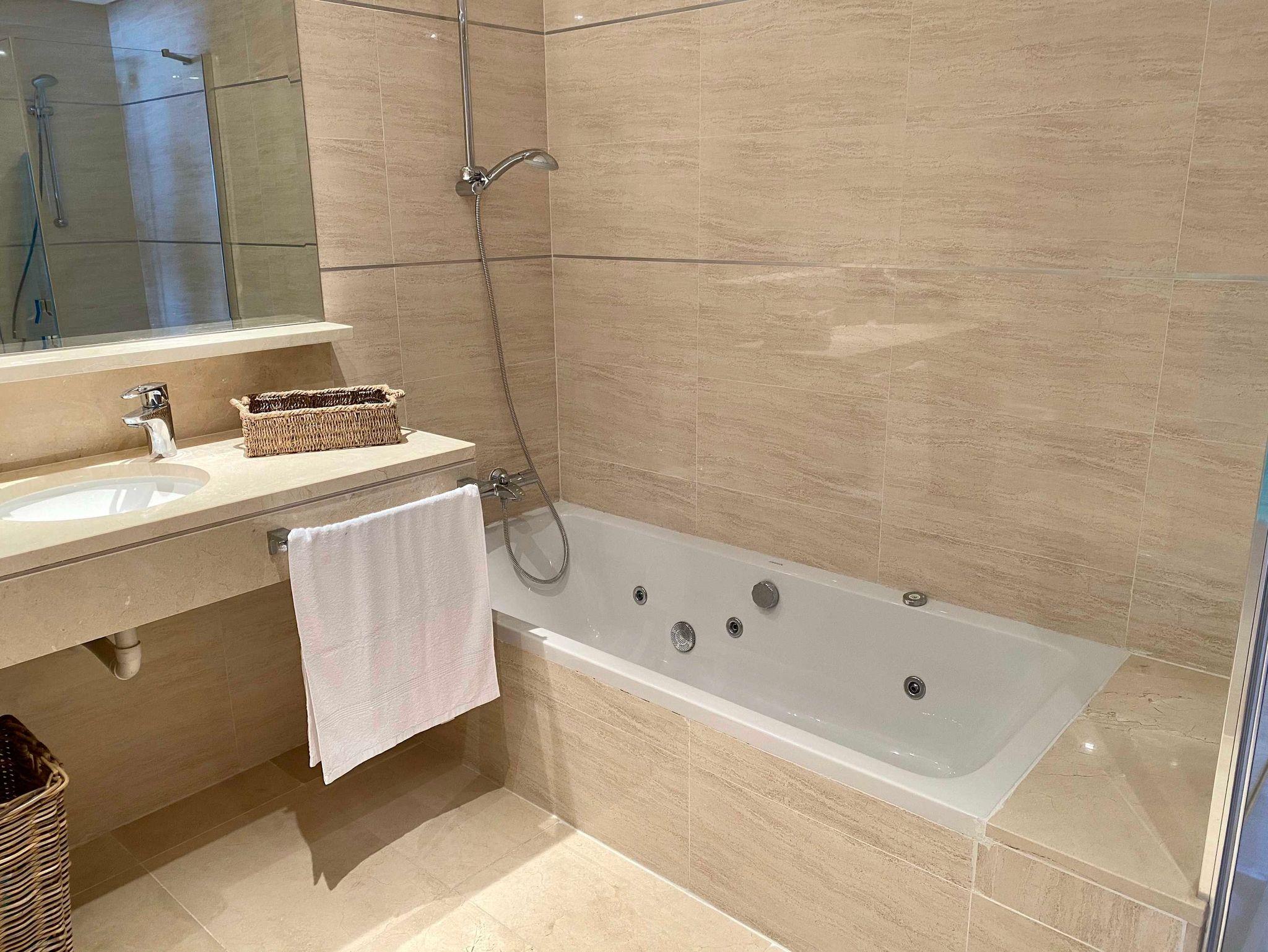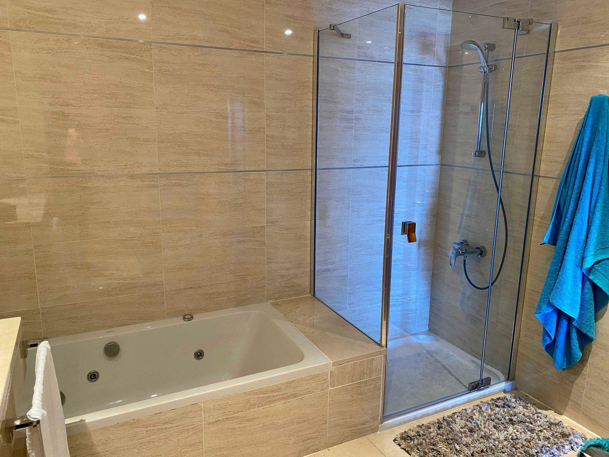 Das geräumige Bad verfügt über eine Badewanne, eine separate Dusche, Waschbecken, WC und Bidet.