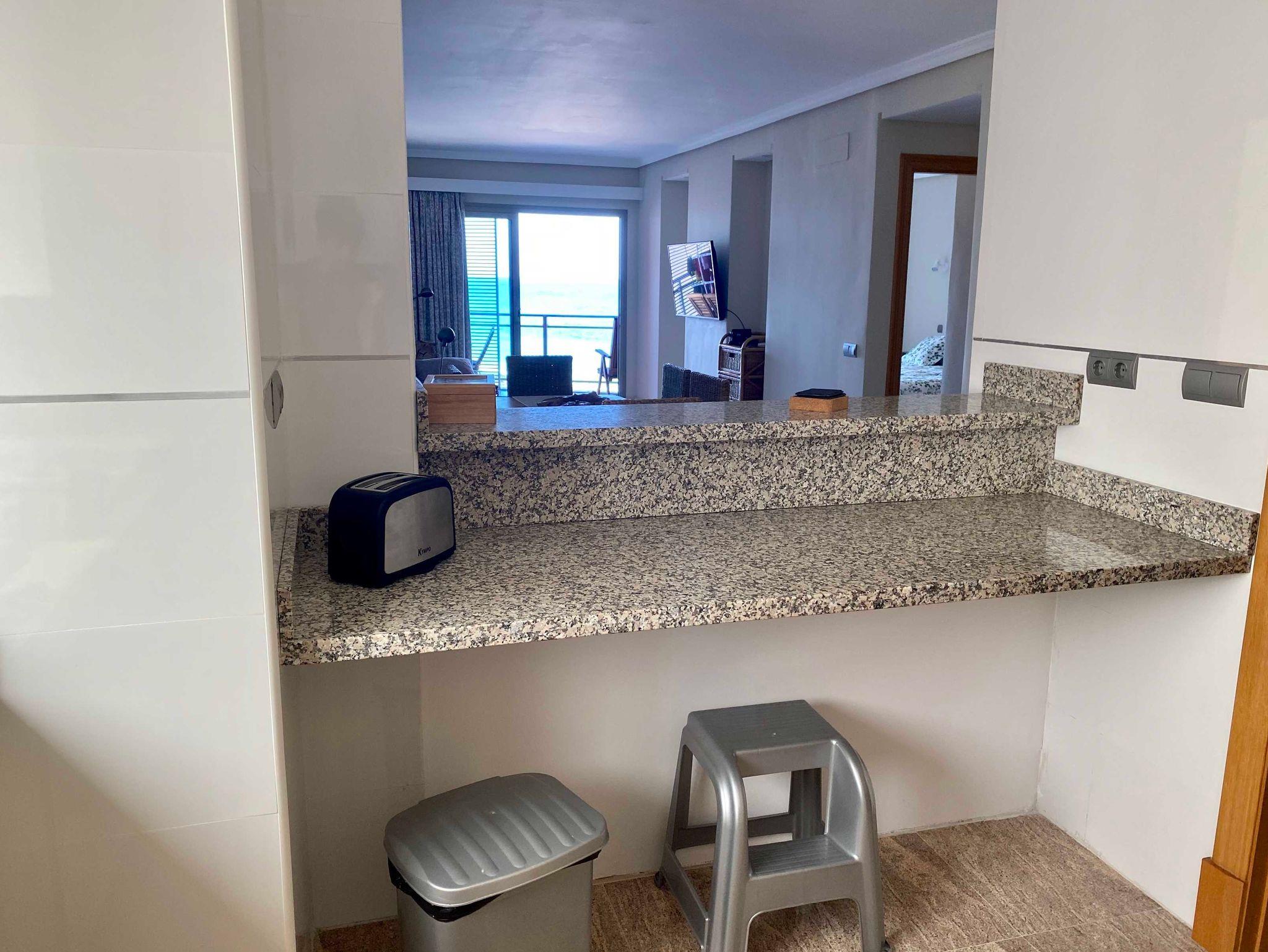 • Küchenzeile mit Ceranfeld (3 Platten), Backofen, Dunstabzug, Mikrowelle, Kühl-/Gefrierkombination, Cafetera, Kaffeemaschine, Spülmaschine, Toaster, Wasserkocher