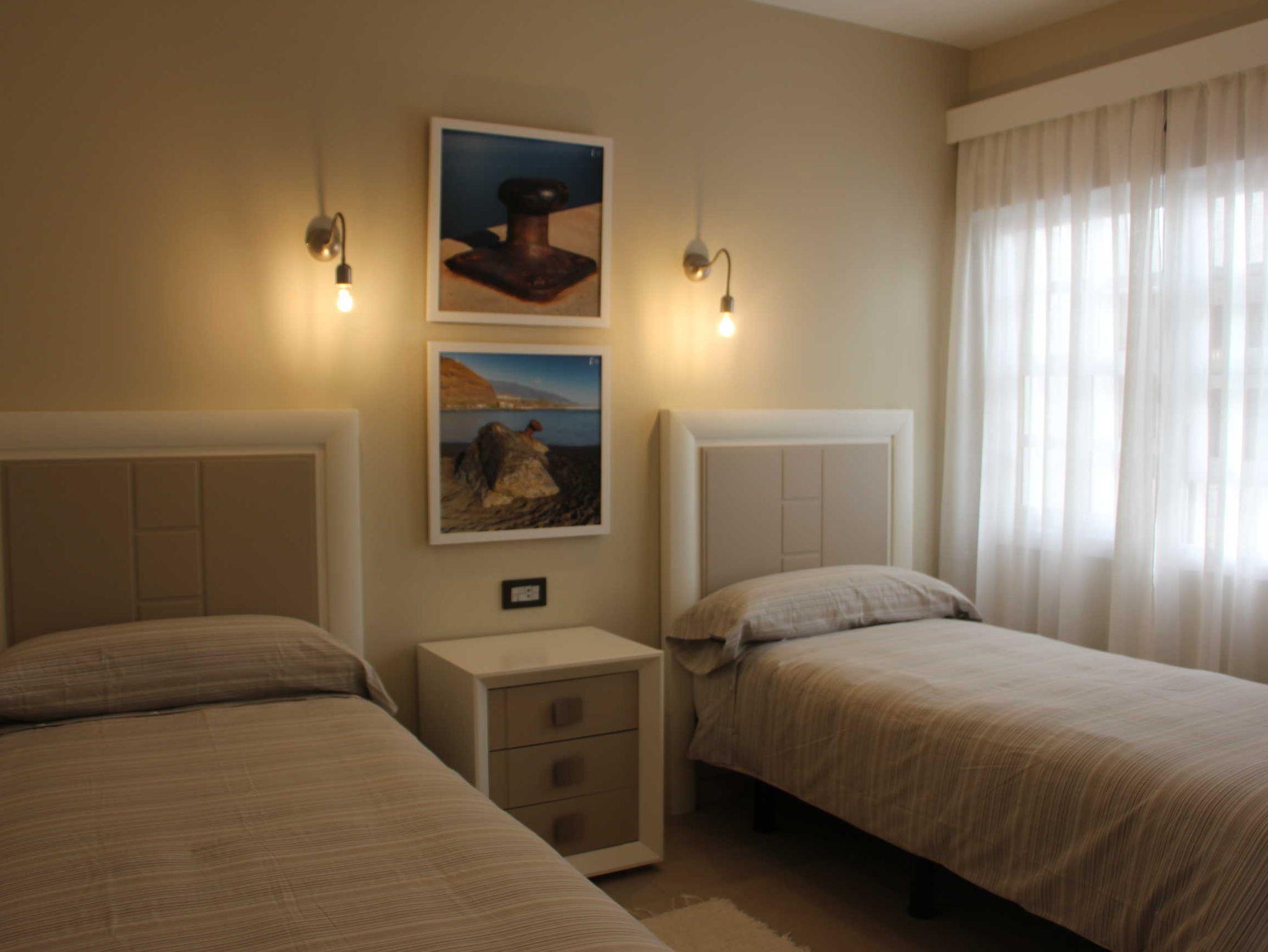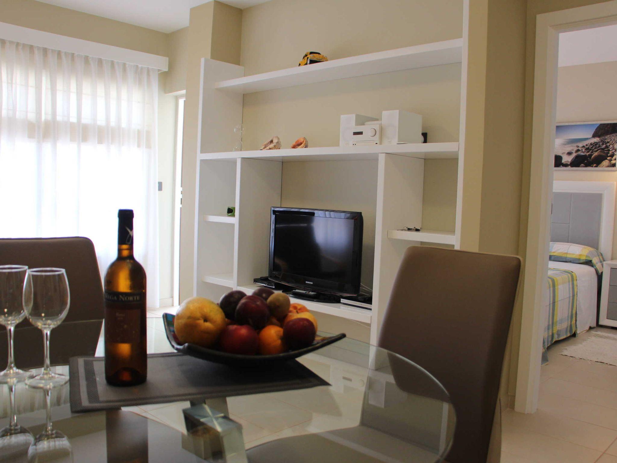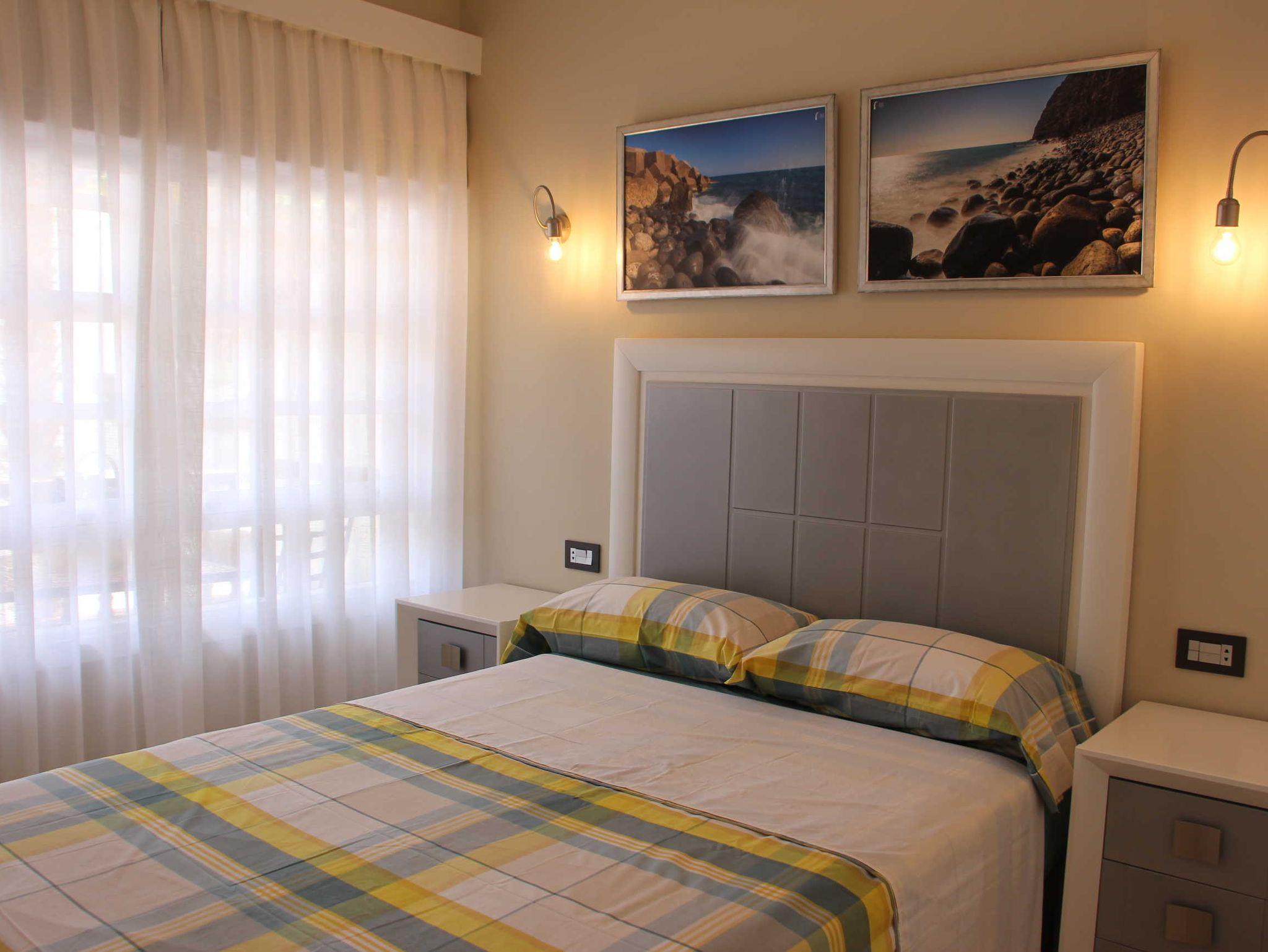 Die Ferienwohnung befindet sich im ersten Stock des viergeschossigen Apartmenthauses Edificio Orion. Ein Aufzug ist vorhanden. Sie verfügt über zwei Doppelschlafzimmer, eine separate Küche, ein Wohn-/Eßzimmer und Dusche/WC. Ein kleiner möblierter Balkon mit Bergblick ist vorhanden.