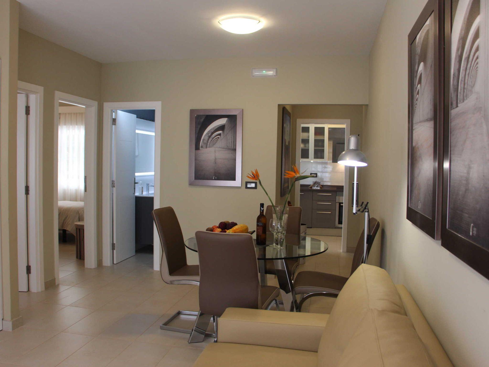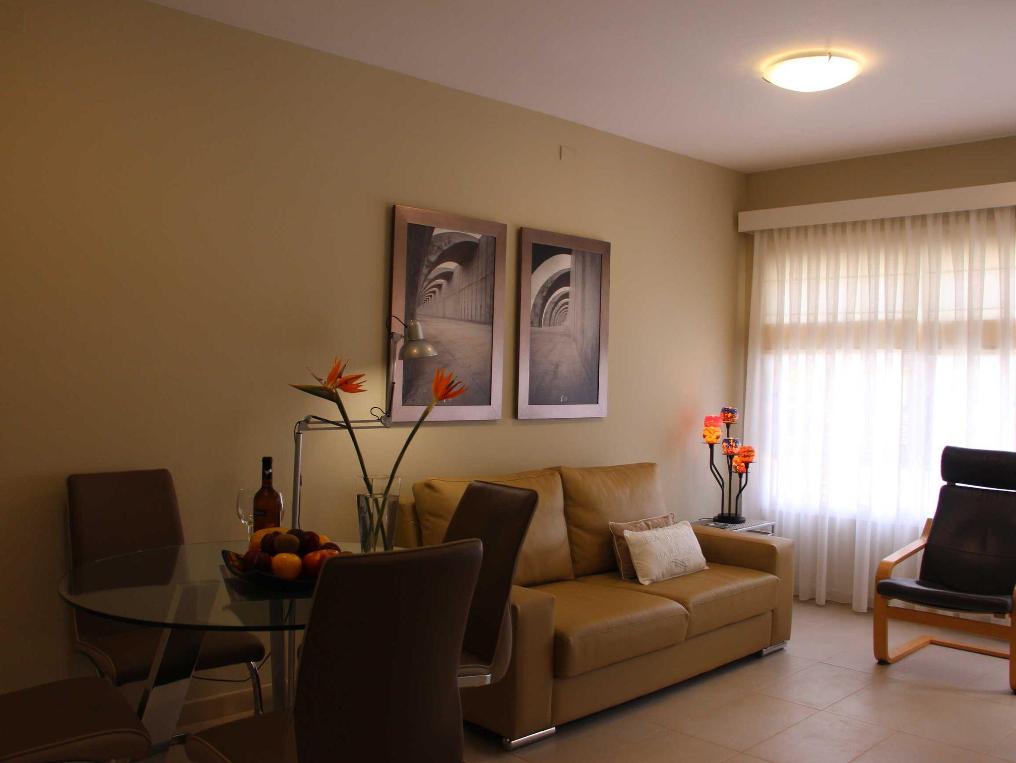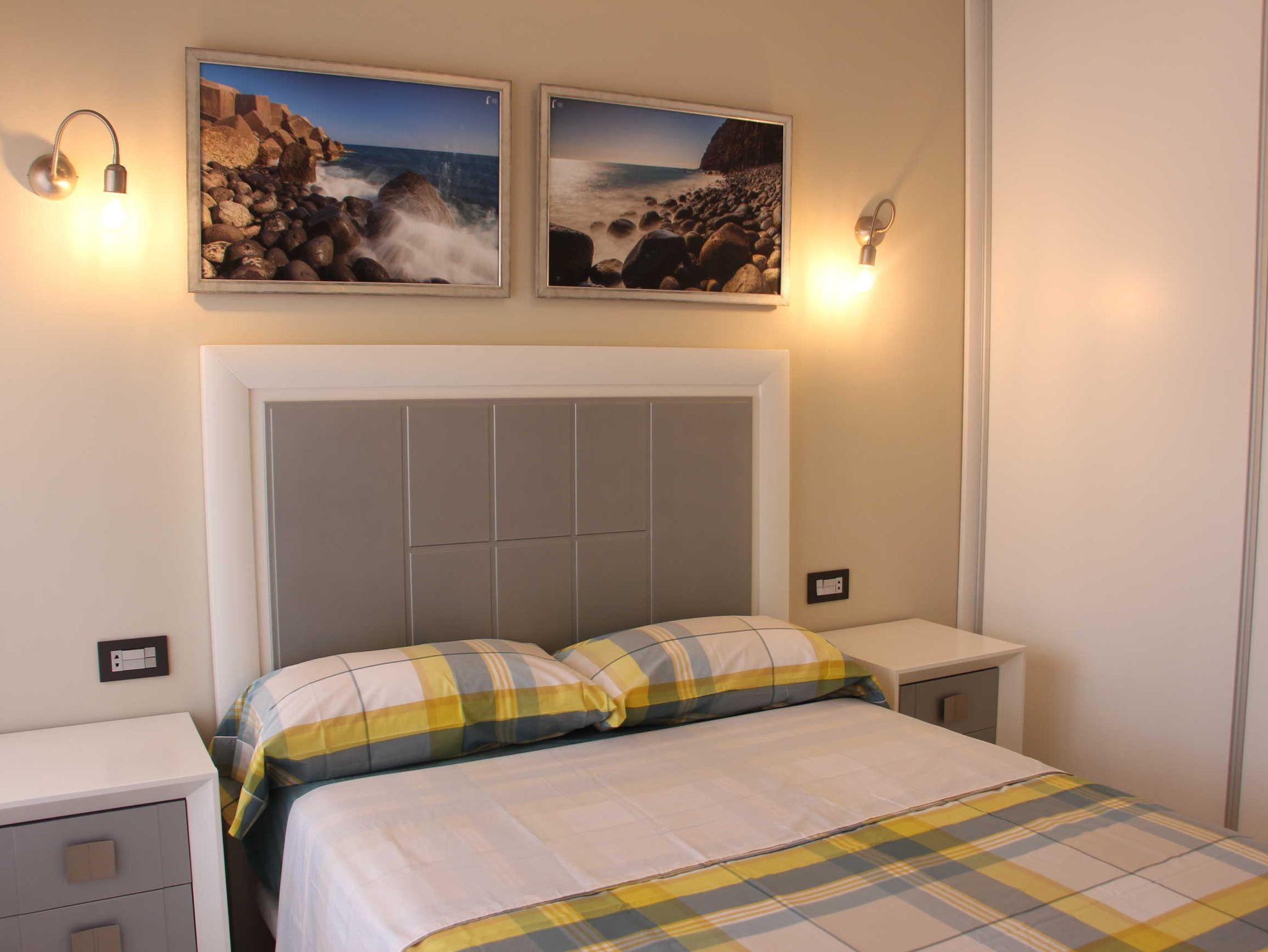 Die Ferienwohnung befindet sich im ersten Stock des viergeschossigen Apartmenthauses Edificio Orion. Ein Aufzug ist vorhanden. Sie verfügt über zwei Doppelschlafzimmer, eine separate Küche, ein Wohn-/Eßzimmer und Dusche/WC. Ein kleiner möblierter Balkon mit Bergblick ist vorhanden.