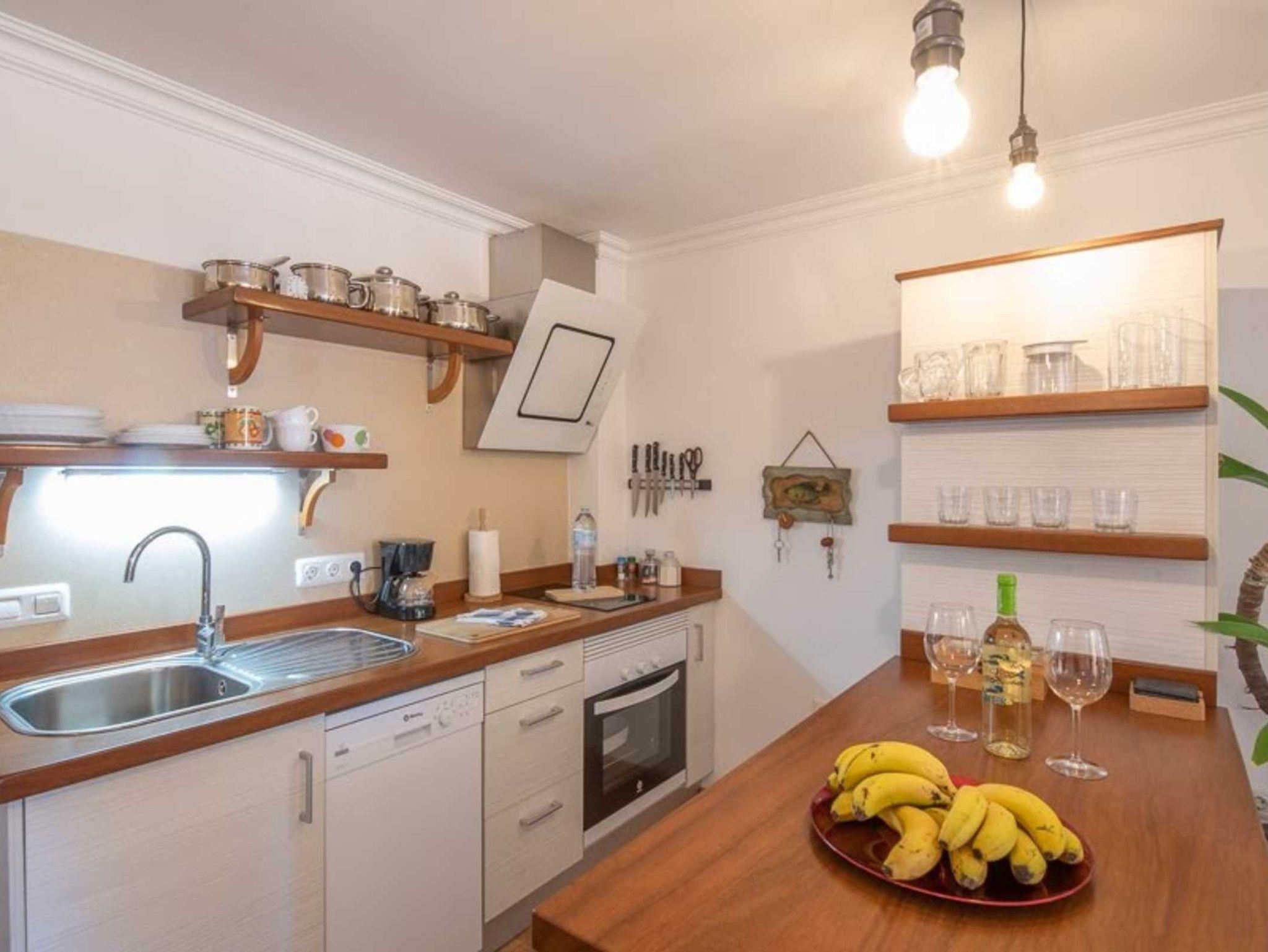 Die Küchenzeile ist perfekt für einen Urlaub ausgestattet: ein 2 Platten Induktionsfeld mit elegantem Dunstabzug, ein Backofen, eine Mikrowelle und sogar eine Spülmaschine sind vorhanden.