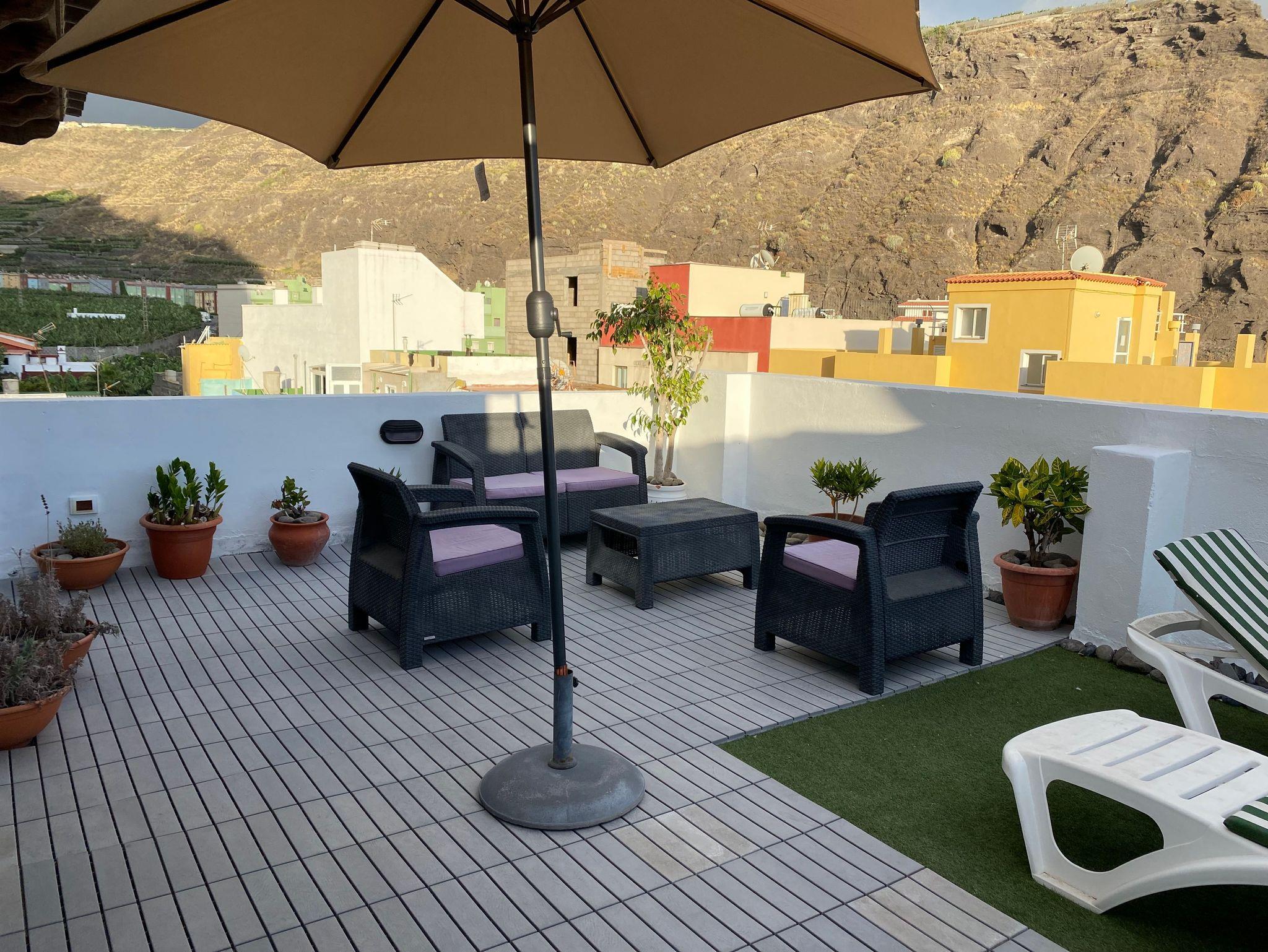 Von der privaten Terrasse hat man einen wunderschönen Blick auf den dahinterliegenden Bergrücken, den Barranco de las Angustias sowie die Gassen der Altstadt von Puerto de Tazacorte.