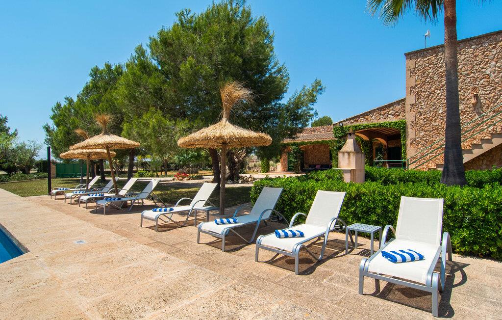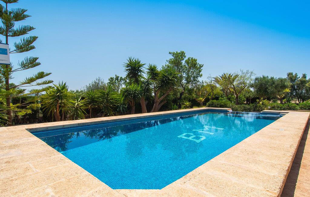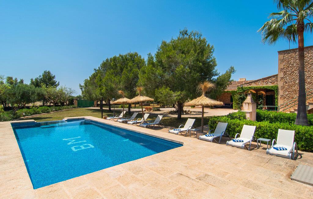 Den familievenlige villa "Els Girasols" er et roligt beliggende landsted, der imponerer med en meget vellykket blanding af mallorcansk arkitektur og moderne indretning. Det er beklædt med natursten typisk for øen og byder på rummelighed og variation både inde og ude. Det 10.000 m² store udendørsareal har forskellige græsplæner, kærligt anlagte middelhavsplanter, små stier og søde hække. Dette skaber et behageligt afslappet helhedsbillede, hvori poolen, smagfuldt flisebelagt med blå mosaikfliser og med nem adgang til trappen foran, passer ind. Det er omgivet på to sider af en solterrasse, hvor I kan sole jer i solen eller under en af de tilgængelige parasoller. I alt otte komfortable liggestole er tilgængelige. Huset har en rummelig overdækket terrasse, som fremstår vidunderlig hjemlig takket være sine søjler, hvoraf nogle er beklædt med vinstokke. En afslappet loungesofa og et stort spisebord indbyder til at blive hængende og slappe af med udsigt til haven - på dejlige dage kan I blot bruge tiden udenfor og nyde det. Et højdepunkt i det overdækkede terrasseområde er formentlig bordfodboldsættet, hvor I kan spille som I vil. Når man træder ind i villaens indre fra terrassen, bliver man mødt af en stor, meget rustik stue, som ikke kun tilbyder gæsten komplet udstyr inklusiv elkedel, filterkaffemaskine og espressomaskine, men også en meget komfortabel opholdsstue/ spiseplads. Pejsen er bekvemt installeret her, og fjernsynet finder også sin plads i dette rustikke hjørne af huset. Det lange træbord kan komfortabelt rumme mindst otte personer. En lille stenbænk ved pejsen tilbyder opbevarings- eller siddemuligheder, det samme gør den komfortable sofa. En attraktiv skænk giver ikke kun opbevaringsplads, men er også et smukt blikfang. De fire rummelige soveværelser er komfortable og hyggelige med masser af træelementer og subtile farver. De indeholder hver to 0,9 x 2 m senge, så I har plads nok til en afslappende feriesøvn selv om natten. Det lyse væg- og loftdesign samt de matchende gulvfliser sikrer et rent, behageligt klima i disse rum. Der er fire smagfulde dagslysbadeværelser til rådighed, hvoraf to er bekvemt en-suite. I kan nemt lade jeres hårtørrer blive hjemme. Hvis I vil besøge smukke strande, er Villa "Els Girasols" et godt valg for jer. De smukkeste strande på den sydøstlige kyst - som den familievenlige Es Trenc strand med dens lavvandede indgang - ligger mindre end 10 km væk og kan hurtigt nås med en lejebil. Efter en smuk dag med udflugter vender I tilbage til jeres smukke ferievilla "Els Girasols", hvor I kan afslutte aftenen. Villaen "Els Girasols" er et smukt naturstenshus på den sydlige del af øen med et smukt designet, rummeligt udendørsområde. Den fantastiske sandstrand Es Trenc ligger kun 8 km væk. Herfra kan I også nemt nå den gamle bydel i øens hovedstad Palma, som er værd at se.