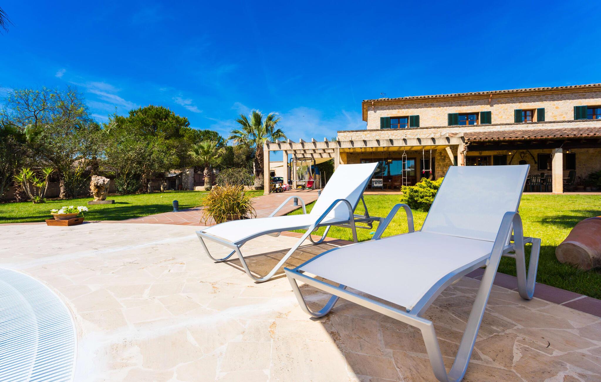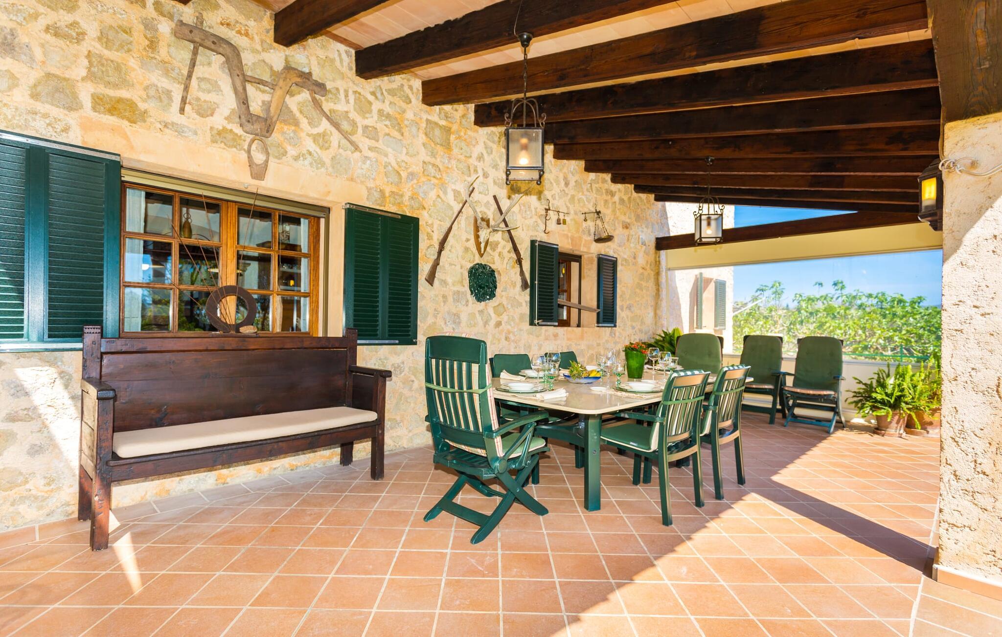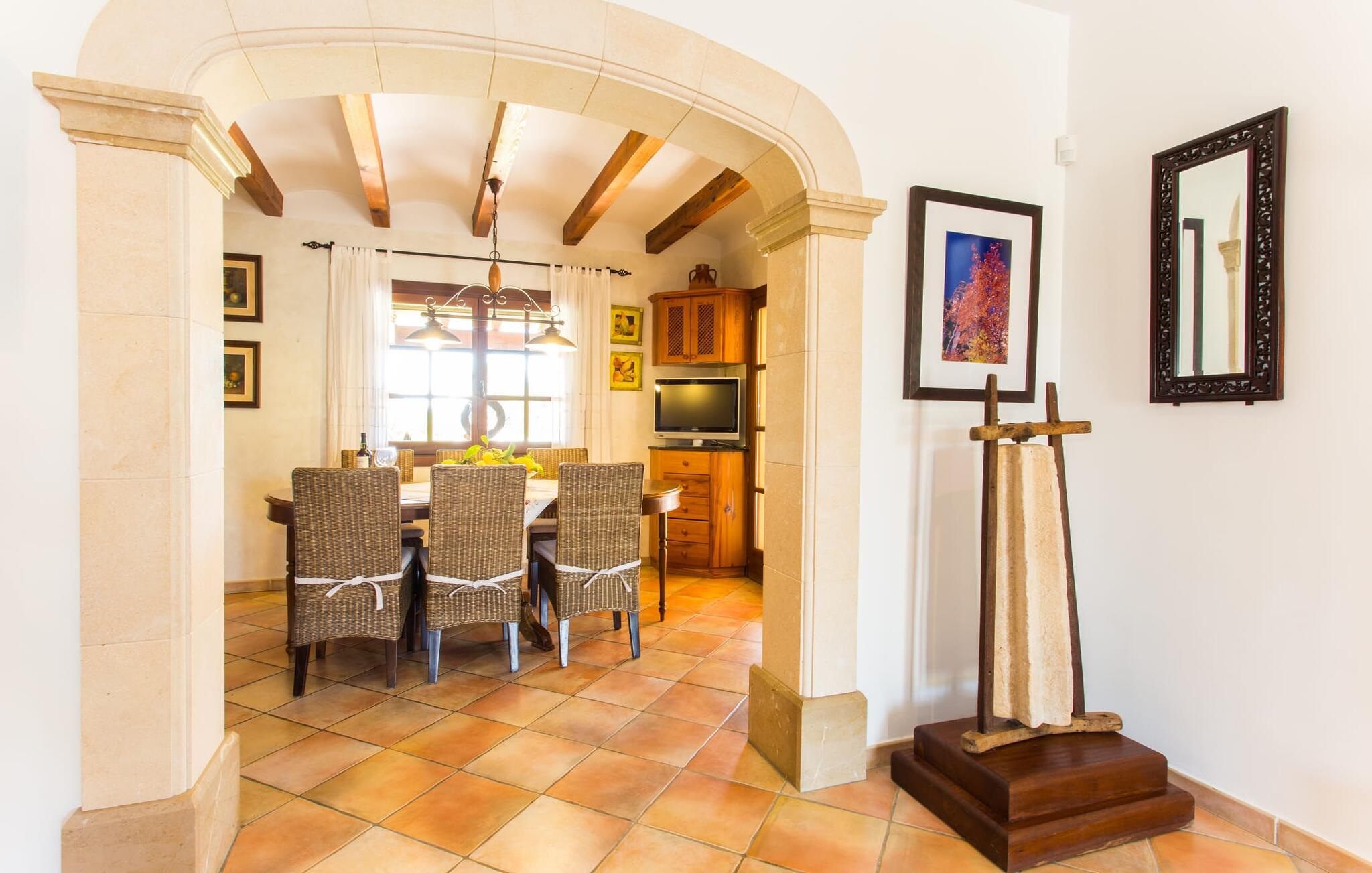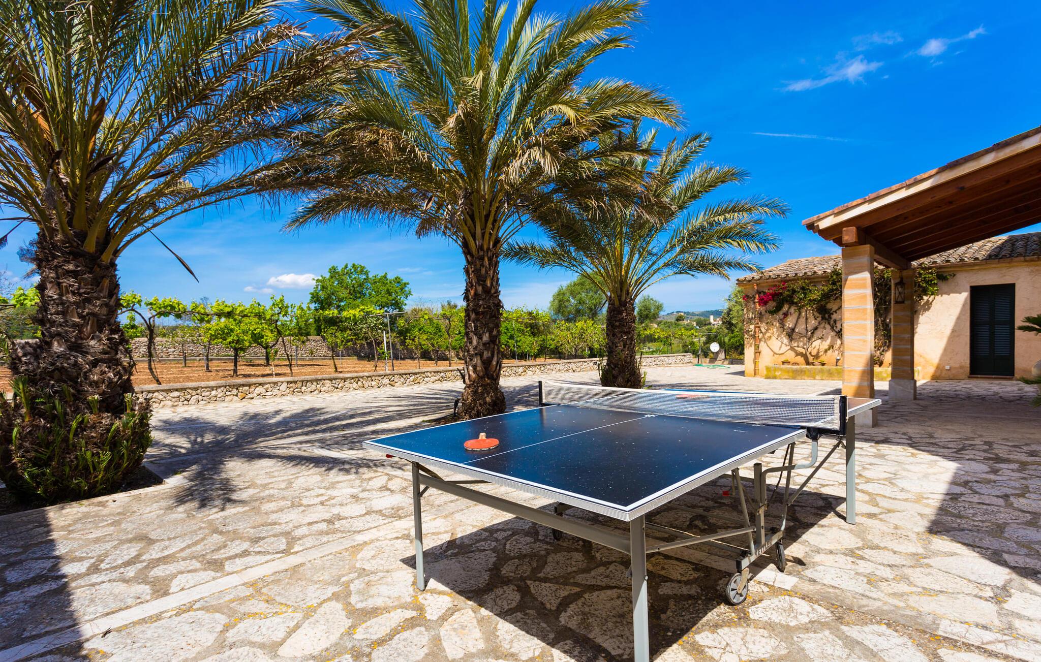 Når I nærmer jer fincaen "Els Mitjans", vil I straks bemærke de høje palmer, der giver de rolige omgivelser et tropisk præg. Den velholdte have har en stor græsplæne, der fører til den elegante, afrundede pool. Det er omgivet af en stor solterrasse med liggestole og tilbyder et perfekt sted at slappe af, svømme eller se børnene plaske rundt. Nyd en betagende udsigt over det bølgende landskab fra poolområdet og fordyb jer i den fredelige landlige atmosfære. Den store terrasse, der strækker sig over to sider af villaen, har to sofagrupper, to spiseborde og masser af plads til udendørs sjov med legetøj til børnene, en trampolin og et bordtennisbord. Til udendørs madlavning er der et skyggefuldt grillområde til rådighed for grillning af lokale råvarer. Til øjeblikke af afslapning er der parasoller og et glasoverdækket område med udtrækkelige parasoller. Indvendigt åbner stuen direkte ud til haven, med smagfuld indretning og pejs til hyggelige aftener. De mallorcanske træbjælker og rustikke fliser skaber en varm, indbydende atmosfære. Det moderne køkken er veludstyret, og spisebordet er kun få skridt væk. Tre soveværelser, herunder et på nederste etage med eget badeværelse, tilbyder komfort og moderne badeværelser. Soveværelserne ovenpå har adgang til tagterrassen med en vidunderlig udsigt. Villaen "Els Mitjans" ligger afsondret på en ejendom på den østlige del af øen, cirka en kilometer fra Artà, hvor et landmandsmarked finder sted om tirsdagen. Strande og byer i den østlige del af øen er nemme at nå herfra. Der er ikke langt til Cala Ratjada, og den velkendte, smukke bugt Cala Torta ligger kun 5 km væk.