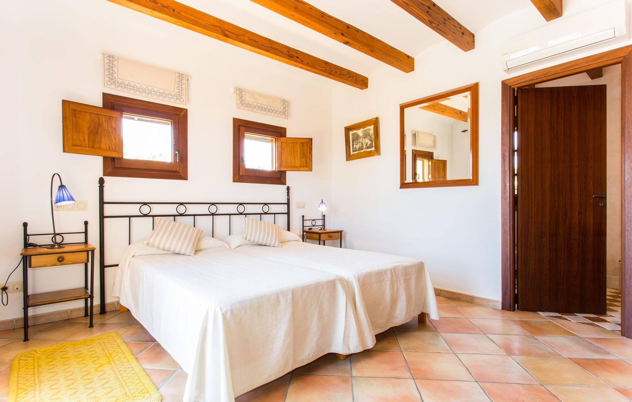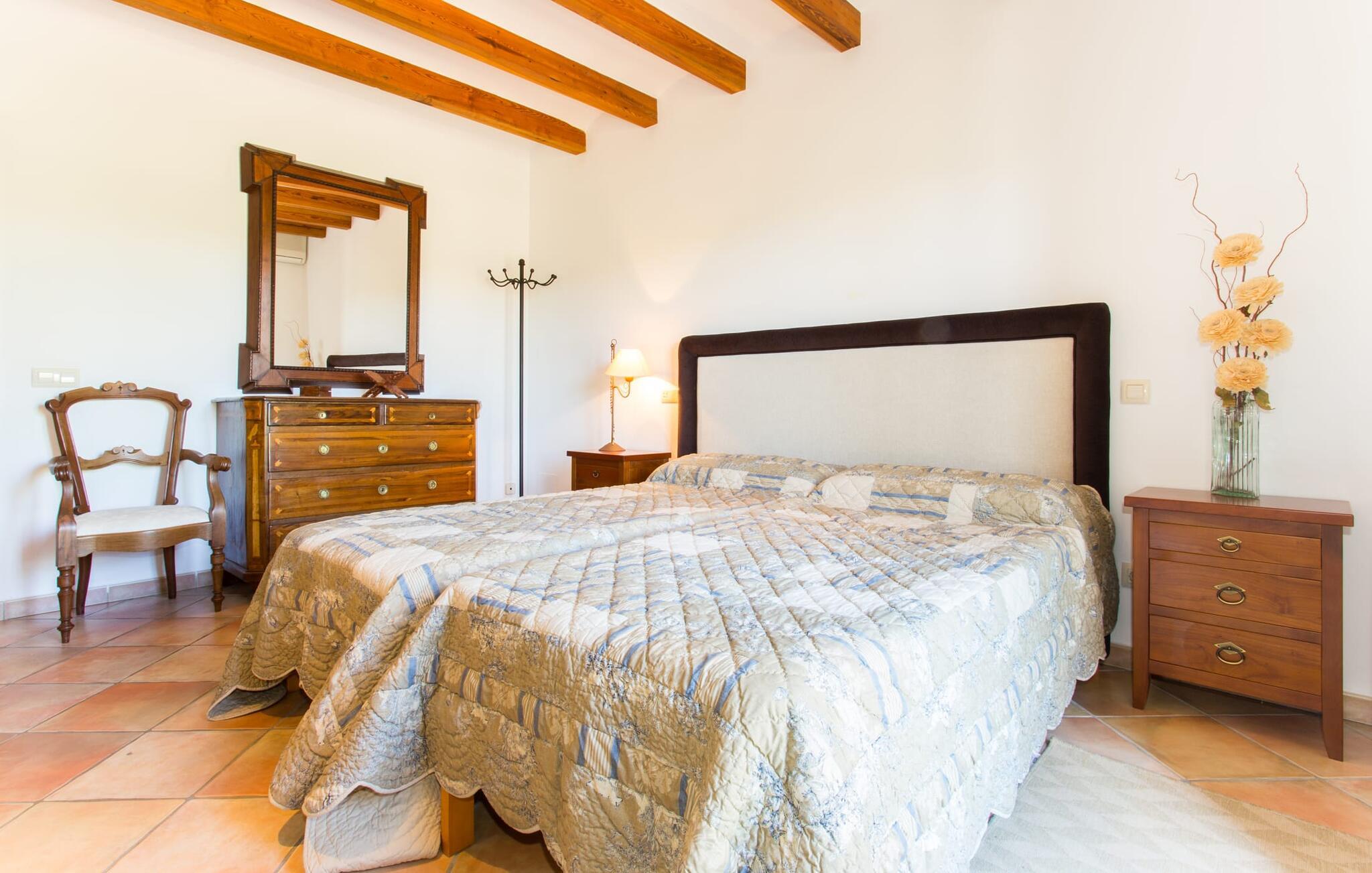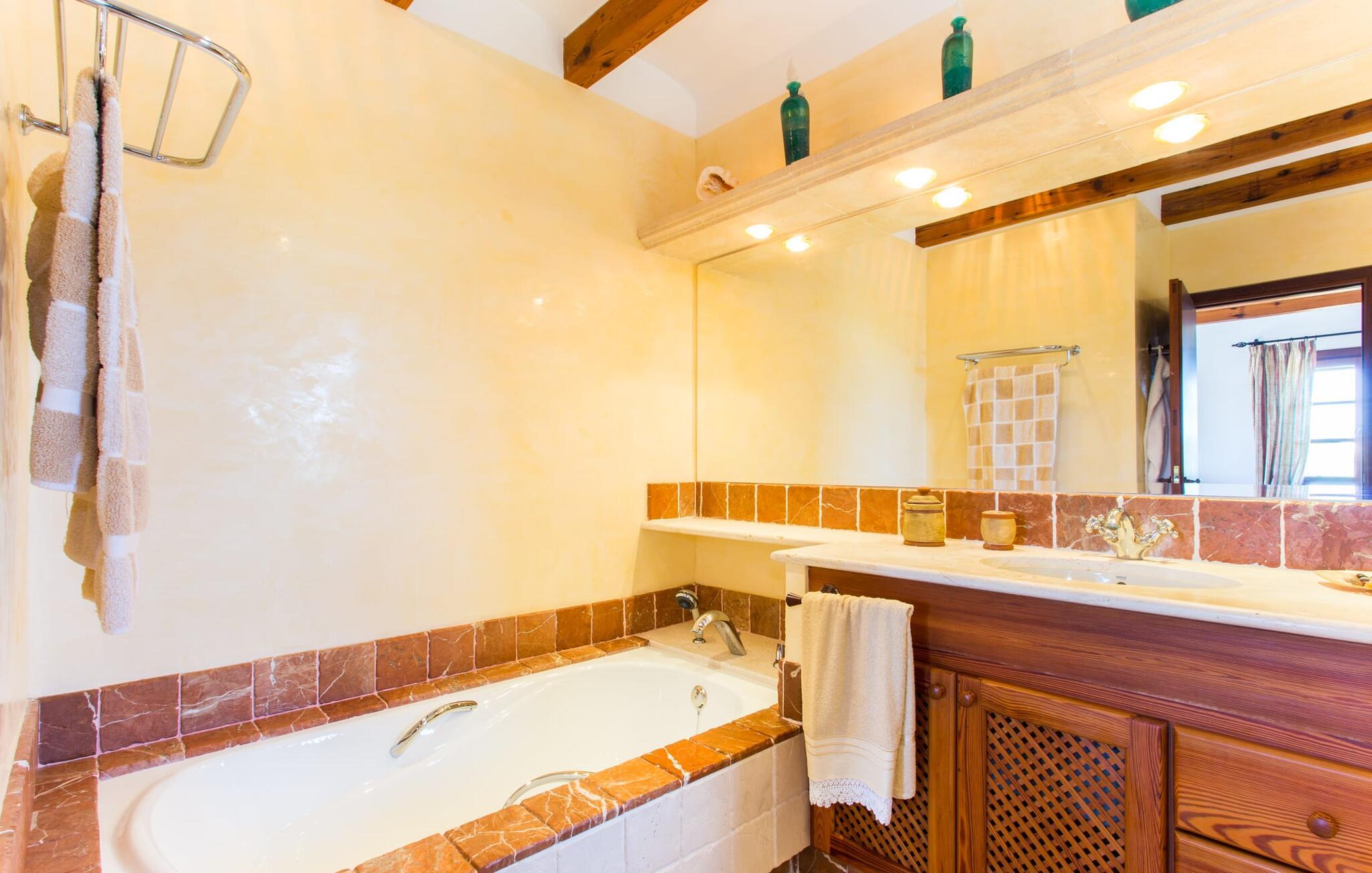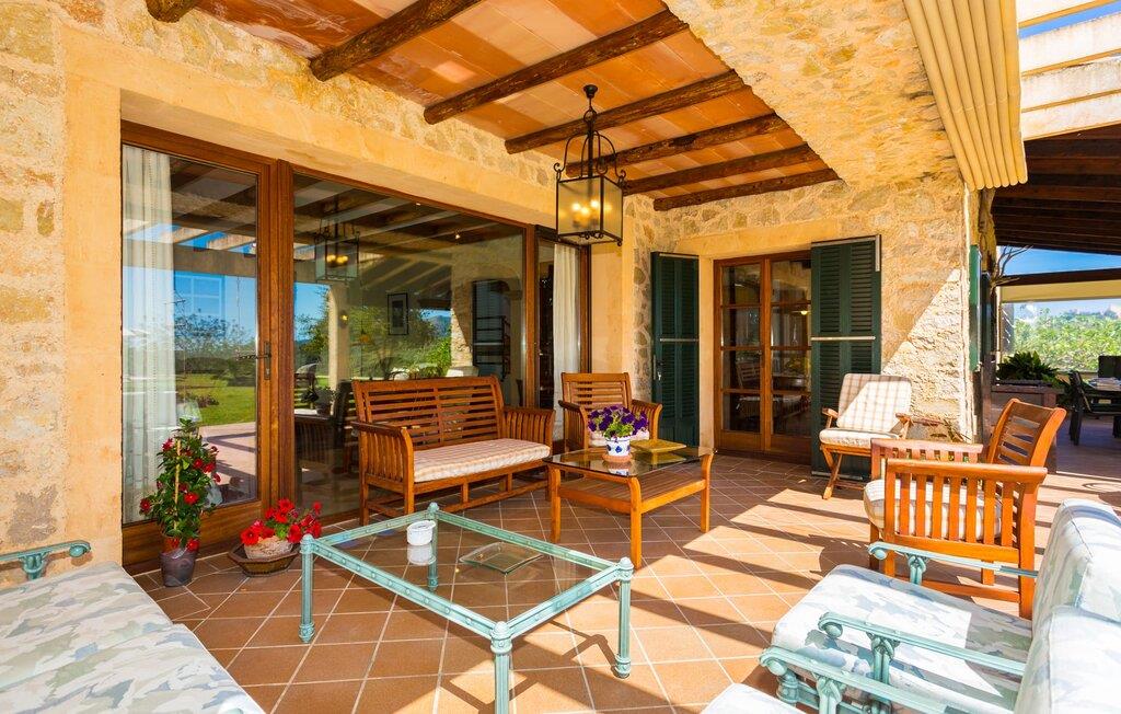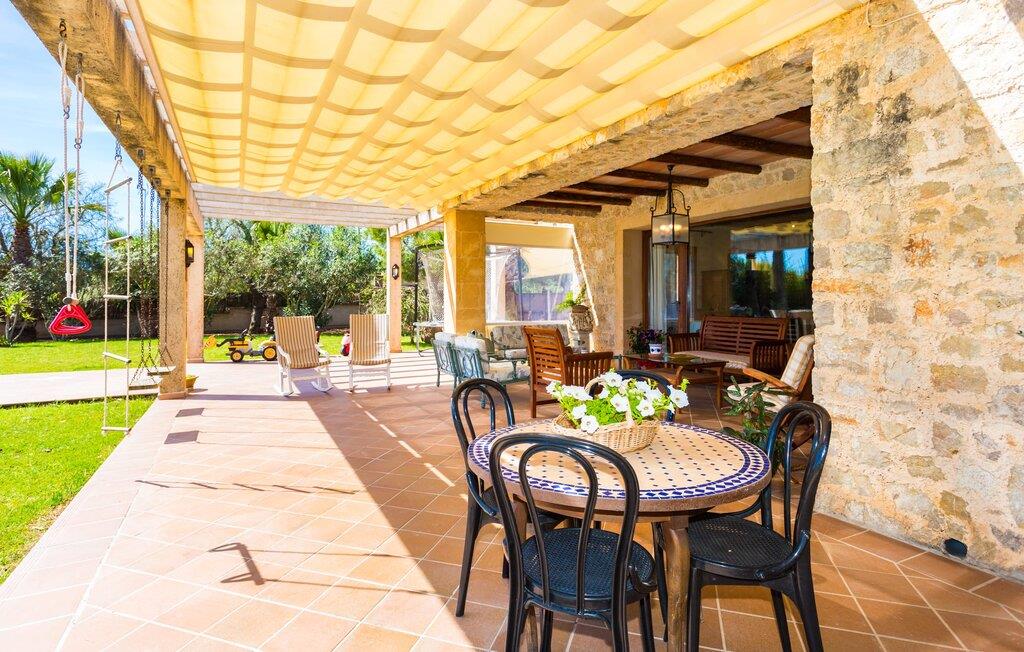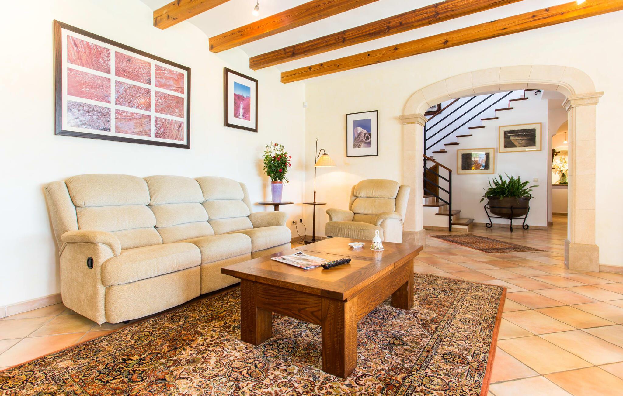Når I nærmer jer fincaen "Els Mitjans", vil I straks bemærke de høje palmer, der giver de rolige omgivelser et tropisk præg. Den velholdte have har en stor græsplæne, der fører til den elegante, afrundede pool. Det er omgivet af en stor solterrasse med liggestole og tilbyder et perfekt sted at slappe af, svømme eller se børnene plaske rundt. Nyd en betagende udsigt over det bølgende landskab fra poolområdet og fordyb jer i den fredelige landlige atmosfære. Den store terrasse, der strækker sig over to sider af villaen, har to sofagrupper, to spiseborde og masser af plads til udendørs sjov med legetøj til børnene, en trampolin og et bordtennisbord. Til udendørs madlavning er der et skyggefuldt grillområde til rådighed for grillning af lokale råvarer. Til øjeblikke af afslapning er der parasoller og et glasoverdækket område med udtrækkelige parasoller. Indvendigt åbner stuen direkte ud til haven, med smagfuld indretning og pejs til hyggelige aftener. De mallorcanske træbjælker og rustikke fliser skaber en varm, indbydende atmosfære. Det moderne køkken er veludstyret, og spisebordet er kun få skridt væk. Tre soveværelser, herunder et på nederste etage med eget badeværelse, tilbyder komfort og moderne badeværelser. Soveværelserne ovenpå har adgang til tagterrassen med en vidunderlig udsigt. Villaen "Els Mitjans" ligger afsondret på en ejendom på den østlige del af øen, cirka en kilometer fra Artà, hvor et landmandsmarked finder sted om tirsdagen. Strande og byer i den østlige del af øen er nemme at nå herfra. Der er ikke langt til Cala Ratjada, og den velkendte, smukke bugt Cala Torta ligger kun 5 km væk.