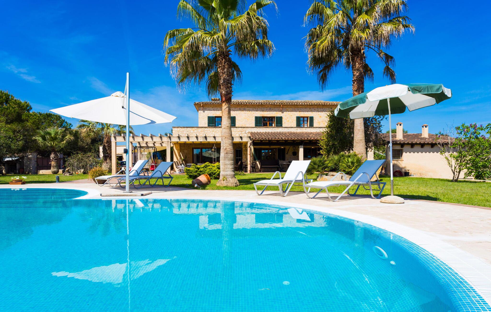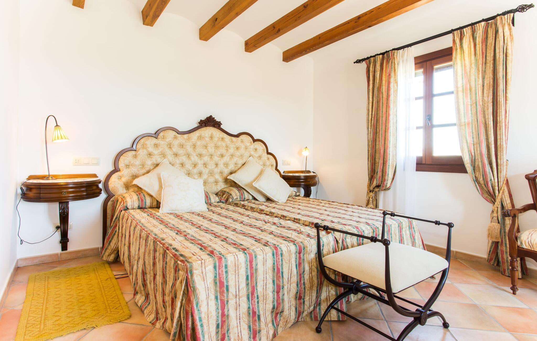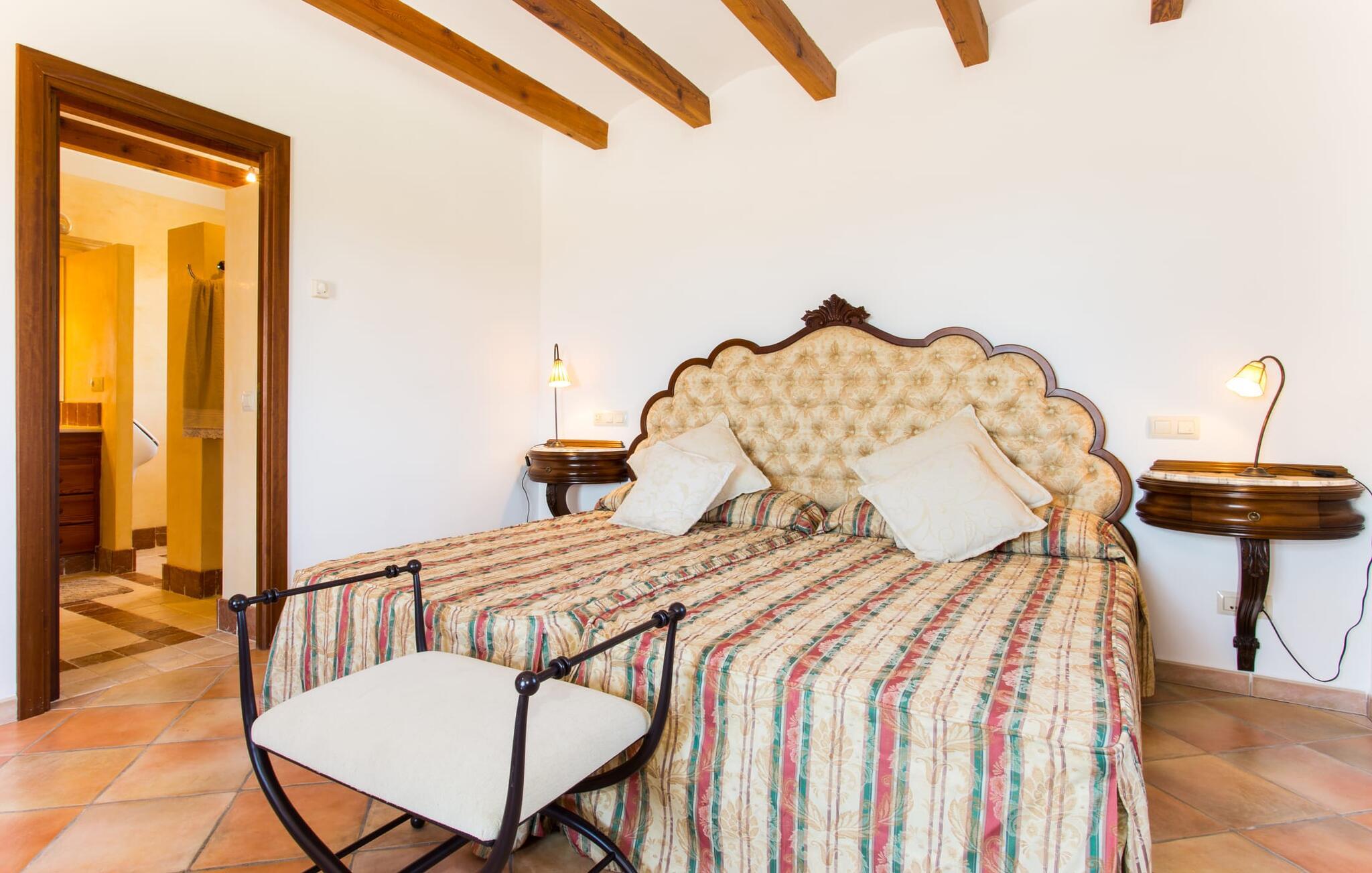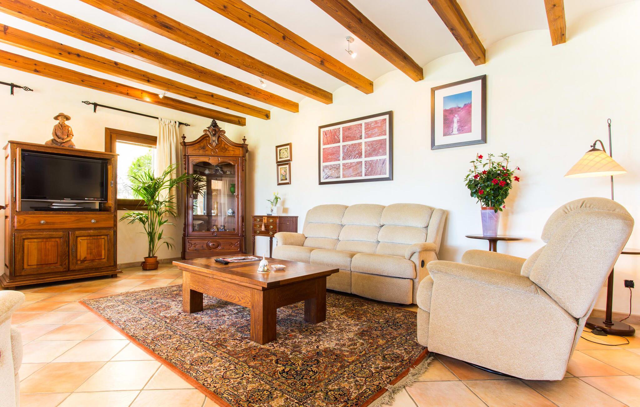 Når I nærmer jer fincaen "Els Mitjans", vil I straks bemærke de høje palmer, der giver de rolige omgivelser et tropisk præg. Den velholdte have har en stor græsplæne, der fører til den elegante, afrundede pool. Det er omgivet af en stor solterrasse med liggestole og tilbyder et perfekt sted at slappe af, svømme eller se børnene plaske rundt. Nyd en betagende udsigt over det bølgende landskab fra poolområdet og fordyb jer i den fredelige landlige atmosfære. Den store terrasse, der strækker sig over to sider af villaen, har to sofagrupper, to spiseborde og masser af plads til udendørs sjov med legetøj til børnene, en trampolin og et bordtennisbord. Til udendørs madlavning er der et skyggefuldt grillområde til rådighed for grillning af lokale råvarer. Til øjeblikke af afslapning er der parasoller og et glasoverdækket område med udtrækkelige parasoller. Indvendigt åbner stuen direkte ud til haven, med smagfuld indretning og pejs til hyggelige aftener. De mallorcanske træbjælker og rustikke fliser skaber en varm, indbydende atmosfære. Det moderne køkken er veludstyret, og spisebordet er kun få skridt væk. Tre soveværelser, herunder et på nederste etage med eget badeværelse, tilbyder komfort og moderne badeværelser. Soveværelserne ovenpå har adgang til tagterrassen med en vidunderlig udsigt. Villaen "Els Mitjans" ligger afsondret på en ejendom på den østlige del af øen, cirka en kilometer fra Artà, hvor et landmandsmarked finder sted om tirsdagen. Strande og byer i den østlige del af øen er nemme at nå herfra. Der er ikke langt til Cala Ratjada, og den velkendte, smukke bugt Cala Torta ligger kun 5 km væk.