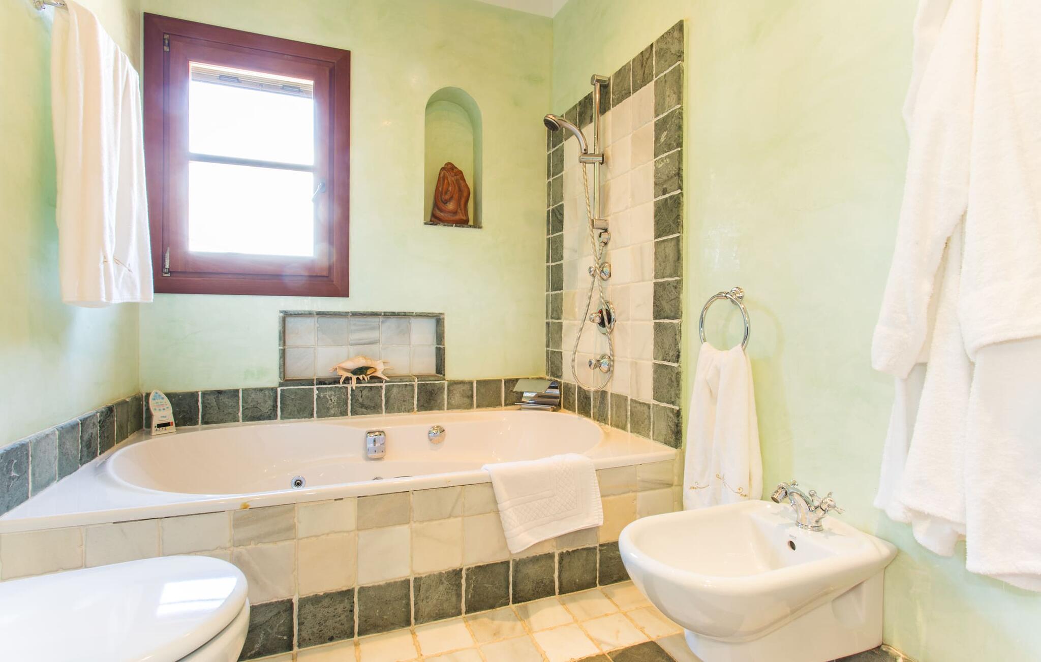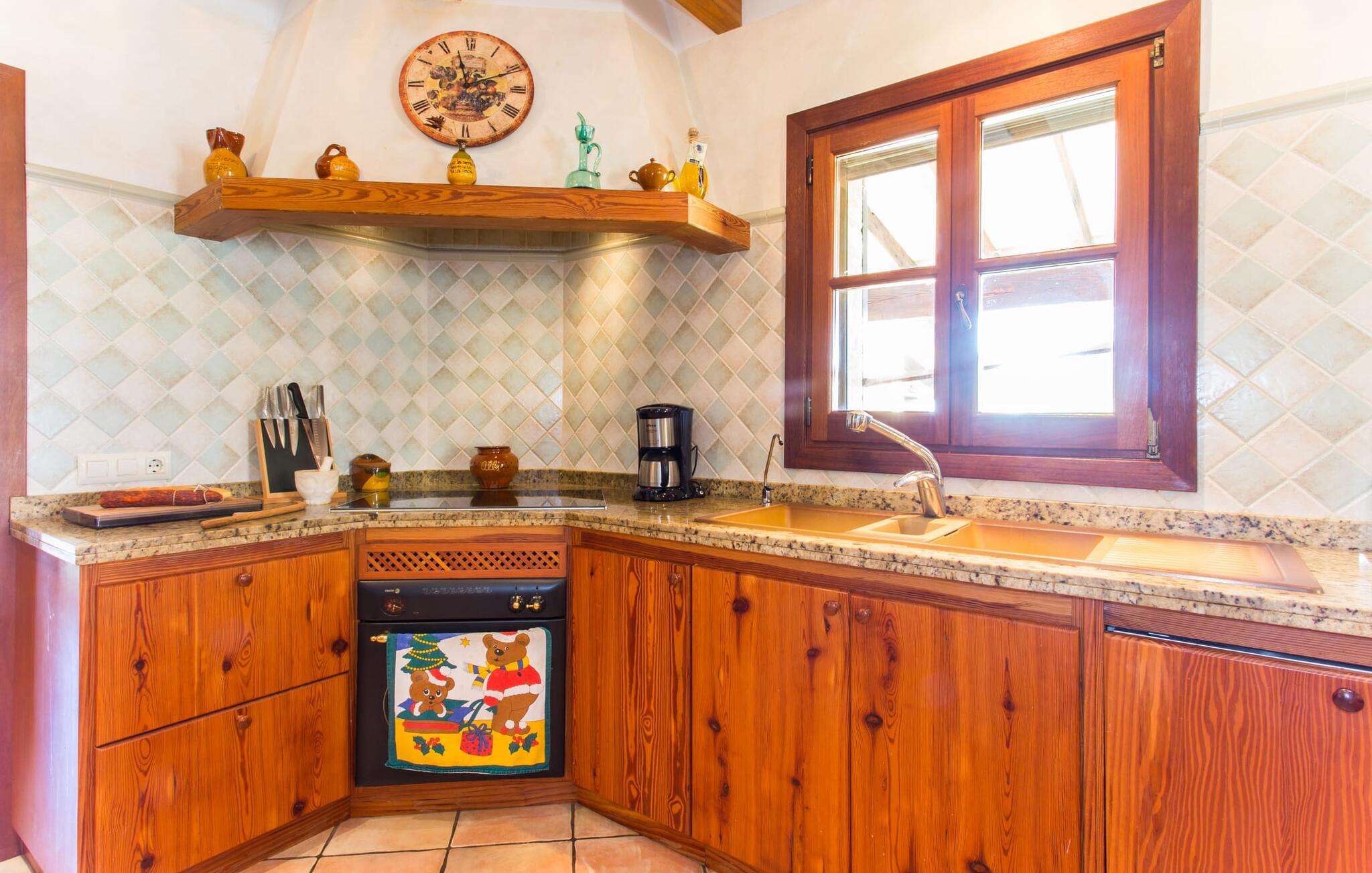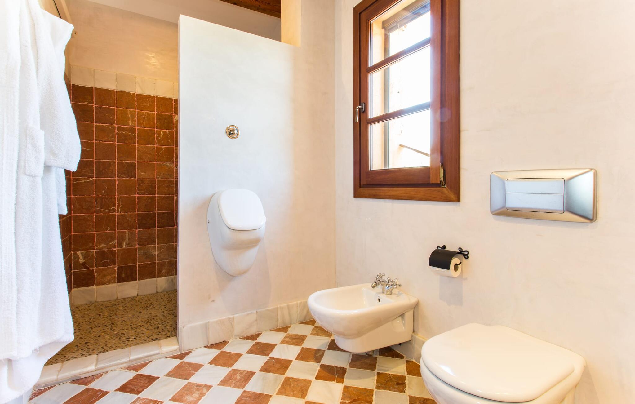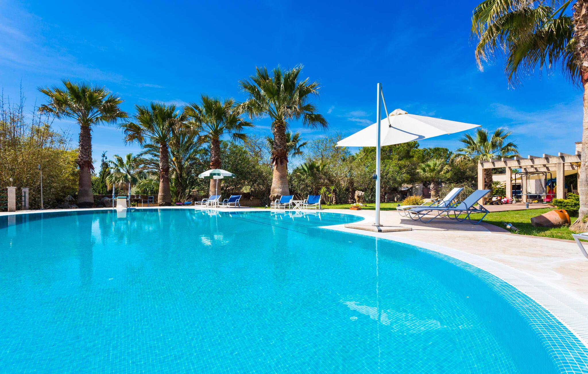 Når I nærmer jer fincaen "Els Mitjans", vil I straks bemærke de høje palmer, der giver de rolige omgivelser et tropisk præg. Den velholdte have har en stor græsplæne, der fører til den elegante, afrundede pool. Det er omgivet af en stor solterrasse med liggestole og tilbyder et perfekt sted at slappe af, svømme eller se børnene plaske rundt. Nyd en betagende udsigt over det bølgende landskab fra poolområdet og fordyb jer i den fredelige landlige atmosfære. Den store terrasse, der strækker sig over to sider af villaen, har to sofagrupper, to spiseborde og masser af plads til udendørs sjov med legetøj til børnene, en trampolin og et bordtennisbord. Til udendørs madlavning er der et skyggefuldt grillområde til rådighed for grillning af lokale råvarer. Til øjeblikke af afslapning er der parasoller og et glasoverdækket område med udtrækkelige parasoller. Indvendigt åbner stuen direkte ud til haven, med smagfuld indretning og pejs til hyggelige aftener. De mallorcanske træbjælker og rustikke fliser skaber en varm, indbydende atmosfære. Det moderne køkken er veludstyret, og spisebordet er kun få skridt væk. Tre soveværelser, herunder et på nederste etage med eget badeværelse, tilbyder komfort og moderne badeværelser. Soveværelserne ovenpå har adgang til tagterrassen med en vidunderlig udsigt. Villaen "Els Mitjans" ligger afsondret på en ejendom på den østlige del af øen, cirka en kilometer fra Artà, hvor et landmandsmarked finder sted om tirsdagen. Strande og byer i den østlige del af øen er nemme at nå herfra. Der er ikke langt til Cala Ratjada, og den velkendte, smukke bugt Cala Torta ligger kun 5 km væk.