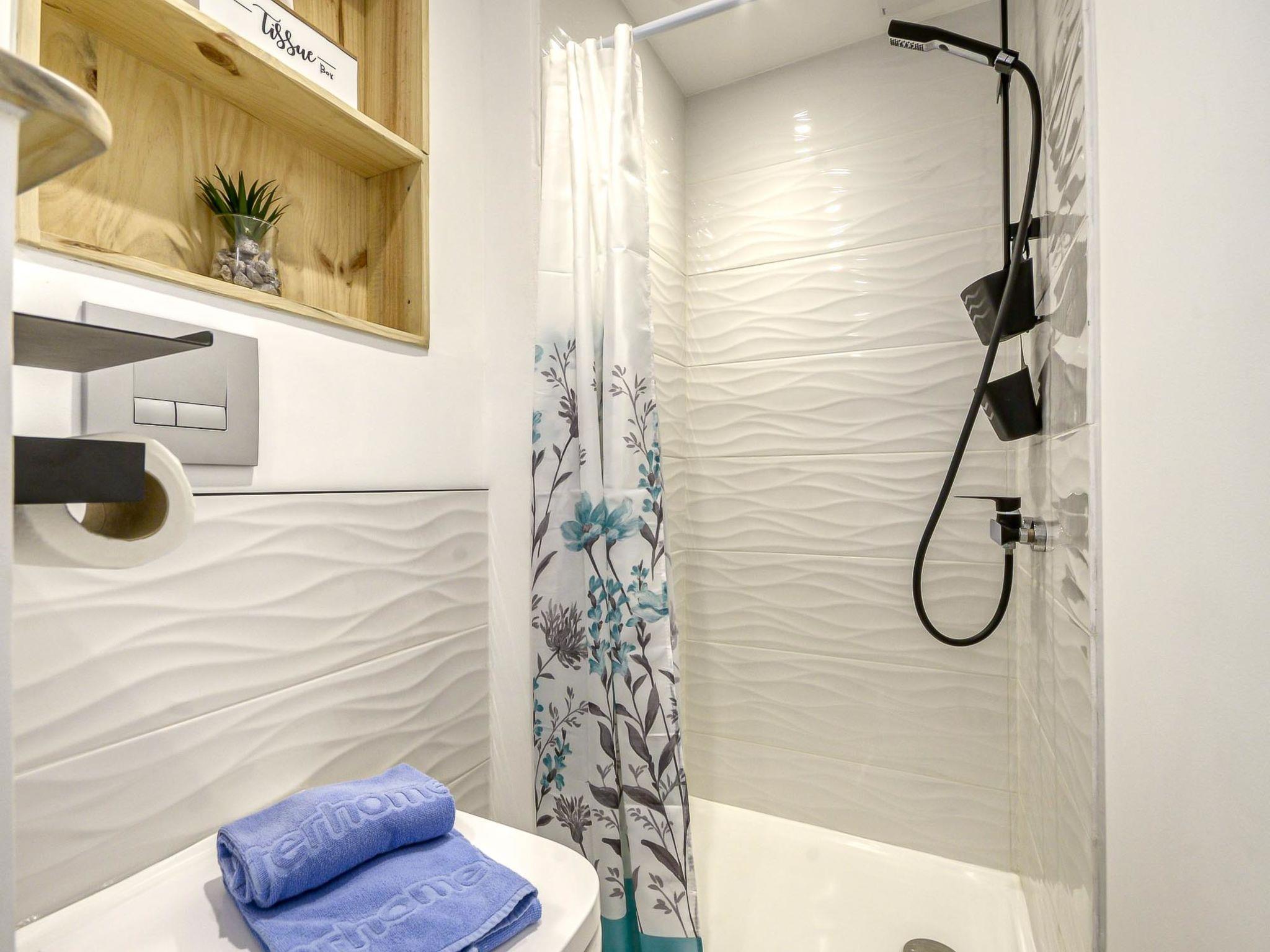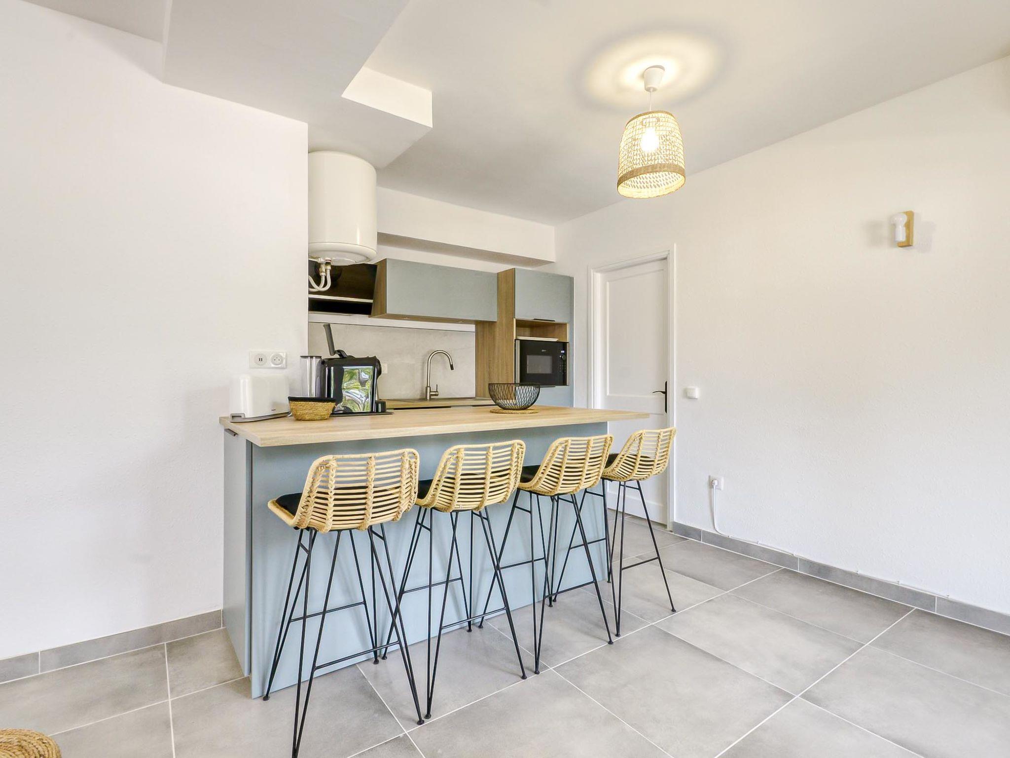 2-room apartment 40 m2, on the mezzanine. Comfortable and modern furnishings: living/dining room with 1 double sofabed (140 cm, length 190 cm), dining table, satellite TV, flat screen, air conditioning and forced-air heating. Exit to the terrace. 1 room with 1 french bed (160 cm, length 190 cm), air conditioning and forced-air heating. Open kitchen (dishwasher, 2 induction hot plates, toaster, kettle, electric coffee machine, combination microwave). Shower/WC. Terrace 12 m2. Terrace furniture. View of the garden. Facilities: washing machine, iron, hair dryer. Internet (WiFi, free). Please note: non-smokers only. TV only DE. HUTG-020662