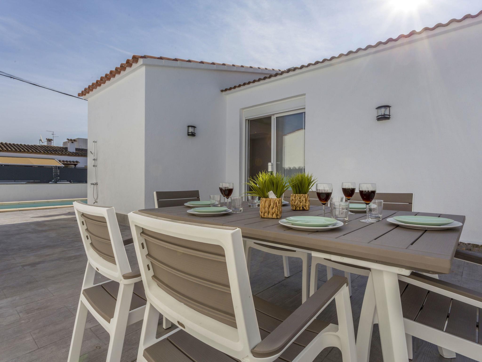 Beautiful, cosy, comfortable house "Sangha", renovated in 2019. In the district of Sant Maurici 2 km from the centre of Empuriabrava, in a quiet, sunny position residential area (villas), traffic calmed area, 3 km from the sea, 200 m from the lake. Private: property 100 m2 (fenced) with lawn, swimming pool angular (7 x 3 m, depth 150 cm, seasonal availability: 01.May. - 30.Oct.). Outdoor shower, terrace, garden furniture, barbecue. Shop 100 m, grocery, supermarket, shopping centre 700 m, restaurant 200 m, bar 100 m, internet café, bus stop 1 km, sandy beach "Empuriabrava" 3 km. Sports harbour 3 km, golf course (18 hole) 12 km, sailing school 3 km, tennis 650 m, minigolf 2 km, riding stable 2 km, walking paths from the house 200 m, cycle lane. Nearby attractions: Aeródromo y túnel del viento 400 m, Parque Acuático Roses 6 km, Casino y festival de Peralada 14 km, Museo Dalí Figueres 15 km, Ruïnes de Sant Martí de Empúries 21 km, Monasterio de Sant Pere de Rodes 23 km. Groups of teenagers on request only. The keys‘ handover takes place by the agency Interhome in Empuriabrava.