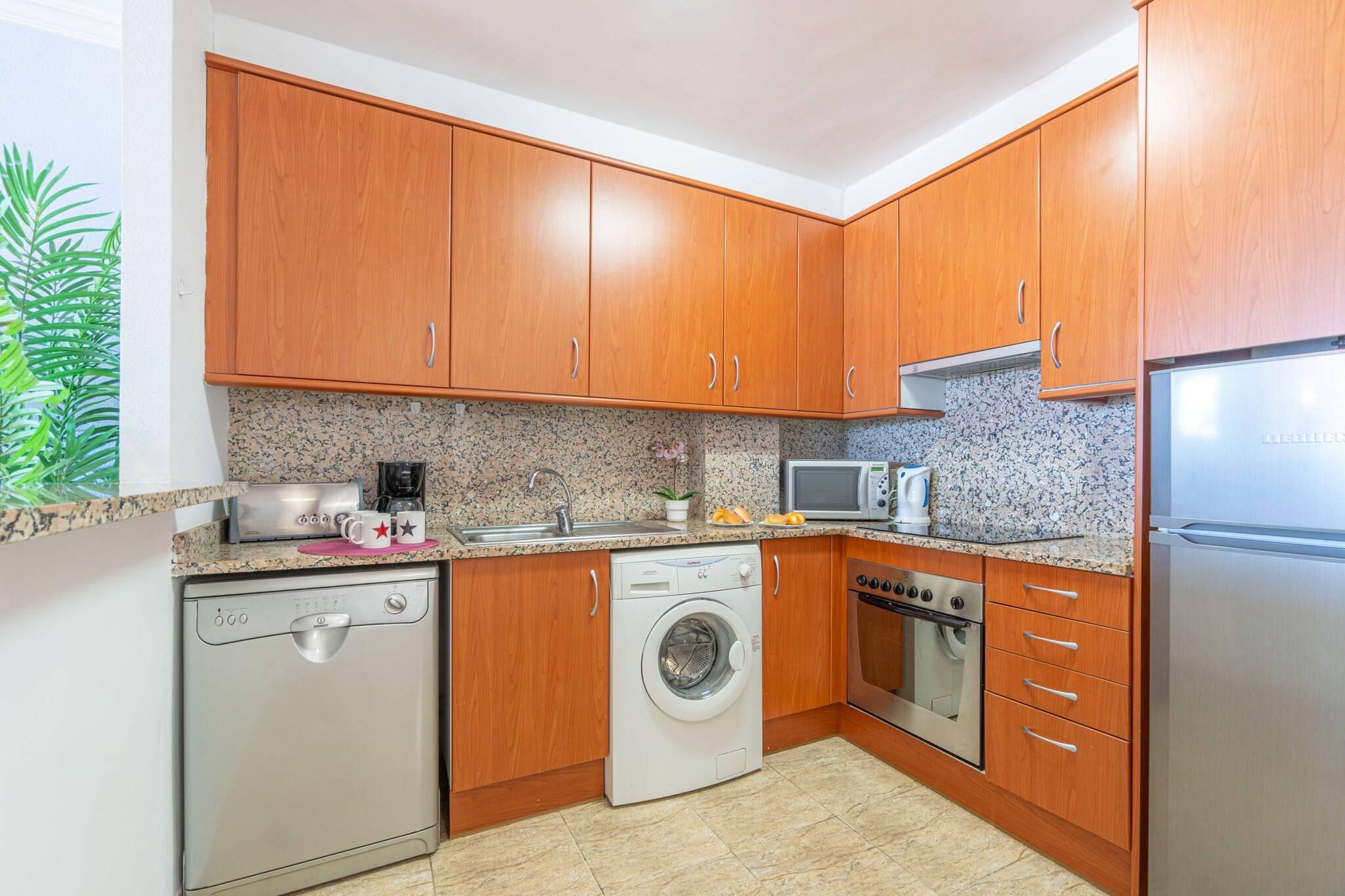På 3. etage: (åbent køkken(kogeplade(glaskeramisk), elkedel, brødrister, kaffemaskine, ovn, mikrobølgeovn, opvaskemaskine , køle-fryseskab, ), stue / spisestue(enkeltsovesofa, Fjernsyn(parabol), spisebord, sofahjørne), soveværelse(enkeltseng, enkeltseng), soveværelse(dobbeltseng), badeværelse(badekar, håndvask, toilet), badeværelse(bruser, håndvask, toilet)) , Internetadgang, Havemøbler, vaskemaskine, klimaanlæg, terrasse, parkering, swimmingpool(deles med andre gæster), strygejern, luft til luft-varmepumpe