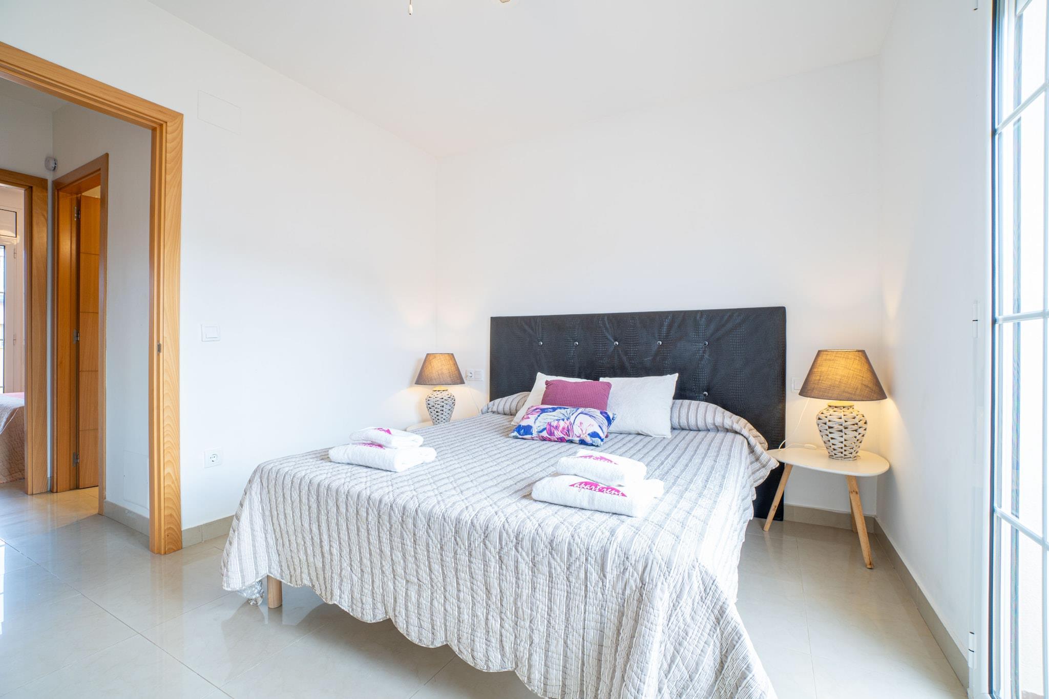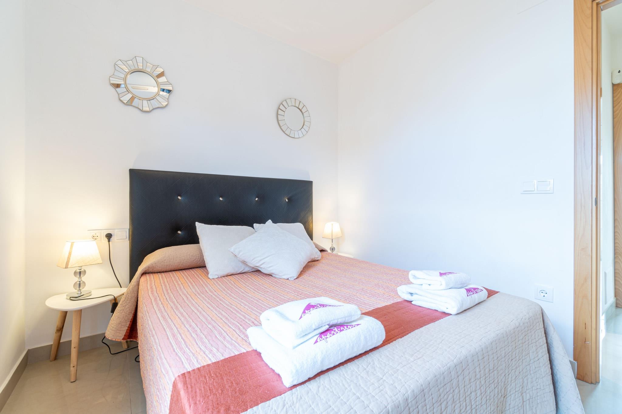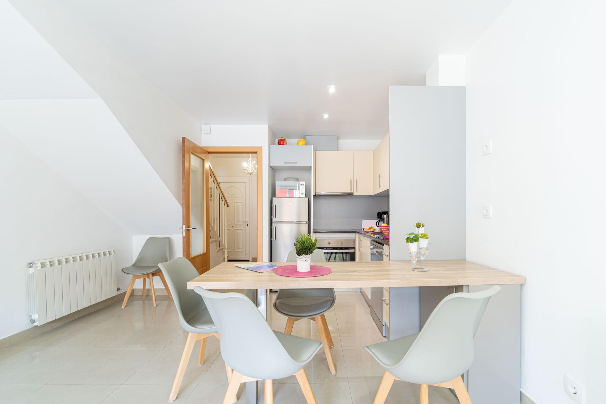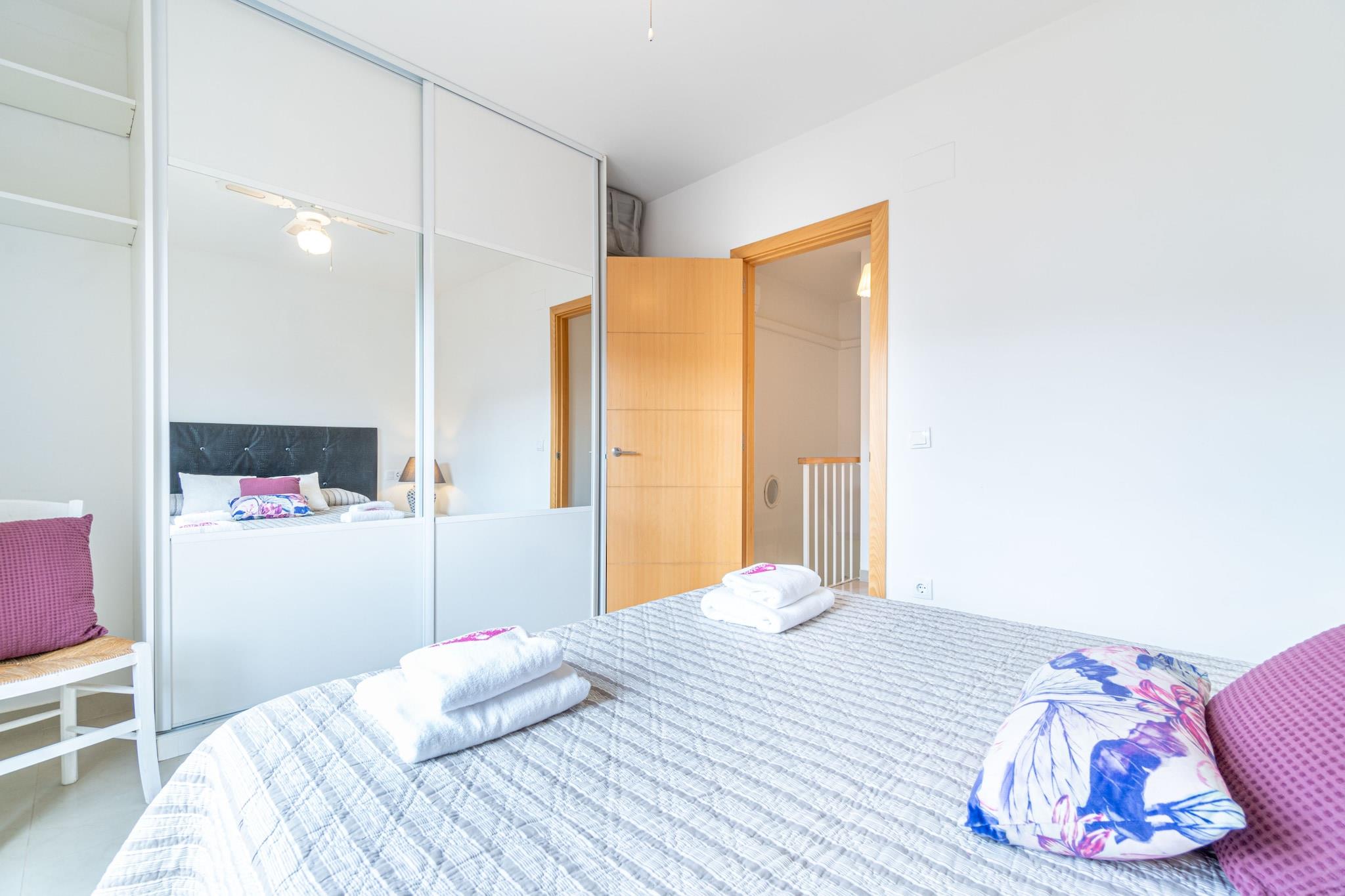 Dette moderne og komfortable hus med 2 soveværelser i Empuriabrava er ideelt til familier eller små grupper og har plads til op til 6 gæster. Med et boligareal på 60 m² ligger huset i et roligt boligområde, kun 3 km fra stranden og tæt på naturattraktioner som Muga-floden og naturreservatet Aiguamolls de l'Empordà. Det er også bekvemt placeret i nærheden af butikker, restauranter og den historiske by Castelló d'Empúries. Huset har to dobbeltværelser og en dobbelt sovesofa i opholdsstuen. Det åbne køkken er fuldt udstyret med keramisk kogeplade, ovn, mikrobølgeovn, opvaskemaskine, kaffemaskine, brødrister, elkedel og endda en juicer. Gæsterne kan nyde en privat terrasse med havemøbler, balkon, Wi-Fi, satellit-tv og aircondition i stuen. En vaskemaskine, strygejern og garage i samme bygning bidrager til bekvemmeligheden. Kæledyr er velkomne efter anmodning, og ejendommen har gode forbindelser til lokale attraktioner såsom vandlandet Aquabrava (10 km), Peralada Golf (16 km) og Figueres AVE/TGV-stationen (20 km). Girona Lufthavn ligger 65 km væk. Med sine moderne faciliteter, fredelige omgivelser og nemme adgang til både natur og byliv er dette hus et godt valg til en afslappende og alsidig ferie i Empuriabrava.