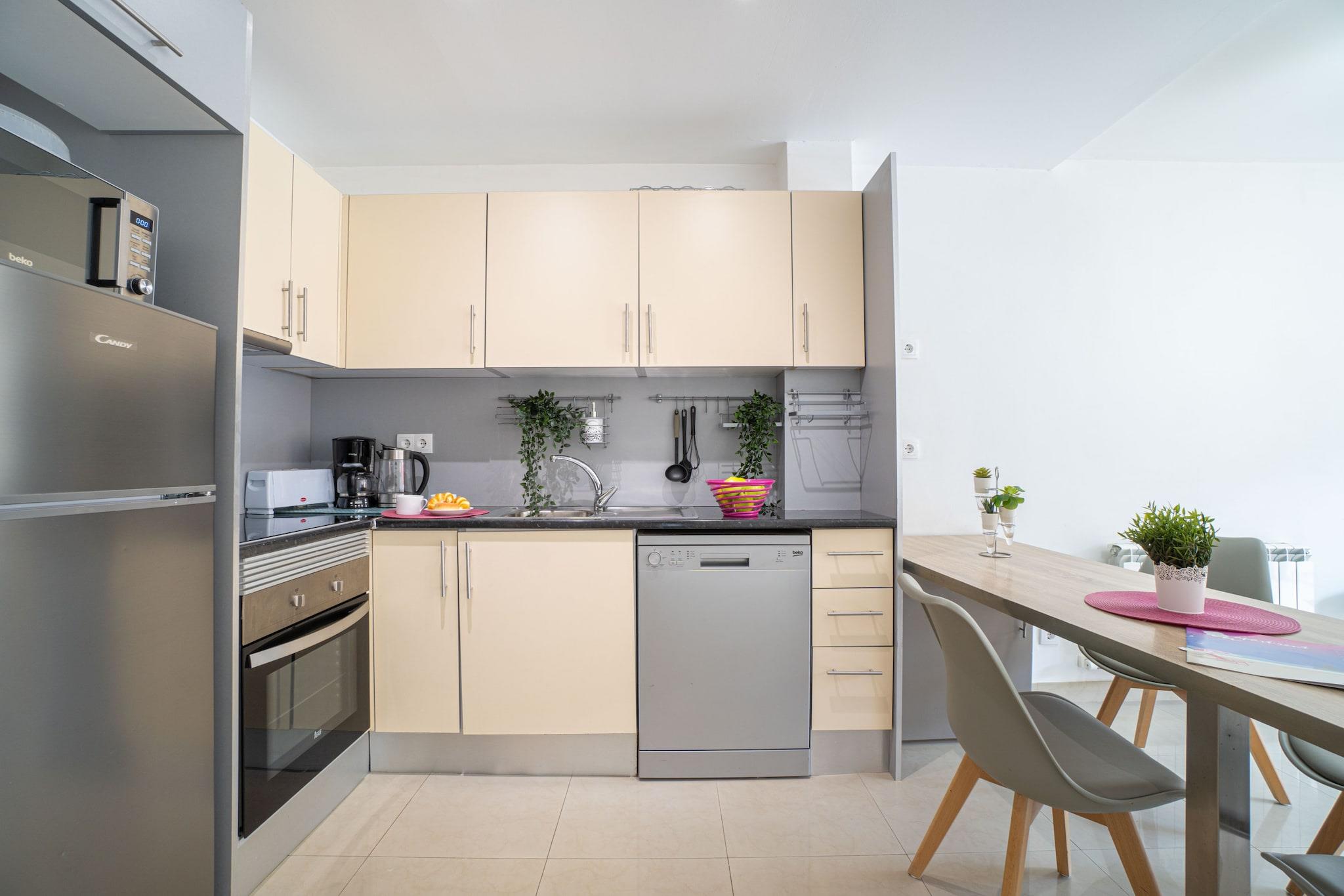 , , Stue(dobbeltsovesofa, Fjernsyn(parabol), spisebord), åbent køkken(kogeplade(glaskeramisk), elkedel, brødrister, kaffemaskine, ovn, mikrobølgeovn, opvaskemaskine , køle-fryseskab, Stavblender, ), soveværelse(dobbeltseng), soveværelse(dobbeltseng), badeværelse(bruser), toilet(toilet), Havemøbler, vaskemaskine, balkon, varme(central), klimaanlæg, terrasse, parkering, strygejern