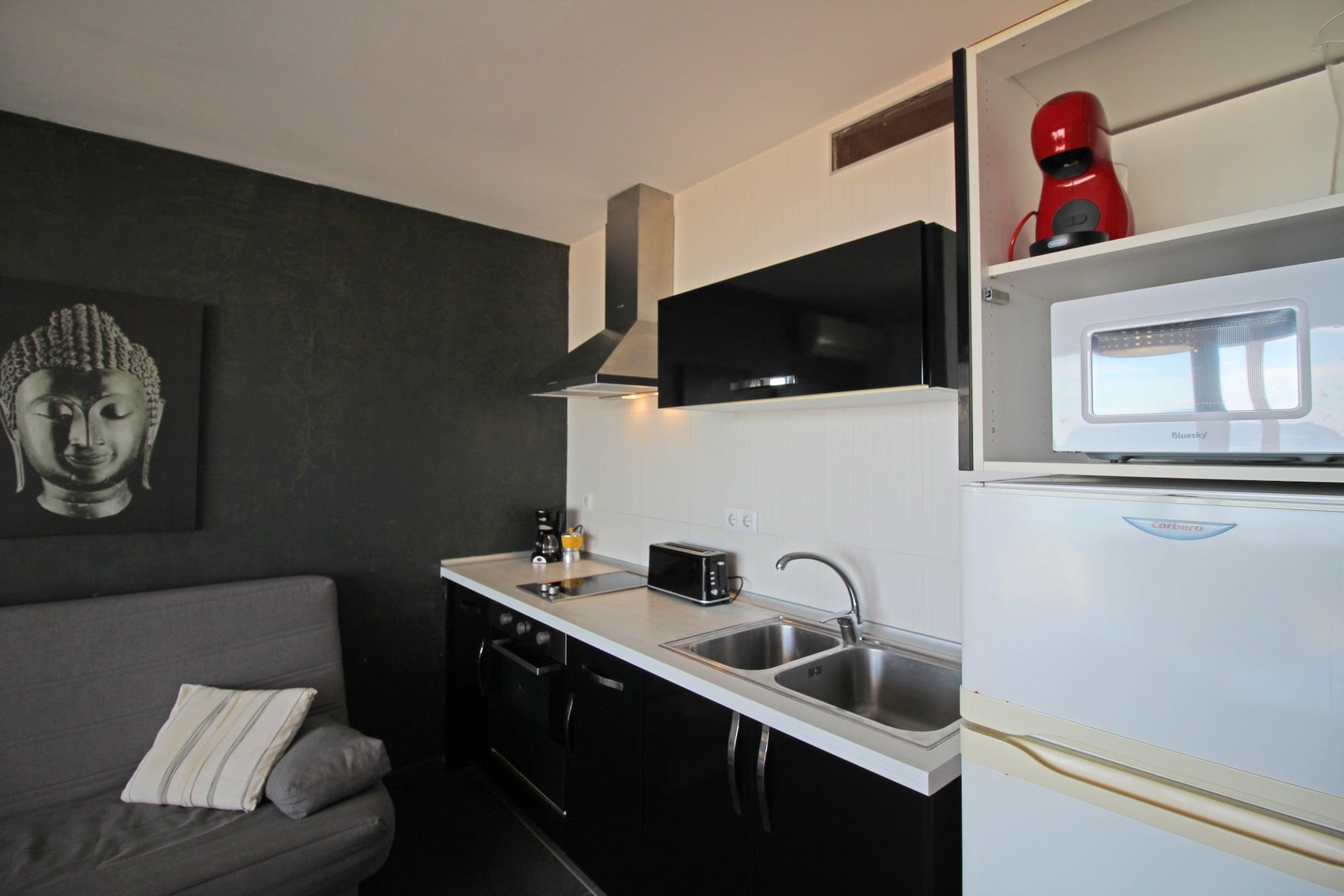 Dette lyse og moderne 42 m² store studie er perfekt beliggende ved stranden i Empuriabrava og tilbyder en fantastisk havudsigt samt plads til op til 3 gæster. Studiet, der ligger på 16. sal, har en dobbeltseng og en enkelt sovesofa, hvilket gør det ideelt for par eller små familier, der søger en afslappende ferie ved kysten. Den private terrasse på 8 m² er et perfekt sted at nyde morgenkaffen eller solnedgangen over Middelhavet. Det åbne køkken er fuldt udstyret med keramisk kogeplade, køleskab, mikrobølgeovn, ovn, kaffemaskine, brødrister og vaskemaskine, der tilbyder alt, hvad der behøves for et behageligt ophold. Studiet har også aircondition i opholdsstuen, Wi-Fi (valgfrit), tv og varmepumpe. Havemøbler på terrassen bidrager til komforten i dette veludstyrede rum. Studioet ligger kun 50 meter fra sandstranden og tæt på restauranter, butikker og et supermarked i et livligt område, der er ideelt for strandelskere og opdagelsesrejsende. Nærliggende attraktioner omfatter vandlandet Aquabrava (9 km), Peralada Golfbane (16 km) og Dalí-museet i Figueres (20 km). Girona Lufthavn ligger 65 km væk, hvilket giver nem adgang for rejsende.
