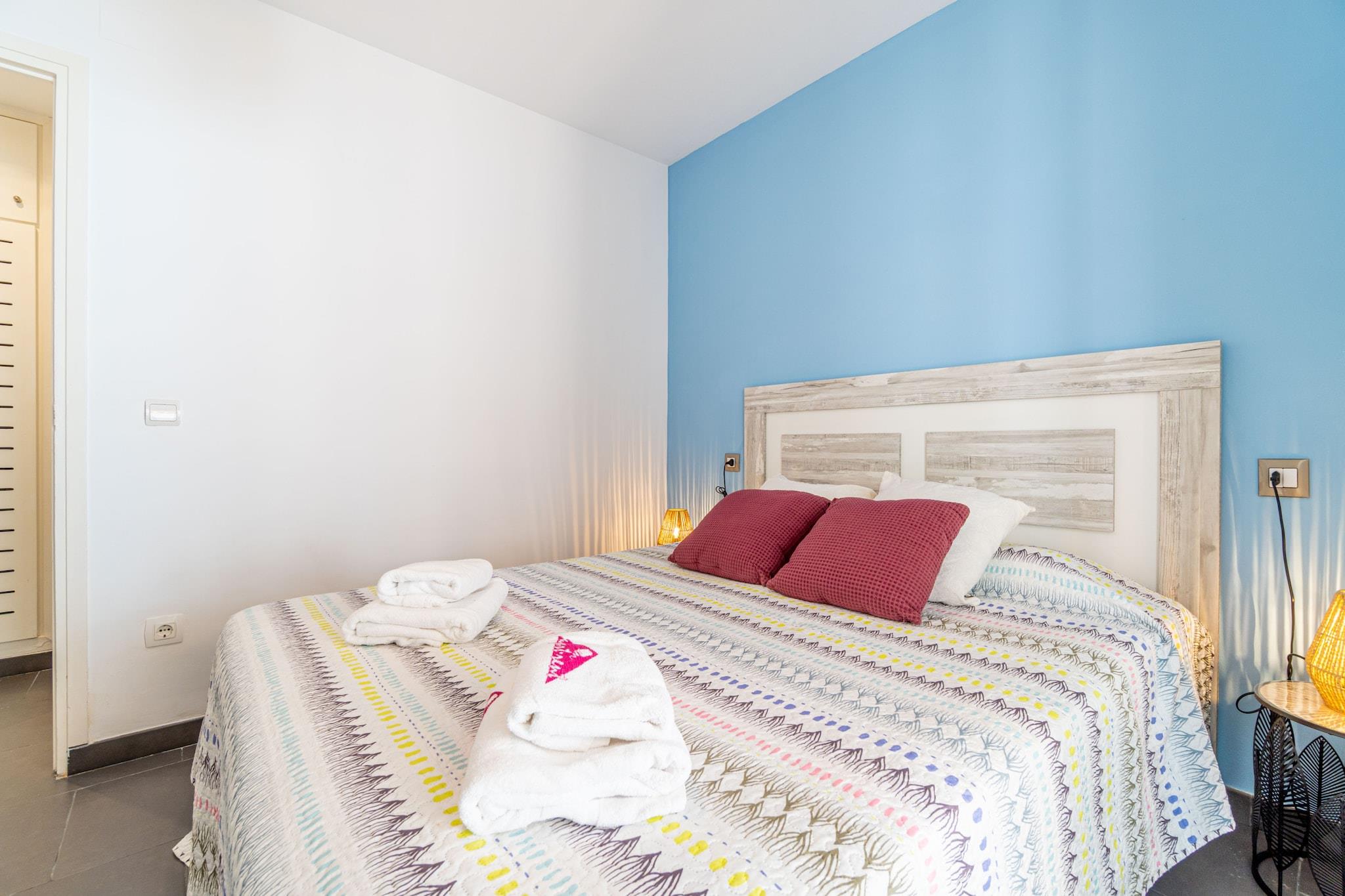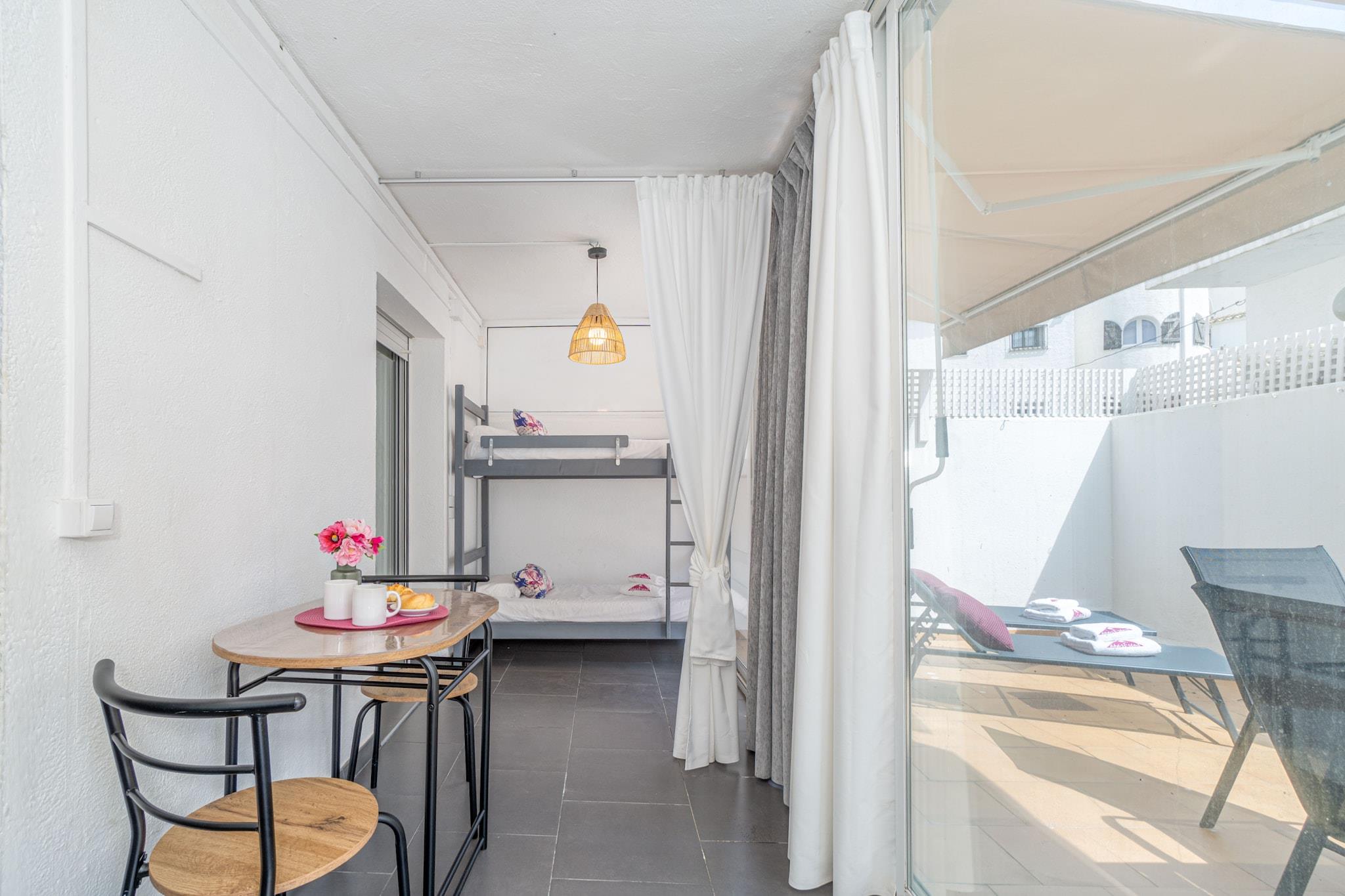 Denne hyggelige lejlighed på 55 m² i stueetagen i Empuriabrava er perfekt til par eller små familier og tilbyder indkvartering til op til 4 gæster. Den har et soveværelse med en dobbeltseng og en køjeseng i fællesområdet, hvilket gør den til et praktisk og komfortabelt valg til en strandferie. En privat terrasse med havemøbler giver et afslappende udendørsområde kun 450 meter fra sandstranden. Det åbne køkken er fuldt udstyret med keramisk kogeplade, køleskab, mikrobølgeovn, ovn, opvaskemaskine, kaffemaskine og brødrister - ideelt til at tilberede måltider derhjemme. Lejligheden har også aircondition, Wi-Fi (inkluderet), vaskemaskine og satellit-tv med kanaler på spansk, tysk og fransk. Kæledyr er velkomne efter anmodning, hvilket gør den til en god mulighed for rejsende med pelsede venner. Lejligheden har en bekvem beliggenhed kun 150 meter fra et supermarked og tæt på restauranter og butikker, og er godt placeret til at udforske området. Nærliggende attraktioner inkluderer Peralada Golfbane (16 km), Dalí-museet i Figueres (20 km) og Girona Lufthavn (65 km). Med sin komfortable planløsning og fremragende beliggenhed tilbyder denne lejlighed et afslappende og overkommeligt ophold på Costa Brava.