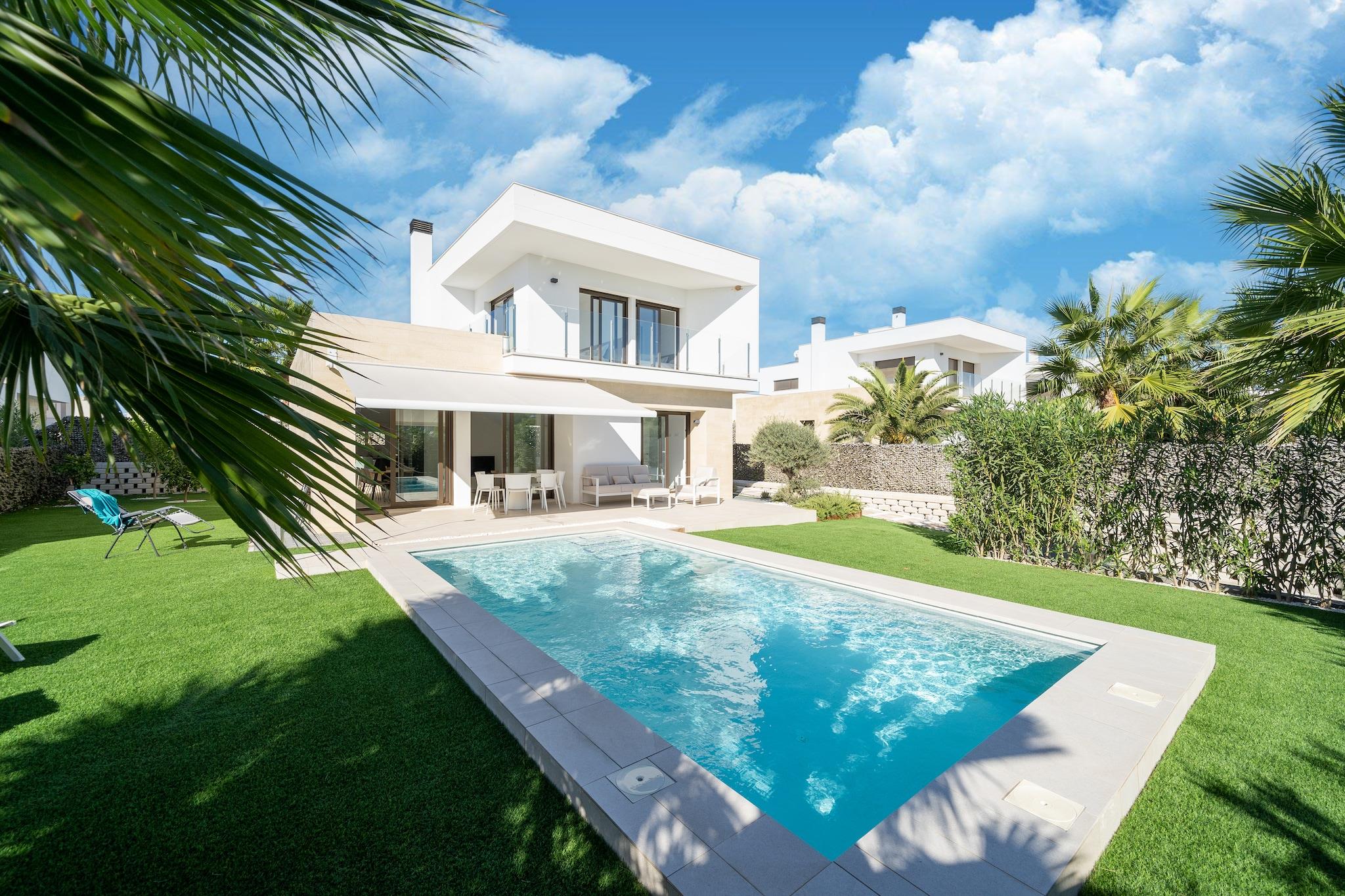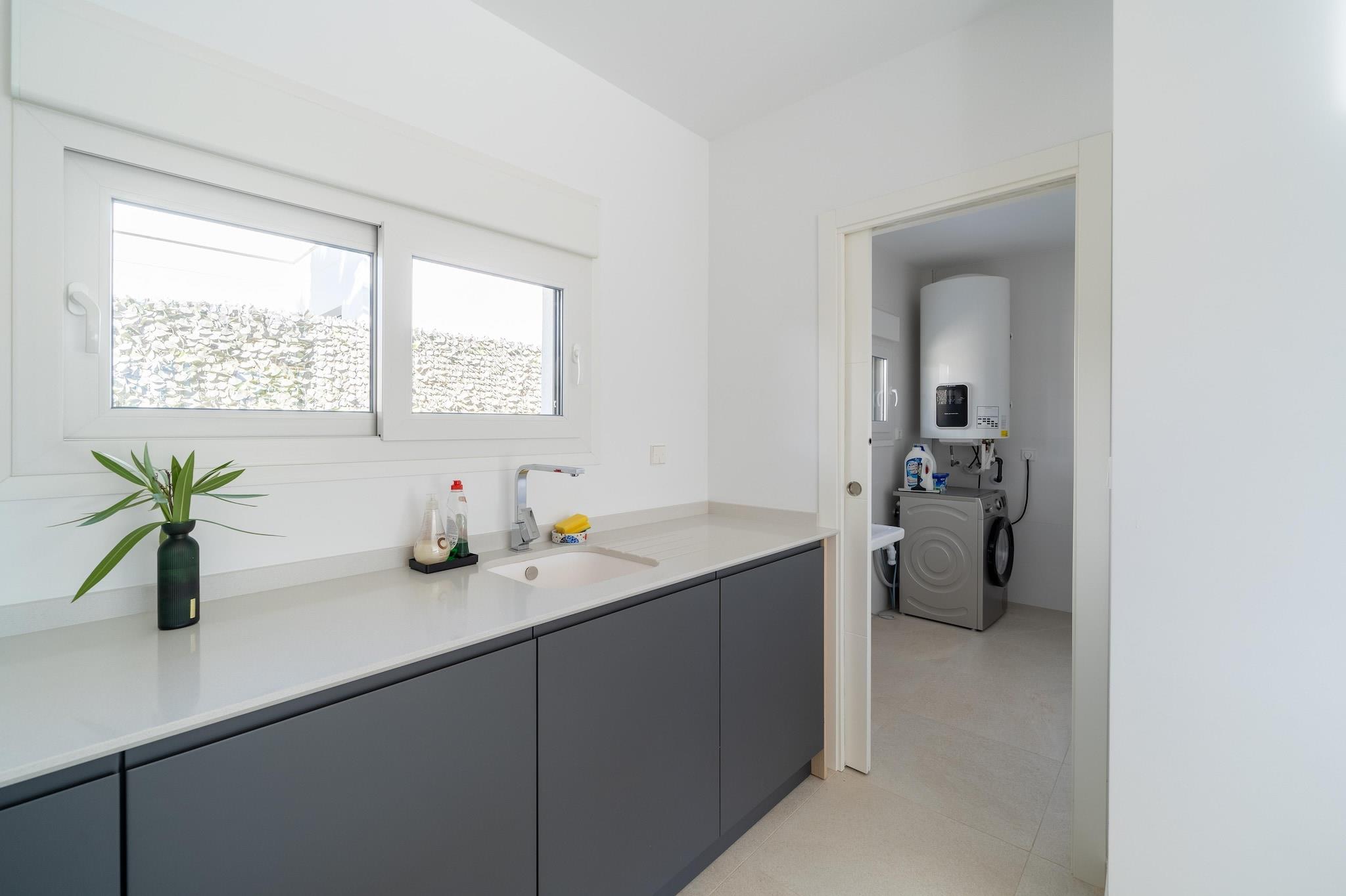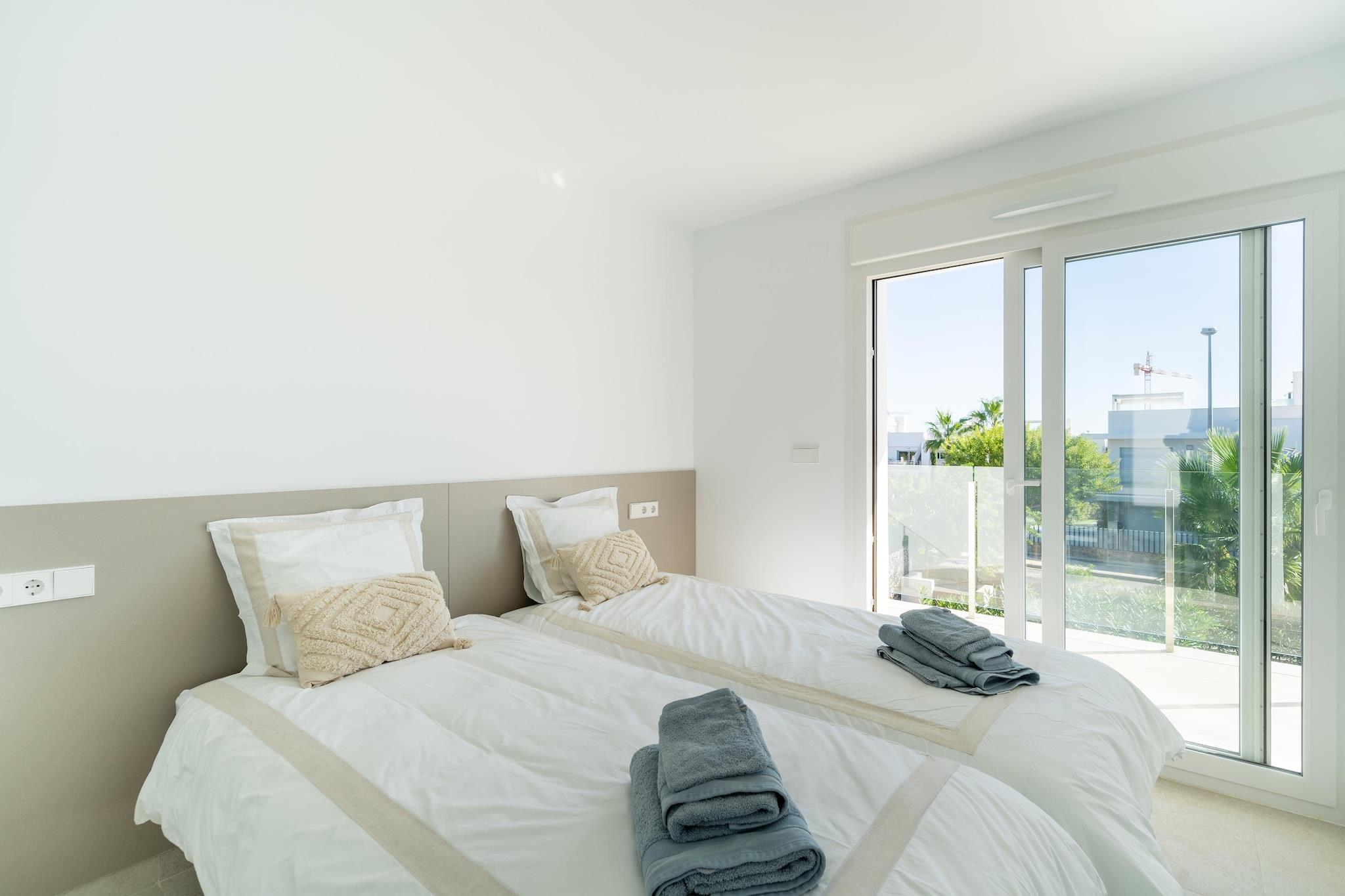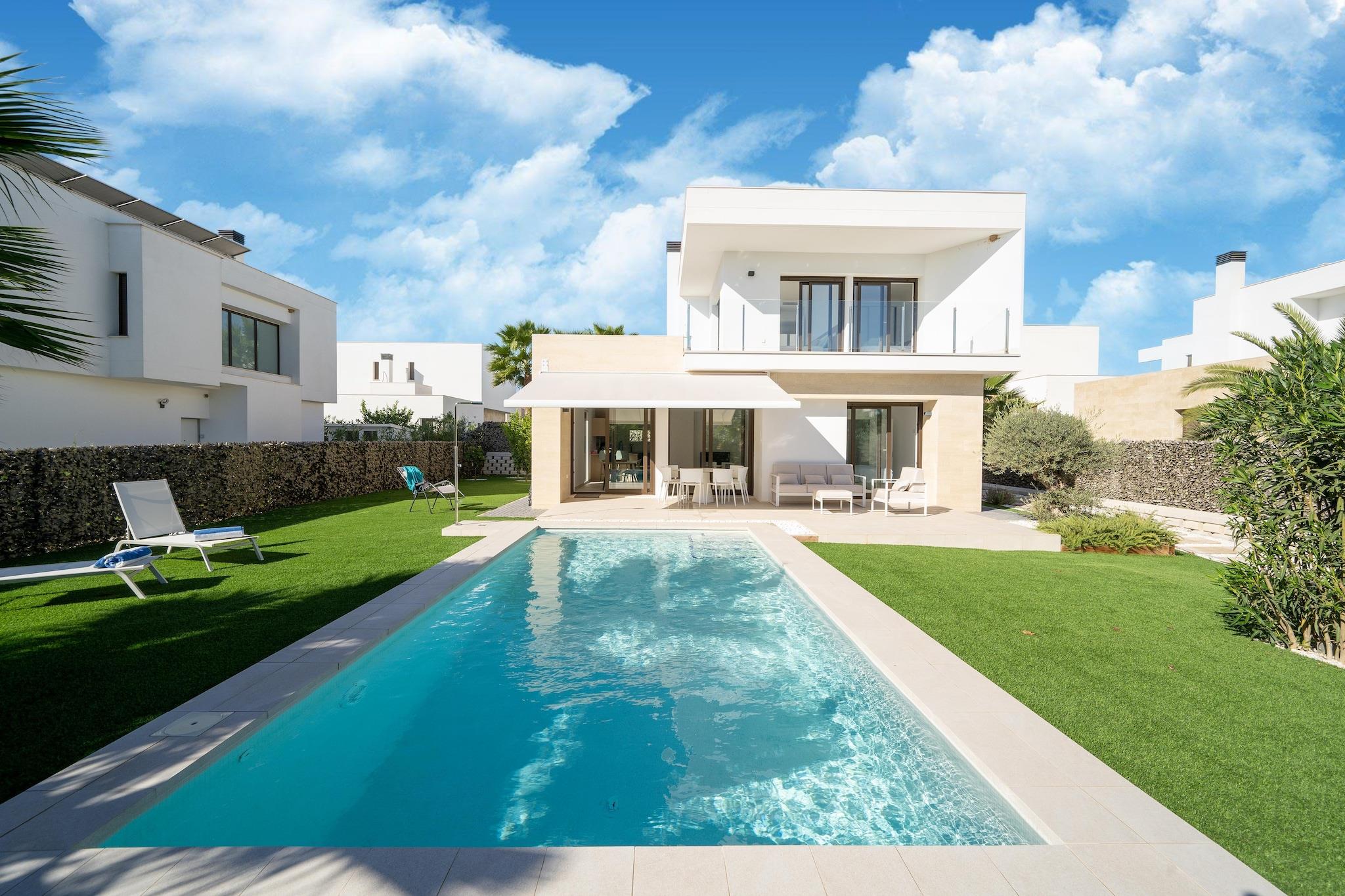 Flygt til denne luksuriøse nybyggede villa i Orihuela, beliggende på en rummelig grund og designet til komfort, stil og afslapning. Hjemmet er perfekt til familier eller venner og har eksklusive møbler, en privat pool med omgivende belysning og en stor terrasse med udsigt over en smukt anlagt have. Stueetagen har et åbent køkken udstyret med en keramisk kogeplade, ovn, mikroovn, køleskab med fryser, opvaskemaskine og kaffemaskine, ideel til at tilberede måltider til at nyde udendørs. Terrassen inkluderer en elektrisk markise og premium udendørsmøbler, hvilket skaber en perfekt ramme for spisning eller aftenslapning. Ovenpå åbner to solbelyste soveværelser ud til private terrasser, der tilbyder fredelige steder at nyde den spanske sol. Et vaskerum med vaskemaskine og privat parkering tilføjer til bekvemmeligheden, og den fuldt lukkede ejendom sikrer privatlivets fred under hele dit ophold. Beliggende i gåafstand fra et supermarked, restauranter og et fitnesscenter, og kun 1,5 km fra en golfbane og 6,7 km fra en naturskøn sø, er denne villa en fredfyldt, men alligevel godt forbundet base for din ferie på Costa Blanca. Valgfri forsynings- & servicepakke