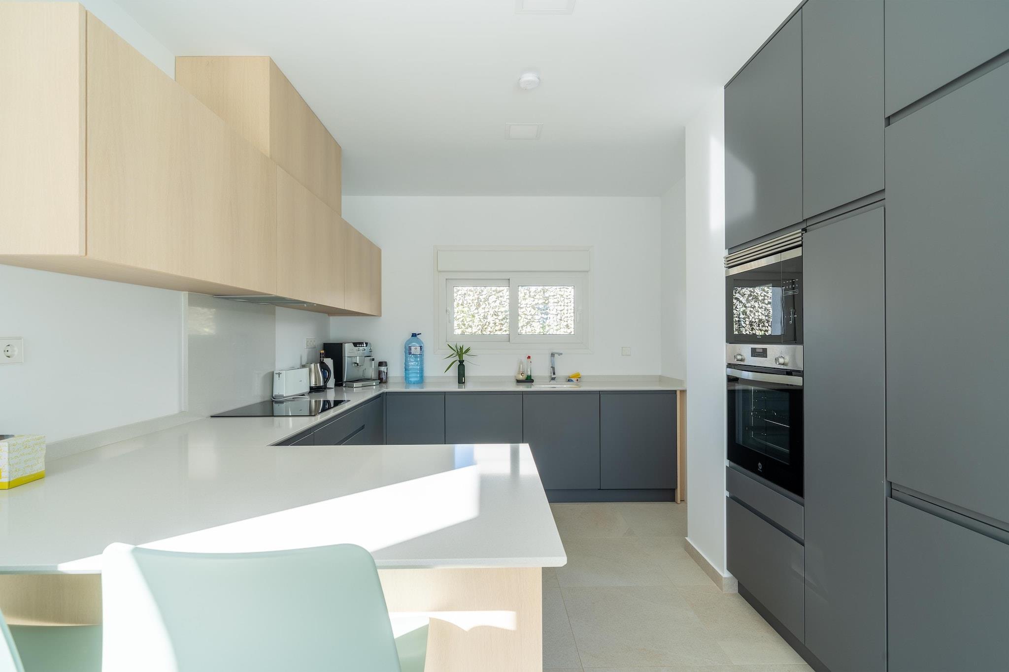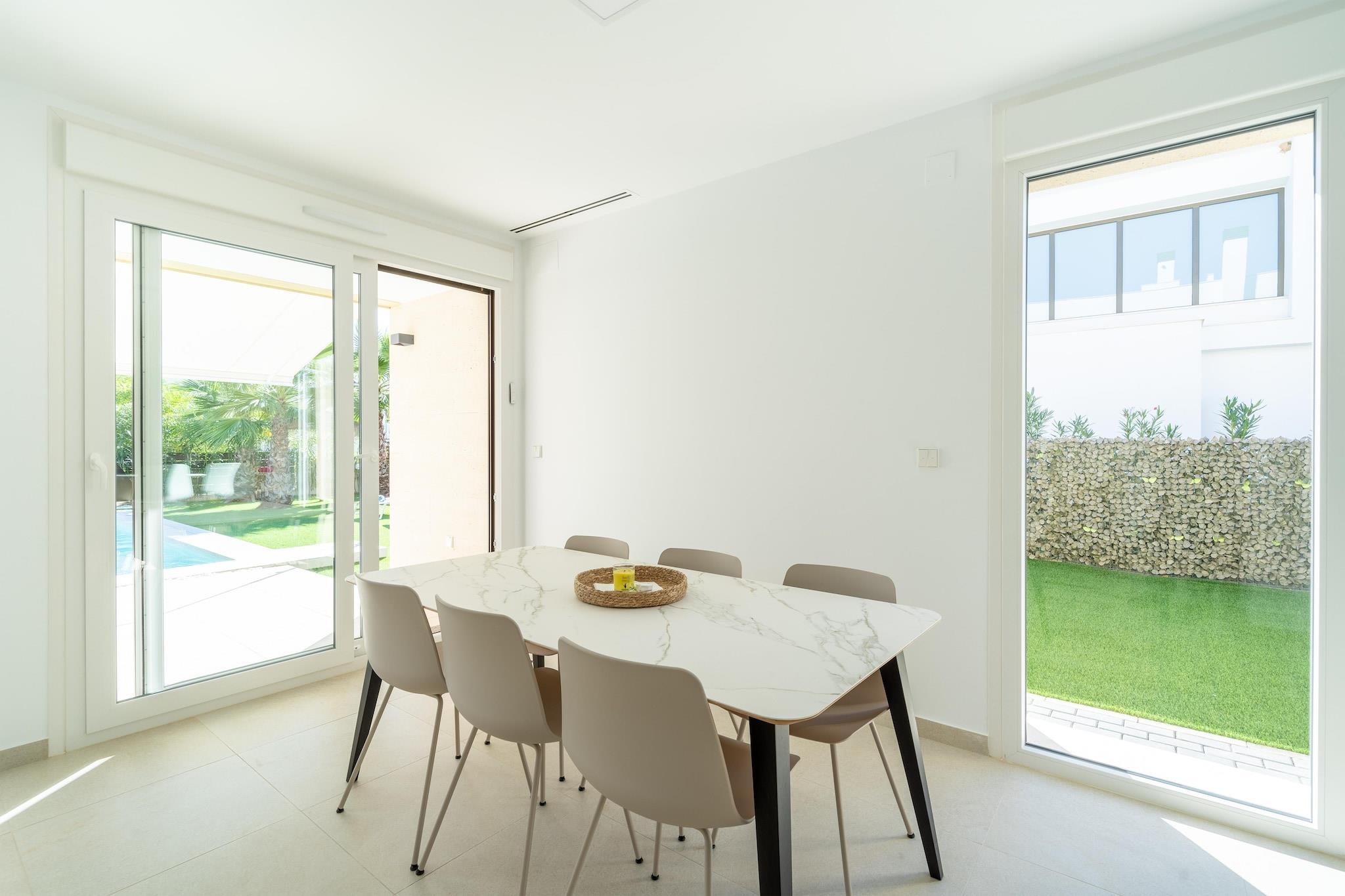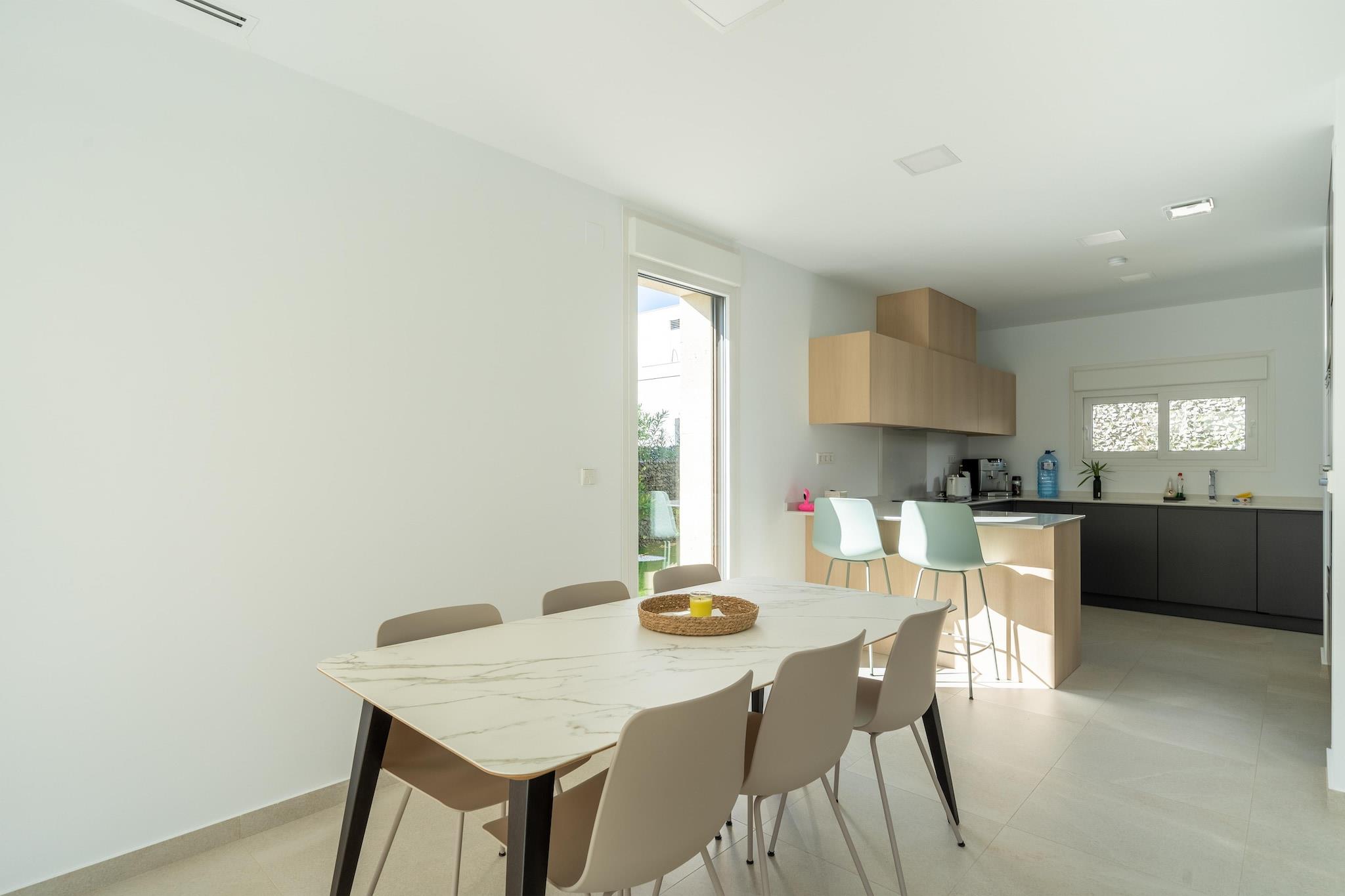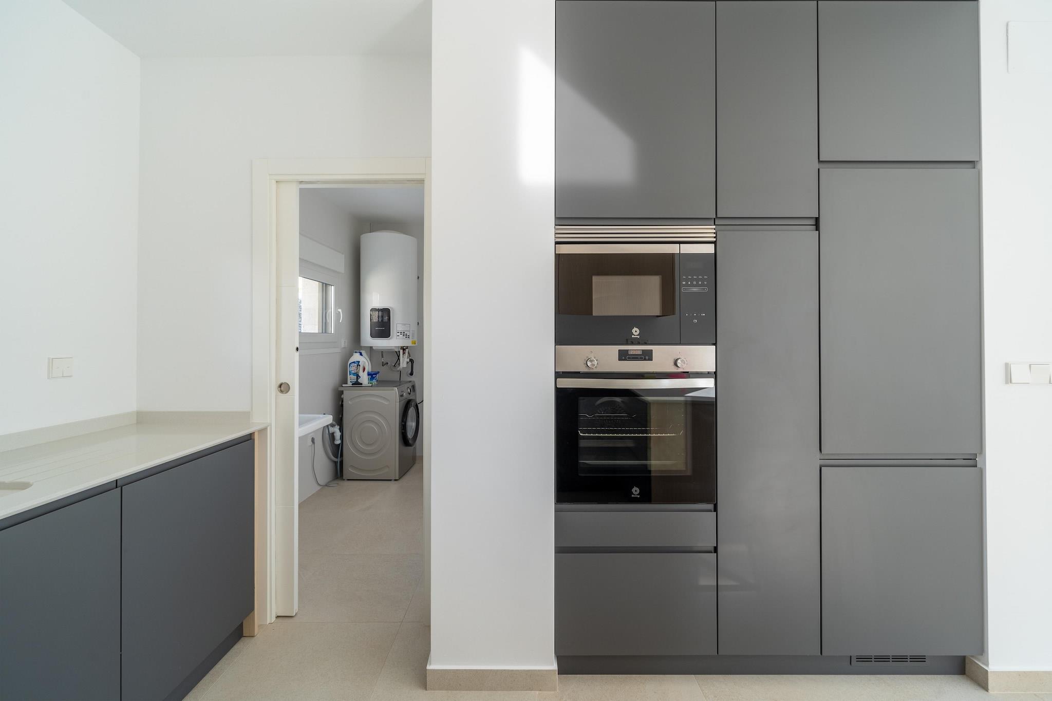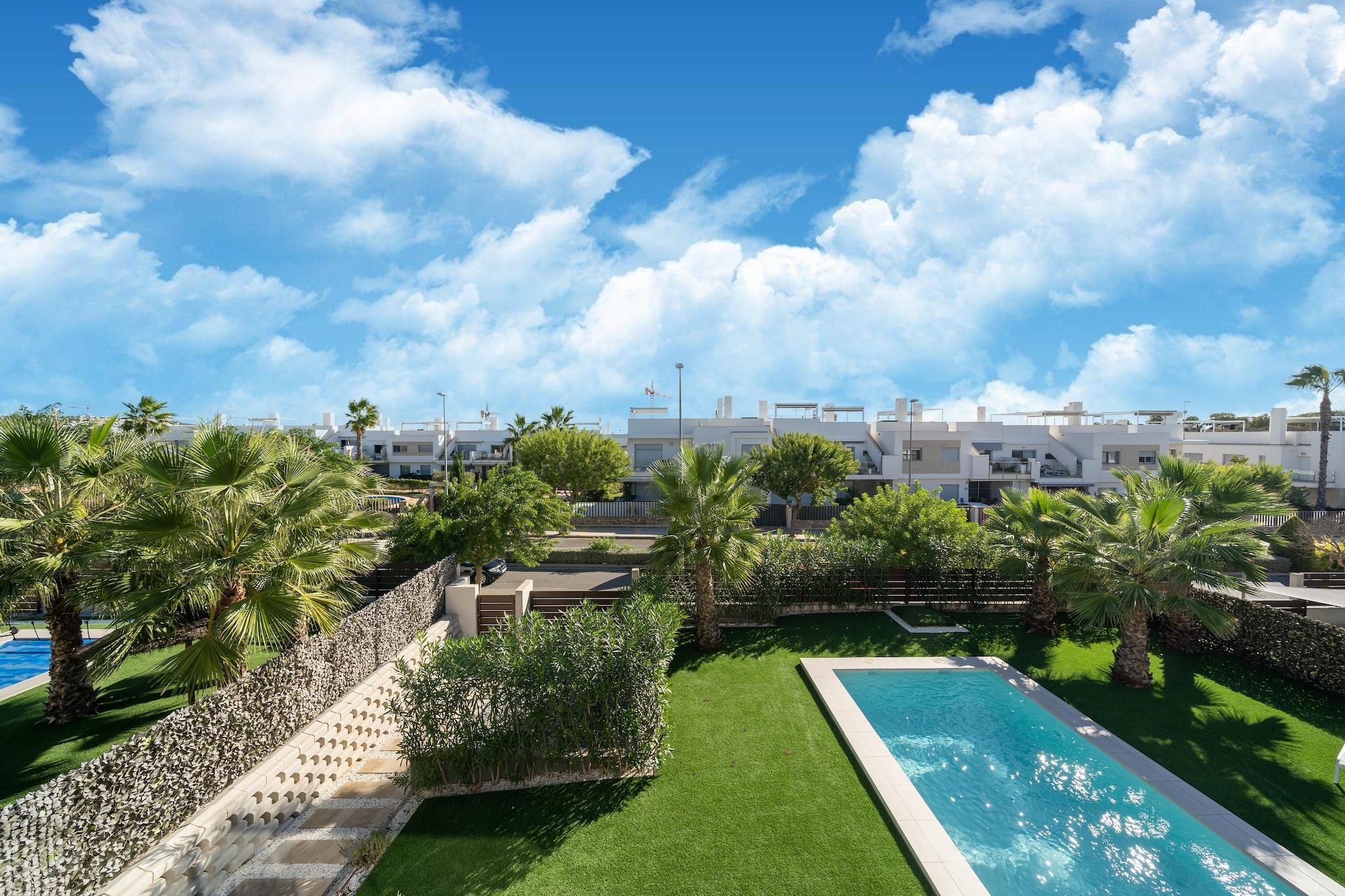 Flygt til denne luksuriøse nybyggede villa i Orihuela, beliggende på en rummelig grund og designet til komfort, stil og afslapning. Hjemmet er perfekt til familier eller venner og har eksklusive møbler, en privat pool med omgivende belysning og en stor terrasse med udsigt over en smukt anlagt have. Stueetagen har et åbent køkken udstyret med en keramisk kogeplade, ovn, mikroovn, køleskab med fryser, opvaskemaskine og kaffemaskine, ideel til at tilberede måltider til at nyde udendørs. Terrassen inkluderer en elektrisk markise og premium udendørsmøbler, hvilket skaber en perfekt ramme for spisning eller aftenslapning. Ovenpå åbner to solbelyste soveværelser ud til private terrasser, der tilbyder fredelige steder at nyde den spanske sol. Et vaskerum med vaskemaskine og privat parkering tilføjer til bekvemmeligheden, og den fuldt lukkede ejendom sikrer privatlivets fred under hele dit ophold. Beliggende i gåafstand fra et supermarked, restauranter og et fitnesscenter, og kun 1,5 km fra en golfbane og 6,7 km fra en naturskøn sø, er denne villa en fredfyldt, men alligevel godt forbundet base for din ferie på Costa Blanca. Valgfri forsynings- & servicepakke