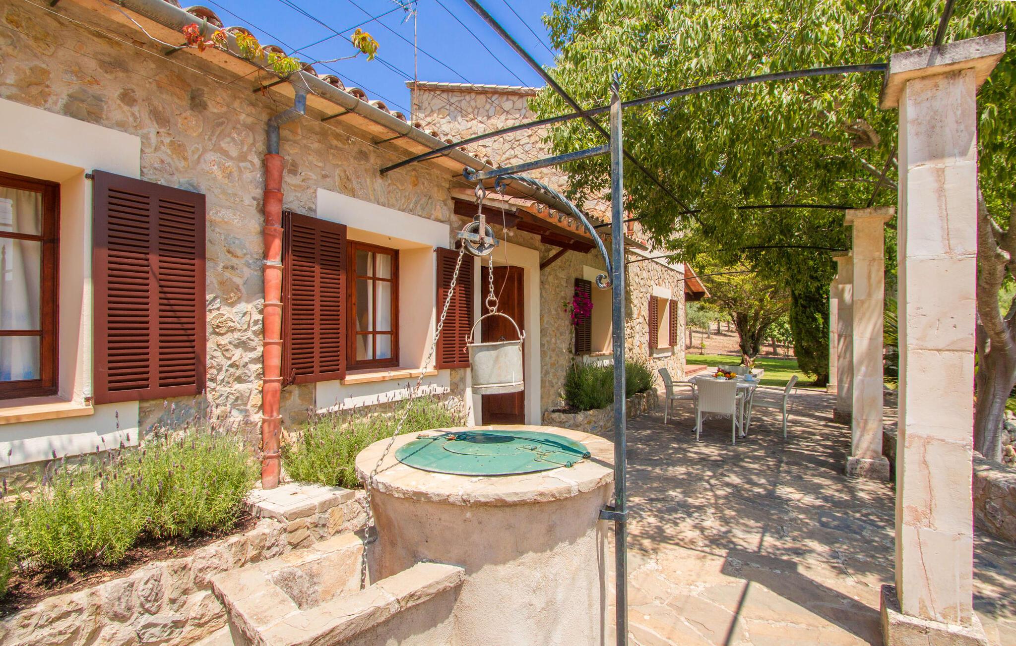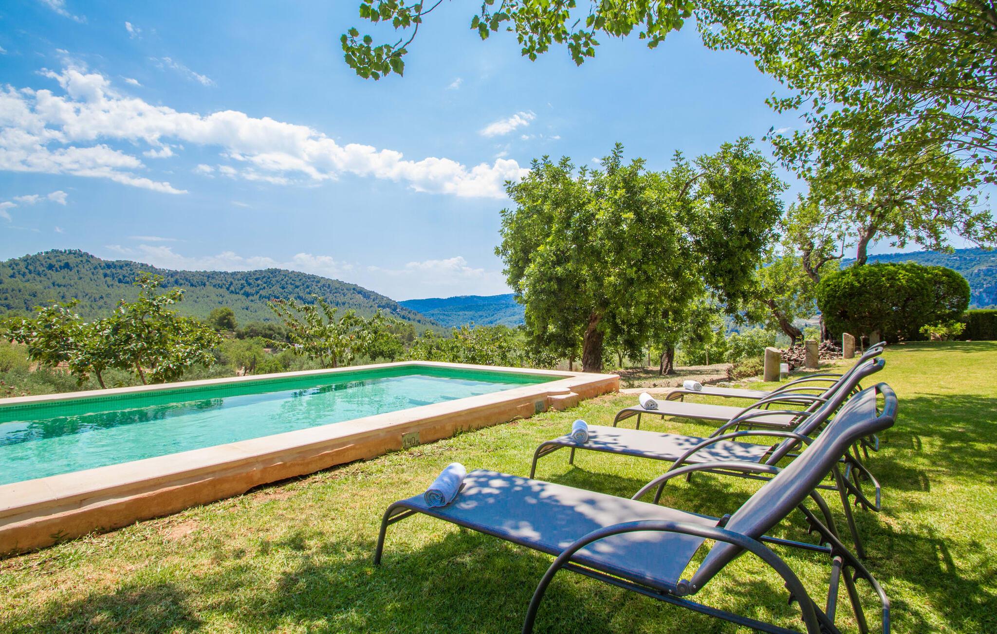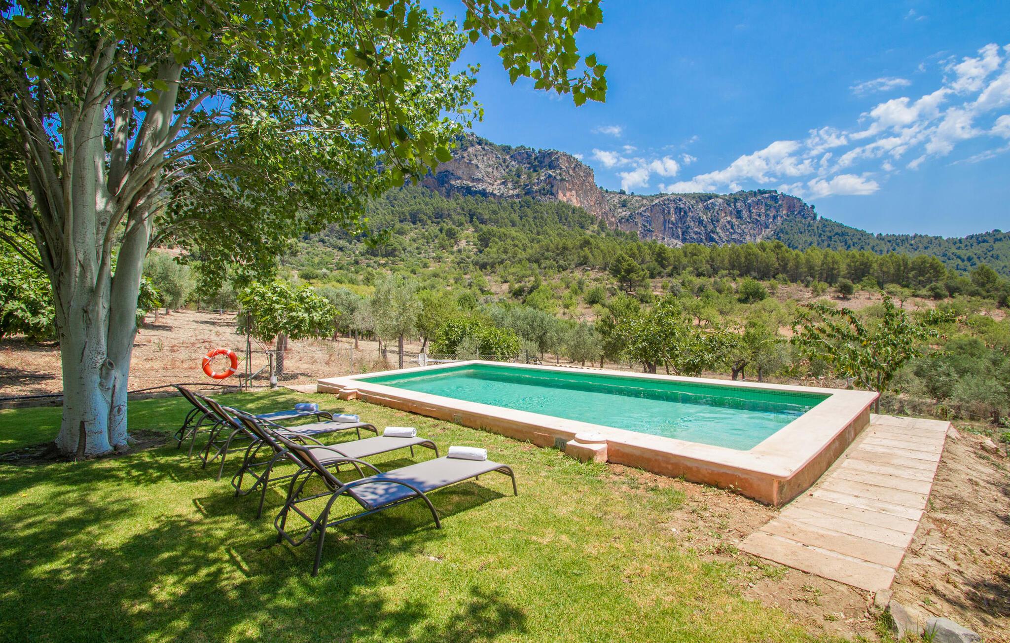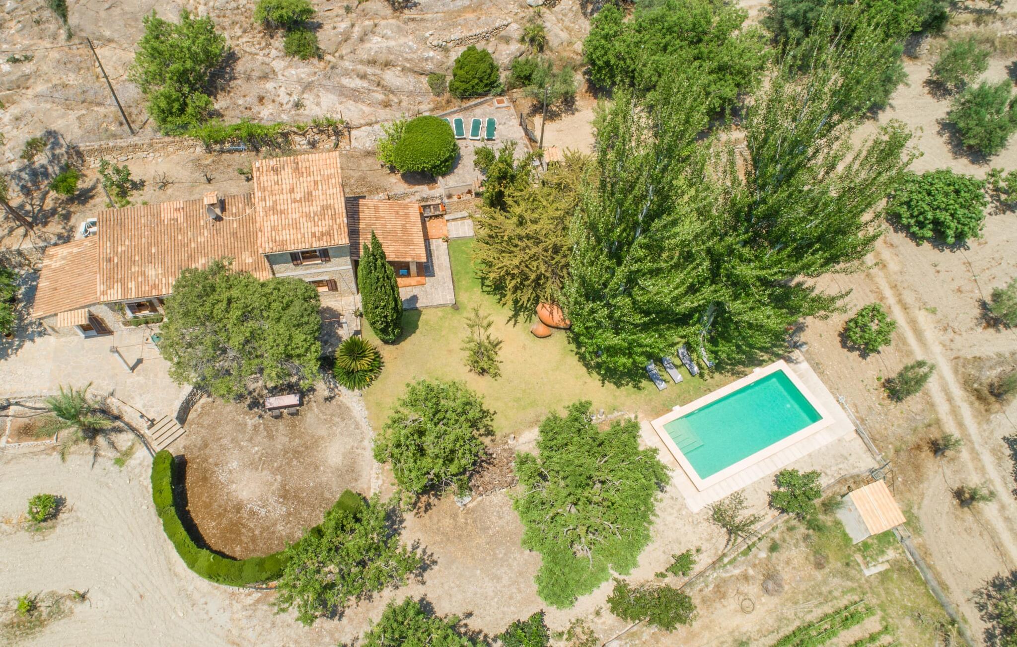 Villa "Es Caragolet" ligger på en 300.000 m² stor grund med frodige haver og en spektakulær udsigt over Tramuntana-bjergene, der strækker sig til havet, og tilbyder et fredeligt tilflugtssted i hjertet af Mallorca. Dette er et feriehus i Fincallorca. Huset er omgivet af terrasser, hvoraf nogle er i skyggen af modne træer og giver perfekte steder at slappe af. Et udekøkken med indbygget grill inviterer dig til at nyde lækre måltider tilberedt med friske, lokale råvarer. Poolen er ideel til en forfriskende svømmetur, mens du nyder panoramaudsigten. Indvendigt udstråler villaen en sofistikeret, smagfuld atmosfære med møbler af høj kvalitet og træaccenter, der komplementerer de lyse, luftige rum. Det rummelige opholds- og spiseområde har komfortable sofaer, et stort spisebord og satellit-tv og er perfekt til afslapning eller socialt samvær. Det fuldt udstyrede køkken er udstyret med moderne apparater, og der er endda plads til et ekstra spisebord til afslappet spisning. Der er to venlige, airconditionerede soveværelser, det ene i stueetagen, med dobbeltsenge, der måler 1,60 x 2,00 m og 1,80 x 2,00 m og et stilfuldt badeværelse. Med aircondition i stuen og centralvarme i hele huset byder villaen på komfort hele året rundt. Fincaen "Es Caragolet" er en kæmpe ejendom i de sydlige foden af Tramuntana-bjergene, kun 1 km fra den smukke by Puigpunyent med dens smalle gader, shopping og restauranter. Den berømte vingård "Son Puig" ligger ved siden af villaen "Es Caragolet". Palma og den tidligere fiskerlandsby Andratx, med en smuk strandpromenade, er fantastiske destinationer, hvor du kan nyde adskillige aktiviteter.