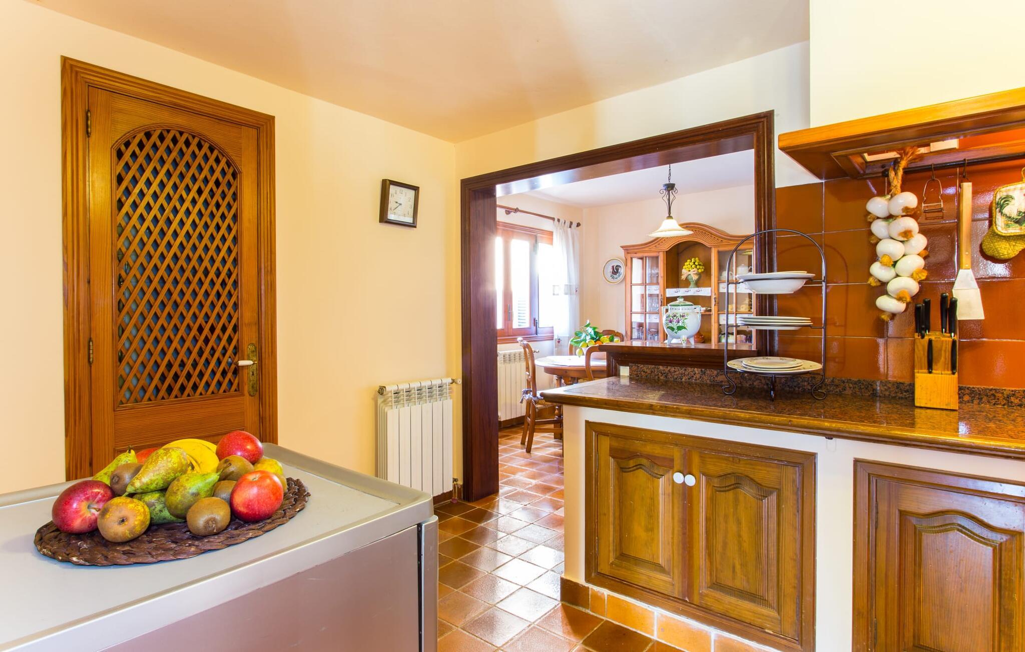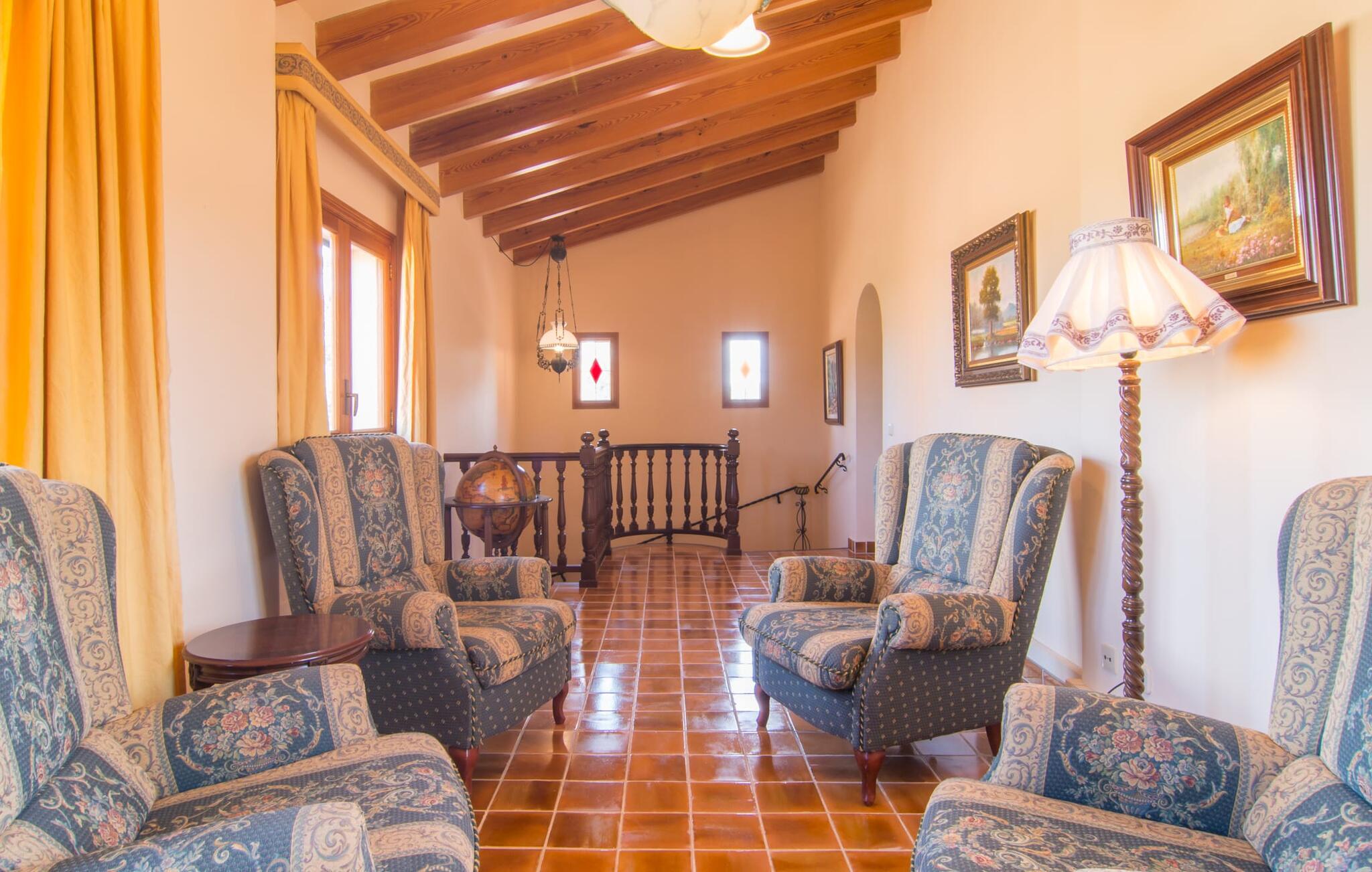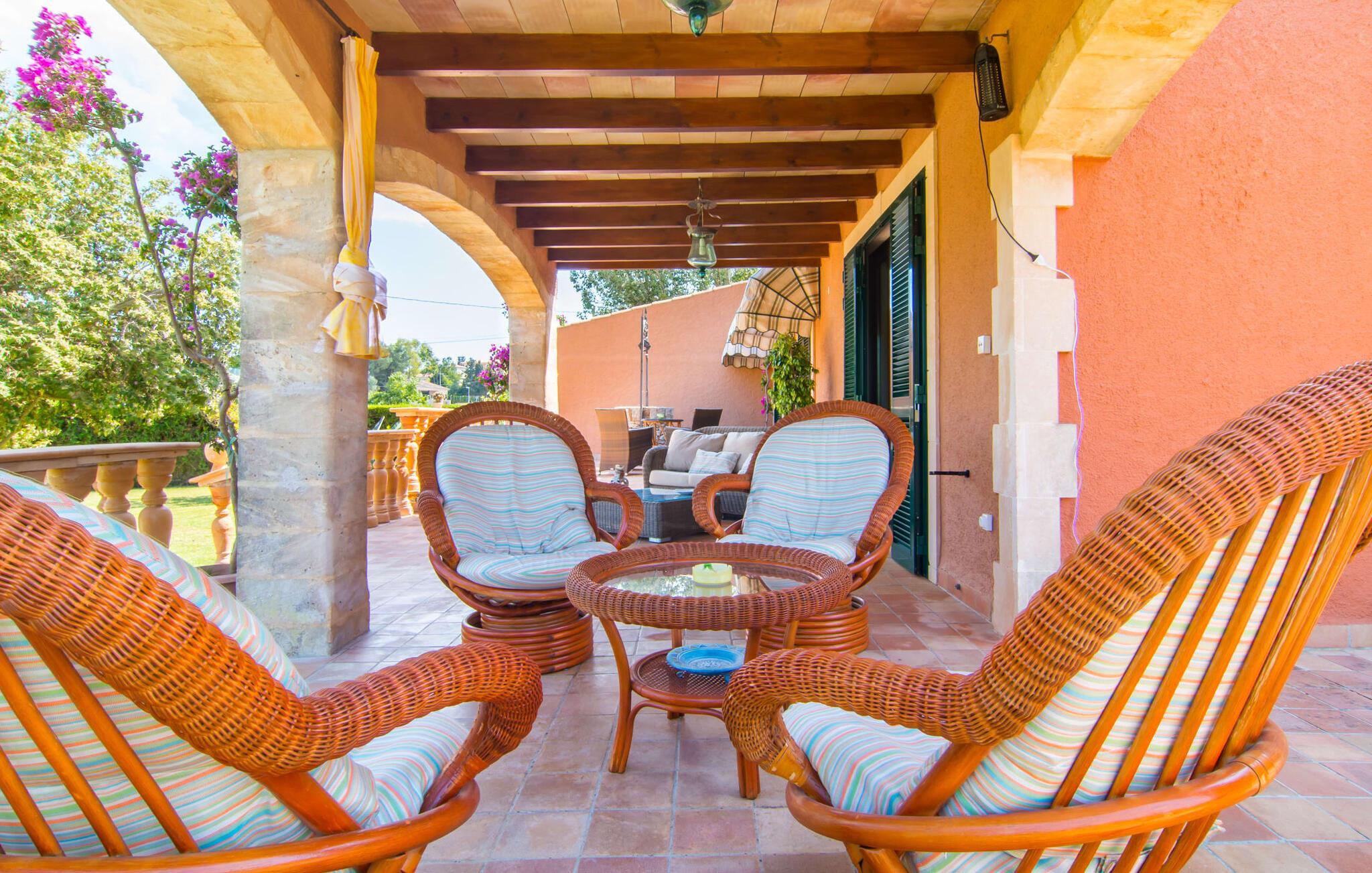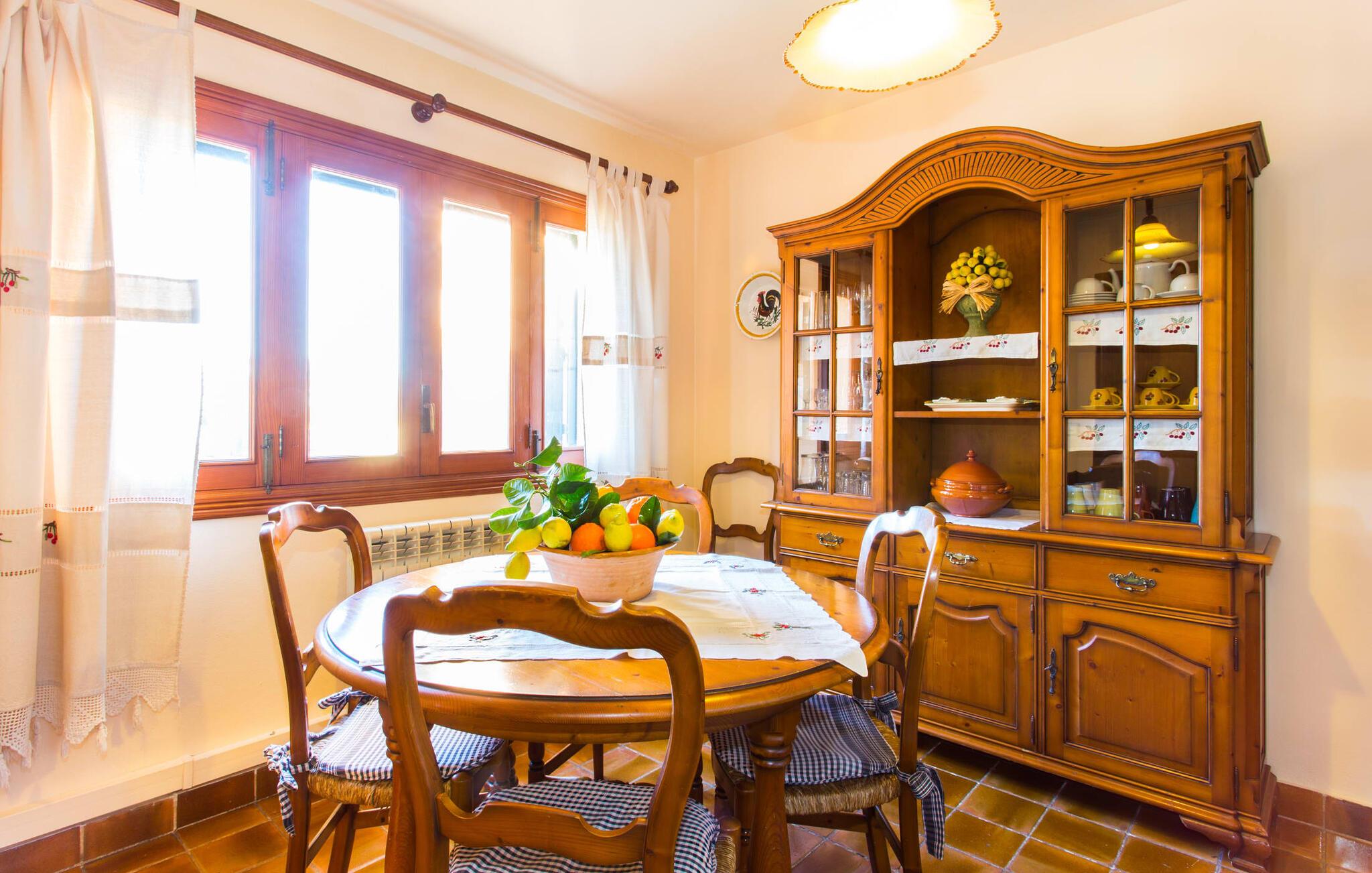 Fincaen "Es Fasser" ligger nær Costa de los Pinos i et roligt boligområde og tilbyder en privat ejendom med en rummelig have og et rummeligt hus. Det er omgivet af en hæk og tilbyder børn et trygt miljø. Udendørsområdet byder på velplejede græsplæner, middelhavsplanter og charmerende stier, der skaber en malerisk kulisse. En stor overdækket terrasse har udsigt til en rektangulær pool af varierende dybder, der er adgang til via en halvcirkelformet trappe. Slap af på komfortable liggestole og udendørsmøbler og nyd udendørs spisepladser med en muret grill og et ekstra køleskab til drinks. Indvendigt er villaen smagfuldt indrettet og har kombineret stue/spisestue med stort bord, hyggeligt sofahjørne med TV og pejs samt gulv til loft vinduer for naturligt lysindfald. Det veludstyrede køkken omfatter brødrister, blender og kaffemaskine. I stueetagen er der indbydende soveværelser og moderne badeværelser, mens den øverste etage byder på en ekstra stue og et lille bibliotek. Faciliteter som et strygejern og en hårtørrer giver ekstra bekvemmelighed. Den venlige finca "Es Fasser" ligger nær havet mellem Cala Bona og Costa de los Pinos. Cala Millor ligger kun 8 minutter væk i bil. Lokale markeder i Son Servera og Artà samt forskellige restauranter og barer i Port Verd, Costa de los Pinos og Cala Bona ligger inden for gåafstand. Port Vell-stranden er bekvemt placeret på den anden side af vejen, med lignende naturskønne muligheder ved Sa Marjal og Cala Bona. Valgfri brug af opvarmning er inkluderet, men brugen er begrænset til 7.00 til 10.00 og 19.00 til 23.