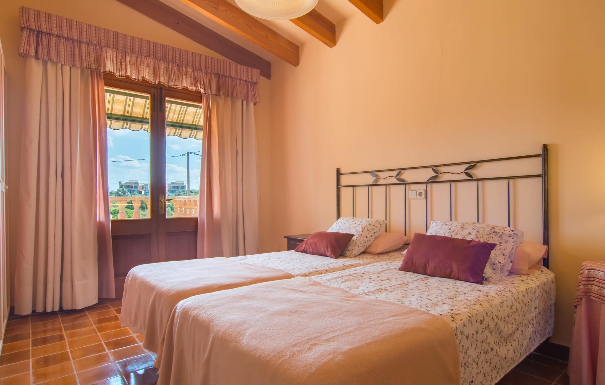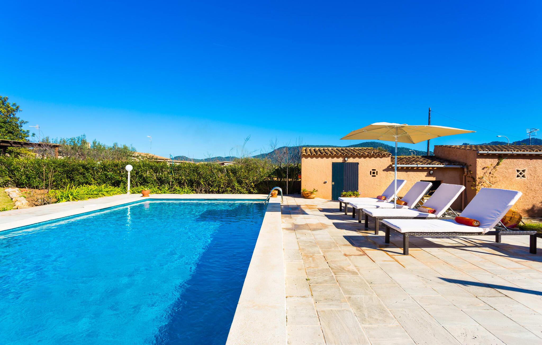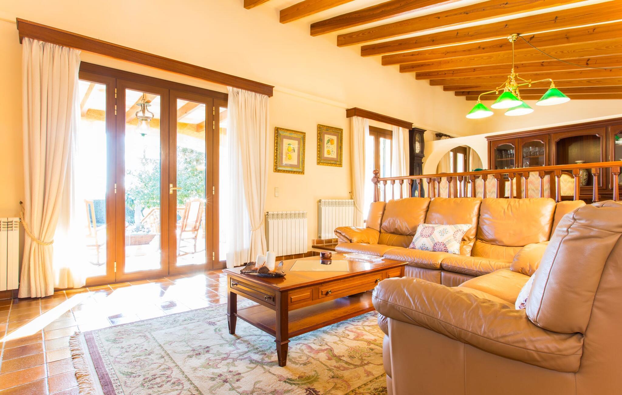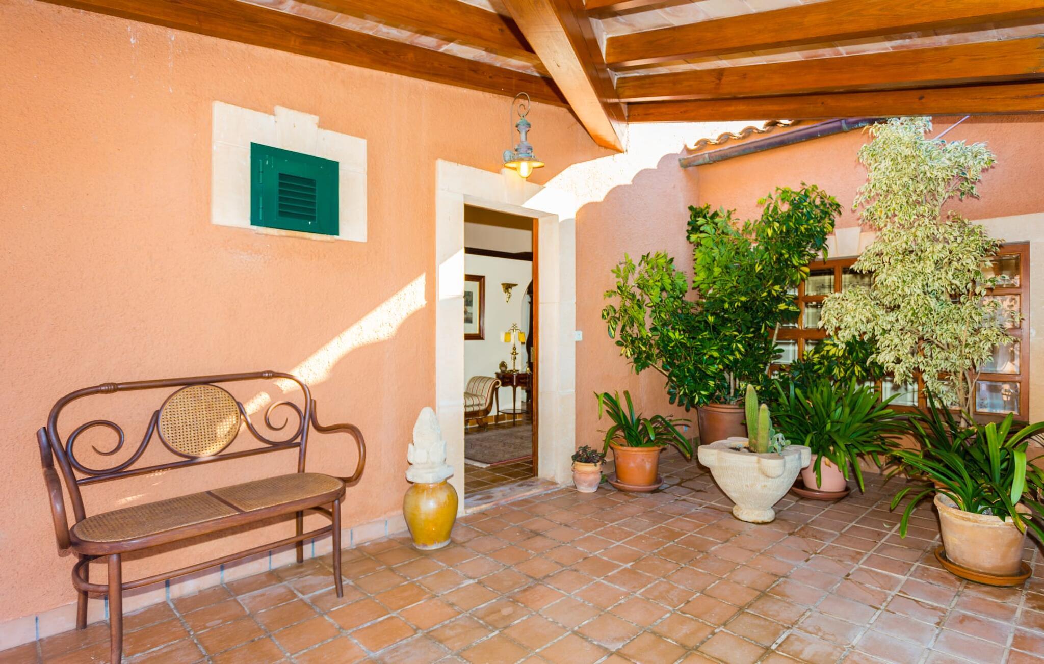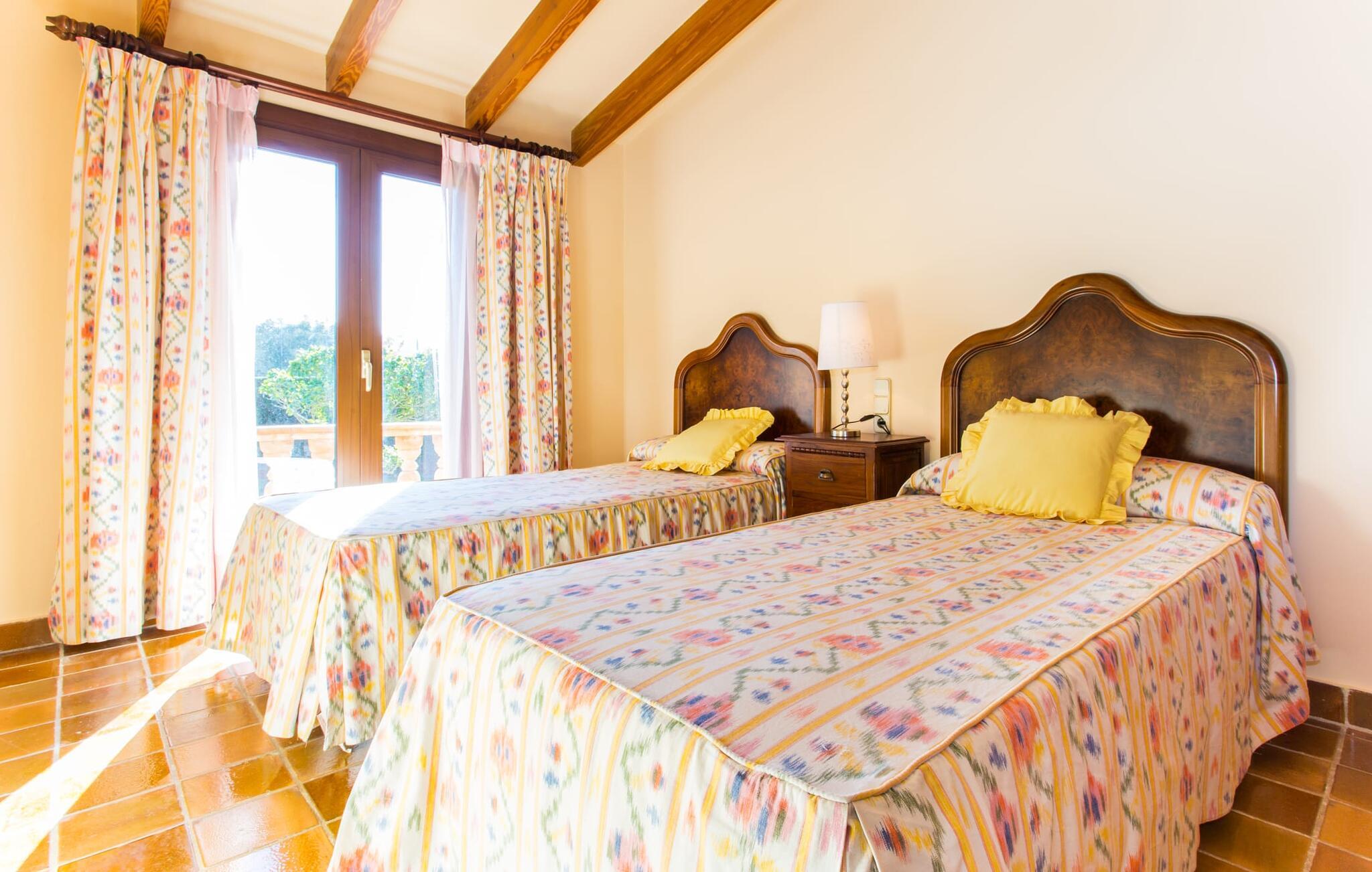 Fincaen "Es Fasser" ligger nær Costa de los Pinos i et roligt boligområde og tilbyder en privat ejendom med en rummelig have og et rummeligt hus. Det er omgivet af en hæk og tilbyder børn et trygt miljø. Udendørsområdet byder på velplejede græsplæner, middelhavsplanter og charmerende stier, der skaber en malerisk kulisse. En stor overdækket terrasse har udsigt til en rektangulær pool af varierende dybder, der er adgang til via en halvcirkelformet trappe. Slap af på komfortable liggestole og udendørsmøbler og nyd udendørs spisepladser med en muret grill og et ekstra køleskab til drinks. Indvendigt er villaen smagfuldt indrettet og har kombineret stue/spisestue med stort bord, hyggeligt sofahjørne med TV og pejs samt gulv til loft vinduer for naturligt lysindfald. Det veludstyrede køkken omfatter brødrister, blender og kaffemaskine. I stueetagen er der indbydende soveværelser og moderne badeværelser, mens den øverste etage byder på en ekstra stue og et lille bibliotek. Faciliteter som et strygejern og en hårtørrer giver ekstra bekvemmelighed. Den venlige finca "Es Fasser" ligger nær havet mellem Cala Bona og Costa de los Pinos. Cala Millor ligger kun 8 minutter væk i bil. Lokale markeder i Son Servera og Artà samt forskellige restauranter og barer i Port Verd, Costa de los Pinos og Cala Bona ligger inden for gåafstand. Port Vell-stranden er bekvemt placeret på den anden side af vejen, med lignende naturskønne muligheder ved Sa Marjal og Cala Bona. Valgfri brug af opvarmning er inkluderet, men brugen er begrænset til 7.00 til 10.00 og 19.00 til 23.