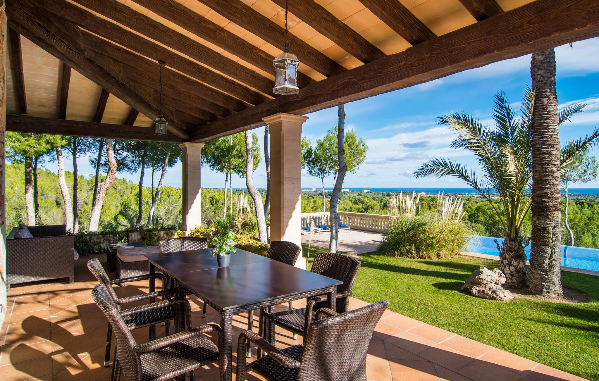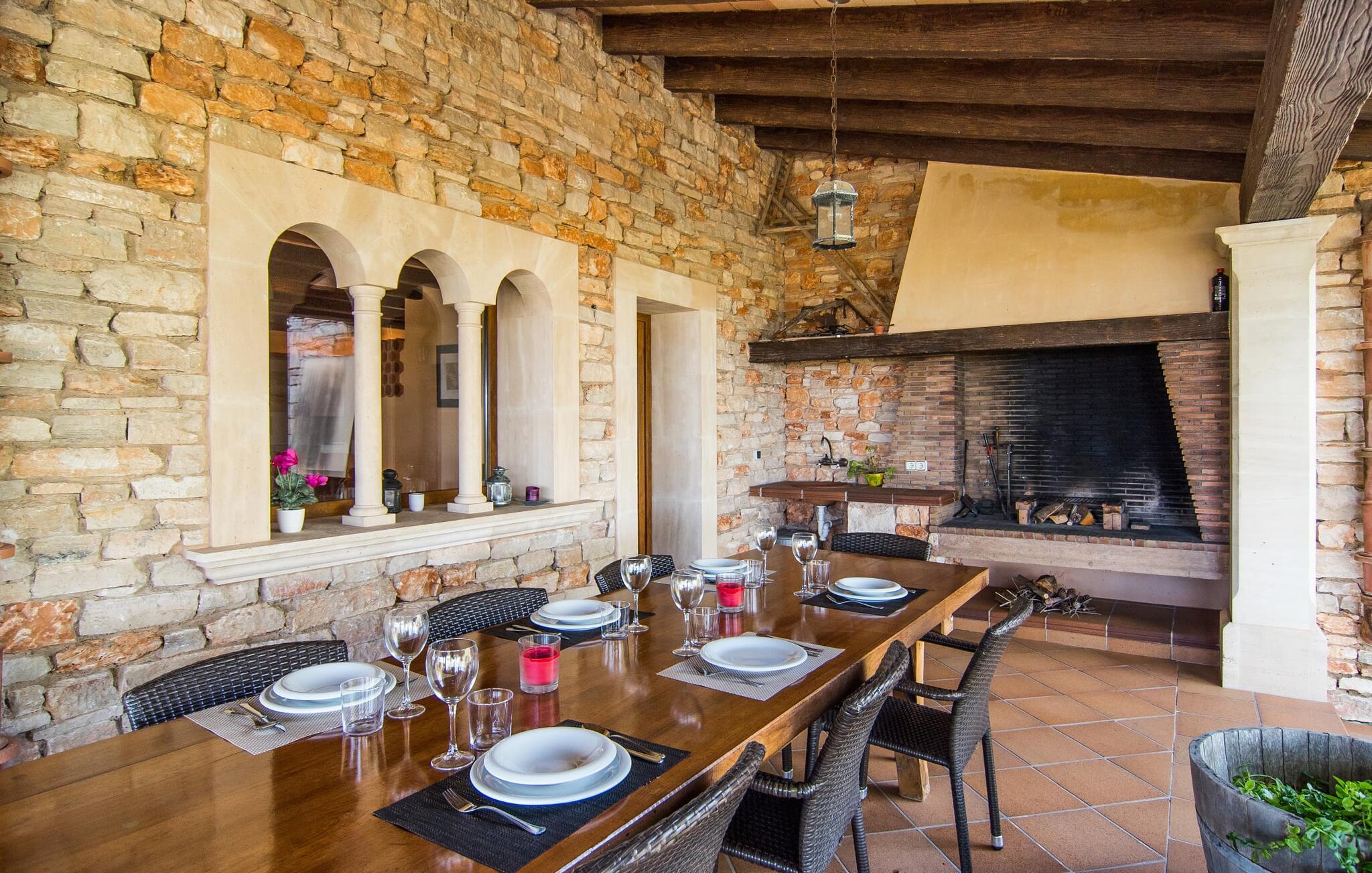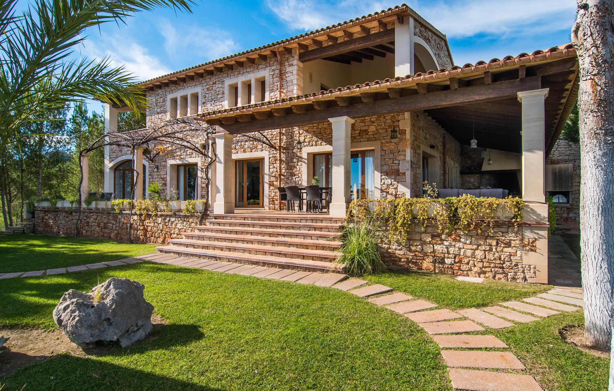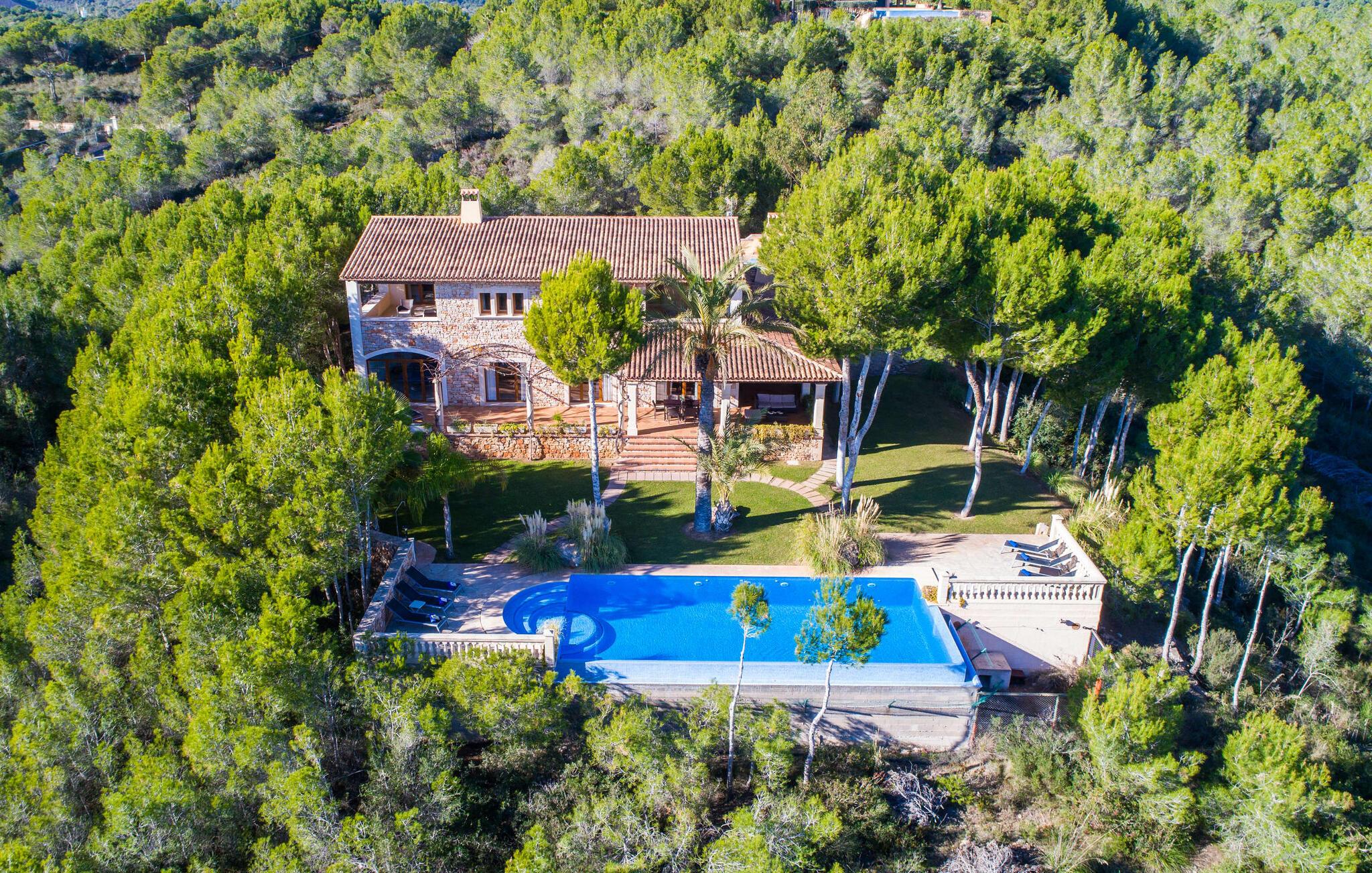 Til himmelske helligdage! Omgivet af frodige grønne områder og majestætiske palmer tilbyder den eksklusive villa "Es Forn Fumet" jer et ophold i særklasse. Den repræsentative ejendom med sin rummelige grund på 17.000 m² lover masser af komfort og plads til hele familien. Beliggende på en lille bakke tilbyder denne luksuriøse indkvartering fuldstændig privatliv og en betagende udsigt over det turkisblå hav og den tilsyneladende endeløse horisont. Den rolige, afsondrede beliggenhed og den fredelige natur langt væk fra hverdagens stress og jag tilbyder jer det ideelle tilflugtssted til at slappe af og slappe af. Det meget rummelige udeareal byder velkommen med et smukt terrasselandskab med et fantastisk udekøkken og grill til lækre måltider i den friske luft. Forkæl jer selv med en forfriskende svømmetur i den lavvandede infinity-pool og nyd solen på den fantastiske solterrasse. En praktisk udendørs bruser er også tilgængelig. Interiøret præsenterer en dygtig kombination af moderne design og middelhavsarkitektur. Stenbuer og højloftsbjælker lavet af mørkt træ giver interiøret en meget hyggelig atmosfære. Et rigtigt højdepunkt er naturstenen, som skaber en fantastisk effekt foran de lyst designede vægge og lyse rum. Den elegante stue med en behagelig sofa indbyder til at læse en spændende bog eller nyde en god flaske vin foran den knitrende pejs. Det betyder, at I også kan nyde de køligere dage fuldt ud. Et kærligt designet mellemrum med frodige blomstrende planter og stilfulde dekorative elementer tager jer direkte til det åbne og fuldt udstyrede køkken med spiseplads. Det hvælvede loft er et ægte blikfang og harmonerer perfekt med de højkvalitets træmøbler. I stueetagen finder I et meget moderne soveværelse med god plads, hvorfra I har direkte adgang til terrassen. Det tilstødende badeværelse er indrettet i cremefarver og smart marmor og har både hydromassagebadekar og bruser. Tre soveværelser er placeret på øverste etage og byder jer velkommen med meget smagfuld indretning. Herfra har I direkte adgang til altanerne, som alle er udstyret med komfortable loungemøbler. Rummelige skabe og kommoder er ideelle til opbevaring af jeres feriegarderobe eller nyligt købte souvenirs. Yderligere to badeværelser inviterer jer til at tage et beroligende bad eller et forfriskende brusebad. Det førsteklasses fitnesscenter er udstyret med flere maskiner, en boksesæk og et bordtennisbord. Her kan I brænde jeres energi af og derefter køle af i den store pool. Villaen "Es Forn Fumet" ligger i landlige omgivelser nær byen Portocolom. Her finder I talrige barer, caféer, restauranter og indkøbsmuligheder samt en fantastisk udsigt over den maleriske havn. Udover de klassiske fiskerbåde findes der også nogle imponerende sejlyachter. De paradisiske strande i Cala Murada, Cala Tropicana, Cala Marçal og Platja de S'Arenal er inden for rækkevidde, og golfbanen Vall D'Or ligger kun få minutters kørsel væk. På Felanitx ugentlige marked kan I søge efter souvenirs til dem derhjemme eller nyde lokale kulinariske delikatesser. Tilbage i villaen vil I ikke kun nyde perfekt privatliv midt i den idylliske natur, men også en betagende udsigt over det turkise hav. Den eksklusive naturstensvilla "Es Forn Fumet" venter på jer i en smuk, idyllisk afsondret beliggenhed nær Portocolom på det sydøstlige Mallorca. Den smukke havneby har talrige restauranter, barer, caféer og indkøbsmuligheder. For en dag på stranden, tag til de smukke bugter i Cala Murada, D'Or eller Portocolom. Der er også en førsteklasses golfbane i umiddelbar nærhed. Bemærk venligst, at denne ejendom ikke accepterer ungdomsgrupper eller polterabender. En ungdomsgruppe på denne ejendom består af personer på 25 år eller derunder. Book ikke denne ejendom, hvis I er en ungdomsgruppe eller polterabend, da jeres reservation vil blive afvist, når den er booket, hvilket også kan være tilfældet ved ankomst til ejendommen eller under jeres ophold, og I vil ikke modtage en refusion. Aircondition i ejendommen er inkluderet i prisen, men det er begrænset til kl. 12.00 til 21.00 i opholdsområdet og kl. I vintermånederne er varme også inkluderet i prisen 10 timer i døgnet, hvorefter afgiften betales på stedet kontant.