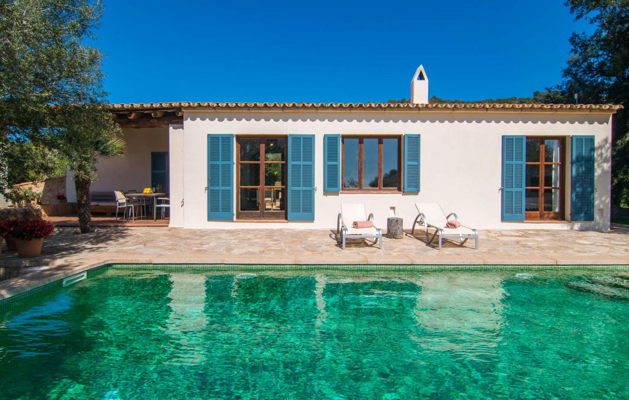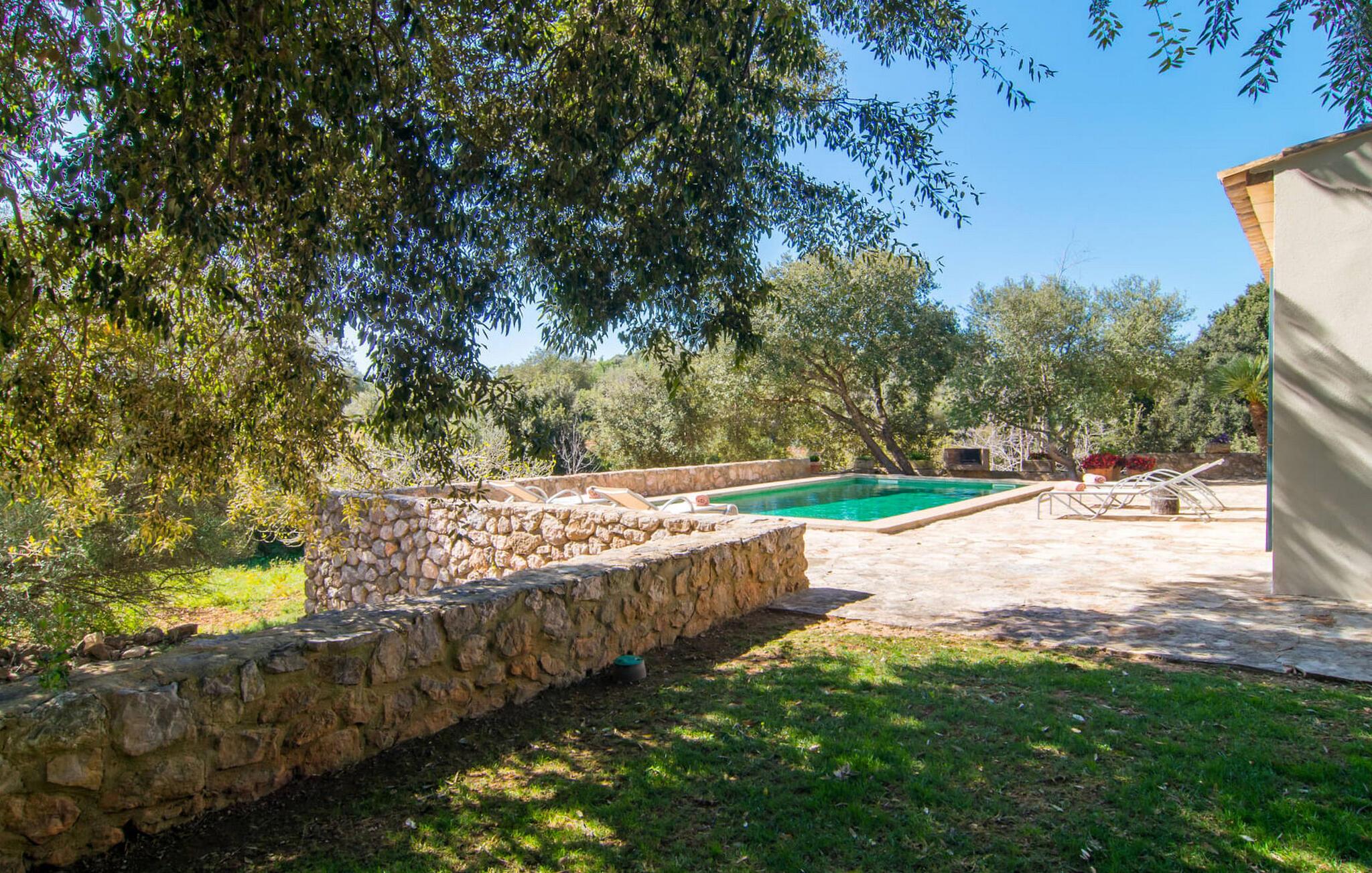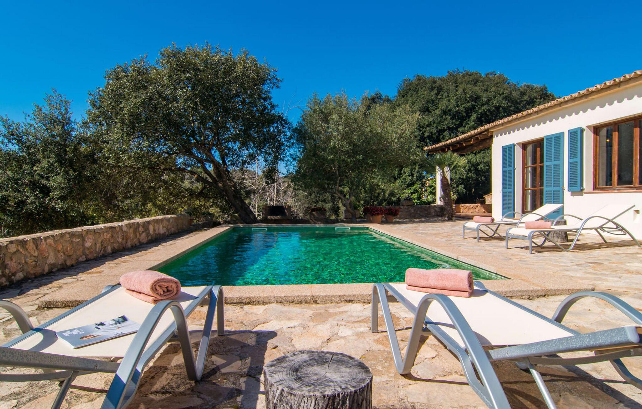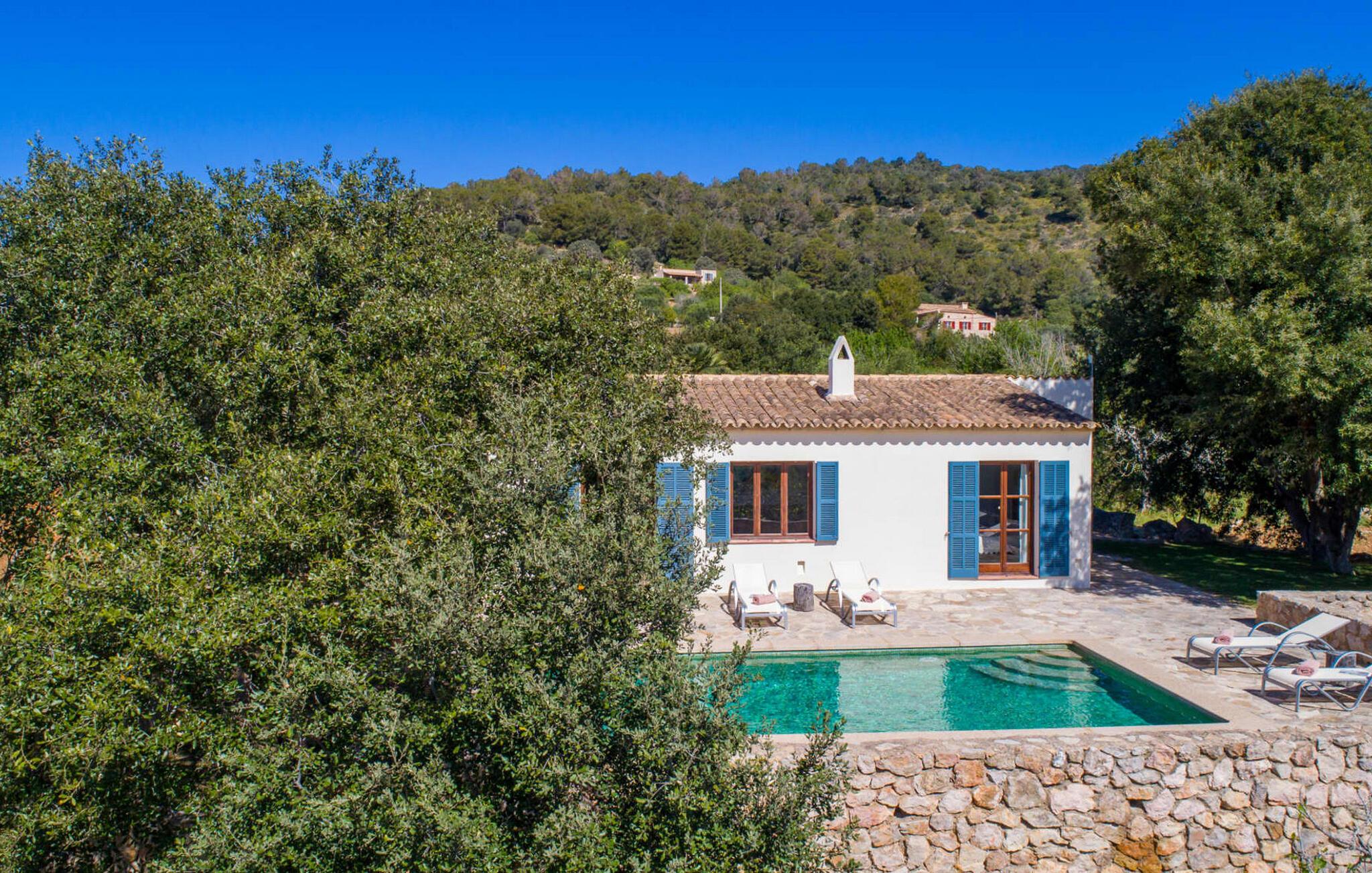 Den smukke stenvilla "Es Garbalio" ligger midt mellem gamle træer og byder jer velkommen med fortryllende turkise skodder og en rummelig omgivende terrasse. Terrassen har en smuk pool og et delvist overdækket morgenmadsområde træer spreder en vidunderlig middelhavsatmosfære En luksuriøs indbygget udendørs grill venter på jer, perfekt til at nyde øens kulinariske skatte Villa en stor åben stue og spisestue med pejs, to indbydende soveværelser og to smukt renoverede badeværelser tilføjer til jeres komfort, mens tykke stenvægge holder rummet behageligt køligt med centralvarme om vinteren om sommeren er dette et feriemål, som I kan nyde året rundt. Den smukke stenvilla "Es Garballo" blev bygget på en 15.500 m² stor grund på en bjergskråning mellem Artà og Son Servera. Den lille by Artà med alle dens supermarkeder, barer og restauranter kan nås på få minutter i bil. Øens uberørte, naturlige sandstrande som Costa dels Pins ligger også tæt på villaen. Son Servera med sit livlige ugentlige marked ligger også kun omkring 3 km væk. Der er fire golfbaner i nærheden af villaen, hvoraf nogle er kun 5 minutter væk i bil. Aircondition i ejendommen er inkluderet i prisen, men dets brug er begrænset til mellem kl. 21.00 og 08.00.