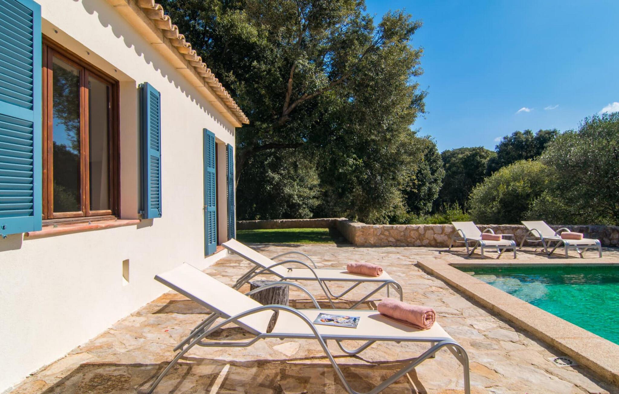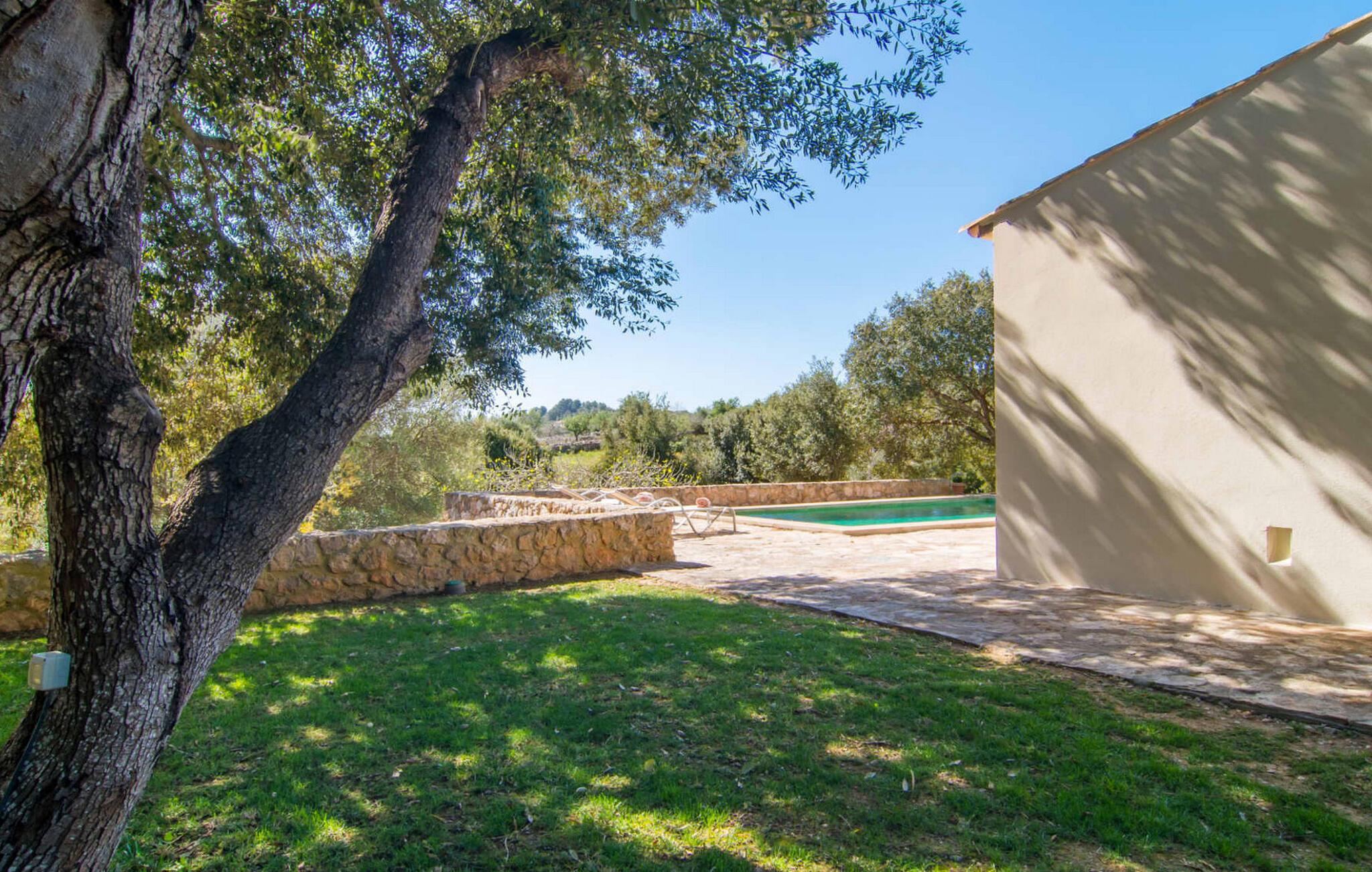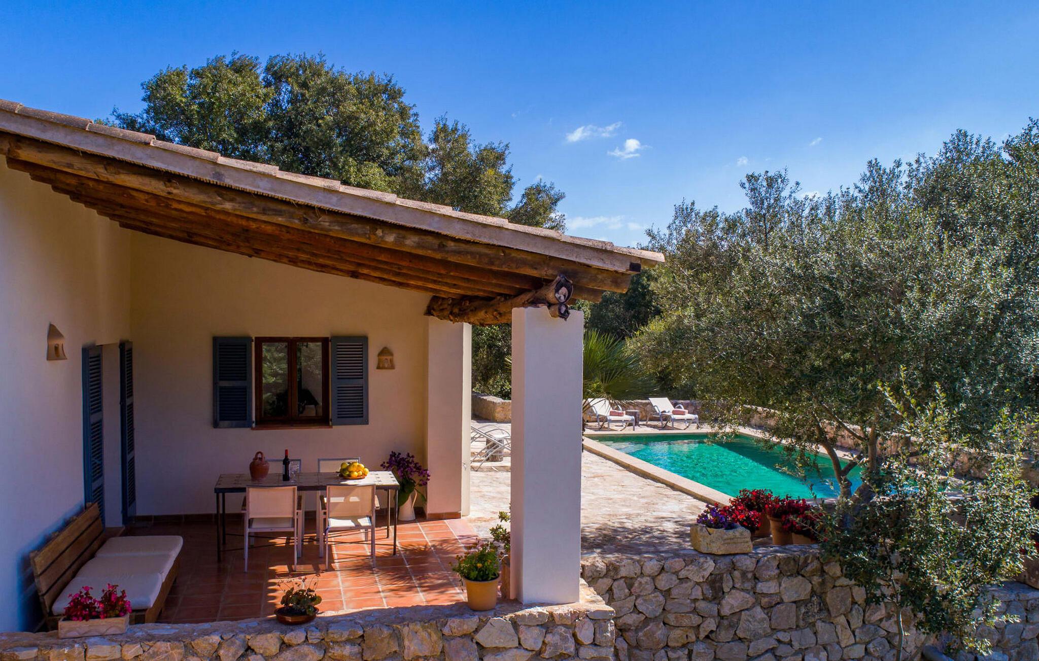 Den smukke stenvilla "Es Garbalio" ligger midt mellem gamle træer og byder jer velkommen med fortryllende turkise skodder og en rummelig omgivende terrasse. Terrassen har en smuk pool og et delvist overdækket morgenmadsområde træer spreder en vidunderlig middelhavsatmosfære En luksuriøs indbygget udendørs grill venter på jer, perfekt til at nyde øens kulinariske skatte Villa en stor åben stue og spisestue med pejs, to indbydende soveværelser og to smukt renoverede badeværelser tilføjer til jeres komfort, mens tykke stenvægge holder rummet behageligt køligt med centralvarme om vinteren om sommeren er dette et feriemål, som I kan nyde året rundt. Den smukke stenvilla "Es Garballo" blev bygget på en 15.500 m² stor grund på en bjergskråning mellem Artà og Son Servera. Den lille by Artà med alle dens supermarkeder, barer og restauranter kan nås på få minutter i bil. Øens uberørte, naturlige sandstrande som Costa dels Pins ligger også tæt på villaen. Son Servera med sit livlige ugentlige marked ligger også kun omkring 3 km væk. Der er fire golfbaner i nærheden af villaen, hvoraf nogle er kun 5 minutter væk i bil. Aircondition i ejendommen er inkluderet i prisen, men dets brug er begrænset til mellem kl. 21.00 og 08.00.