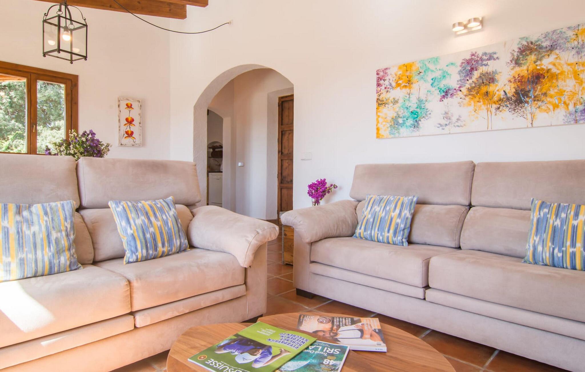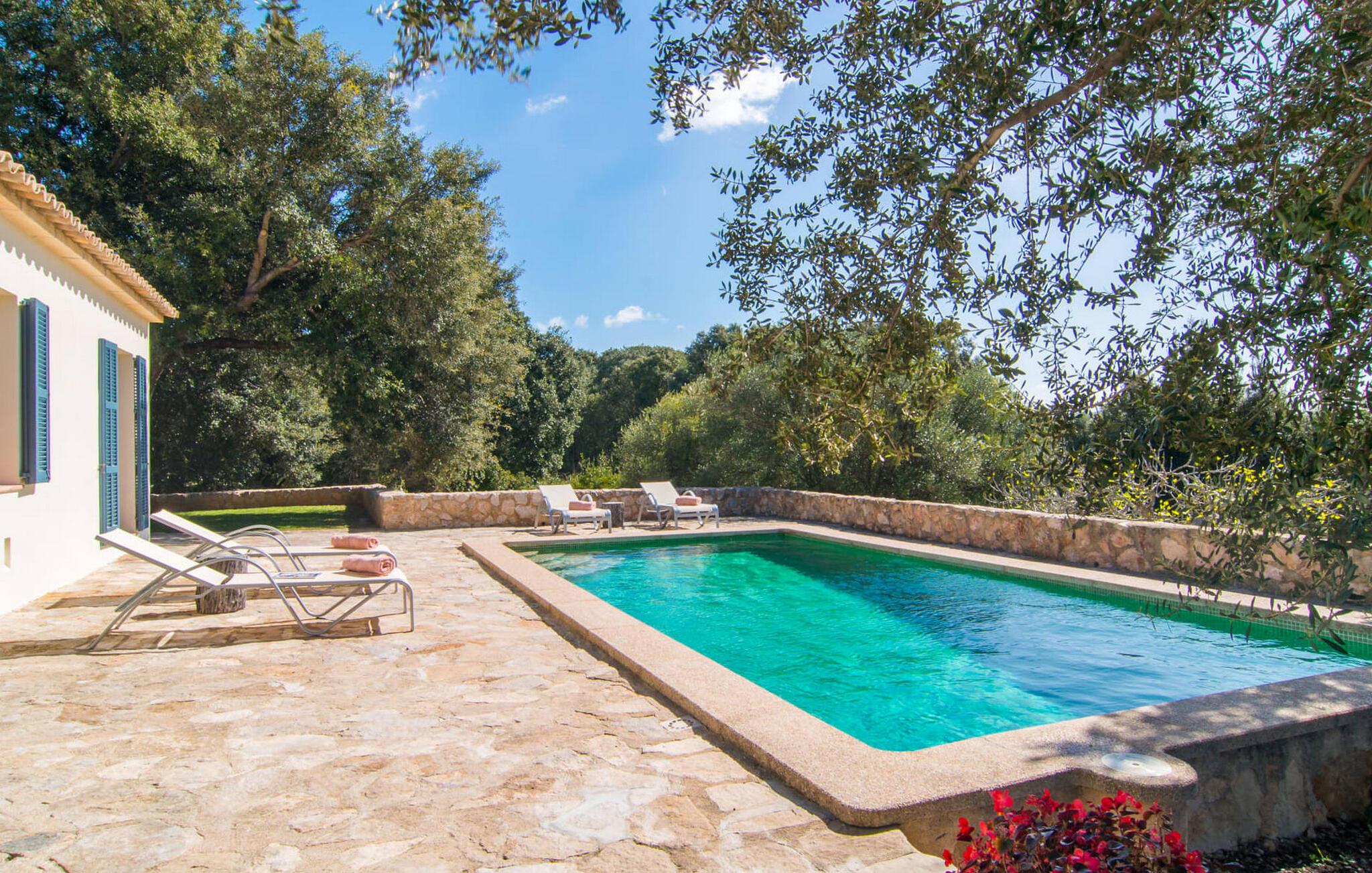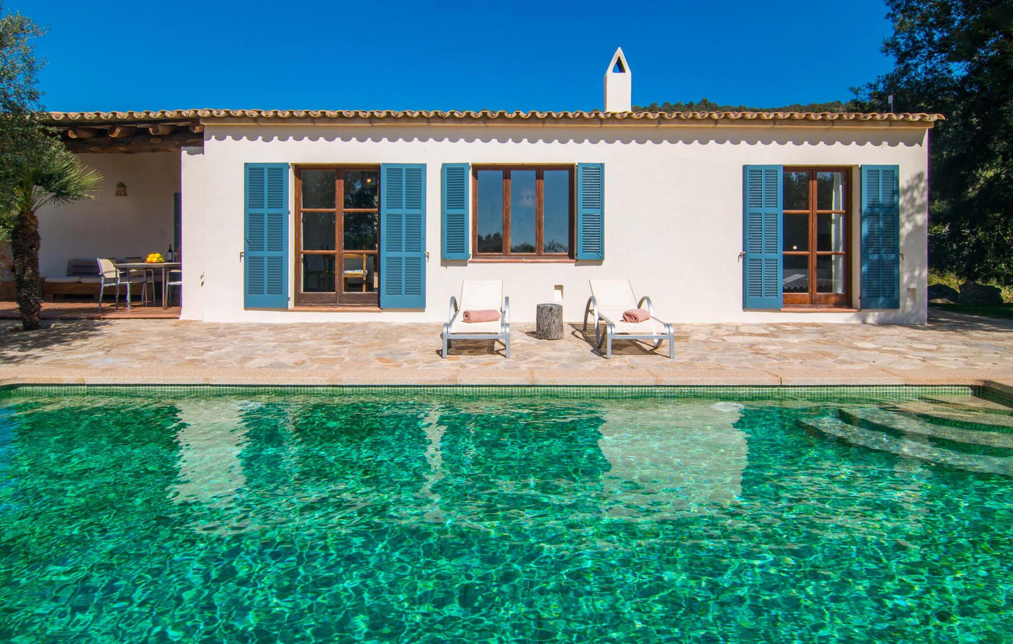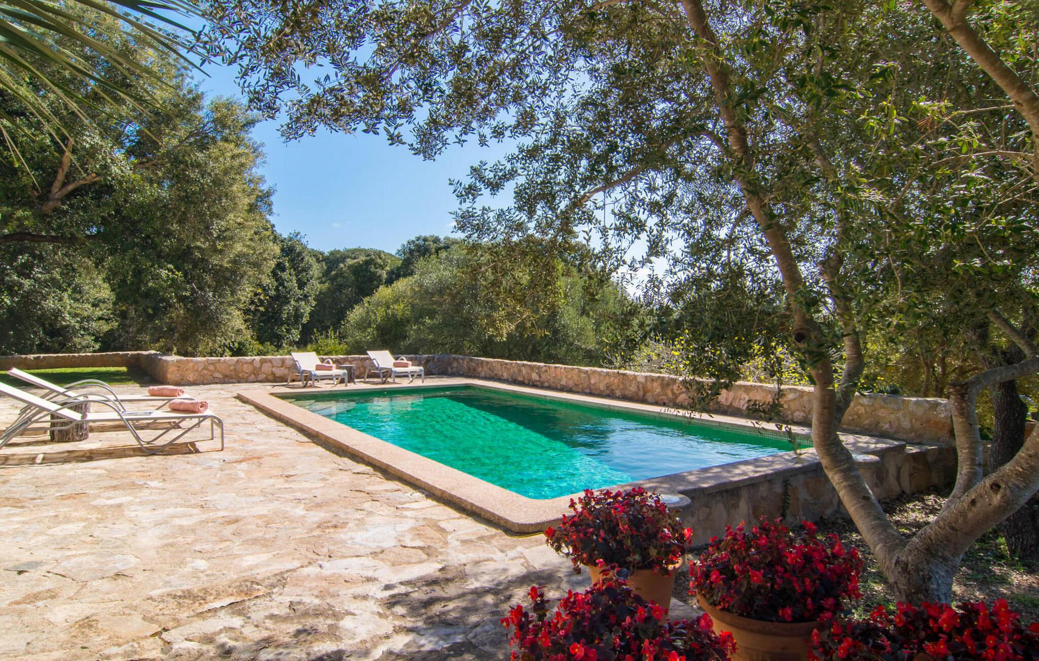 Den smukke stenvilla "Es Garbalio" ligger midt mellem gamle træer og byder jer velkommen med fortryllende turkise skodder og en rummelig omgivende terrasse. Terrassen har en smuk pool og et delvist overdækket morgenmadsområde træer spreder en vidunderlig middelhavsatmosfære En luksuriøs indbygget udendørs grill venter på jer, perfekt til at nyde øens kulinariske skatte Villa en stor åben stue og spisestue med pejs, to indbydende soveværelser og to smukt renoverede badeværelser tilføjer til jeres komfort, mens tykke stenvægge holder rummet behageligt køligt med centralvarme om vinteren om sommeren er dette et feriemål, som I kan nyde året rundt. Den smukke stenvilla "Es Garballo" blev bygget på en 15.500 m² stor grund på en bjergskråning mellem Artà og Son Servera. Den lille by Artà med alle dens supermarkeder, barer og restauranter kan nås på få minutter i bil. Øens uberørte, naturlige sandstrande som Costa dels Pins ligger også tæt på villaen. Son Servera med sit livlige ugentlige marked ligger også kun omkring 3 km væk. Der er fire golfbaner i nærheden af villaen, hvoraf nogle er kun 5 minutter væk i bil. Aircondition i ejendommen er inkluderet i prisen, men dets brug er begrænset til mellem kl. 21.00 og 08.00.