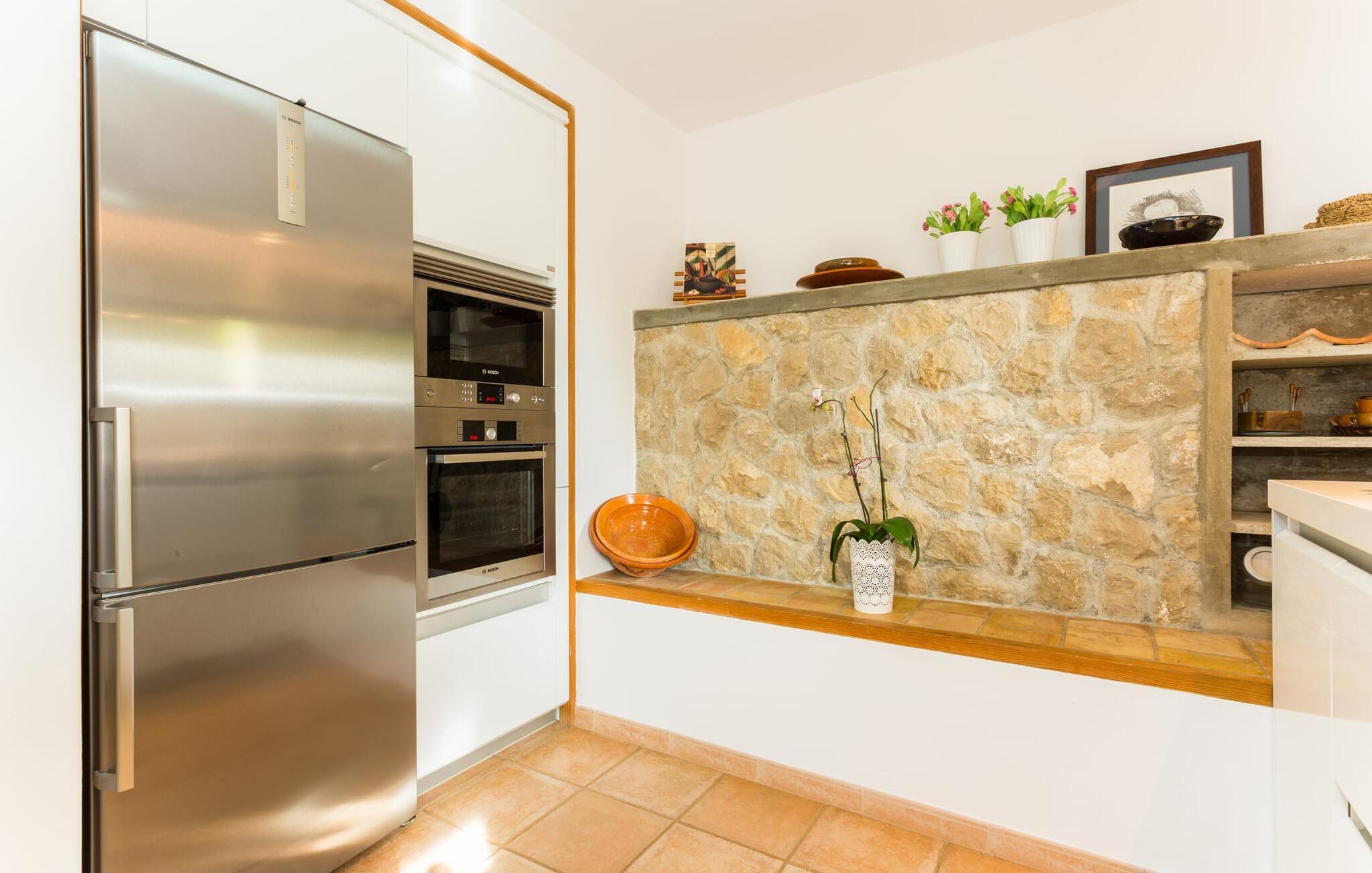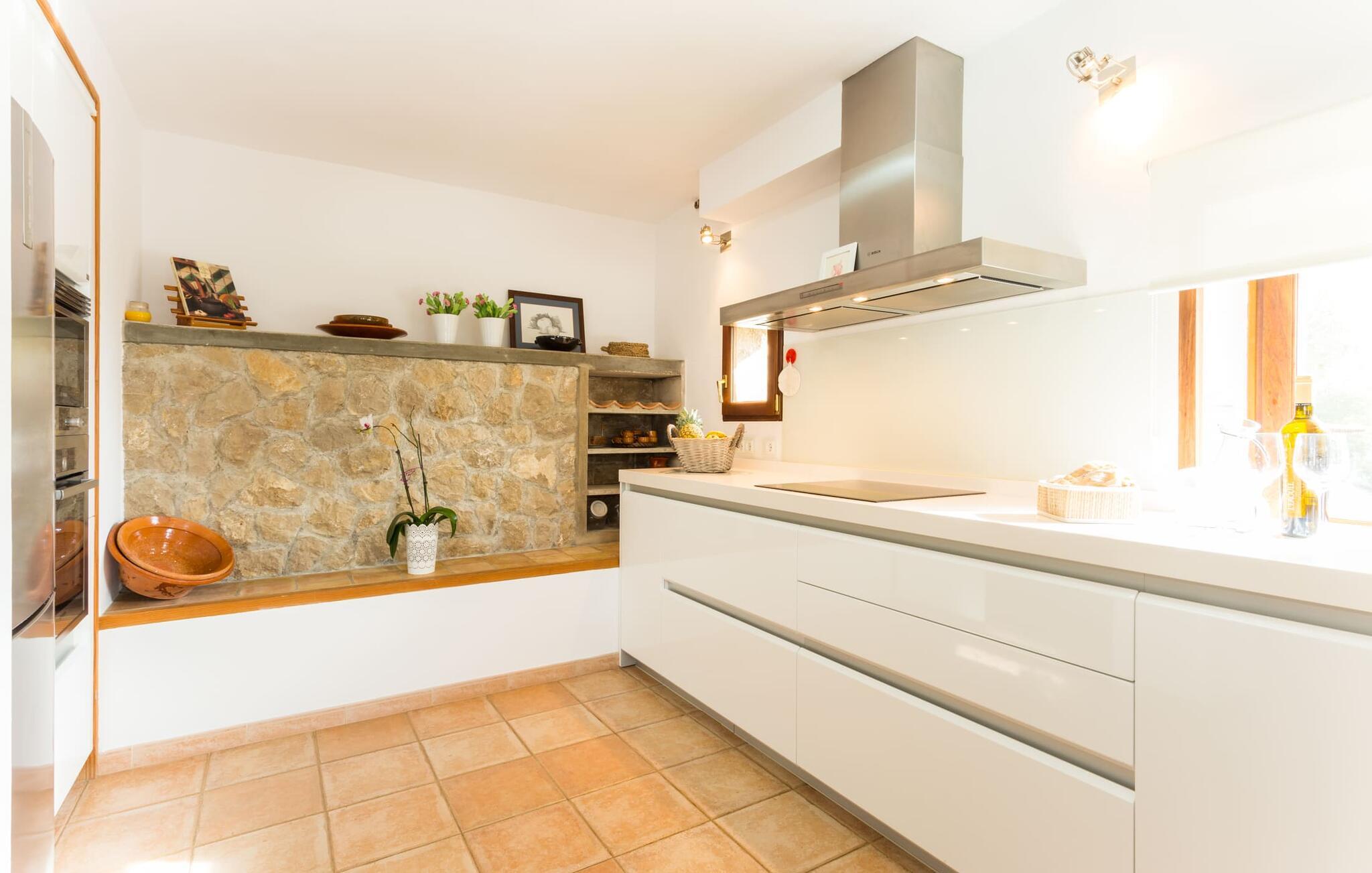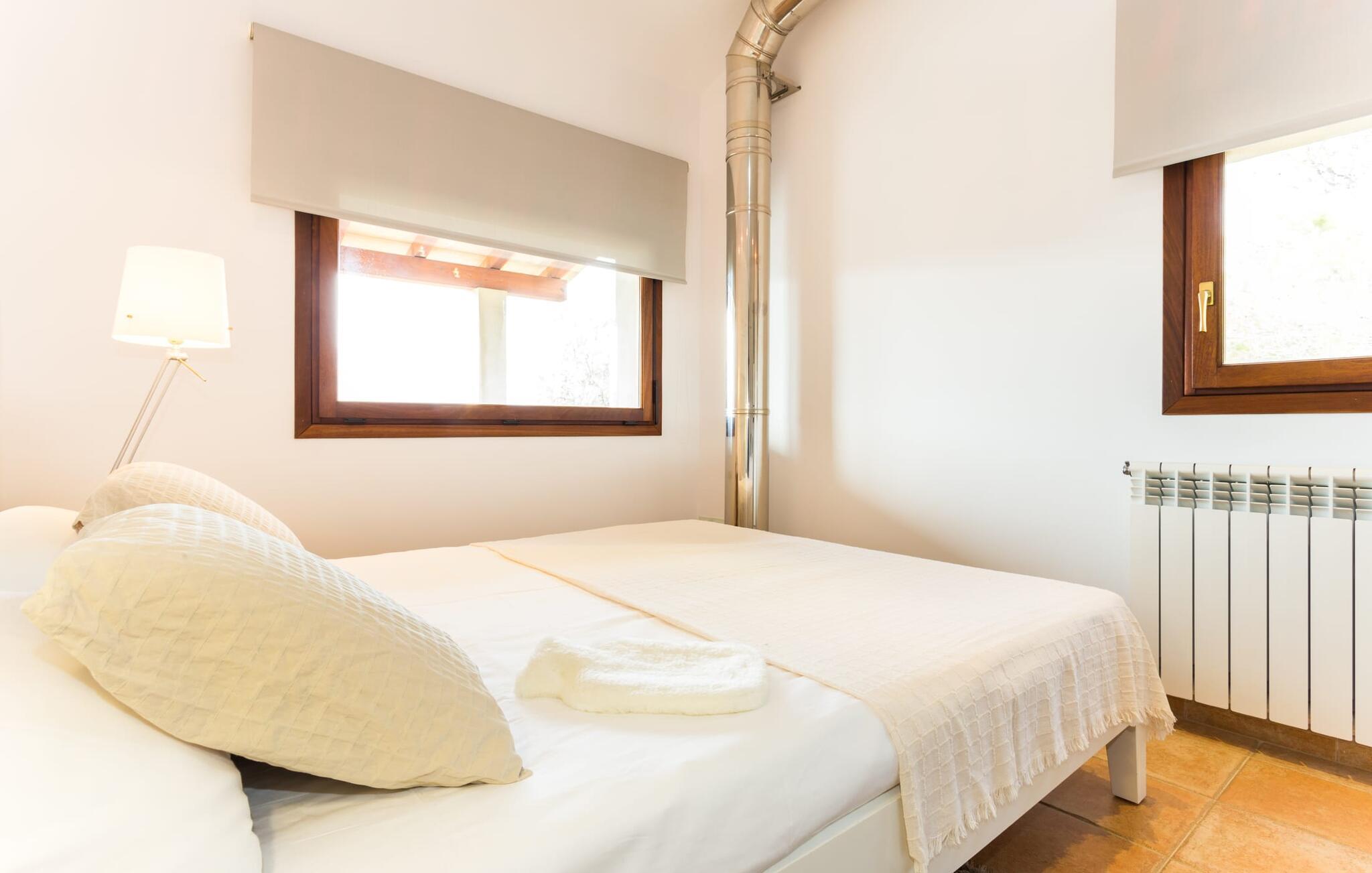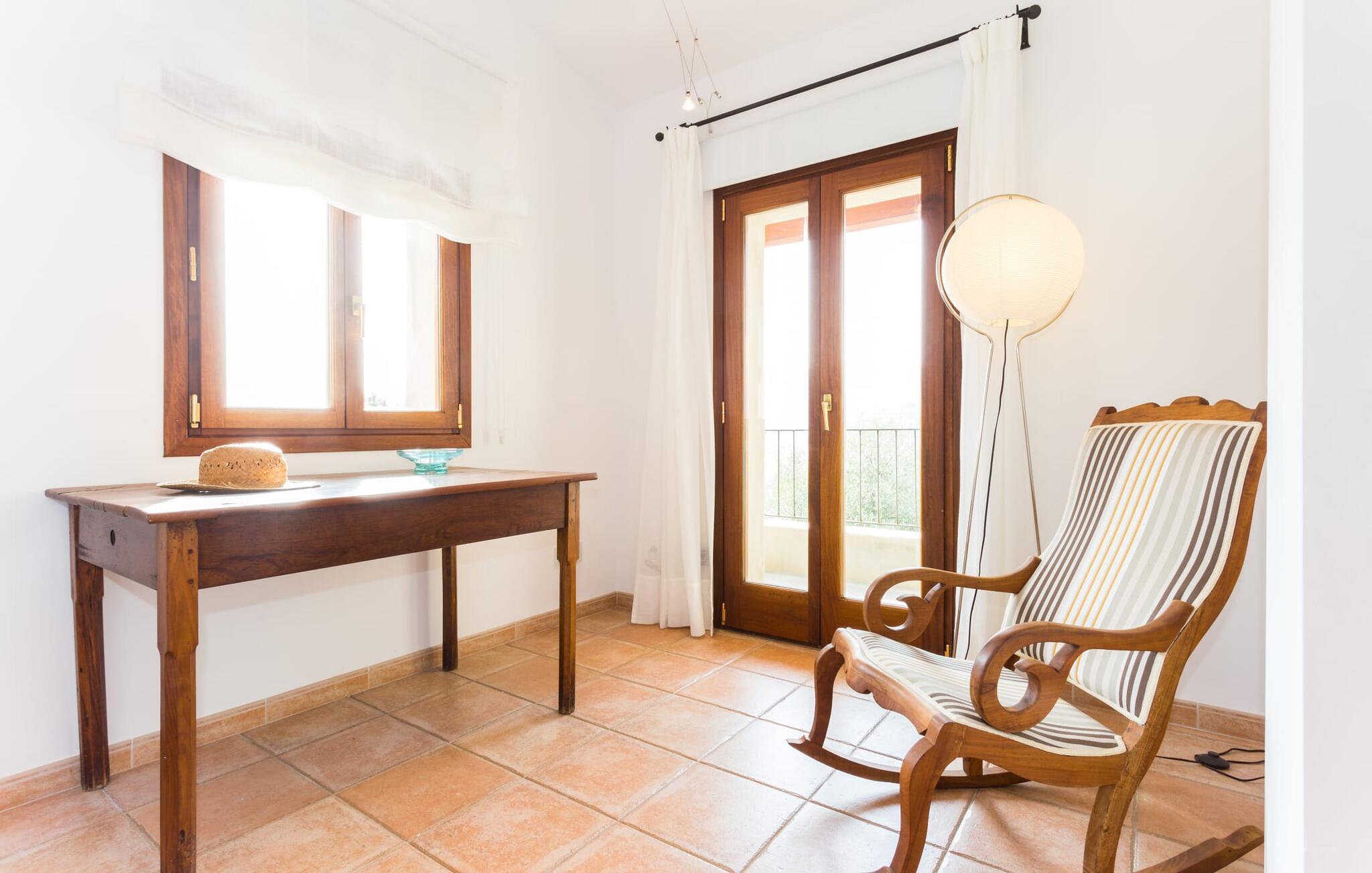 Den landlige villa "Es Guerol" med et lille stop for forfriskning er en speciel ejendom for familier, naturelskere og vandrere, der søger fred og ro. I kan næsten ikke bo et mere originalt sted end dette naturreservat på Mallorca. Den gamle villa blev nænsomt restaureret af sine ejere, som boede der i lang tid, uden at fjerne dens stemning, men med nye egenskaber som en lille pool midt på en træterrasse. Huset ligger på et bjerg, så I må forvente en stejl stigning og er bygget ind i bjerget, så I har en fantastisk panoramaudsigt over Tramuntana-bjergene fra terrassen og altanen. Hvis I ikke kan lade batterierne op her... Læn jer komfortabelt tilbage mod en varm murstensvæg, lad jeres øjne og tanker vandre i det fjerne fra jeres liggestole ved poolen, varm den rummelige grillplads op og sæt bordet ved siden af det gamle vindmølle – ren nydelse af naturen. Original på ydersiden, behagelig på indersiden! Dette er blevet renoveret og moderniseret med en masse kærlighed og god smag. Den dekorative natursten er altid en påmindelse om, at dette er en gammel villa med robuste vægge. Lige bag stuen, der er indrettet helt i jordfarver, fører en gang ind i det åbne, skinnende hvide køkken, som er udstyret med de nyeste hårde hvidevarer og masser af arbejdsplads. I kan hele tiden kigge ud af vinduet, mens I forbereder og laver mad. Den nærende pejs eller den knitrende ild vil give en hyggelig stemning – der kan trods alt blæse en kølig vind på et bjerg, så I trænger til lidt varme i huset. De tre soveværelser på øverste etage, hvoraf to har altanudgang og dermed panoramaudsigt, minder om en eremitage med hyggefaktor. Der er også to badeværelser, hvoraf det ene er i stueetagen. Betagende panorama, absolut fred, afsondret beliggenhed og sund bjergluft i et naturreservat: I kan nå den originale gourmetvilla "Es Guerol" fra læder- og vinbyen Inca via Ma-13 mod Selva og Mancor de la Vall (begge er ca. 10 minutter i bil fra villaen). Det sidste stykke kan være lidt stejlt til shopping på det ugentlige marked eller supermarked. I er dog helt afsondret i paradis. Havet er omkring 30 km væk i bil, så en dag på stranden kan helt sikkert indgå i jeres planlægning.
