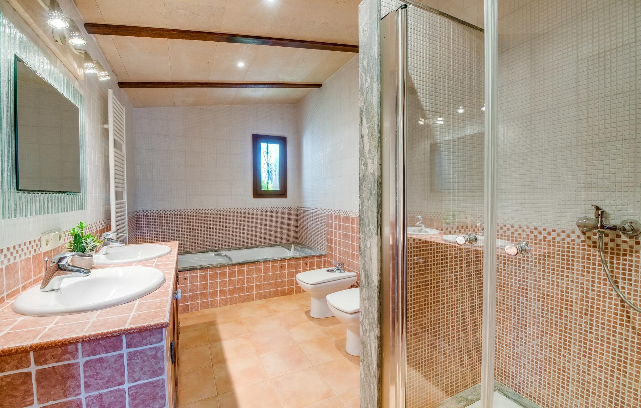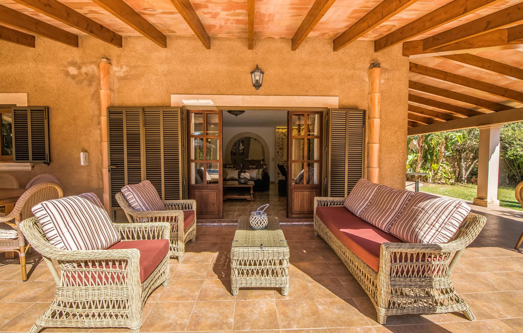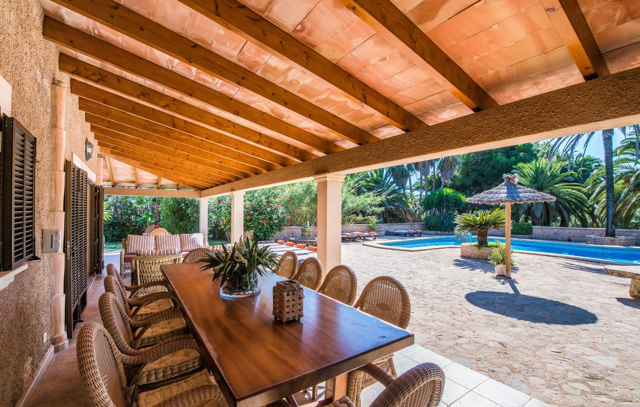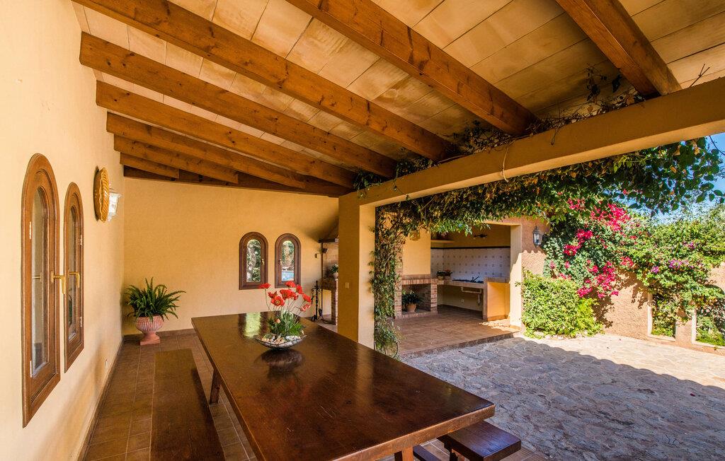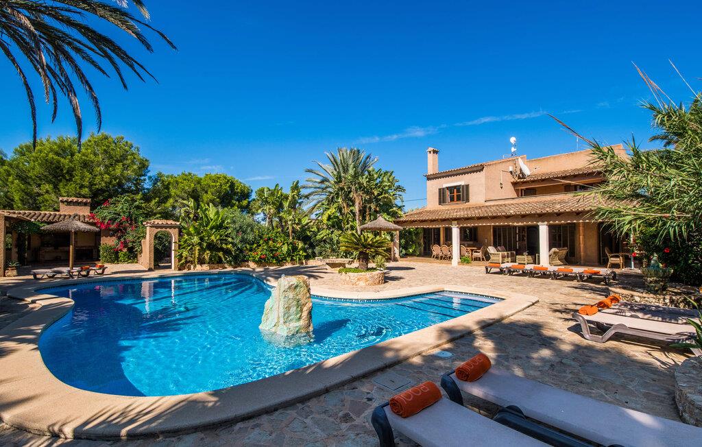 "Es Jardi" er catalansk og betyder "haven". Området dækker et areal på 15.000 m² og byder på masser af plads til at udvikle sig individuelt og nyde tiden under middelhavshimlen. Udendørsarealet er udover frodigt grønt med flere palmer særligt præget af et kæmpestort terrasseareal, der strækker sig rundt om den buede pool og bygningen, og hvis græsplæner harmonisk komplementerer billedet. Find det perfekte sted at slappe af, enten med direkte sollys eller dejligt blæsende i et af de skyggefulde områder. Den dekorative pool har en lavvandet trinindgang og er dekoreret med smukke mosaiksten. Komfortable liggestole inviterer jer til at slappe af, sætte jeres kølige drink på kanten af poolen og måske bare lave ingenting eller se børnene plaske rundt. Et rigtigt højdepunkt er det lidt adskilte udekøkken med rustikke siddepladser - et rigtig hyggeligt sted for en kulinarisk afslutning på dagen sammen. En række andre siddemuligheder giver masser af muligheder for at sidde komfortabelt udenfor. Solide møbler, rundbuer, lette vægge og lofter samt dekorative gulvfliser præger indretningen af dette klassiske bondehus, som holdes på den perfekte temperatur året rundt med varme og aircondition. Stuen kan trædes direkte ind fra terrassen og byder derfor på udsigt udenfor; den er også dejlig rummelig. En stilfuld spiseplads ligger lige ved siden af, ligesom det fuldt udstyrede køkken, hvorfra I også har direkte udgang til terrassen. Meget forskellige stilarter kan findes i soveværelserne, som er spredt ud over stueetagen og øverste etage - der er bestemt noget for enhver smag og en behagelig nattesøvn er garanteret. Fire badeværelser garanterer maksimalt privatliv, så I vil ikke føle jer trang i denne bondegård på Mallorca, selv når den er fuldt optaget. Et gæstetoilet er også placeret i stueetagen. Dette feriehus på Mallorca scorer med en rummelig have og poolområde, gode faciliteter og fremragende adgang til flere strande, for eksempel Cala Ferrera, Cala Gran, Cala d'Or. Takket være dens beliggenhed tæt på vejen, er I meget godt forbundet her. I den meget venlige, livlige landsby kan I shoppe eller slentre langs promenaden. Udvalget af andre badebugter er mangfoldigt og nemt at nå med lejebil. Brug af ejendommens aircondition er inkluderet i prisen, men brugen er begrænset til kl. 18.30 og kl. 22.00. Gebyret afregnes herefter kontant på stedet. Varmeudgifter er også inkluderet i prisen fra 07.00 til 09.00 og fra 18.00 til midnat, hvorefter de afregnes kontant på stedet.