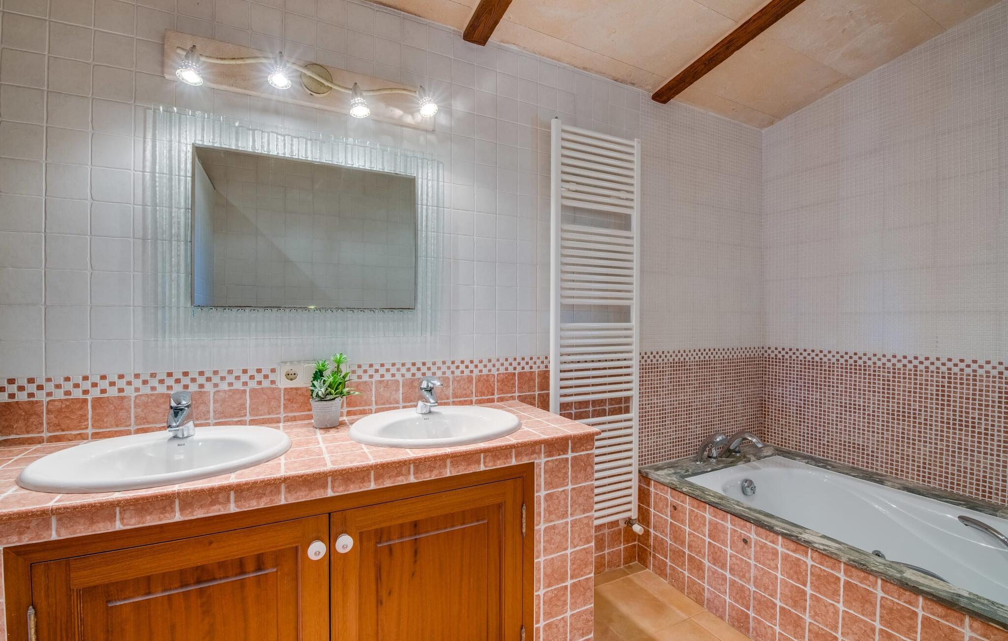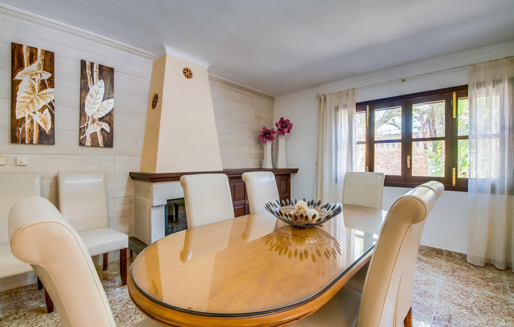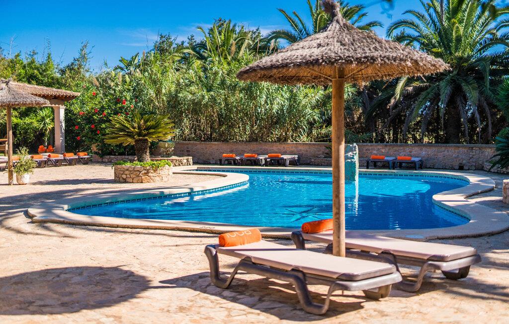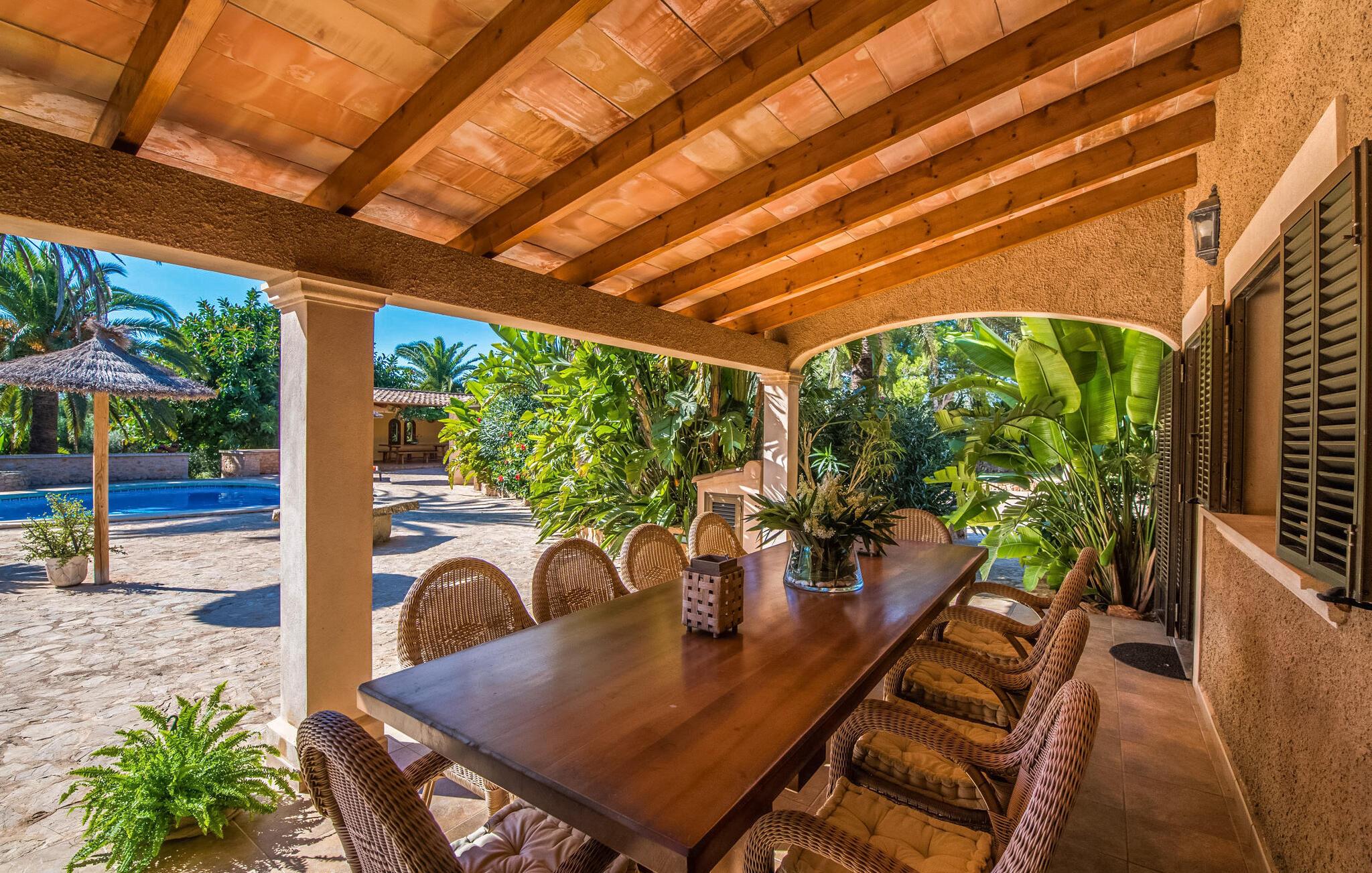 "Es Jardi" er catalansk og betyder "haven". Området dækker et areal på 15.000 m² og byder på masser af plads til at udvikle sig individuelt og nyde tiden under middelhavshimlen. Udendørsarealet er udover frodigt grønt med flere palmer særligt præget af et kæmpestort terrasseareal, der strækker sig rundt om den buede pool og bygningen, og hvis græsplæner harmonisk komplementerer billedet. Find det perfekte sted at slappe af, enten med direkte sollys eller dejligt blæsende i et af de skyggefulde områder. Den dekorative pool har en lavvandet trinindgang og er dekoreret med smukke mosaiksten. Komfortable liggestole inviterer jer til at slappe af, sætte jeres kølige drink på kanten af poolen og måske bare lave ingenting eller se børnene plaske rundt. Et rigtigt højdepunkt er det lidt adskilte udekøkken med rustikke siddepladser - et rigtig hyggeligt sted for en kulinarisk afslutning på dagen sammen. En række andre siddemuligheder giver masser af muligheder for at sidde komfortabelt udenfor. Solide møbler, rundbuer, lette vægge og lofter samt dekorative gulvfliser præger indretningen af dette klassiske bondehus, som holdes på den perfekte temperatur året rundt med varme og aircondition. Stuen kan trædes direkte ind fra terrassen og byder derfor på udsigt udenfor; den er også dejlig rummelig. En stilfuld spiseplads ligger lige ved siden af, ligesom det fuldt udstyrede køkken, hvorfra I også har direkte udgang til terrassen. Meget forskellige stilarter kan findes i soveværelserne, som er spredt ud over stueetagen og øverste etage - der er bestemt noget for enhver smag og en behagelig nattesøvn er garanteret. Fire badeværelser garanterer maksimalt privatliv, så I vil ikke føle jer trang i denne bondegård på Mallorca, selv når den er fuldt optaget. Et gæstetoilet er også placeret i stueetagen. Dette feriehus på Mallorca scorer med en rummelig have og poolområde, gode faciliteter og fremragende adgang til flere strande, for eksempel Cala Ferrera, Cala Gran, Cala d'Or. Takket være dens beliggenhed tæt på vejen, er I meget godt forbundet her. I den meget venlige, livlige landsby kan I shoppe eller slentre langs promenaden. Udvalget af andre badebugter er mangfoldigt og nemt at nå med lejebil. Brug af ejendommens aircondition er inkluderet i prisen, men brugen er begrænset til kl. 18.30 og kl. 22.00. Gebyret afregnes herefter kontant på stedet. Varmeudgifter er også inkluderet i prisen fra 07.00 til 09.00 og fra 18.00 til midnat, hvorefter de afregnes kontant på stedet.