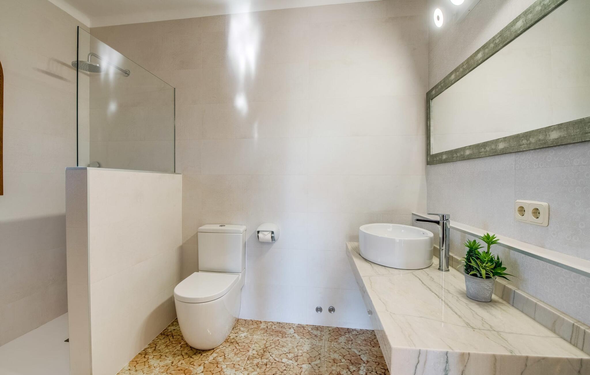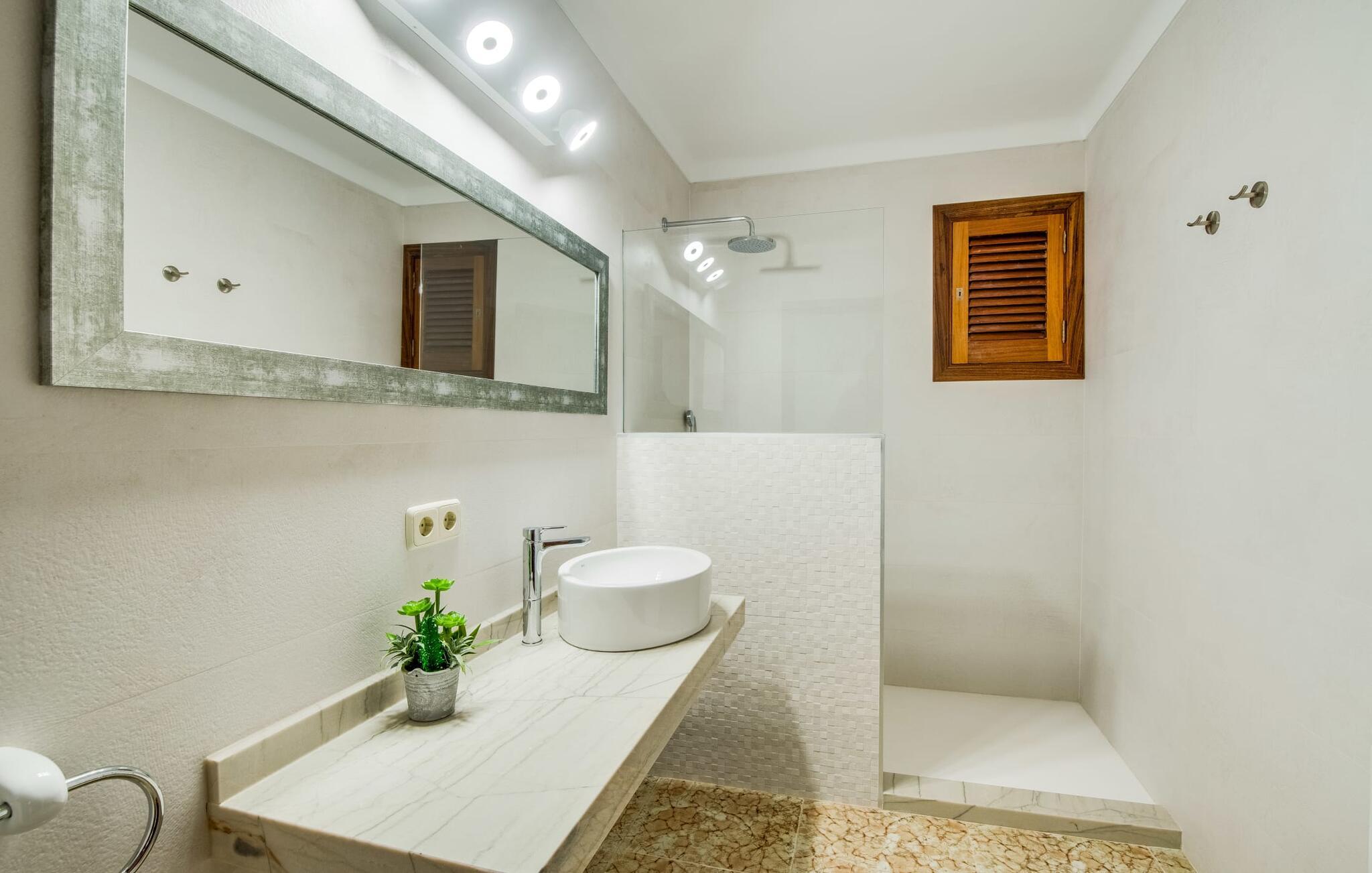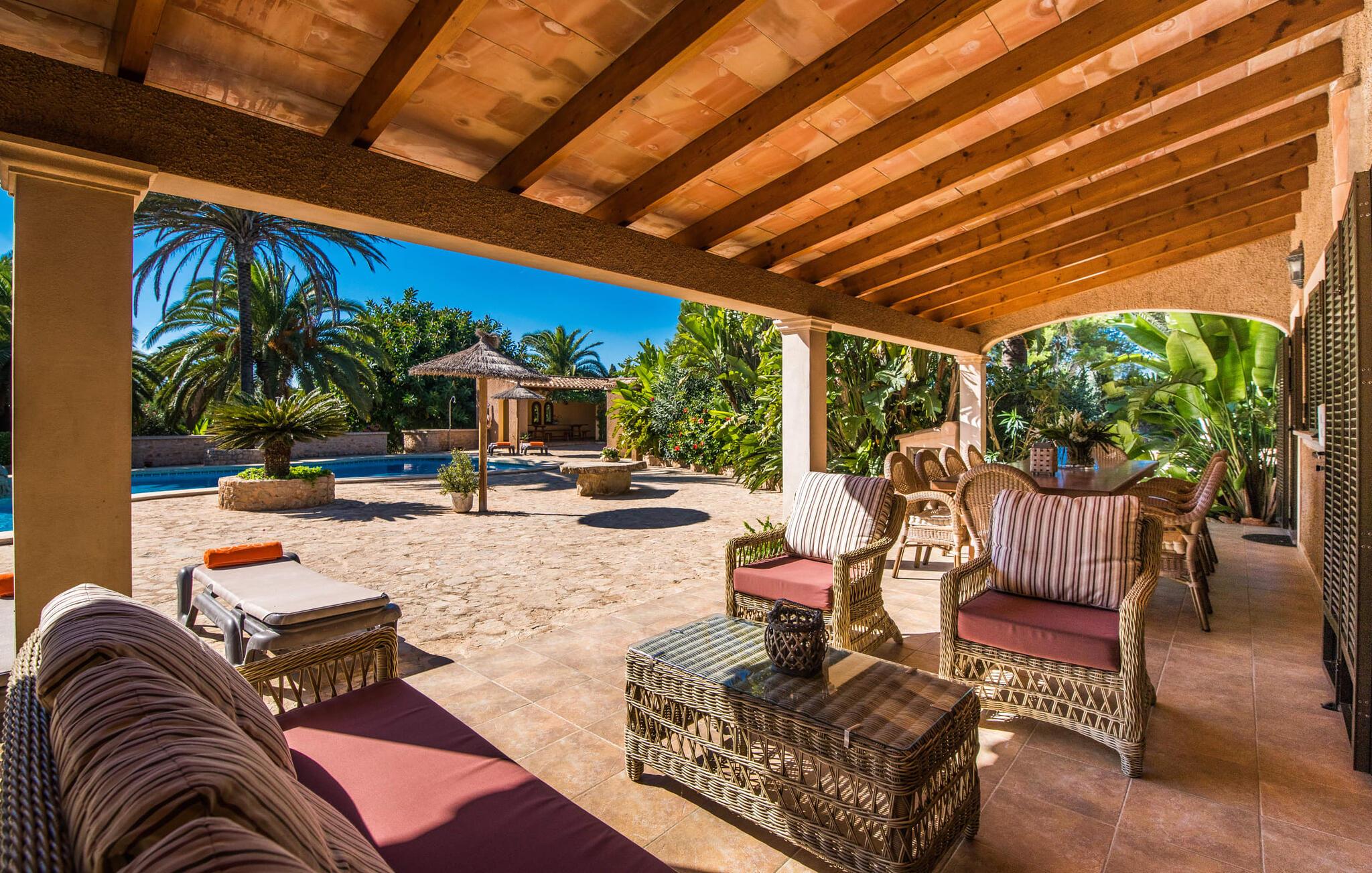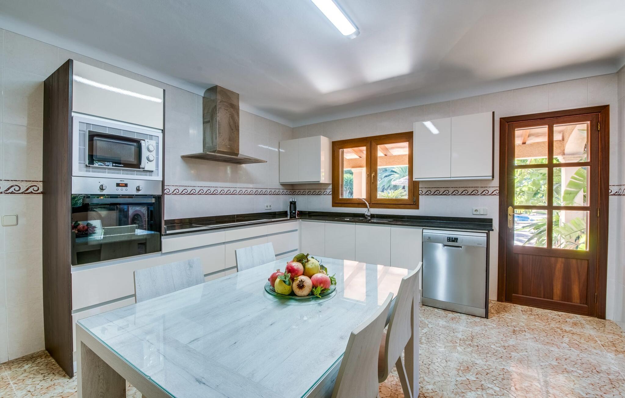 "Es Jardi" er catalansk og betyder "haven". Området dækker et areal på 15.000 m² og byder på masser af plads til at udvikle sig individuelt og nyde tiden under middelhavshimlen. Udendørsarealet er udover frodigt grønt med flere palmer særligt præget af et kæmpestort terrasseareal, der strækker sig rundt om den buede pool og bygningen, og hvis græsplæner harmonisk komplementerer billedet. Find det perfekte sted at slappe af, enten med direkte sollys eller dejligt blæsende i et af de skyggefulde områder. Den dekorative pool har en lavvandet trinindgang og er dekoreret med smukke mosaiksten. Komfortable liggestole inviterer jer til at slappe af, sætte jeres kølige drink på kanten af poolen og måske bare lave ingenting eller se børnene plaske rundt. Et rigtigt højdepunkt er det lidt adskilte udekøkken med rustikke siddepladser - et rigtig hyggeligt sted for en kulinarisk afslutning på dagen sammen. En række andre siddemuligheder giver masser af muligheder for at sidde komfortabelt udenfor. Solide møbler, rundbuer, lette vægge og lofter samt dekorative gulvfliser præger indretningen af dette klassiske bondehus, som holdes på den perfekte temperatur året rundt med varme og aircondition. Stuen kan trædes direkte ind fra terrassen og byder derfor på udsigt udenfor; den er også dejlig rummelig. En stilfuld spiseplads ligger lige ved siden af, ligesom det fuldt udstyrede køkken, hvorfra I også har direkte udgang til terrassen. Meget forskellige stilarter kan findes i soveværelserne, som er spredt ud over stueetagen og øverste etage - der er bestemt noget for enhver smag og en behagelig nattesøvn er garanteret. Fire badeværelser garanterer maksimalt privatliv, så I vil ikke føle jer trang i denne bondegård på Mallorca, selv når den er fuldt optaget. Et gæstetoilet er også placeret i stueetagen. Dette feriehus på Mallorca scorer med en rummelig have og poolområde, gode faciliteter og fremragende adgang til flere strande, for eksempel Cala Ferrera, Cala Gran, Cala d'Or. Takket være dens beliggenhed tæt på vejen, er I meget godt forbundet her. I den meget venlige, livlige landsby kan I shoppe eller slentre langs promenaden. Udvalget af andre badebugter er mangfoldigt og nemt at nå med lejebil. Brug af ejendommens aircondition er inkluderet i prisen, men brugen er begrænset til kl. 18.30 og kl. 22.00. Gebyret afregnes herefter kontant på stedet. Varmeudgifter er også inkluderet i prisen fra 07.00 til 09.00 og fra 18.00 til midnat, hvorefter de afregnes kontant på stedet.