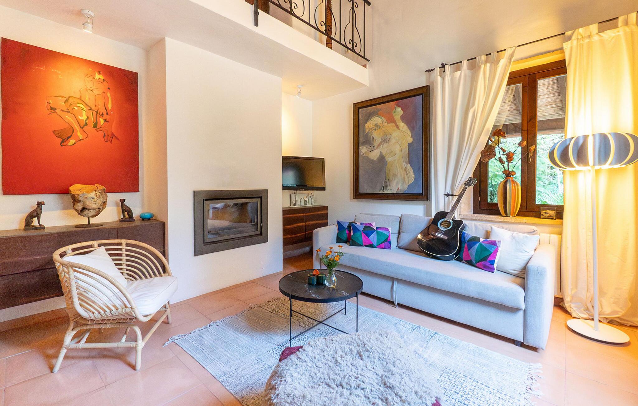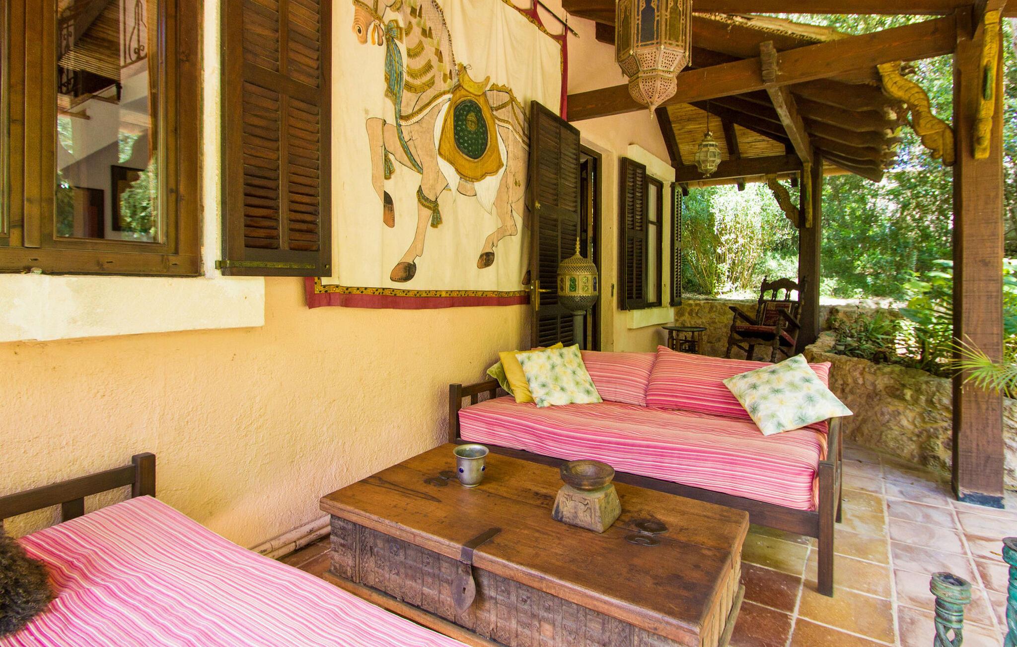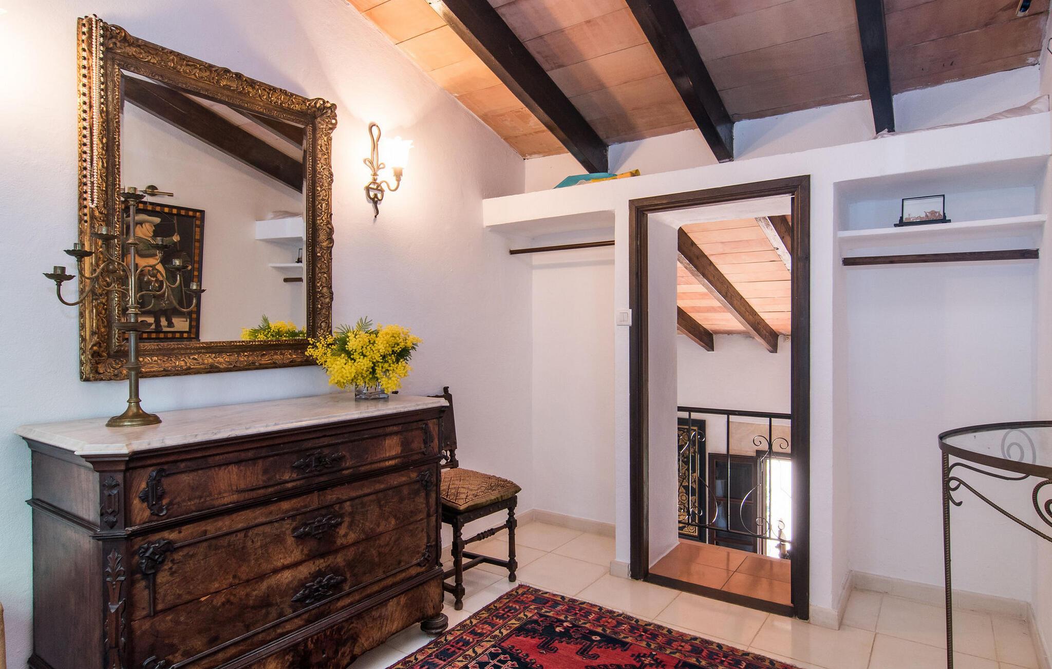 Inde i huset finder I persiske tæpper, antikviteter og originale kunstværker. I stueetagen er der en stue med et lille bibliotek og en brændeovn til de kølige måneder. Det fuldt udstyrede køkken i landlig stil har marmorbordplader og et stort gaskomfur. Et af de tre soveværelser ligger i stueetagen og har eget badeværelse og privat terrasse. På øverste etage er der to soveværelser med dobbeltsenge, det ene med walk-in garderobe og balkon. Et moderne fælles badeværelse tjener begge soveværelser ovenpå. Højhastigheds-WiFi er tilgængelig i hele bygningen.