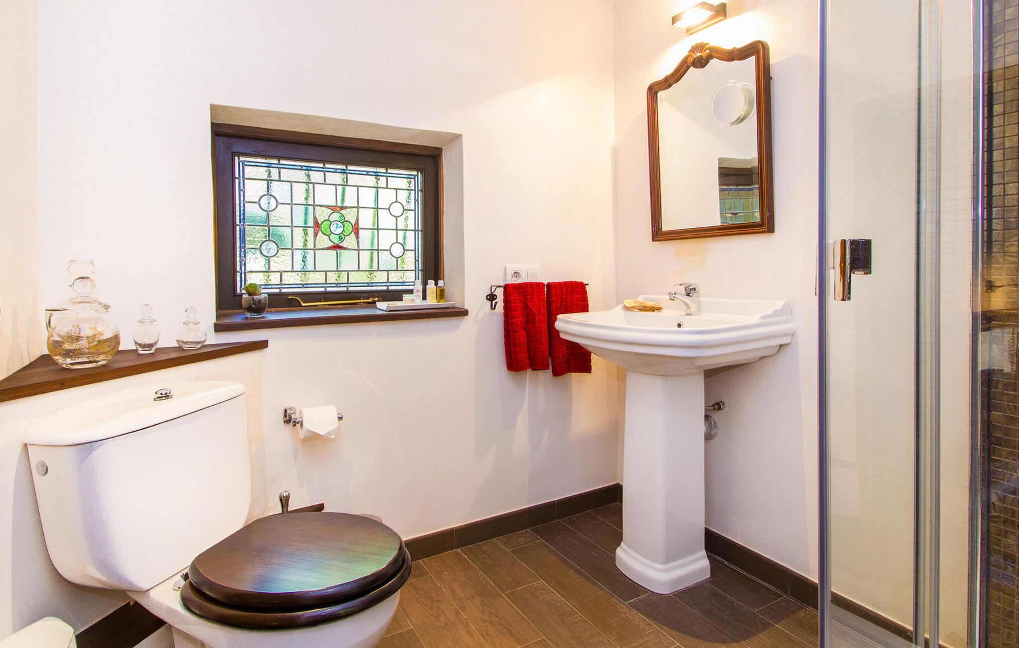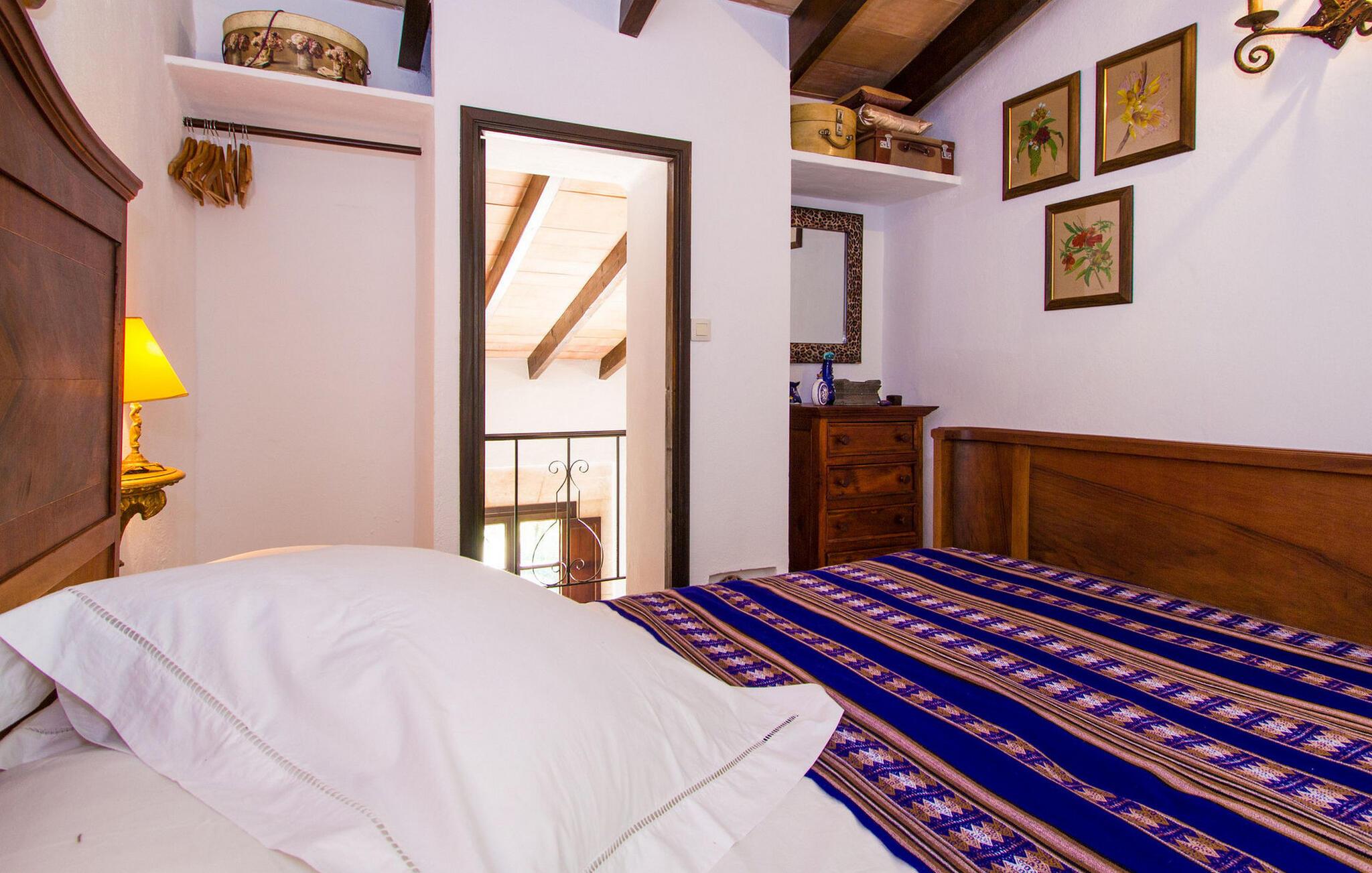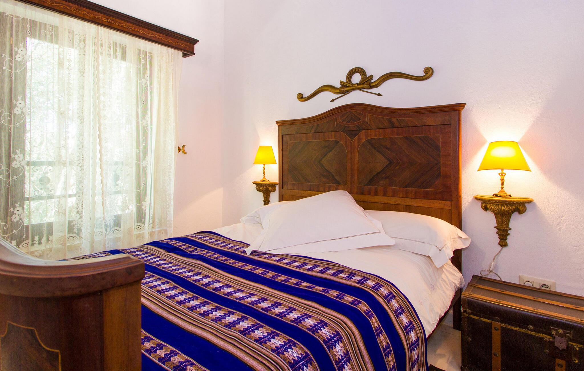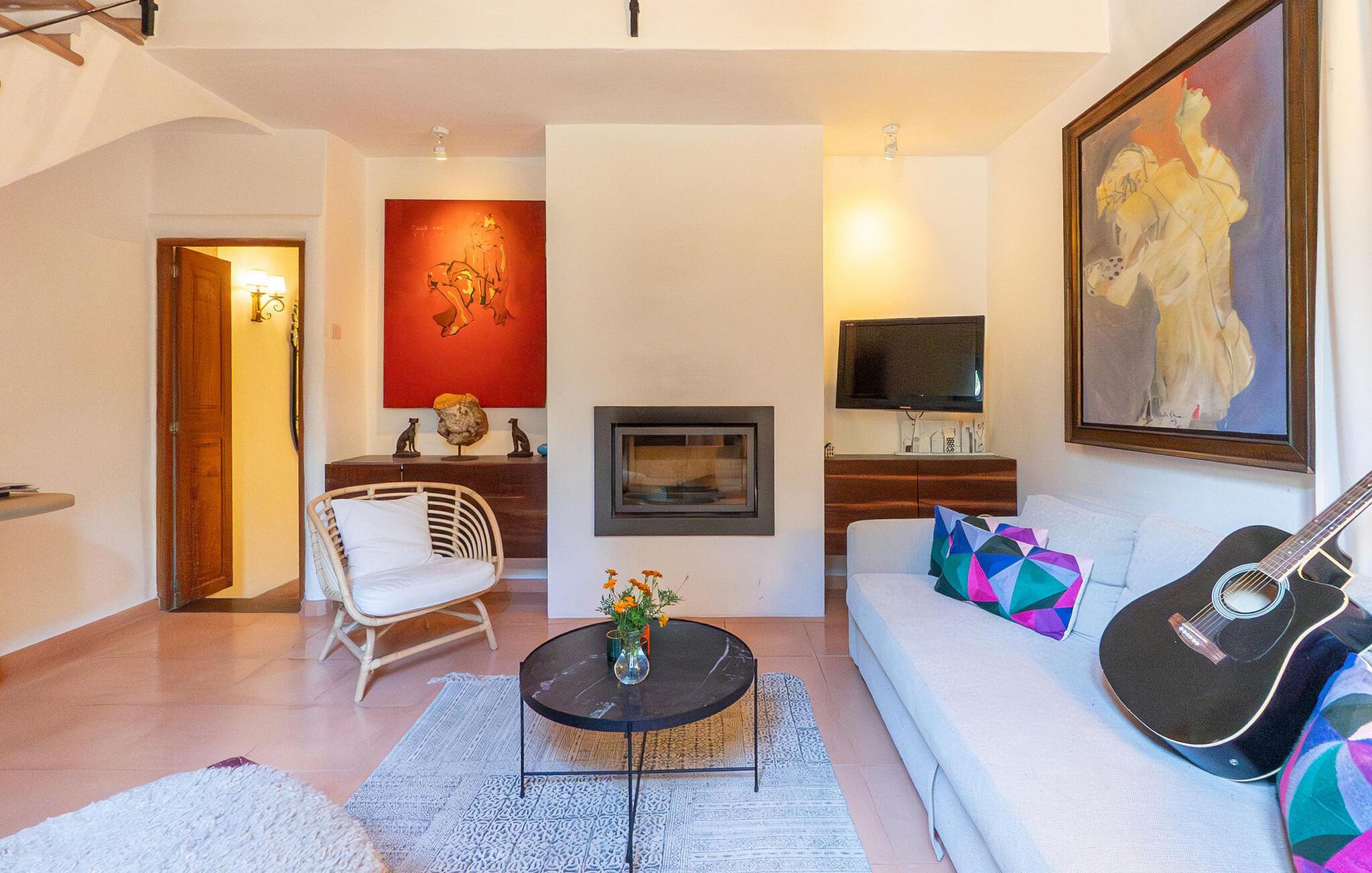 Inde i huset finder I persiske tæpper, antikviteter og originale kunstværker. I stueetagen er der en stue med et lille bibliotek og en brændeovn til de kølige måneder. Det fuldt udstyrede køkken i landlig stil har marmorbordplader og et stort gaskomfur. Et af de tre soveværelser ligger i stueetagen og har eget badeværelse og privat terrasse. På øverste etage er der to soveværelser med dobbeltsenge, det ene med walk-in garderobe og balkon. Et moderne fælles badeværelse tjener begge soveværelser ovenpå. Højhastigheds-WiFi er tilgængelig i hele bygningen.