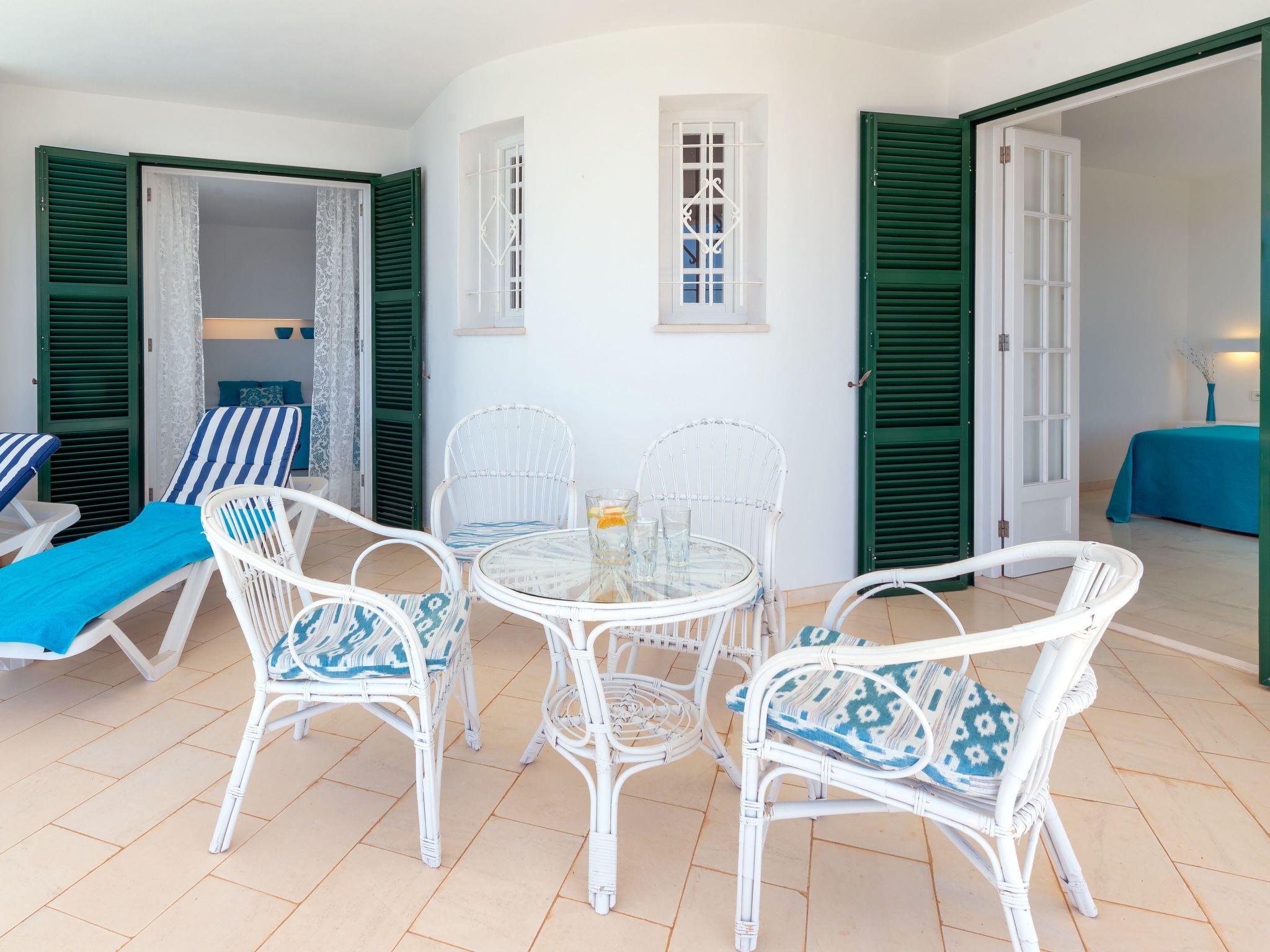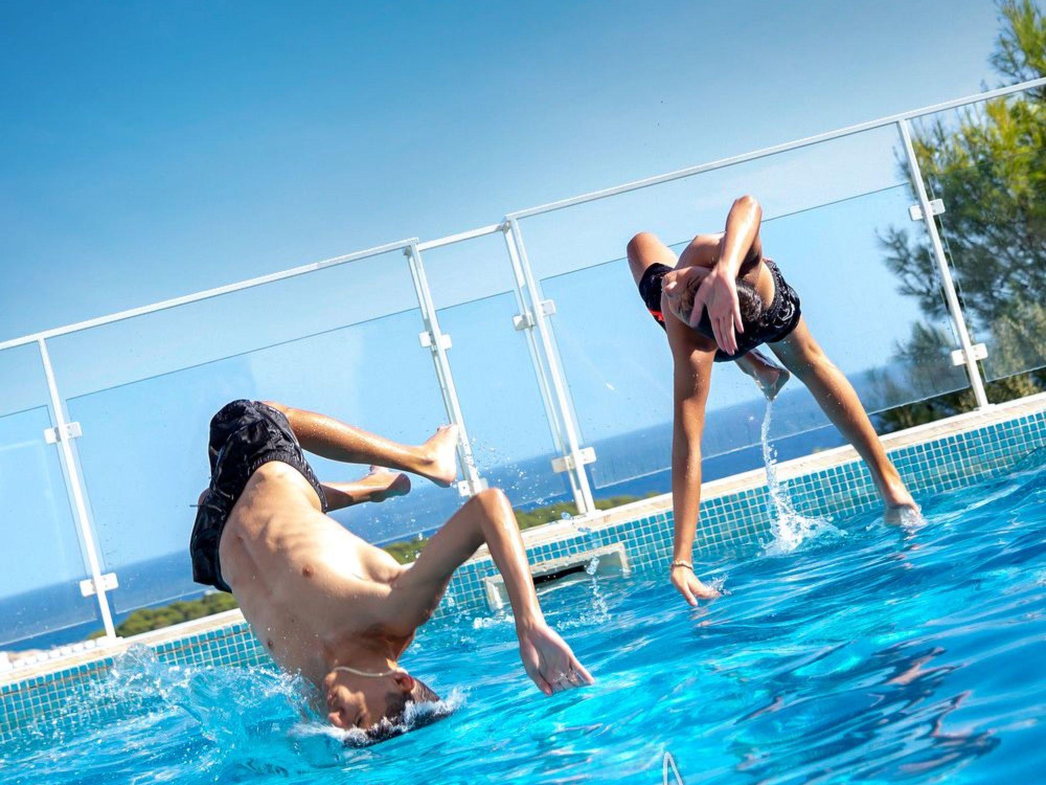 Outside, a panorama of palm trees and pine trees surrounds the environmentally friendly heated pool, which is framed by Menorcan natural stone (marés) - safe and pleasant even in strong sunlight. Ample sunbathing areas, both in the sun and in the shade of an awning or the large palm tree, promise pure relaxation. The outdoor area is complemented by comfortable sun loungers and parasols that invite you to enjoy long, relaxing days.
