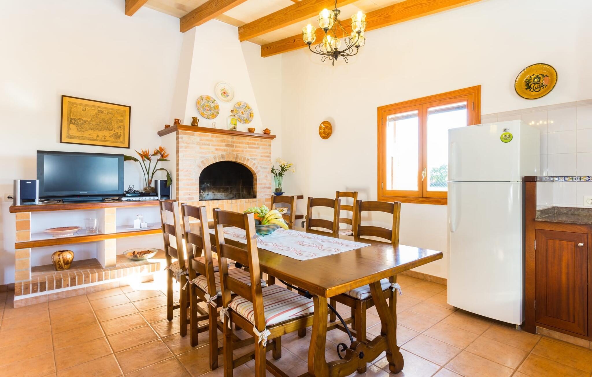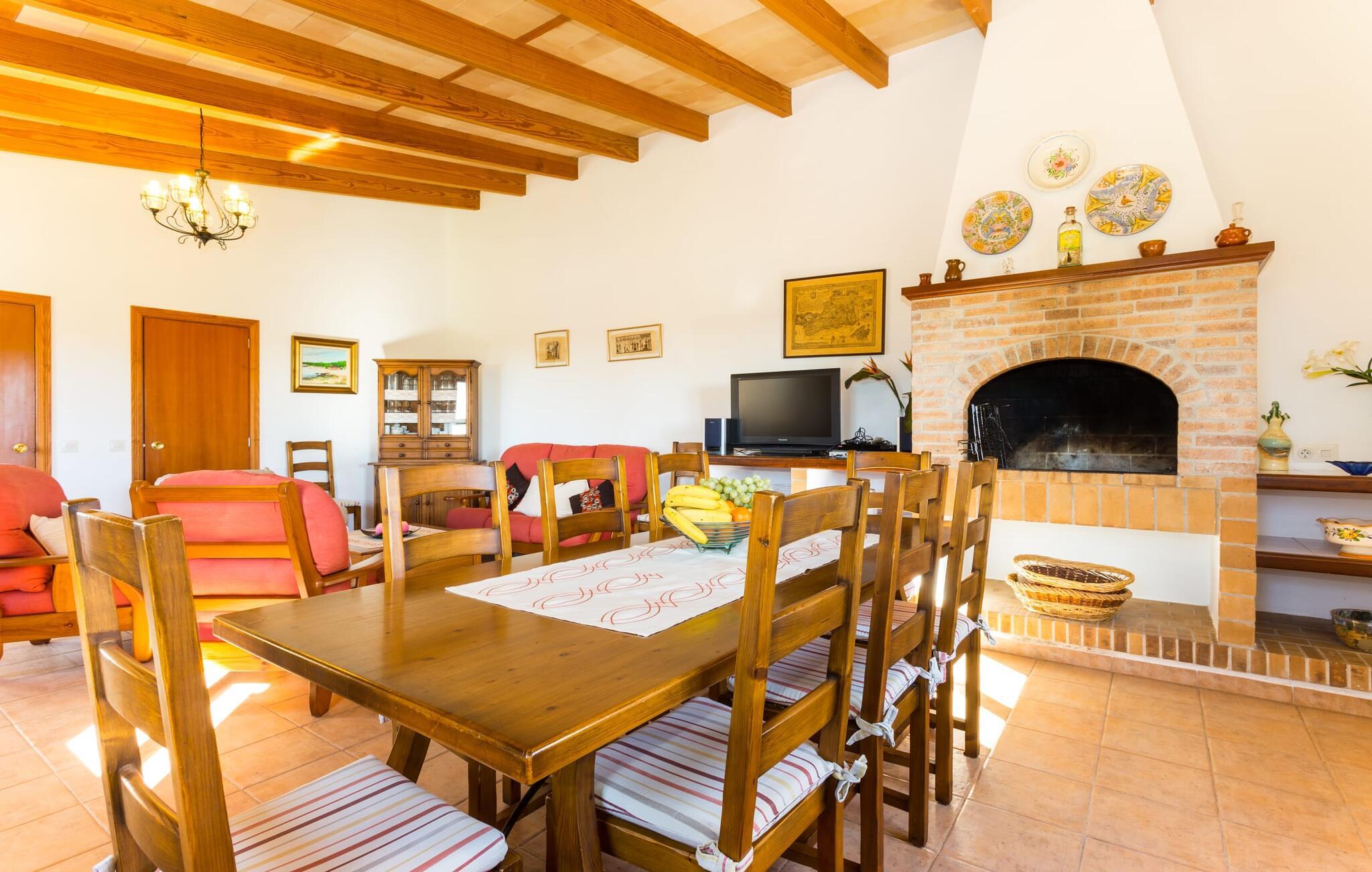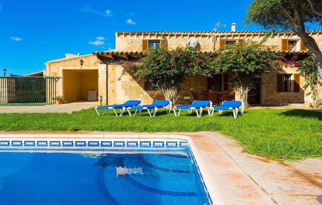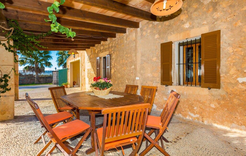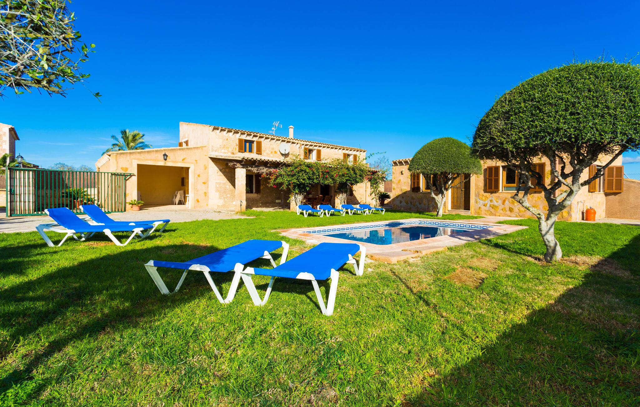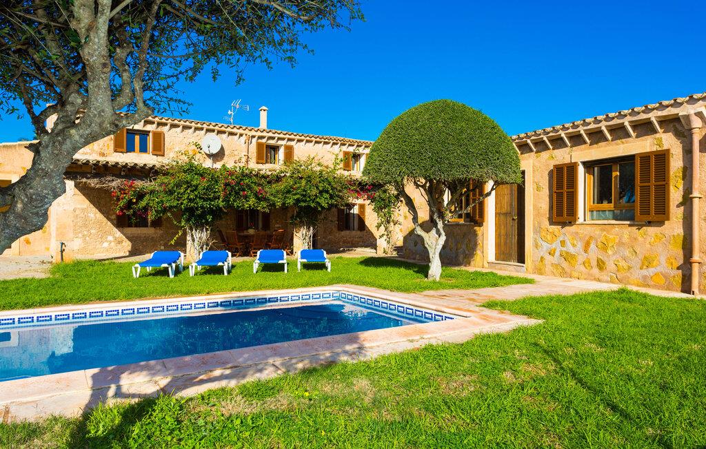 Den charmerende naturstensvilla "Es Palmi" er beliggende i en smukt vedligeholdt have med frodige græsplæner og middelhavsplanter. Dens jordbrune skodder blander sig problemfrit ind i omgivelserne. Villaen består af to boligenheder: en renoveret traditionel villa, der rummer soveværelserne og en senere bygget enhed. Et indbydende udendørs opholdsområde har et træbord perfekt til spisning, i skyggen af et tag og bougainvillea. Midtpunktet er en pool, tilgængelig via trin, som giver en forfriskende forandring på varme dage og suppleres af to parasoller til solbeskyttelse. På hyggelige sommeraftener kan gæsterne nyde grillaftener med friske lokale råvarer. Ejendommen har plads til tre biler. I stueetagen er der et fuldt udstyret køkken, en hyggelig stue, et badeværelse og et soveværelse, mens den øverste etage byder på et ekstra badeværelse og to soveværelser, hvor det større soveværelse har aircondition. Den separate enhed har endnu et fuldt udstyret køkken, stue og toilet, samt en pejs til køligere nætter. Villaens indretning med afstemte farver og traditionelle træbjælker skaber en hyggelig atmosfære. Med et layout, der sikrer privatliv og plads, er denne villa perfekt til større grupper eller to familier, der ønsker at holde ferie sammen, mens de nyder privatlivets fred på den omfattende ejendom. Den smukke stenbrudsvilla "Es Palm" ligger på en vidunderlig landlig grund på 550 m², ca. 4 km nordøst for kystbyen Ses Covetes. Der er restauranter og et lille supermarked her. Den berømte Es Trenc-strand ligger kun 10 minutter væk i bil.