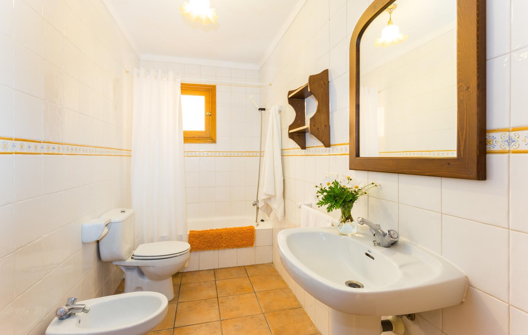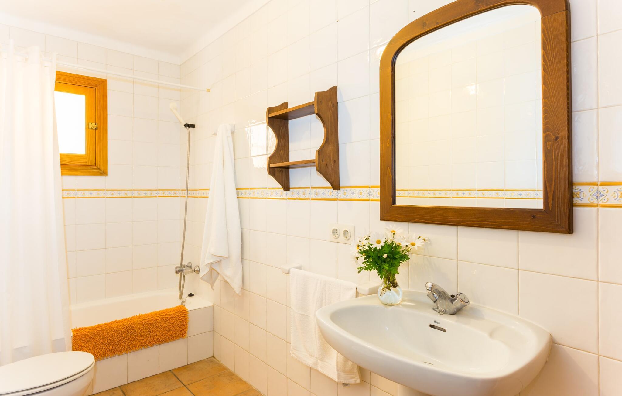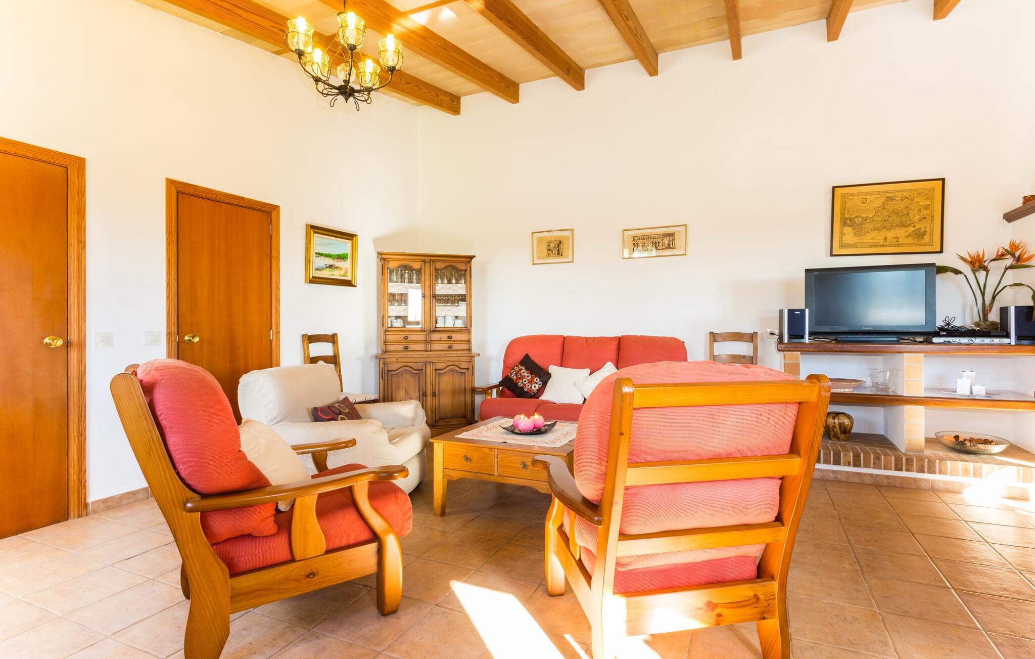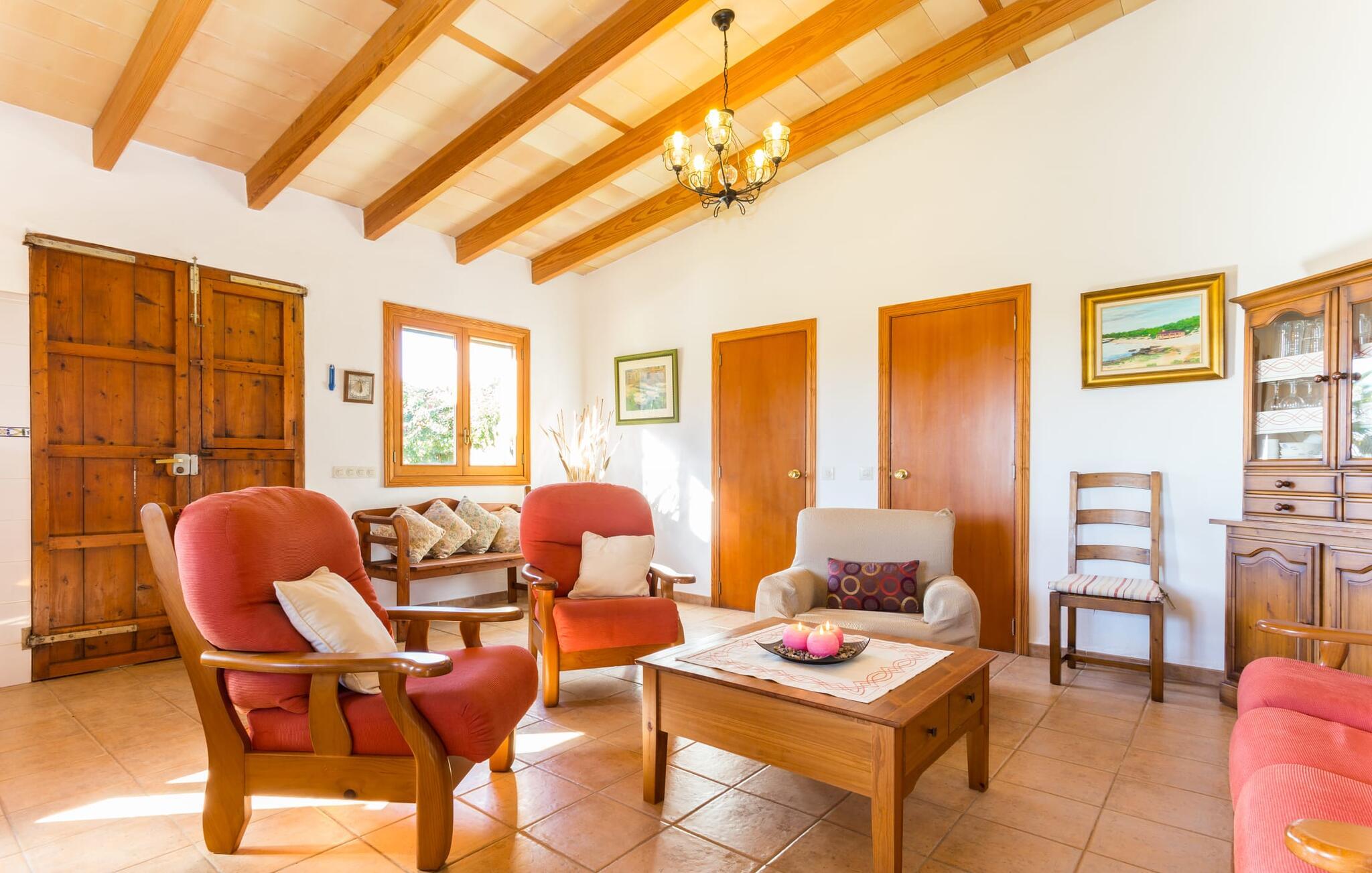 Den charmerende naturstensvilla "Es Palmi" er beliggende i en smukt vedligeholdt have med frodige græsplæner og middelhavsplanter. Dens jordbrune skodder blander sig problemfrit ind i omgivelserne. Villaen består af to boligenheder: en renoveret traditionel villa, der rummer soveværelserne og en senere bygget enhed. Et indbydende udendørs opholdsområde har et træbord perfekt til spisning, i skyggen af et tag og bougainvillea. Midtpunktet er en pool, tilgængelig via trin, som giver en forfriskende forandring på varme dage og suppleres af to parasoller til solbeskyttelse. På hyggelige sommeraftener kan gæsterne nyde grillaftener med friske lokale råvarer. Ejendommen har plads til tre biler. I stueetagen er der et fuldt udstyret køkken, en hyggelig stue, et badeværelse og et soveværelse, mens den øverste etage byder på et ekstra badeværelse og to soveværelser, hvor det større soveværelse har aircondition. Den separate enhed har endnu et fuldt udstyret køkken, stue og toilet, samt en pejs til køligere nætter. Villaens indretning med afstemte farver og traditionelle træbjælker skaber en hyggelig atmosfære. Med et layout, der sikrer privatliv og plads, er denne villa perfekt til større grupper eller to familier, der ønsker at holde ferie sammen, mens de nyder privatlivets fred på den omfattende ejendom. Den smukke stenbrudsvilla "Es Palm" ligger på en vidunderlig landlig grund på 550 m², ca. 4 km nordøst for kystbyen Ses Covetes. Der er restauranter og et lille supermarked her. Den berømte Es Trenc-strand ligger kun 10 minutter væk i bil.