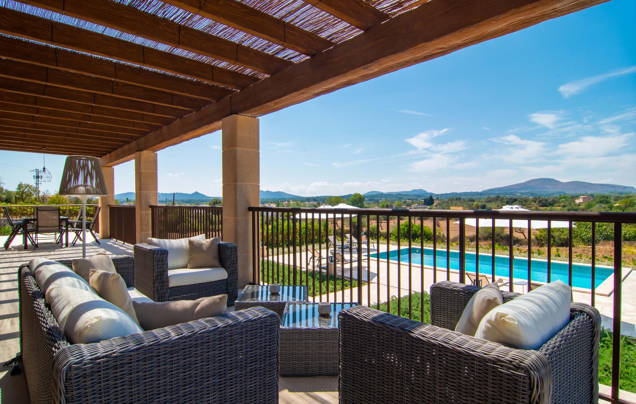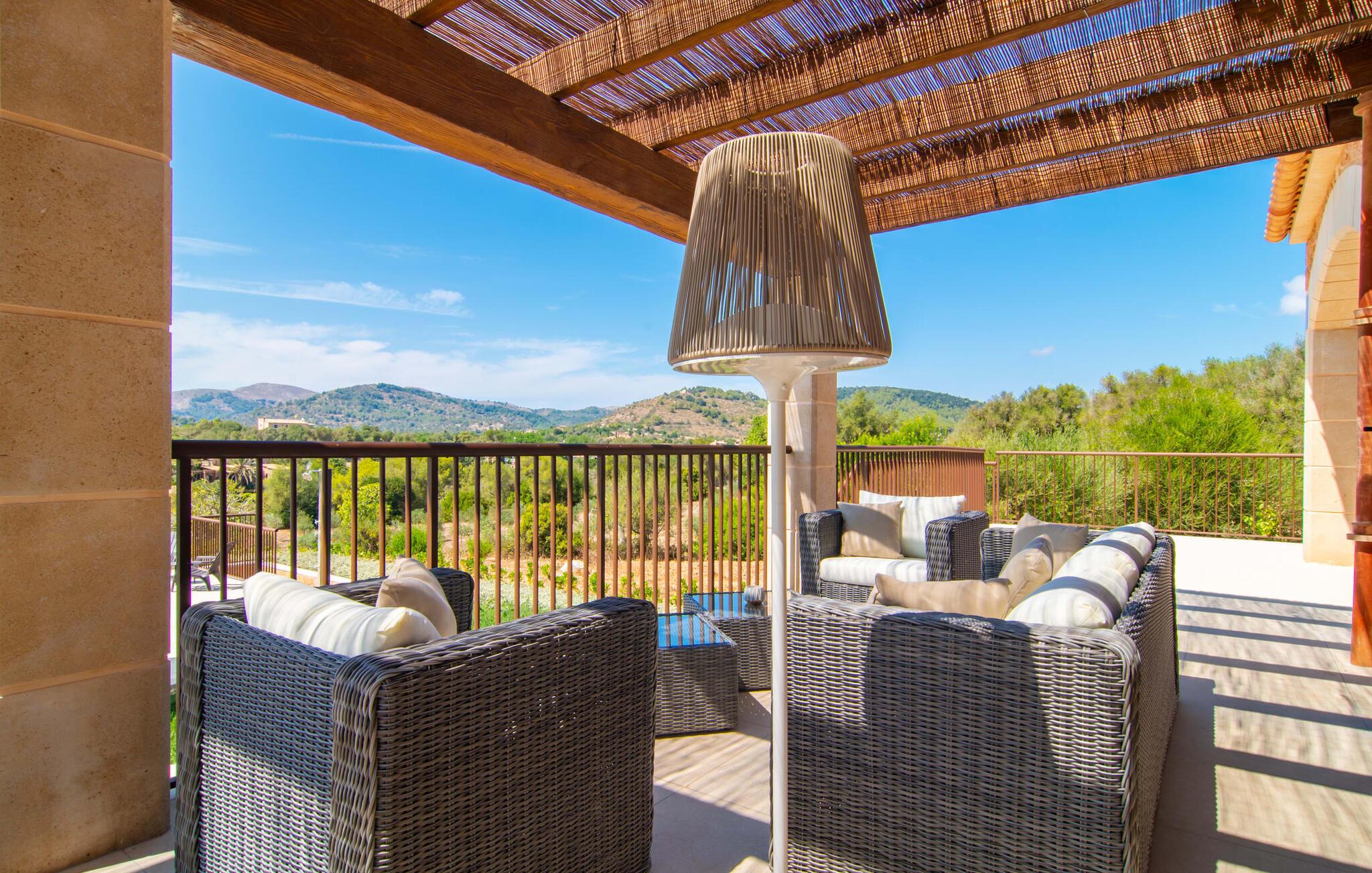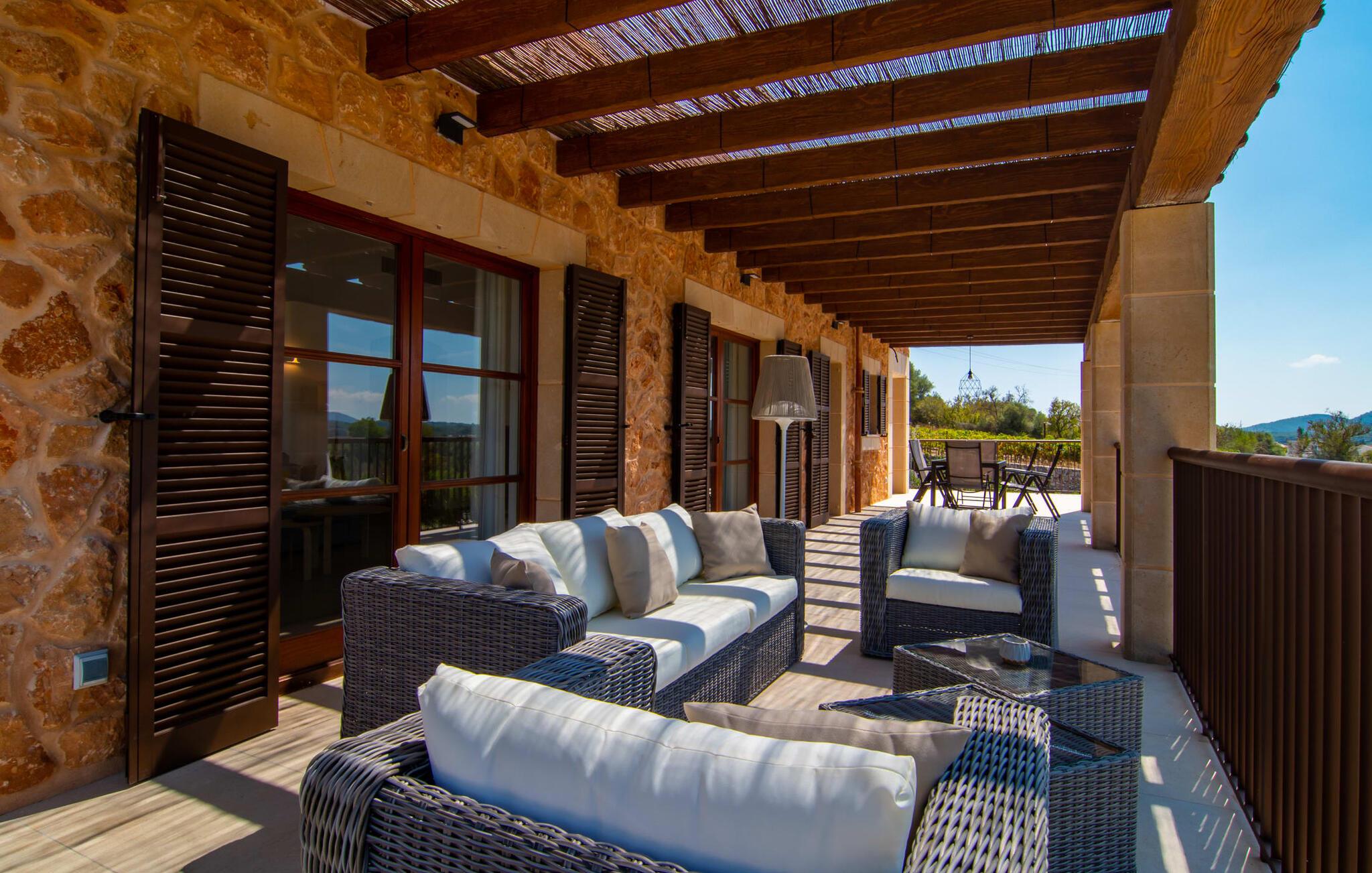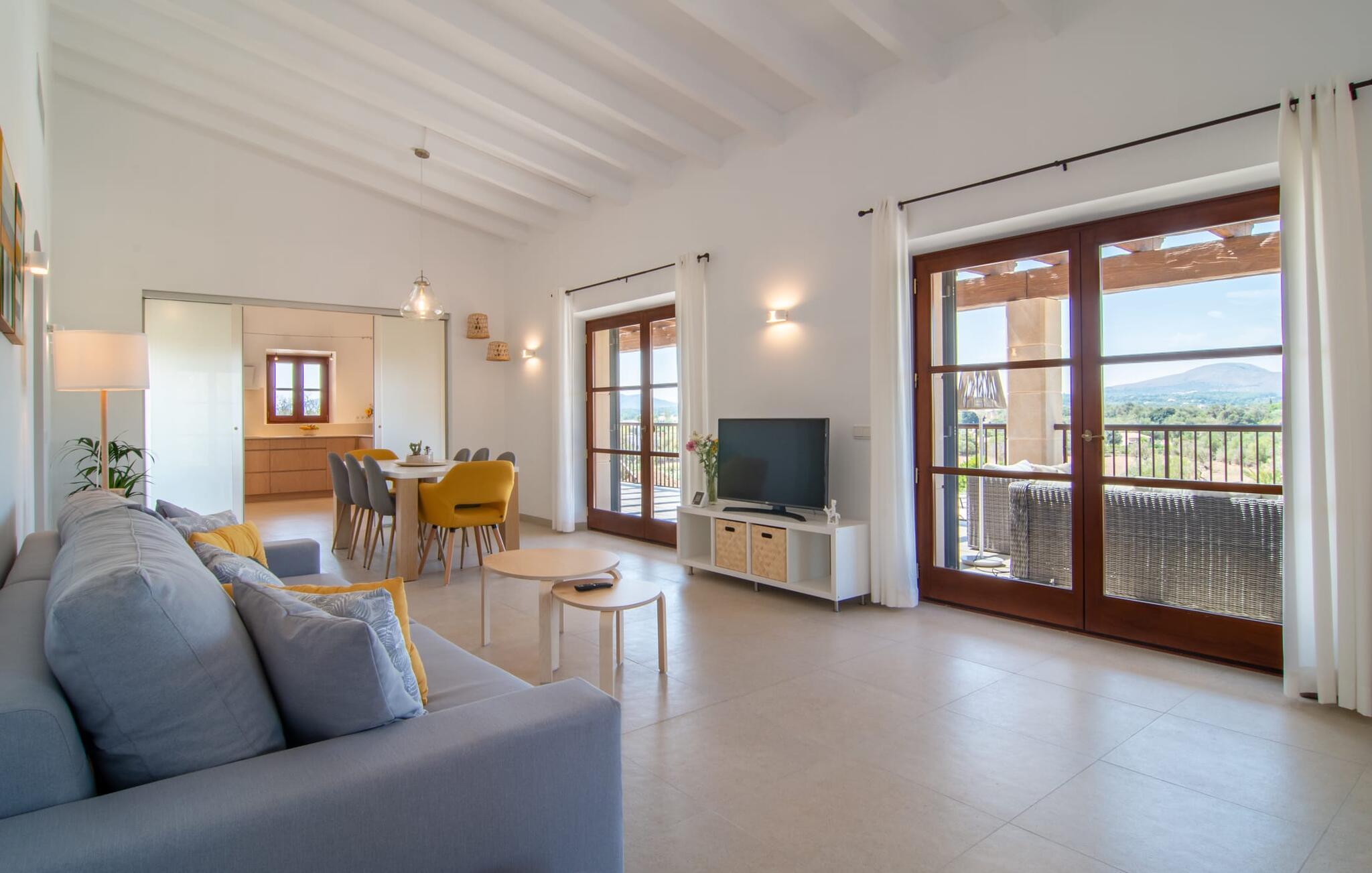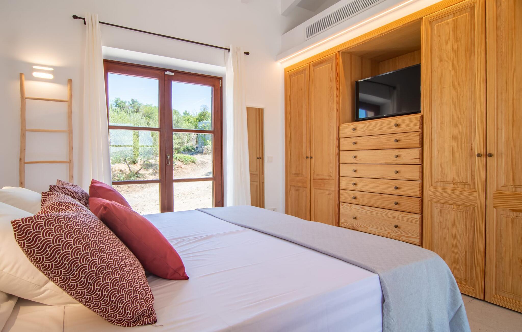 Villaen "Es Pou des Rafal" i den østlige del af Mallorca byder på vidunderlige kontraster: Stueetagen, let hævet naturstensvilla ser rustik ud udefra, men er meget chik og moderne og udstyret med alle de bekvemmeligheder, I kan ønske jer på ferien . Det imponerer med sin smukke landlige beliggenhed uden umiddelbare naboer på en kæmpe ejendom, der inviterer jer til at udforske meget. Lige bag huset, som har en stor, overdækket terrasse med spisebord med tilhørende stole og behagelige udendørs siddepladser, venter poolen på jer og byder på forfriskende kølighed. Efter jeres svømmetur kan I nyde en velfortjent siesta med en lækker drink eller en god bog på en af de komfortable liggestole, hvorfra I kan nyde en fantastisk udsigt over det omkringliggende landskab. Interiøret i jeres sommerhus er muntert og moderne: enkle møbler af høj kvalitet, lyse farver, stilfulde lamper samt trævinduer og dørkarme, der bevarer villaens landlige karakter - en overbevisende kombination! Alle værelser er i ét plan - her finder I ingen trapper. Opholds- og spiseafdelingen strækker sig over et enkelt, stort værelse: Den komfortable sofa med masser af hynder indbyder til hyggelige aftener med at se tv, mens I og jeres medrejsende kan nyde kulinariske delikatesser med et glas eller to vin i den elegante spisning. bord og polstrede designerstole. Det stilfulde køkken er et praktisk sted at tilberede måltider - I behøver ikke at bøje jer for at nå ovnen eller mikrobølgeovnen. Alle tre soveværelser lover søde drømme, alle hyggeligt diskret indrettet, hver med et stort skab, TV og gulv til loft vinduer, der giver en vidunderlig udsigt over naturen omkring huset. Boligkomforten suppleres af to moderne badeværelser, hvoraf det ene er en-suite. Her bor I idyllisk midt ude på landet - så I skal ikke gå glip af lange gåture eller en cykeltur! Dette hjørne af øen imponerer med sin frodige, typiske middelhavsvegetation, oliven-, mandel- og figentræslundene og de enorme gamle rosmarinbuske i siden af vejen. Foretrækker I at køre ind til byen, hvad enten det er til daglige indkøb, for at gå på restaurant eller bare for en hurtig indkøbstur, kan I køre de 1,5 km på landevejen, som afhængig af trafikken kan være hørbar vind ind i smukke by Arta. Smalle gader, masser af interessant arkitektur, kunst og kultur – Artà har bevaret sine traditioner. To forskellige markeder finder sted her hver tirsdag. Men der er heller ikke langt til stranden "Es Pou des Rafal": den fine sandstrand Canyamel, som er omgivet af natur, men som stadig byder på rigtig god infrastruktur, kan nås efter 11,5 km kørsel. Landliv med forbindelse til byen: Dette er den uovertrufne kombination, som naturstensvillaen i stueetagen "Es Pou de Rafal", kun 1,5 km fra Artàs porte, tilbyder. Huset ligger let forhøjet på en kæmpe grund i den østlige del af Mallorca. Der er en pool foran den overdækkede terrasse, som byder på en vidunderlig udsigt over det omkringliggende landskab, men I kan også bruge jeres tid på liggestolene omkring den. Canyamel Strand ligger kun 11,5 km derfra.