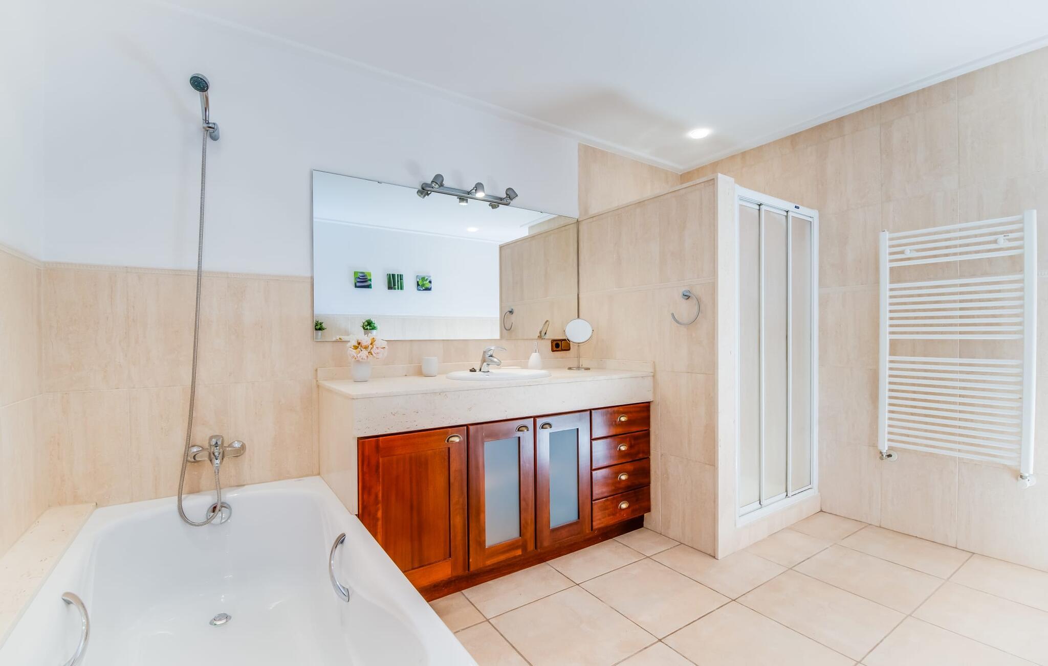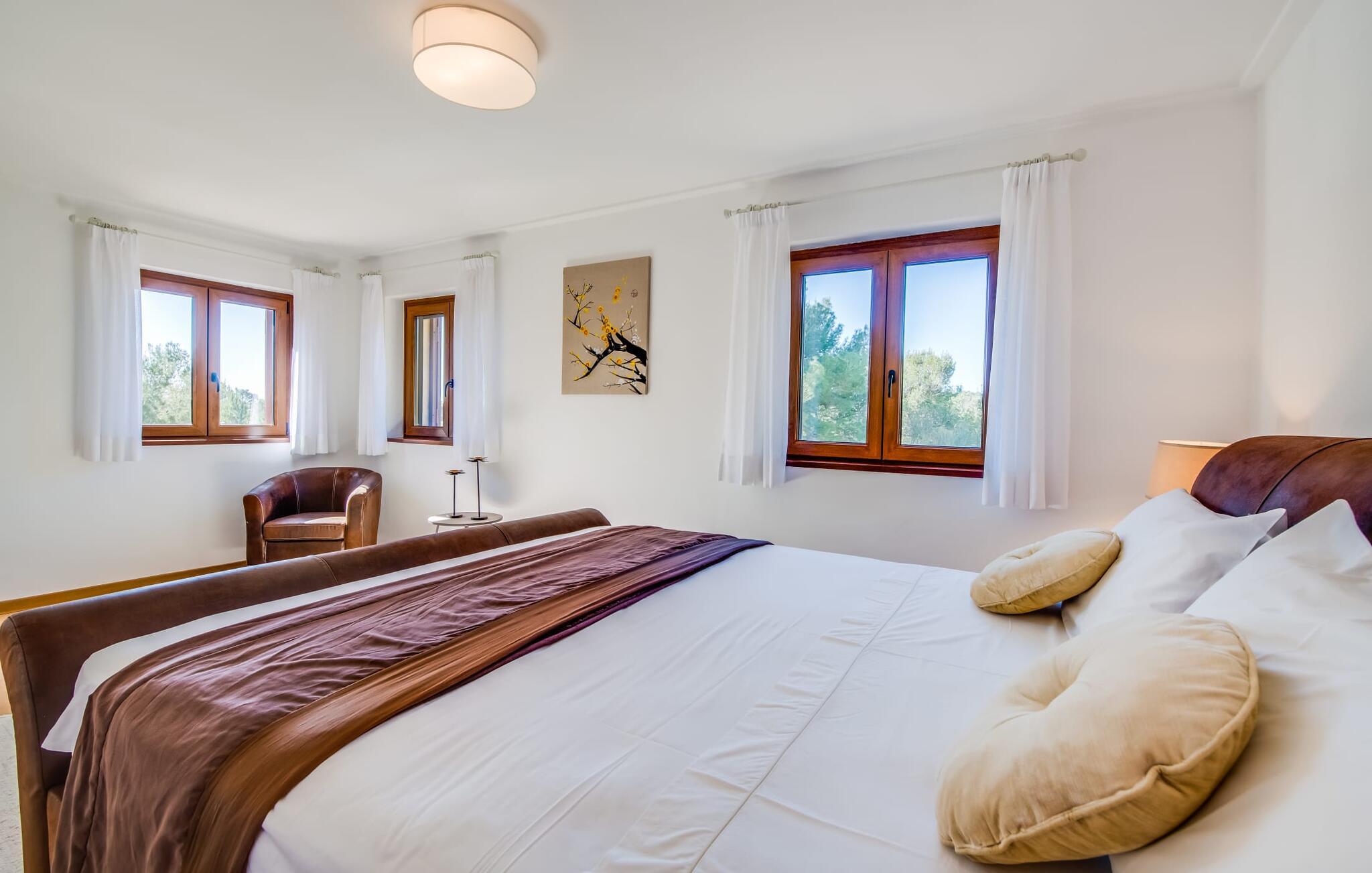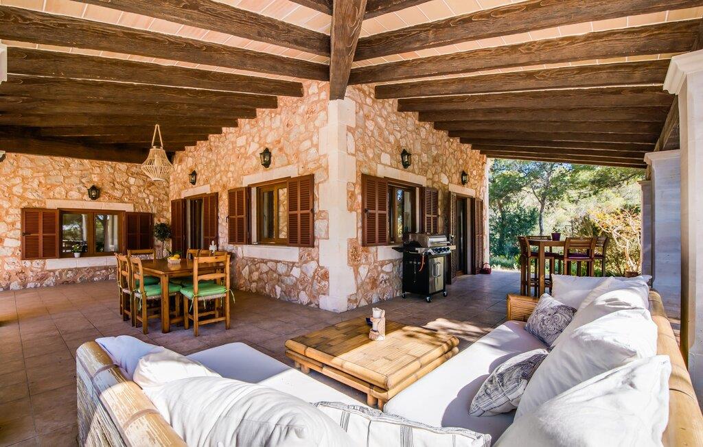 Den stilfulde "Es Puig de Portocolom" lover et roligt tilflugtssted omgivet af natur, der tilbyder fuldstændig privatliv og mulighed for større forsamlinger. Denne vidtstrakte ejendom, beliggende i en frodig fyrreskov, består af flere rummelige villaer, hver med sin egen indgang og parkeringsplads, der tilbyder masser af plads til gæster og udlejningsbiler. Den to-etagers villa har en omsluttende terrasse med komfortable loungeområder, herunder plyspuder, kurvestole og bambus-accenter. Poolområdet, omgivet af rattan-solsenge, tilbyder det perfekte sted at slappe af omgivet af natur. For mere privatliv kan I trække jer tilbage til et roligt hjørne af haven, hvor et gammelt oliventræ giver skygge og fred. Indvendigt har villaen et lyst, skandinavisk-inspireret design med opholdsarealer i åbent plan. I stueetagen er der en rummelig opholdsstue med pejs, fladskærms-tv og spiseplads. Det separate køkken er veludstyret til store grupper, med lange bordplader og nem adgang til terrassen. Et gæstesoveværelse i stueetagen giver ekstra komfort. Ovenpå byder to soveværelser på masser af plads og deler badeværelse, mens det tredje soveværelse har en stor 1,80 cm bred seng og eget badeværelse. Mellem Portocolom på kysten og Felanitx i hjertet af øen tilbyder "Es Puig de Portocolom" afslapning i naturen og det højeste niveau af privatliv. Det er kun 6 km til calas på den sydøstlige kyst, et par minutter i bil til Vall d'Or golfbanen og kun en halv time til Toscana Mallorcas omkring Santanyí. Butikker, caféer og restauranter findes overalt i området. For større indkøbsture kan I tage til Manacor.