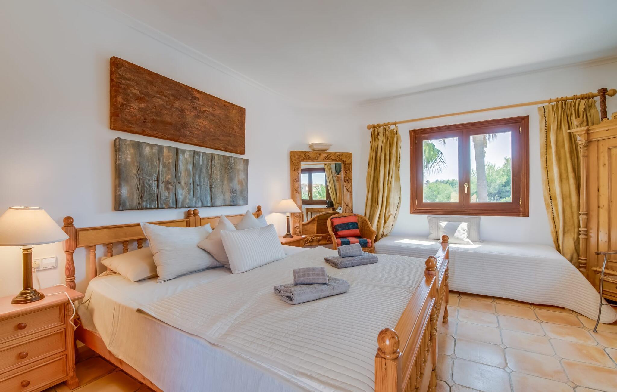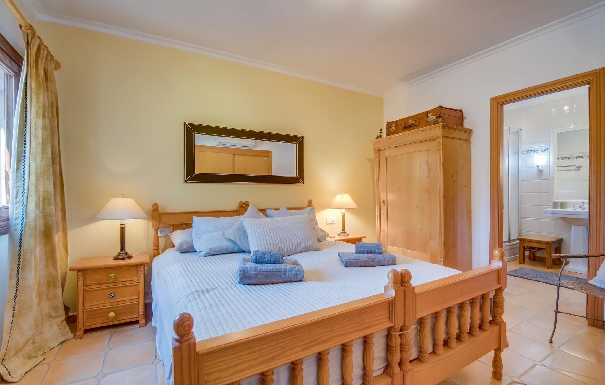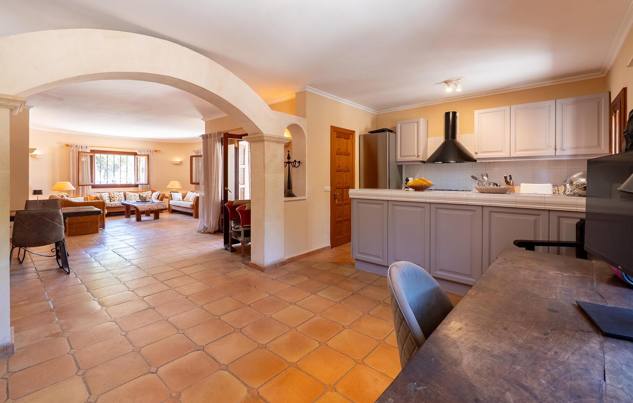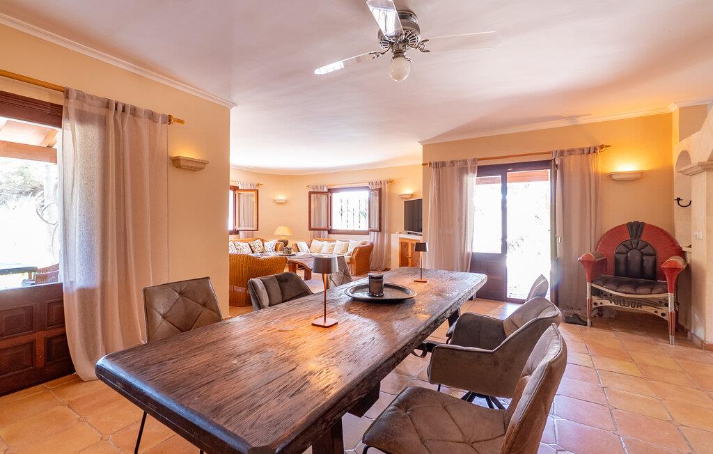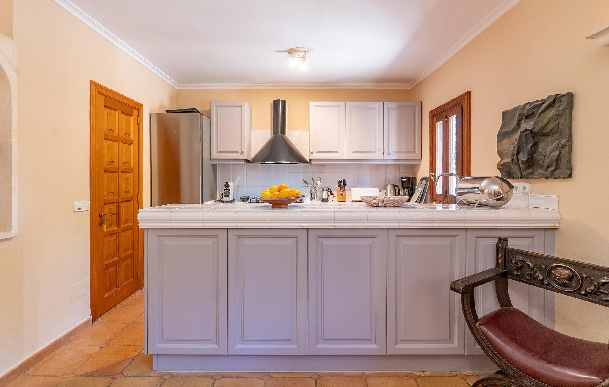 I finder modstykket til dette i den lyse og venligt indrettede indvendige del af villaen, hvor der er tre mere komfortable sæder i rattan-stil i stueetagen til at læse eller slappe af på køligere dage. En smukt buet bue fører til det halvåbne køkken. Et komfur, en ovn, et køleskab, en opvaskemaskine, en brødrister, en kedel og en Nespresso kaffemaskine er til rådighed her til at tilberede lækre måltider og lader intet tilbage at ønske for kræsne villakokke. I stueetagen er der også tre dobbeltværelser med aircondition (to med eget badeværelse), som har samme farveskema og udsøgte møbler som stue/spisestue. I et ekstra badeværelse inviterer et yndefuldt, fritstående badekar jer til at tage et beroligende badekar med levende lys om aftenen. På øverste etage, som kan nås via en udvendig trappe, er der yderligere et soveværelse med dobbeltseng med eget badeværelse. Terrassen heroppe byder på panoramaudsigt over det smukke landskab. Beliggende i den sydligste region af øen, Migjorn, er dette feriehus en ideel base for en række forskellige ø-udforskninger og udflugter. MA-4013-vejen, som ikke er langt væk, forbinder nærliggende Calonge (1,7 km) med kystbyen Cala d'Or (3,1 km). I kan gøre jeres daglige indkøb i begge byer. Der er et traditionelt lille ugentligt marked i Calonge om torsdagen, hvor I kan forsyne jer med frisk frugt og grøntsager. Cala d'Or tiltrækker også villabesøgende med sin elegante lystbådehavn, livlige natteliv, mange gode restauranter og smarte barer. Inden for en kort køretur kan I nå en række små, men smukke sandbugter med turkisblåt vand langs sydøstkysten. Selv i højsæsonen er det normalt muligt at finde et mere afsondret sted her. Bugterne i naturreservatet Mondragó er særligt imponerende. Den smukke, kilometerlange strand "Es Trenc" ligger også kun en halv time væk. Leder I efter den smukkeste villa og strandferie? Så er villaen "Es Rafal Calonge" det rigtige sted for jer! Villaen “Es Rafal Calonge”, bygget i hvid Ibiza-stil, ligger i en smuk landlig beliggenhed mellem landsbyen Calonge og kystbyen Cala d'Or på Mallorcas sydøstkyst. Villaen af høj kvalitet er omgivet af en smuk palmehave. For shopping kan I gå til nærliggende Calonge eller Cala d'Or. Flere smukke bugter på sydøstkysten kan nås hurtigt med lejebil inden for et kvarter.