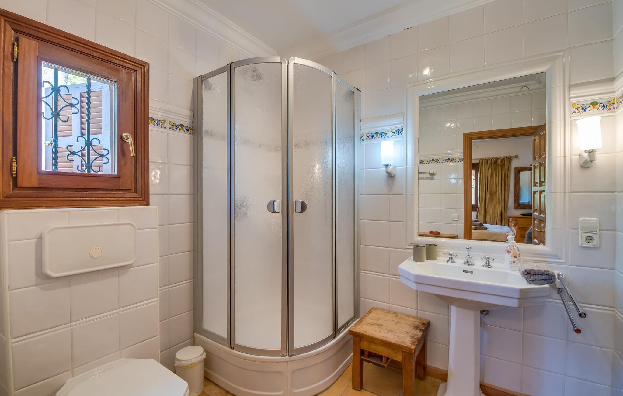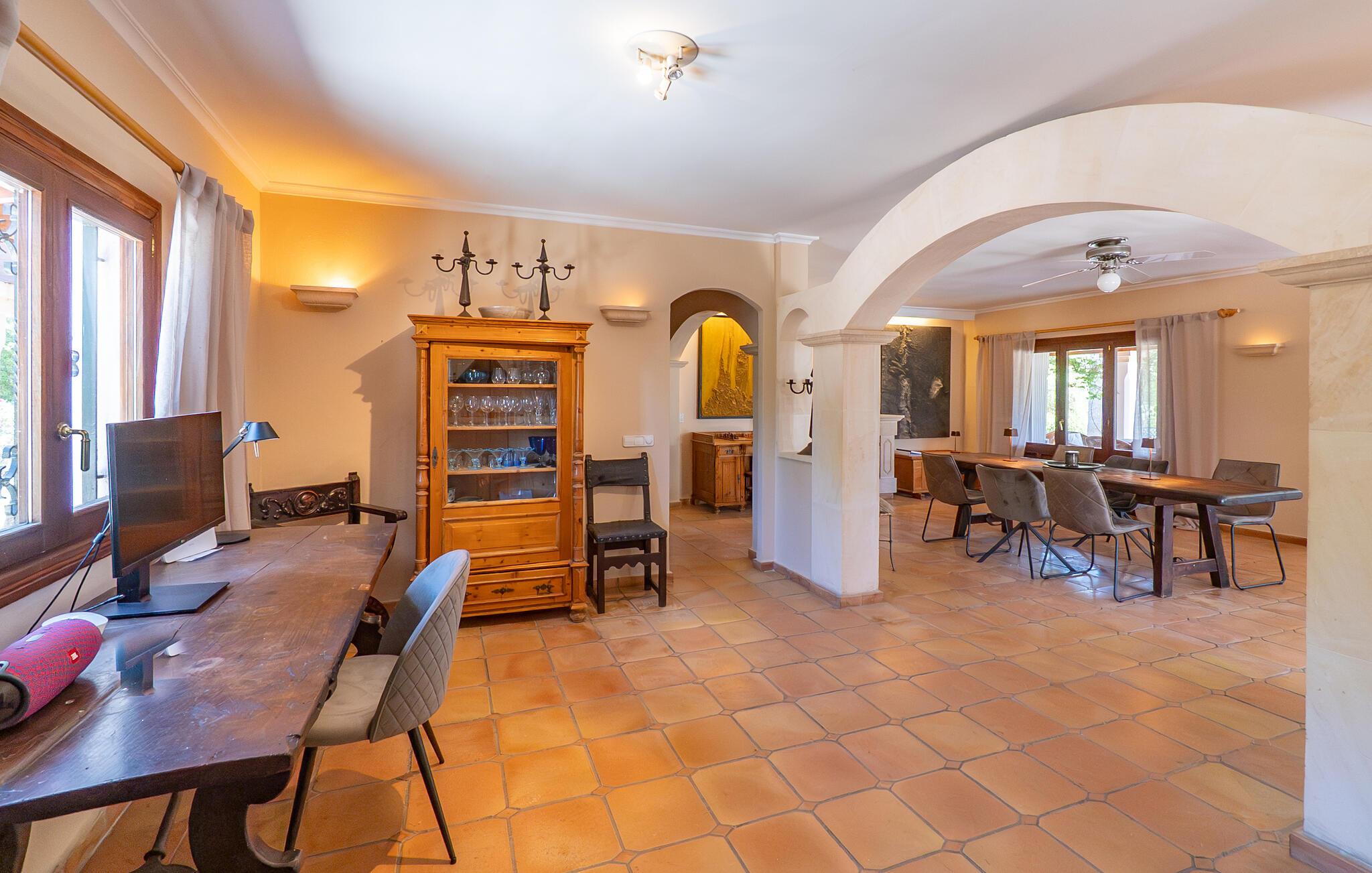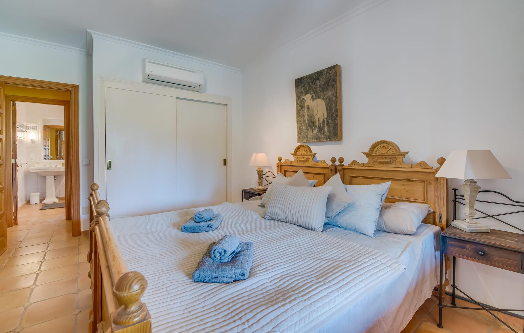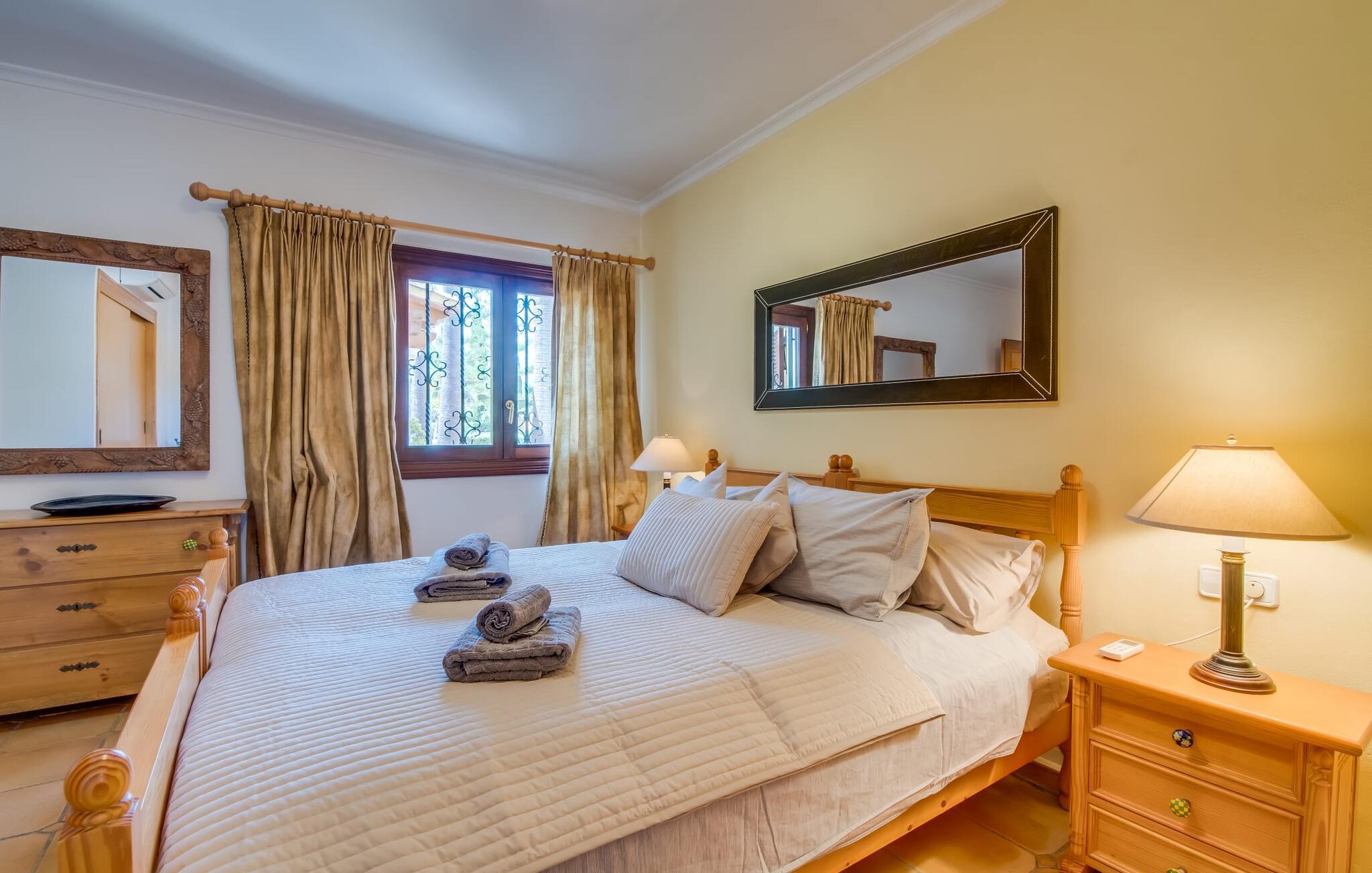 I finder modstykket til dette i den lyse og venligt indrettede indvendige del af villaen, hvor der er tre mere komfortable sæder i rattan-stil i stueetagen til at læse eller slappe af på køligere dage. En smukt buet bue fører til det halvåbne køkken. Et komfur, en ovn, et køleskab, en opvaskemaskine, en brødrister, en kedel og en Nespresso kaffemaskine er til rådighed her til at tilberede lækre måltider og lader intet tilbage at ønske for kræsne villakokke. I stueetagen er der også tre dobbeltværelser med aircondition (to med eget badeværelse), som har samme farveskema og udsøgte møbler som stue/spisestue. I et ekstra badeværelse inviterer et yndefuldt, fritstående badekar jer til at tage et beroligende badekar med levende lys om aftenen. På øverste etage, som kan nås via en udvendig trappe, er der yderligere et soveværelse med dobbeltseng med eget badeværelse. Terrassen heroppe byder på panoramaudsigt over det smukke landskab. Beliggende i den sydligste region af øen, Migjorn, er dette feriehus en ideel base for en række forskellige ø-udforskninger og udflugter. MA-4013-vejen, som ikke er langt væk, forbinder nærliggende Calonge (1,7 km) med kystbyen Cala d'Or (3,1 km). I kan gøre jeres daglige indkøb i begge byer. Der er et traditionelt lille ugentligt marked i Calonge om torsdagen, hvor I kan forsyne jer med frisk frugt og grøntsager. Cala d'Or tiltrækker også villabesøgende med sin elegante lystbådehavn, livlige natteliv, mange gode restauranter og smarte barer. Inden for en kort køretur kan I nå en række små, men smukke sandbugter med turkisblåt vand langs sydøstkysten. Selv i højsæsonen er det normalt muligt at finde et mere afsondret sted her. Bugterne i naturreservatet Mondragó er særligt imponerende. Den smukke, kilometerlange strand "Es Trenc" ligger også kun en halv time væk. Leder I efter den smukkeste villa og strandferie? Så er villaen "Es Rafal Calonge" det rigtige sted for jer! Villaen “Es Rafal Calonge”, bygget i hvid Ibiza-stil, ligger i en smuk landlig beliggenhed mellem landsbyen Calonge og kystbyen Cala d'Or på Mallorcas sydøstkyst. Villaen af høj kvalitet er omgivet af en smuk palmehave. For shopping kan I gå til nærliggende Calonge eller Cala d'Or. Flere smukke bugter på sydøstkysten kan nås hurtigt med lejebil inden for et kvarter.