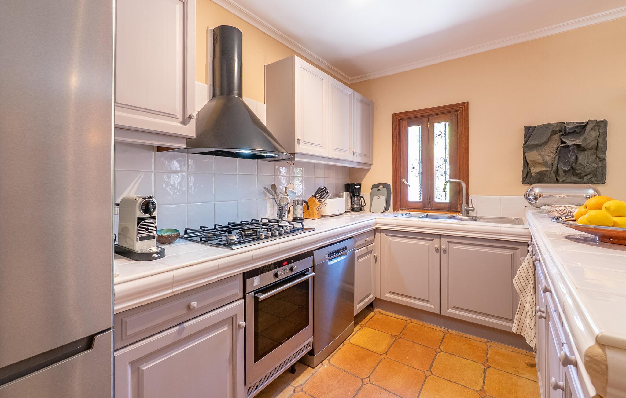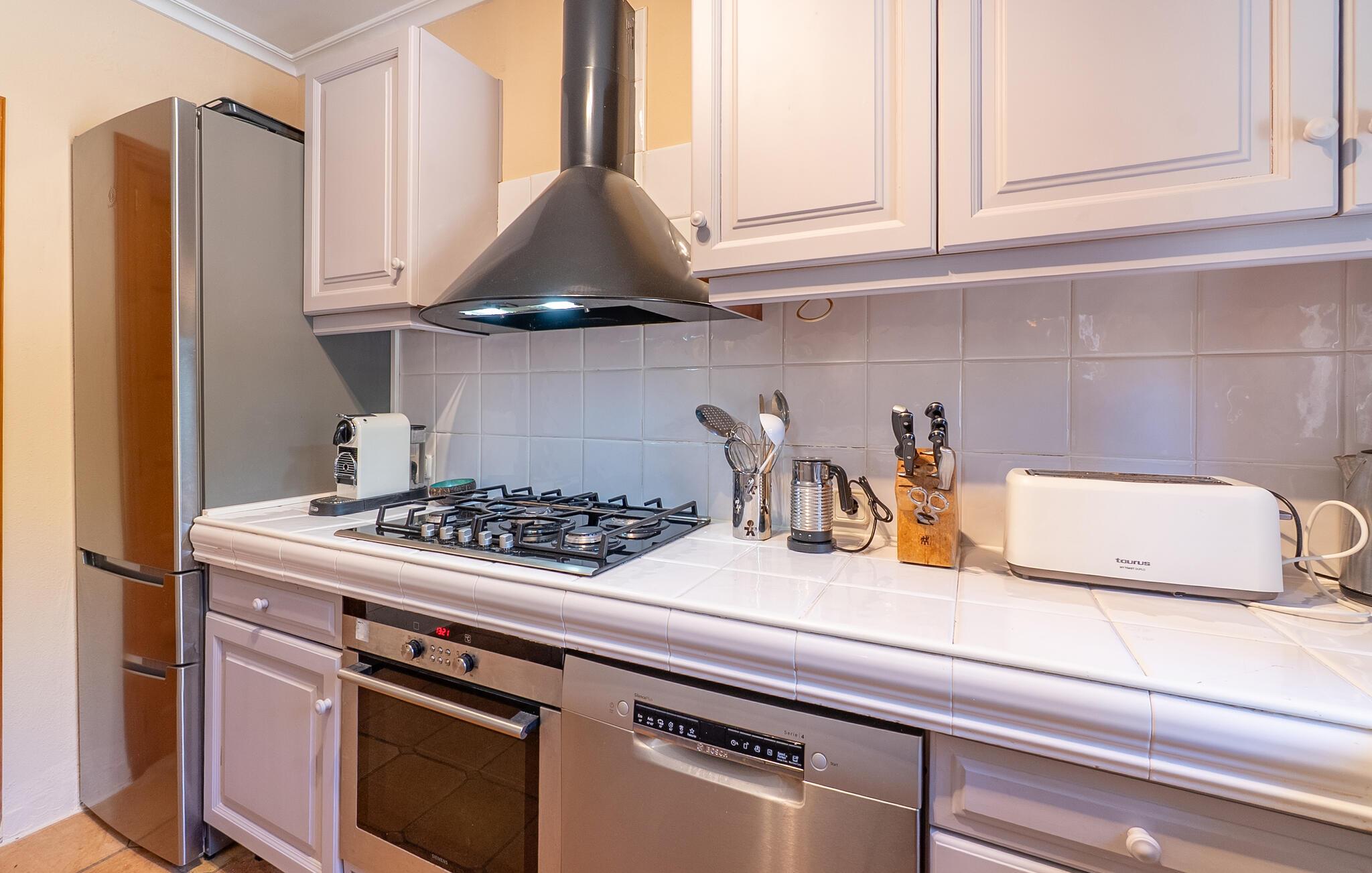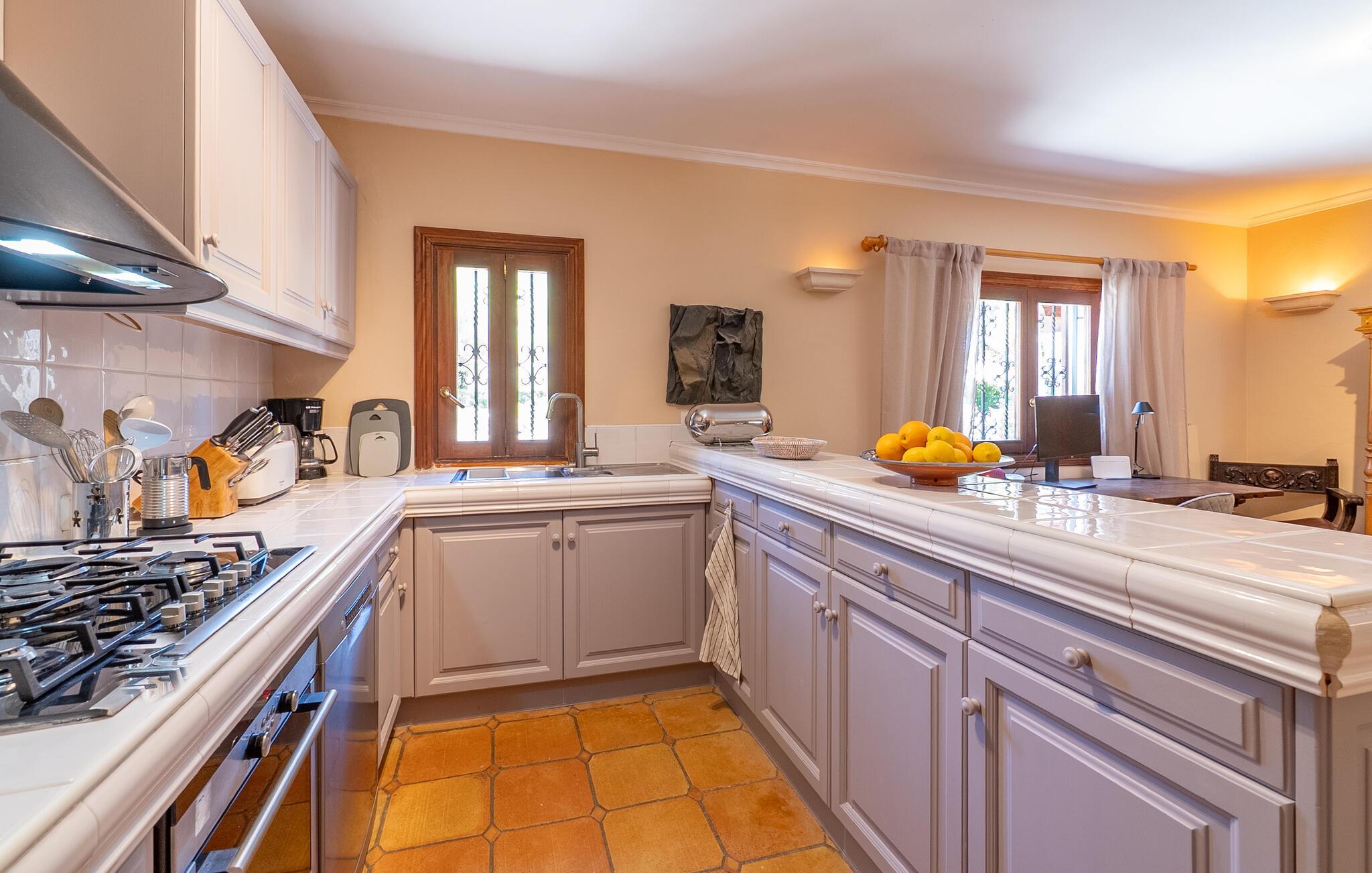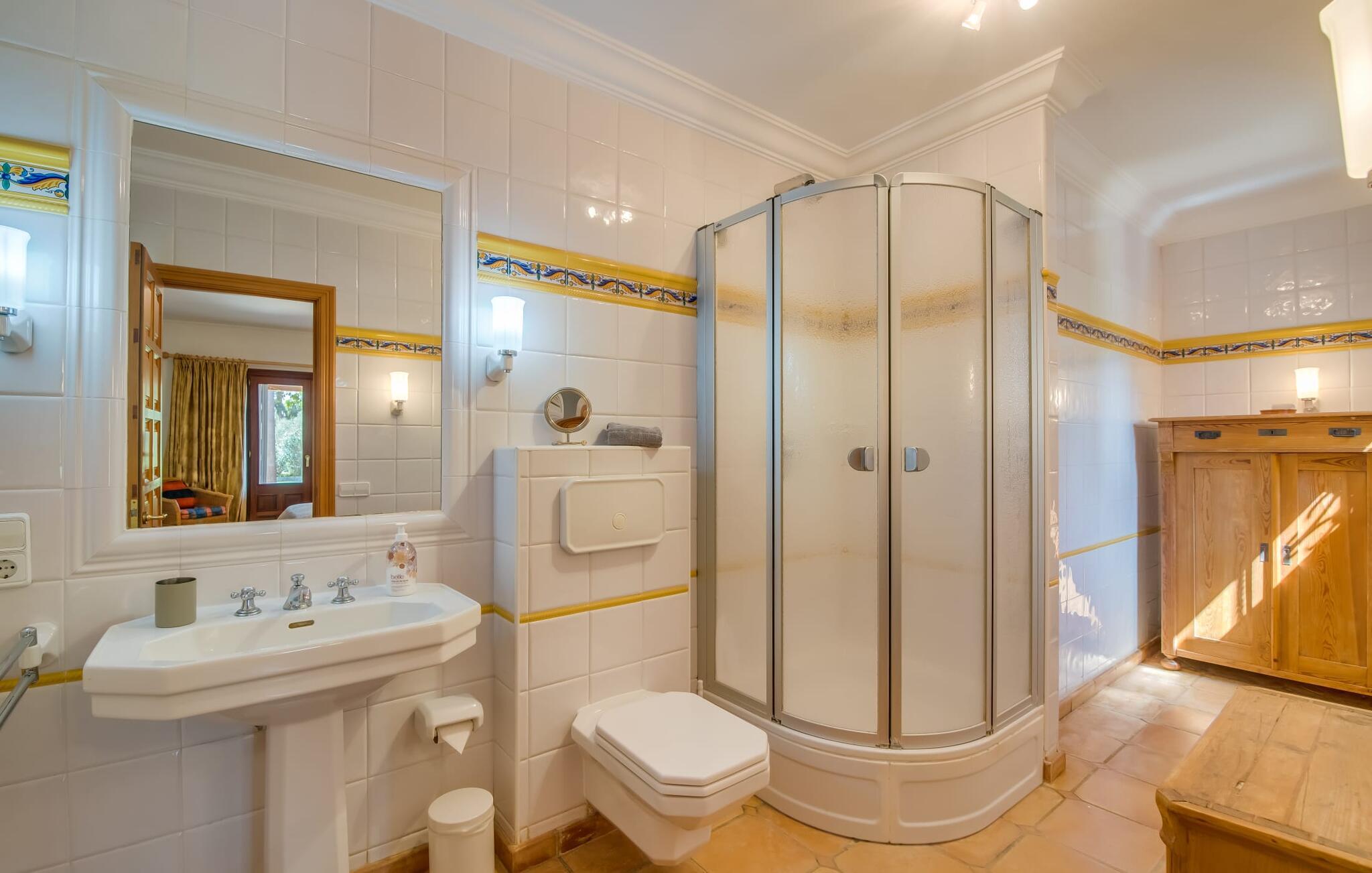 I finder modstykket til dette i den lyse og venligt indrettede indvendige del af villaen, hvor der er tre mere komfortable sæder i rattan-stil i stueetagen til at læse eller slappe af på køligere dage. En smukt buet bue fører til det halvåbne køkken. Et komfur, en ovn, et køleskab, en opvaskemaskine, en brødrister, en kedel og en Nespresso kaffemaskine er til rådighed her til at tilberede lækre måltider og lader intet tilbage at ønske for kræsne villakokke. I stueetagen er der også tre dobbeltværelser med aircondition (to med eget badeværelse), som har samme farveskema og udsøgte møbler som stue/spisestue. I et ekstra badeværelse inviterer et yndefuldt, fritstående badekar jer til at tage et beroligende badekar med levende lys om aftenen. På øverste etage, som kan nås via en udvendig trappe, er der yderligere et soveværelse med dobbeltseng med eget badeværelse. Terrassen heroppe byder på panoramaudsigt over det smukke landskab. Beliggende i den sydligste region af øen, Migjorn, er dette feriehus en ideel base for en række forskellige ø-udforskninger og udflugter. MA-4013-vejen, som ikke er langt væk, forbinder nærliggende Calonge (1,7 km) med kystbyen Cala d'Or (3,1 km). I kan gøre jeres daglige indkøb i begge byer. Der er et traditionelt lille ugentligt marked i Calonge om torsdagen, hvor I kan forsyne jer med frisk frugt og grøntsager. Cala d'Or tiltrækker også villabesøgende med sin elegante lystbådehavn, livlige natteliv, mange gode restauranter og smarte barer. Inden for en kort køretur kan I nå en række små, men smukke sandbugter med turkisblåt vand langs sydøstkysten. Selv i højsæsonen er det normalt muligt at finde et mere afsondret sted her. Bugterne i naturreservatet Mondragó er særligt imponerende. Den smukke, kilometerlange strand "Es Trenc" ligger også kun en halv time væk. Leder I efter den smukkeste villa og strandferie? Så er villaen "Es Rafal Calonge" det rigtige sted for jer! Villaen “Es Rafal Calonge”, bygget i hvid Ibiza-stil, ligger i en smuk landlig beliggenhed mellem landsbyen Calonge og kystbyen Cala d'Or på Mallorcas sydøstkyst. Villaen af høj kvalitet er omgivet af en smuk palmehave. For shopping kan I gå til nærliggende Calonge eller Cala d'Or. Flere smukke bugter på sydøstkysten kan nås hurtigt med lejebil inden for et kvarter.