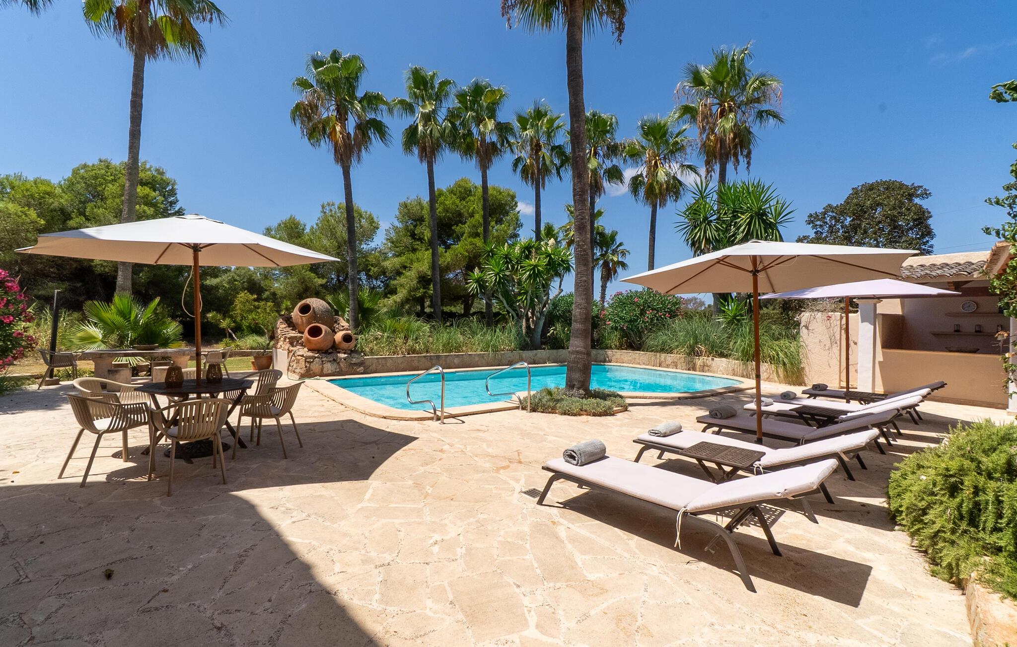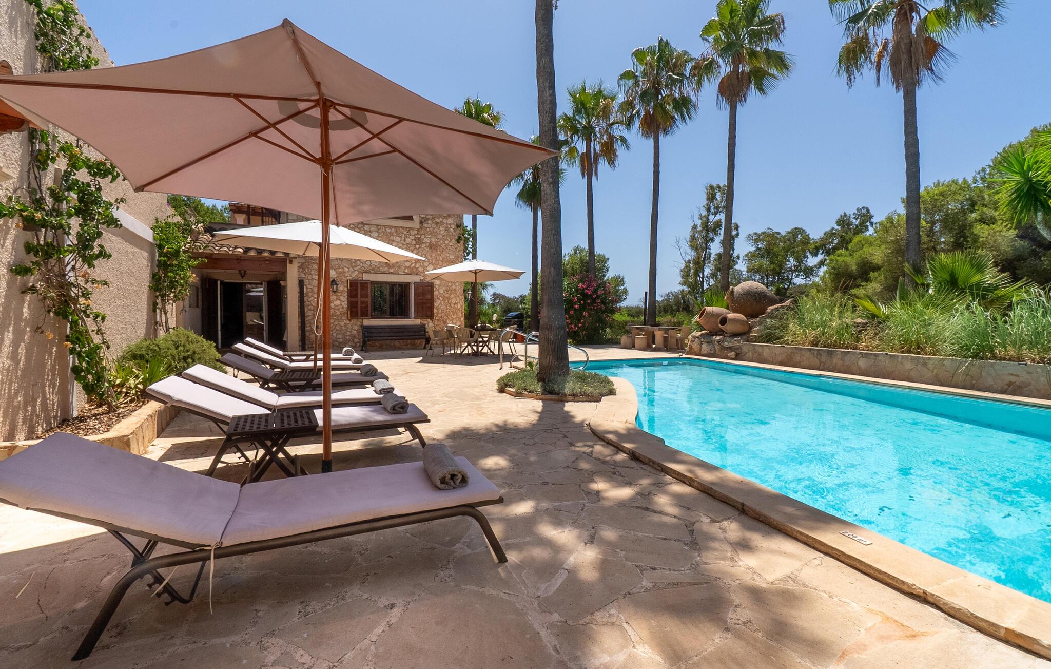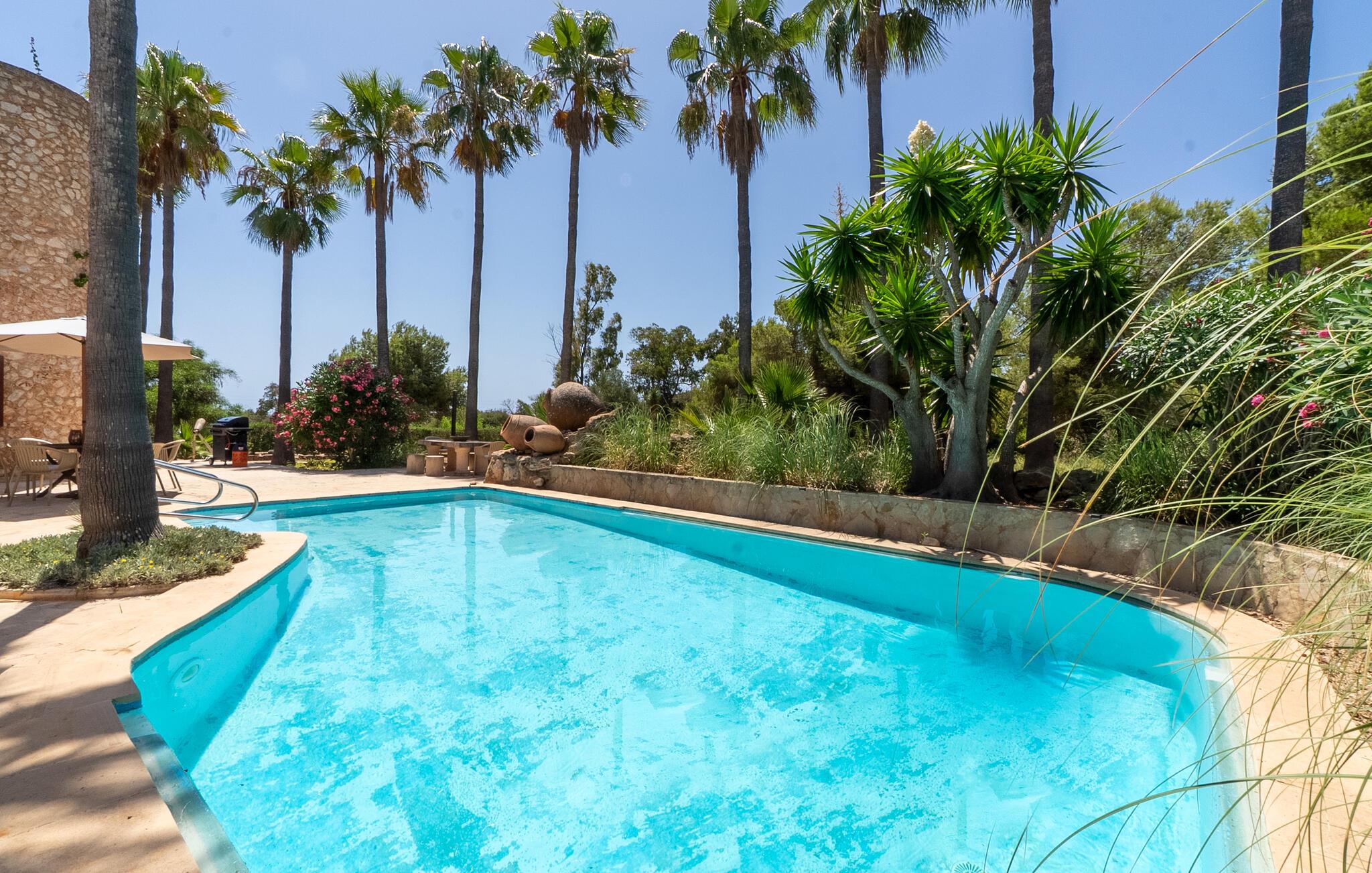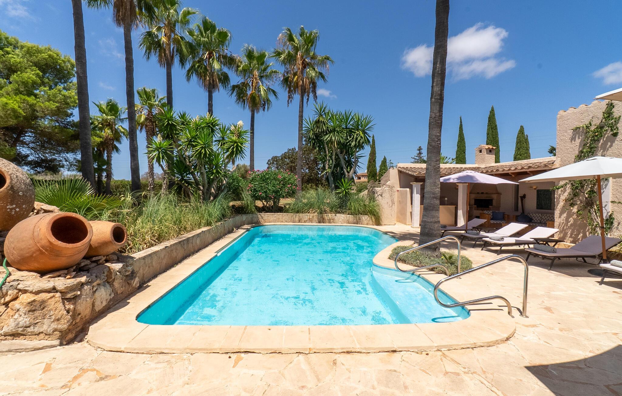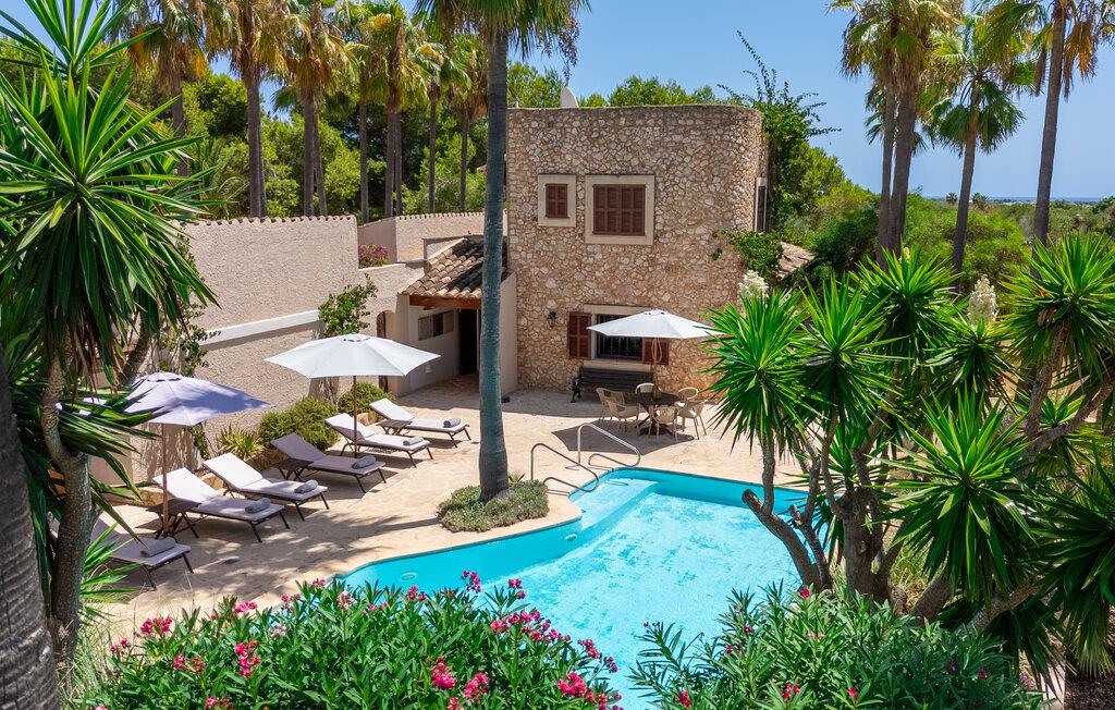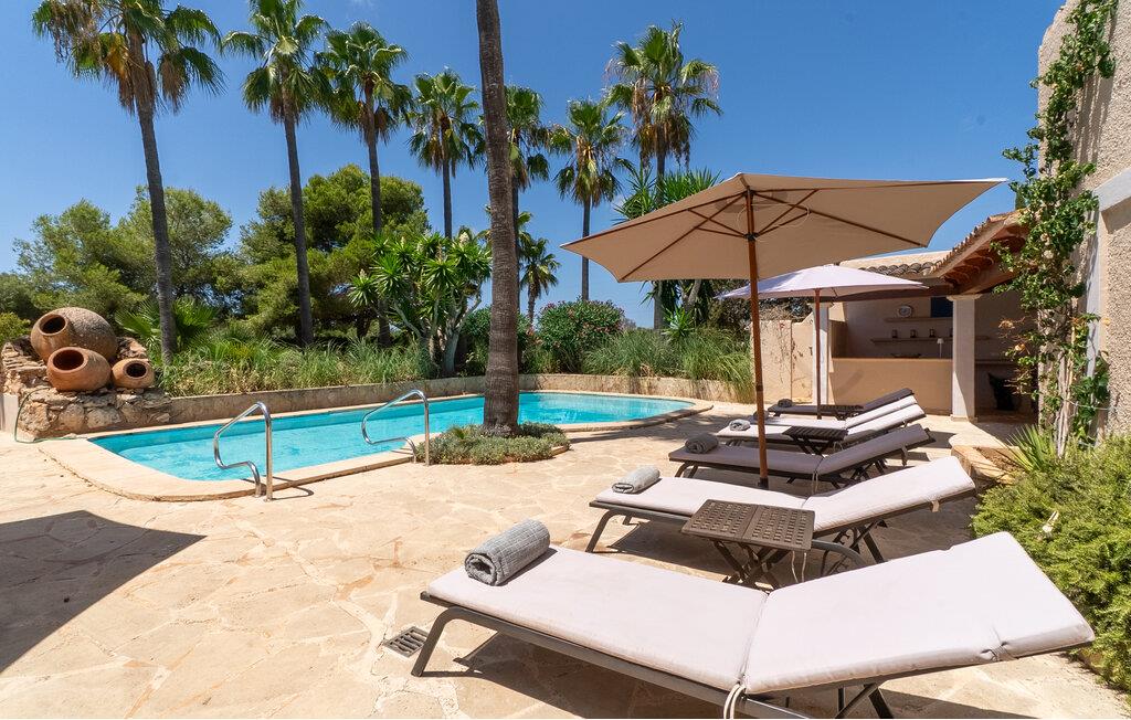Leder I efter den smukkeste villa og strandferie? Så er I kommet til det rigtige sted i den storslåede villa “Es Rafal Calonge”! Omgivet af en paradisisk palmehave og med Mallorcas sydøstkyst, hvor den ene maleriske bugt følger den næste, lige uden for døren, tilbyder denne ejendom den idelle beliggenhed for et fuldstændig vellykket ophold på øen. Efter blot 45 minutters kørsel fra lufthavnen nær øens hovedstad Palma, byder stenbrudsvillaen jer velkommen i en rummelig Edens have. Her bliver jeres drømmeferie under palmerne til virkelighed, for området, dekoreret med en række middelhavsplanter, er bogstaveligt talt indrammet af talrige meterhøje palmer. Nedenfor inviterer en skrånende pool med en bred, komfortabel trinindgang jer til at tage en forfriskende svømmetur. Bagefter kan I slappe af på komfortable liggestole under den ekstra skygge af de store parasoller. Et overdækket siddeområde i rattan med super komfortable hynder er det ideelle sted at slappe af eller nyde en ferielæsning.