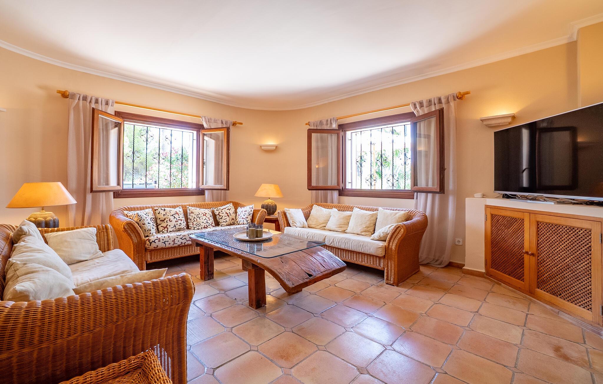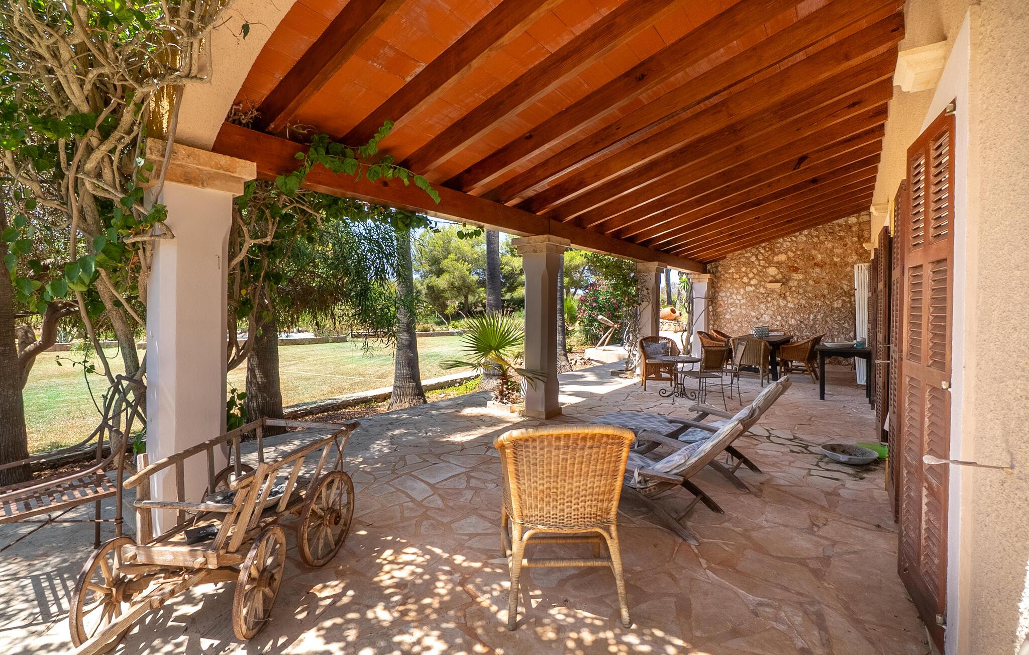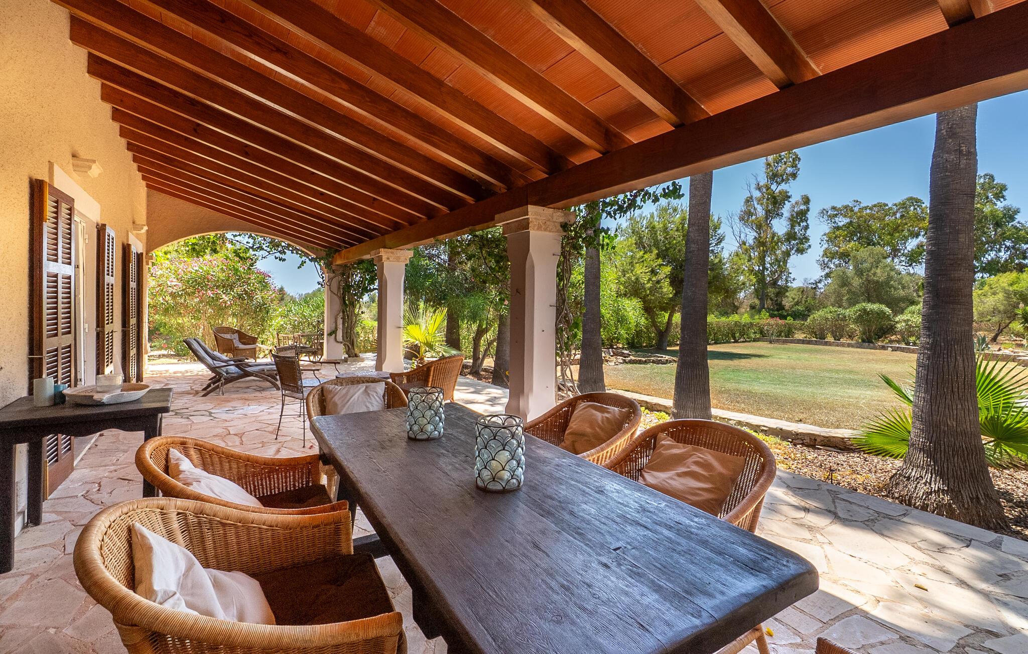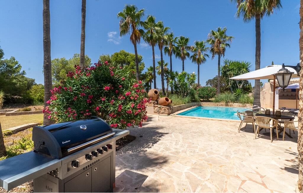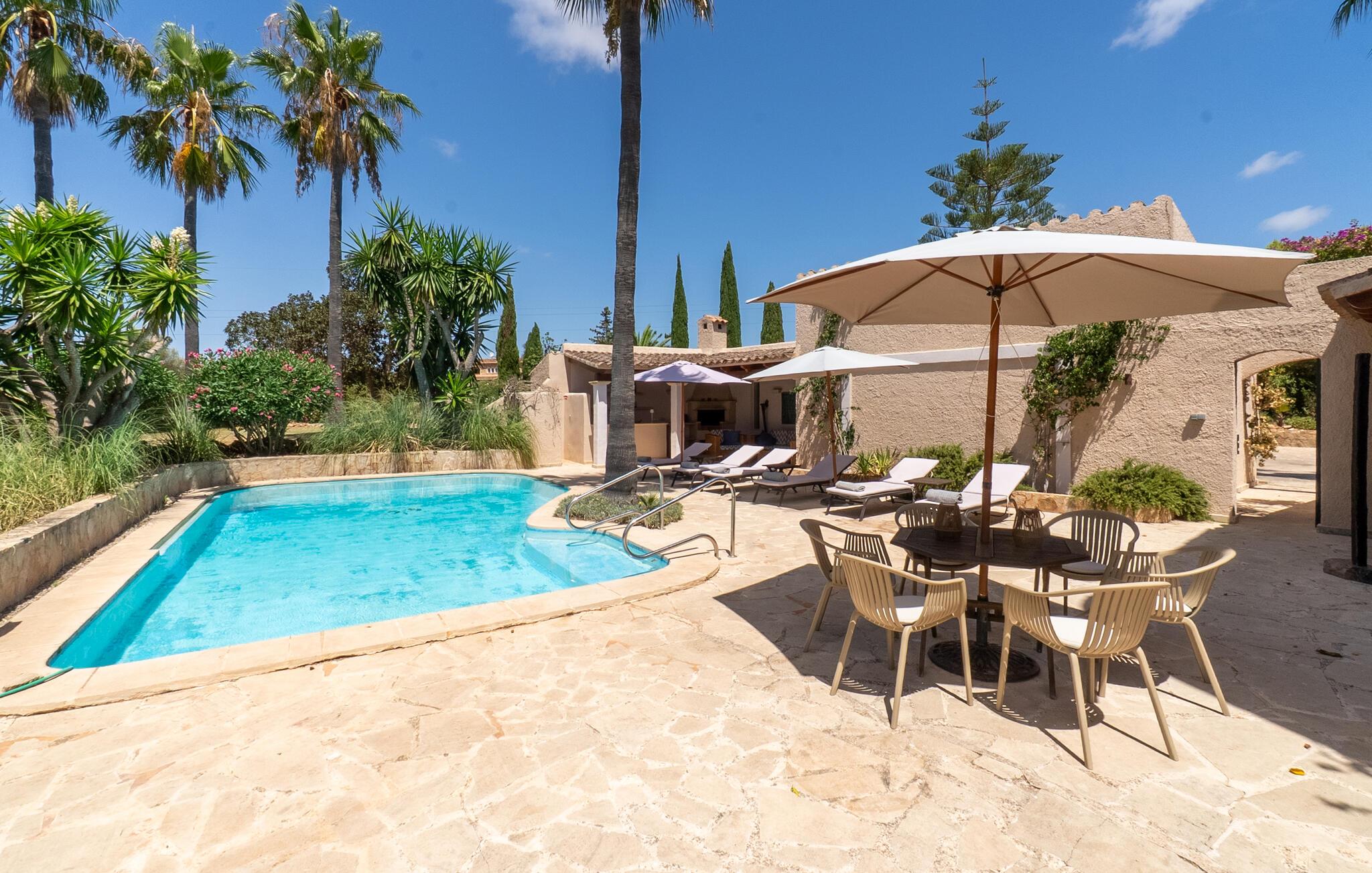 Leder I efter den smukkeste villa og strandferie? Så er I kommet til det rigtige sted i den storslåede villa “Es Rafal Calonge”! Omgivet af en paradisisk palmehave og med Mallorcas sydøstkyst, hvor den ene maleriske bugt følger den næste, lige uden for døren, tilbyder denne ejendom den idelle beliggenhed for et fuldstændig vellykket ophold på øen. Efter blot 45 minutters kørsel fra lufthavnen nær øens hovedstad Palma, byder stenbrudsvillaen jer velkommen i en rummelig Edens have. Her bliver jeres drømmeferie under palmerne til virkelighed, for området, dekoreret med en række middelhavsplanter, er bogstaveligt talt indrammet af talrige meterhøje palmer. Nedenfor inviterer en skrånende pool med en bred, komfortabel trinindgang jer til at tage en forfriskende svømmetur. Bagefter kan I slappe af på komfortable liggestole under den ekstra skygge af de store parasoller. Et overdækket siddeområde i rattan med super komfortable hynder er det ideelle sted at slappe af eller nyde en ferielæsning.