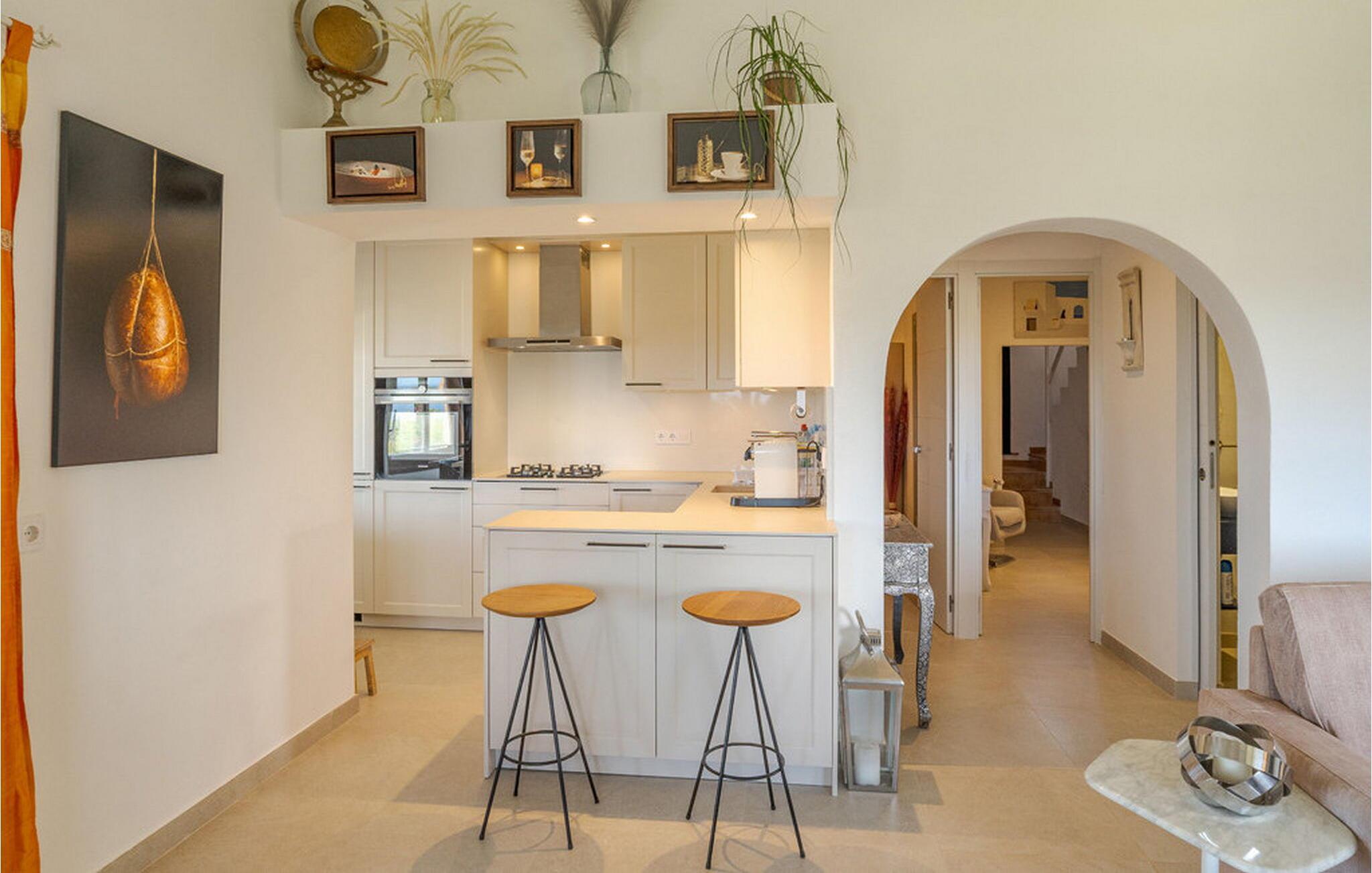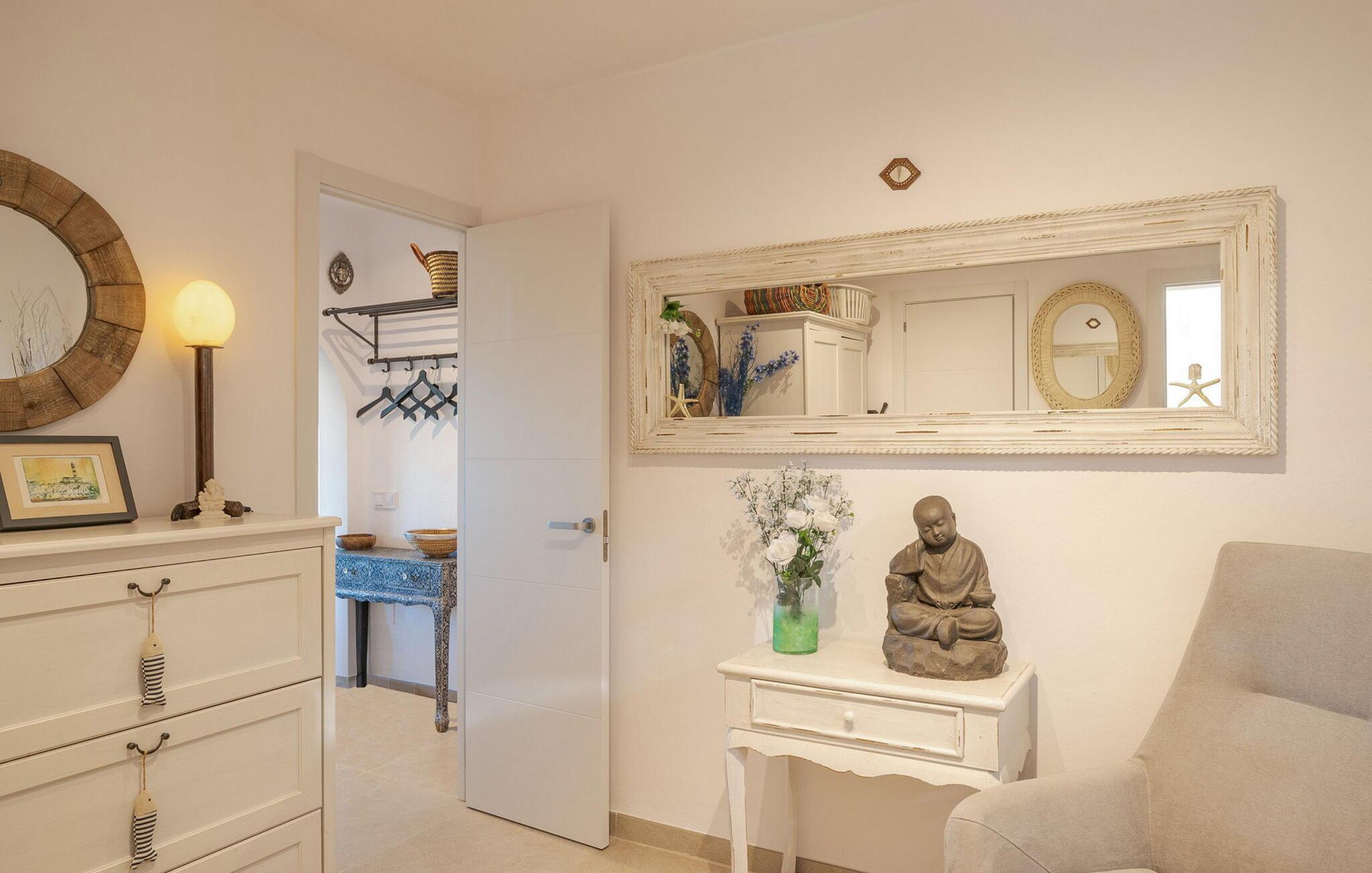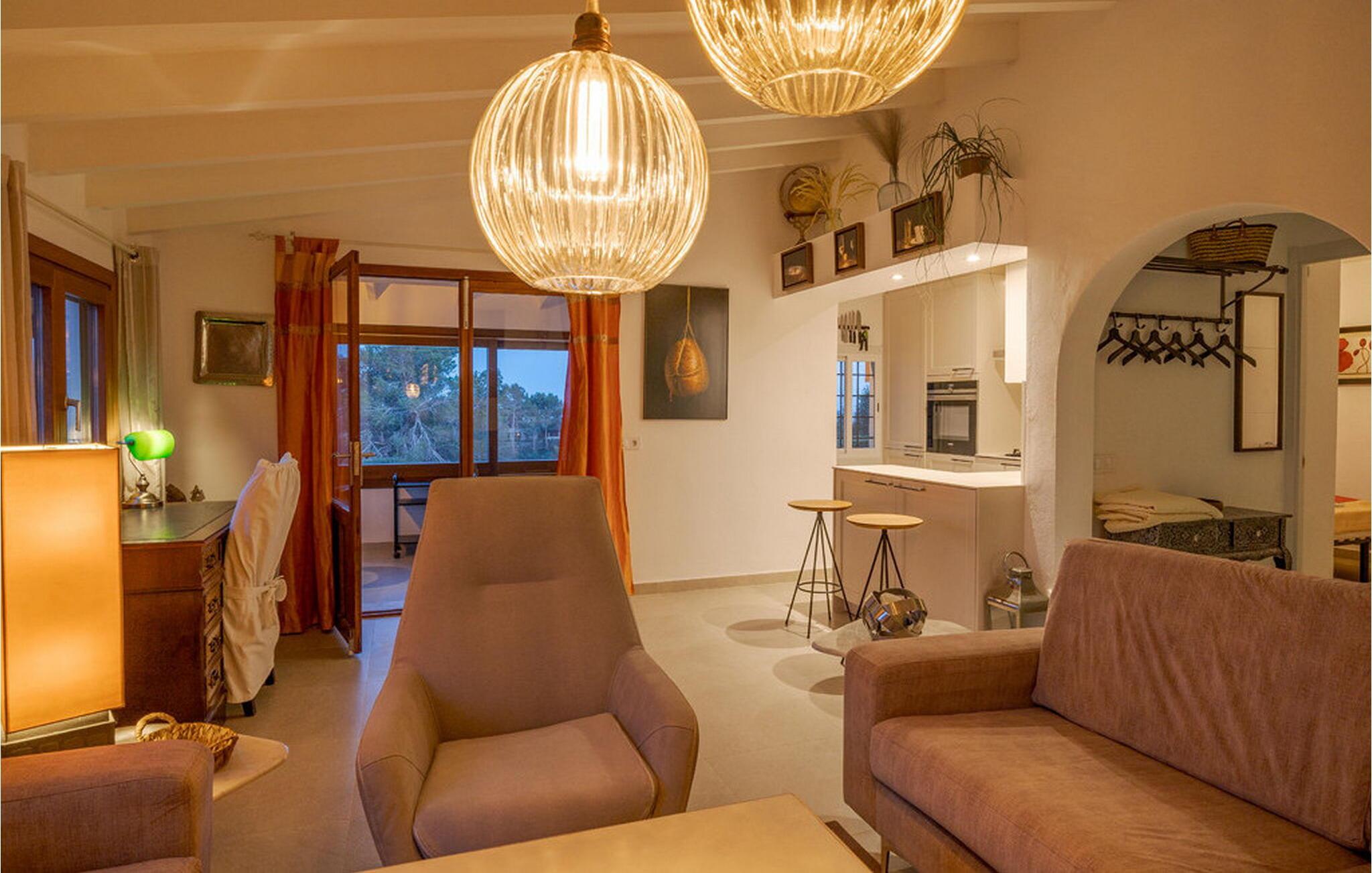 Når I træder ind i "Es Socorrat", vil I blive mødt af en varm og indbydende atmosfære. jeres hjem byder på en blanding af moderne møbler og charmerende landlige detaljer. Hvide vægge, klinkegulve og lyse loftsbjælker skaber en behagelig opholdsatmosfære. Store vinduer fylder rummet med lys og tilbyder en betagende udsigt. Indretningen omfatter en spiseplads med fantastisk havudsigt, en separat spisestue og en hyggelig stue. Det åbne køkken er udstyret med alle nødvendige faciliteter til at tilberede lækre måltider. Ejendommen har tre smukt møblerede soveværelser og to moderne badeværelser, hvilket sikrer et behageligt ophold.