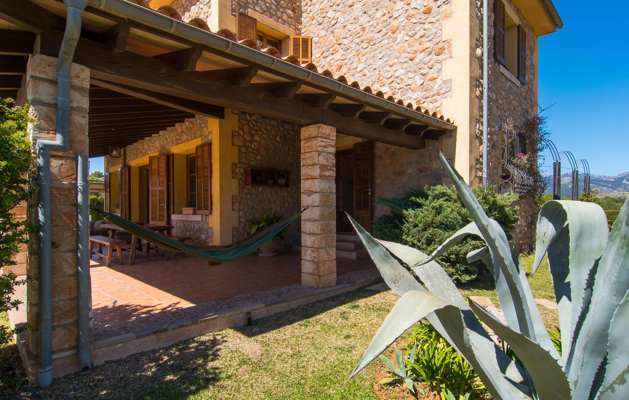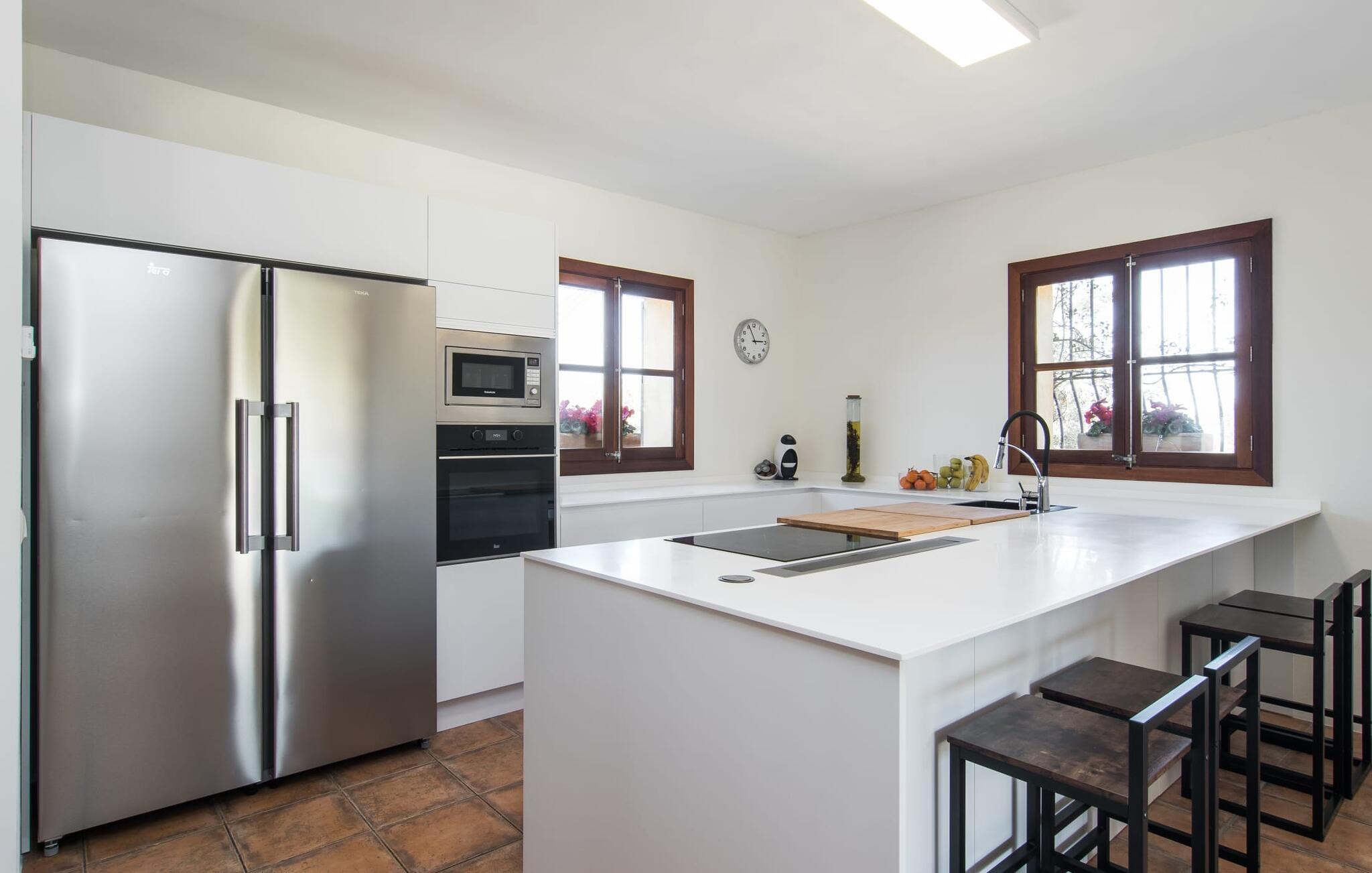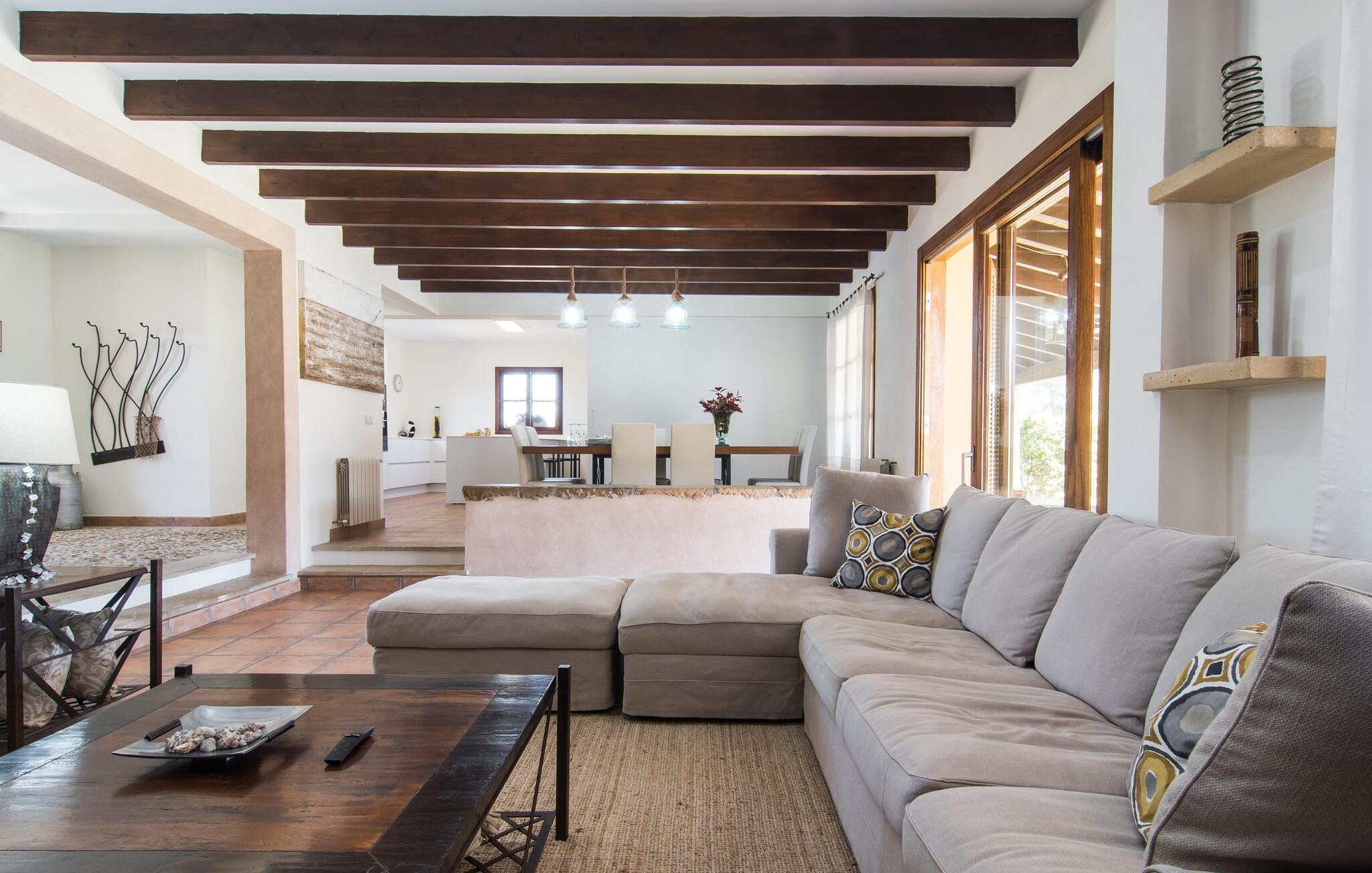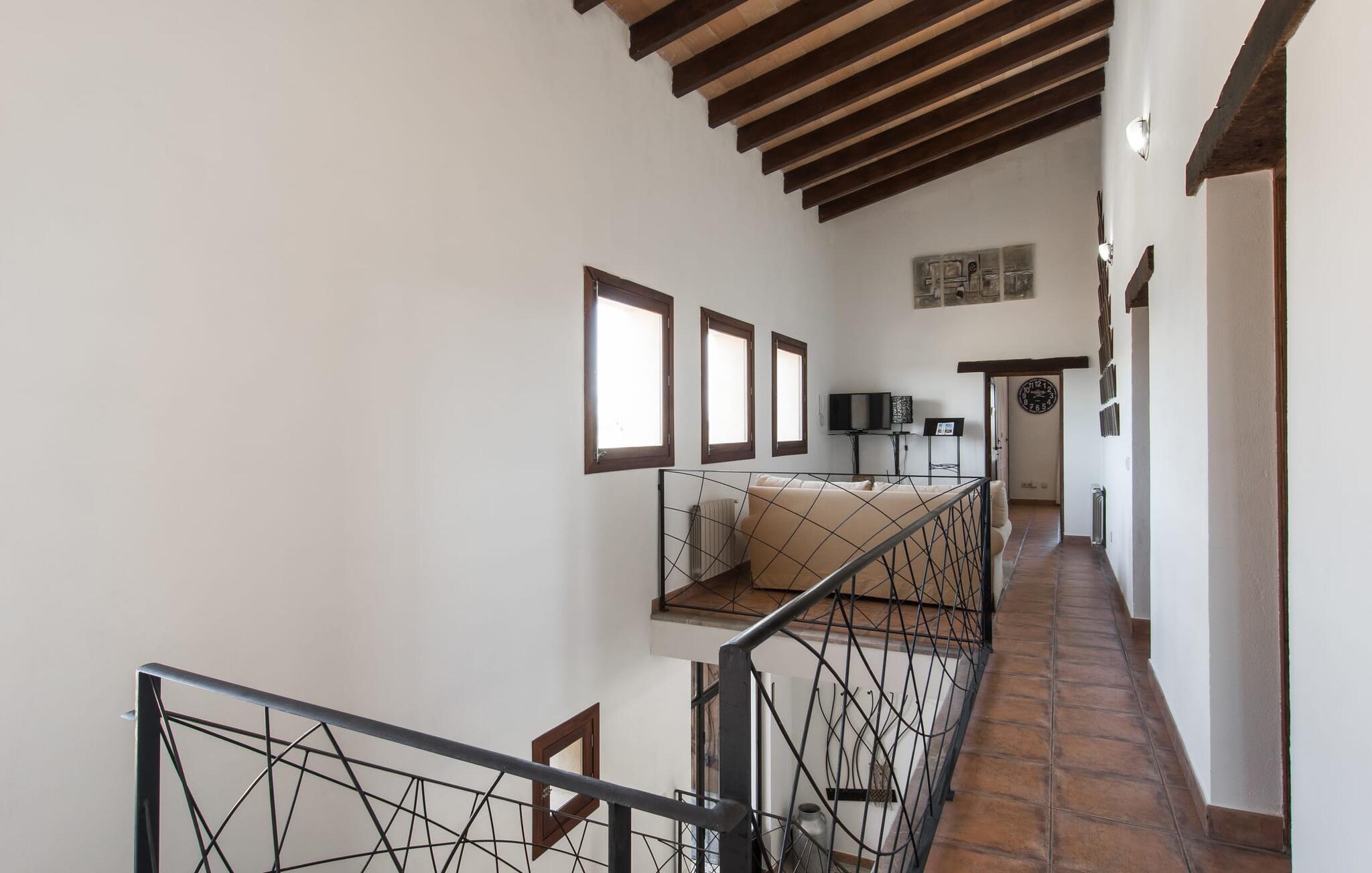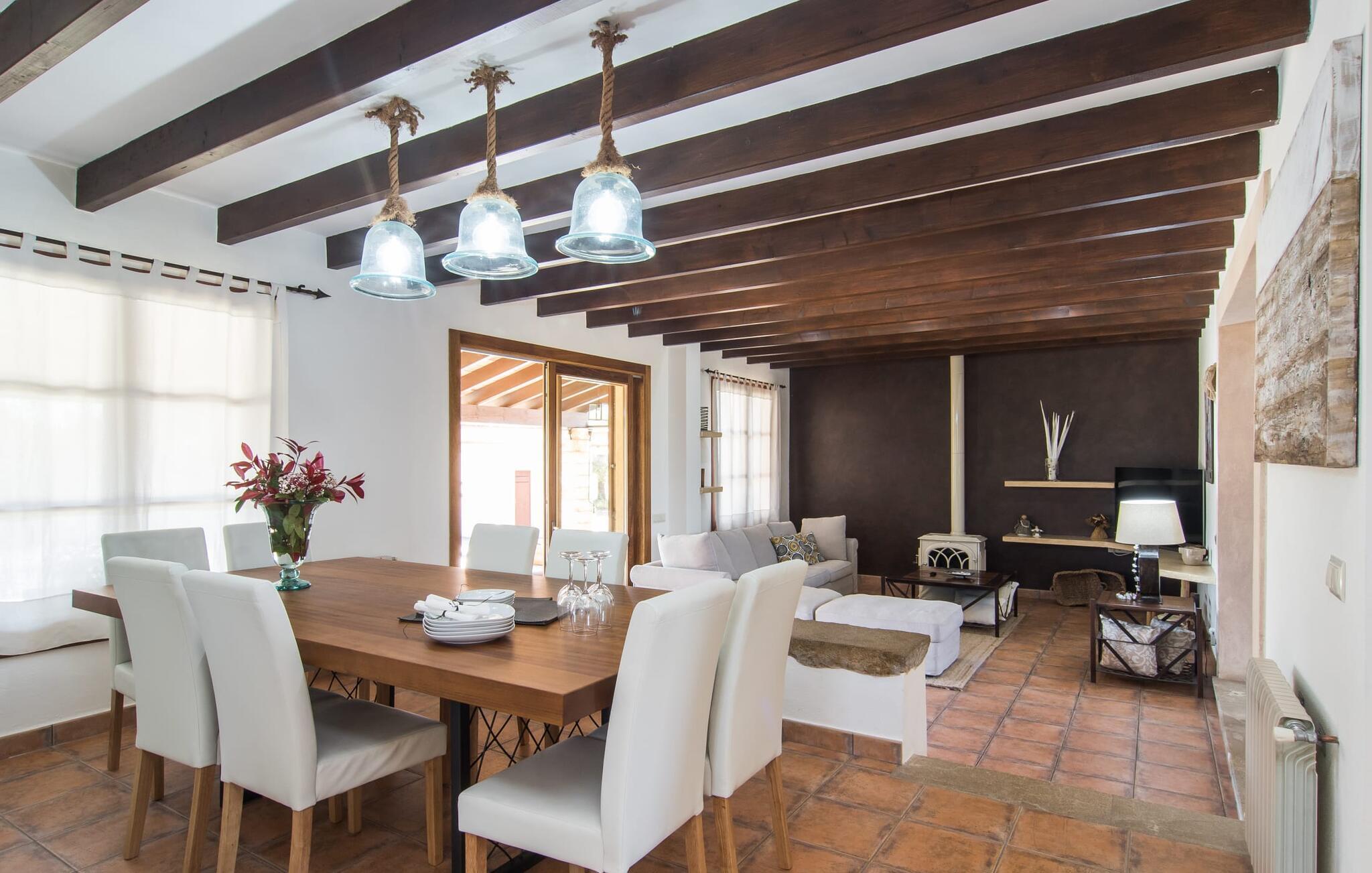 Kun en kort køretur fra Palma Lufthavn byder Finca "Es Triquet" jer velkommen gennem en automatisk port, der fører jer ned ad en asfalteret sti midt i frodige haver. Ejendommen tilbyder rigelig parkering, herunder en garage med to pladser. Omgivet af natur omfatter udendørsarealerne en swimmingpool opdelt i to områder, ideel til børn, og skyggefulde steder under et knudret johannesbrødtræ. Villaen imponerer med rustik mallorcansk arkitektur med møbler af høj kvalitet. Indenfor forbinder en stor trappe to niveauer og fører til et opholdsområde med pejs, en rummelig spisestue og et fuldt udstyret køkken. Fire komfortable soveværelser kan rumme op til otte gæster og har charmerende badeværelser. Fra det øverste niveau er der udgang til en solterrasse med en vidunderlig udsigt over Tramuntana-bjergene. Den nybyggede stenvilla "Es Triquet" er beliggende nær byen Binissalem på Pla de Mallorca. Denne landlige, smukke region er fuld af vinmarker, appelsin- og mandeltræer. I kan tage til Binissalem for at shoppe til daglige behov. Der er et ugentligt marked med regionale produkter om fredagen. Takket være dens centrale beliggenhed, tæt på en hørbar vej, kan I hurtigt nå hovedstaden Palma og strandene som Cuidad Jardin. El skal betales kontant på stedet. Bemærk venligst, at denne ejendom ikke accepterer ungdomsgrupper eller polterabender. En ungdomsgruppe på denne ejendom består af personer under 23 år. Book ikke denne ejendom, hvis I er en ungdomsgruppe eller polterabend, da jeres reservation vil blive afvist, når den er booket, hvilket kan være ved ankomsten til ejendommen eller under jeres ophold, og I vil ikke modtage en refusion.